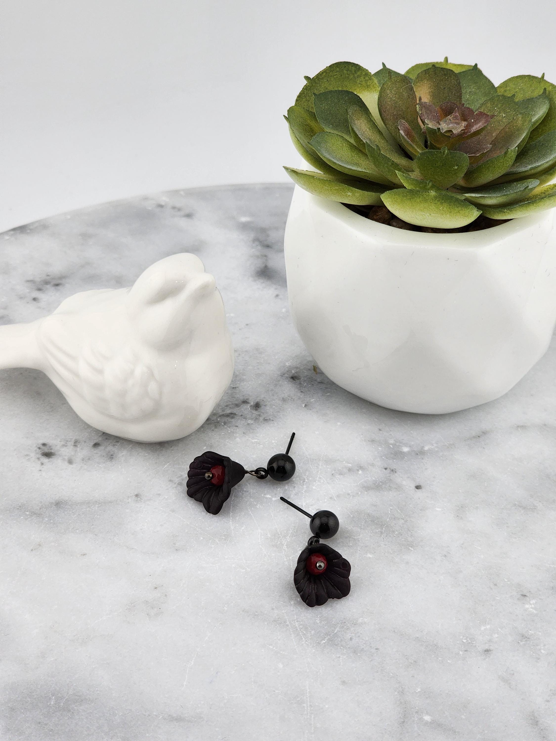 I made these earrings using 5mm black plated surgical steel ball posts. I added small 15mm black lucite Calla lily flowers to each that have tiny red faceted beads with gunmetal embellishment in the center. * Your purchase will arrive in pretty packaging * Shipping is included