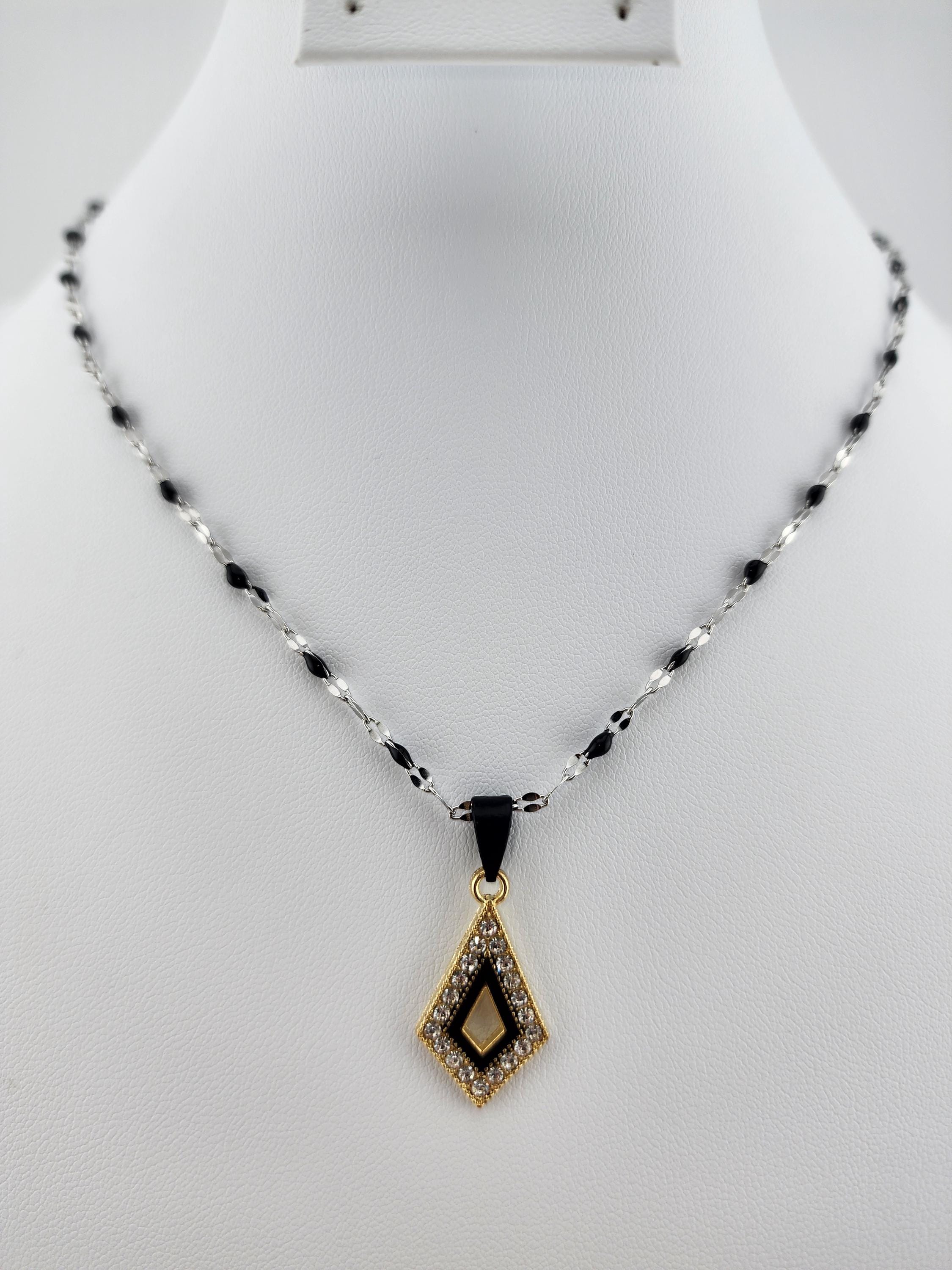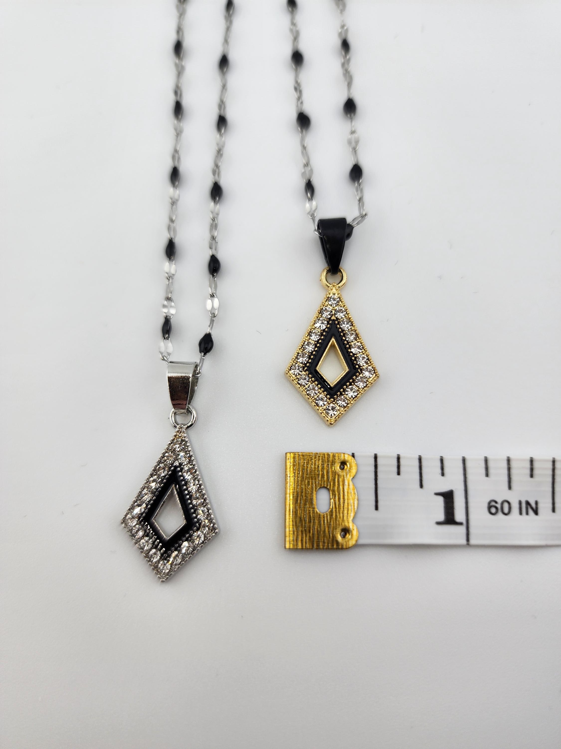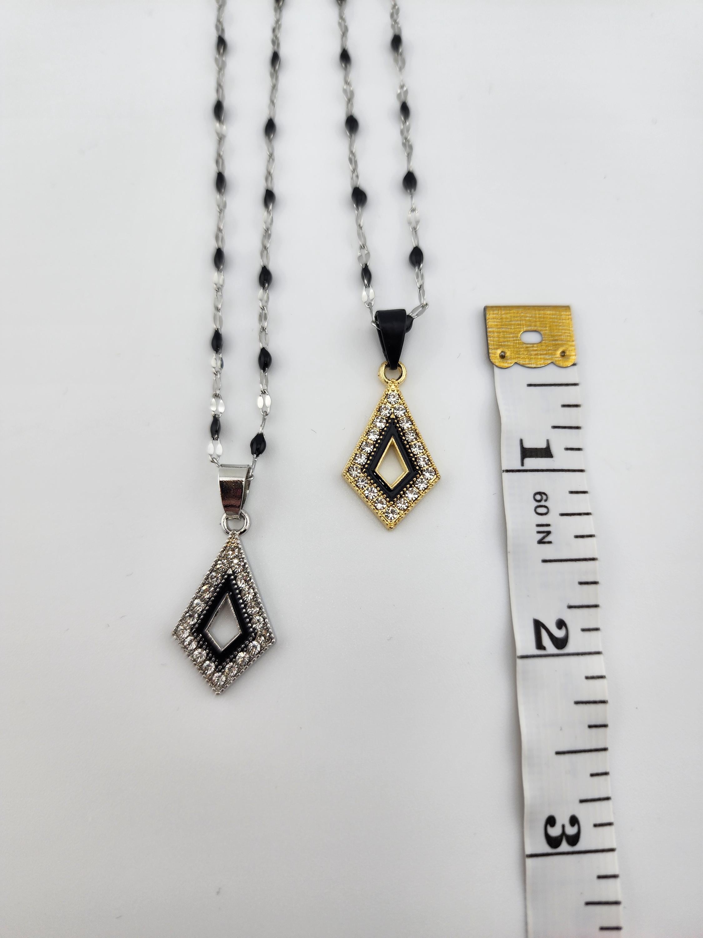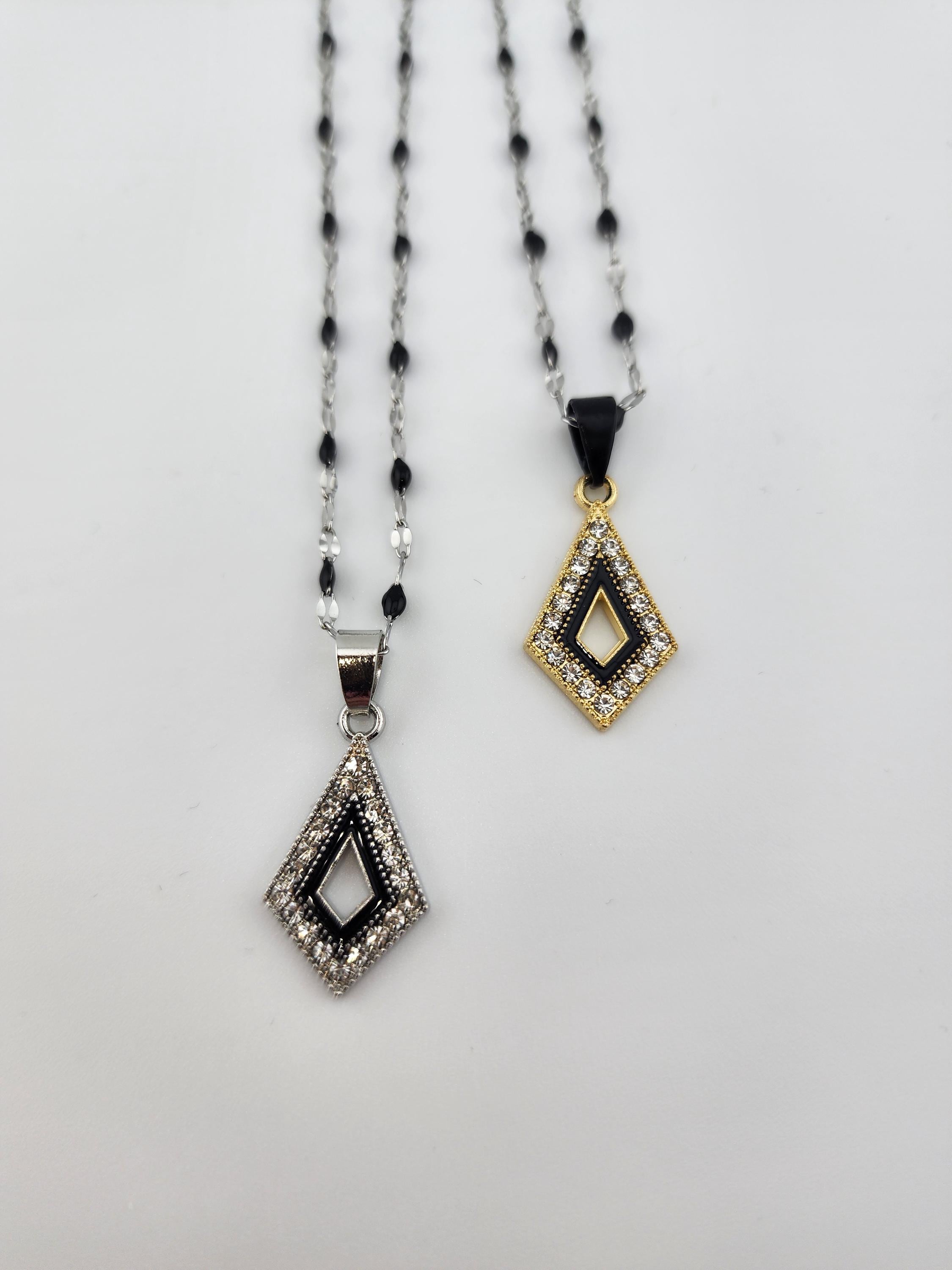 Here two choices of Art Deco inspired necklaces - Gold or Silver #1- is made using black & silver enamel lip chain. The pendant is a rhombus shape with a crystal encrusted gold background and a black inside frame hanging from a black bail. #2- is made using black & silver enamel lip chain. The pendant is a rhombus shape with a crystal encrusted silver background and a black inside frame hanging from a silver bail. * Your purchase will arrive in pretty packaging * Shipping is free within the U.S.