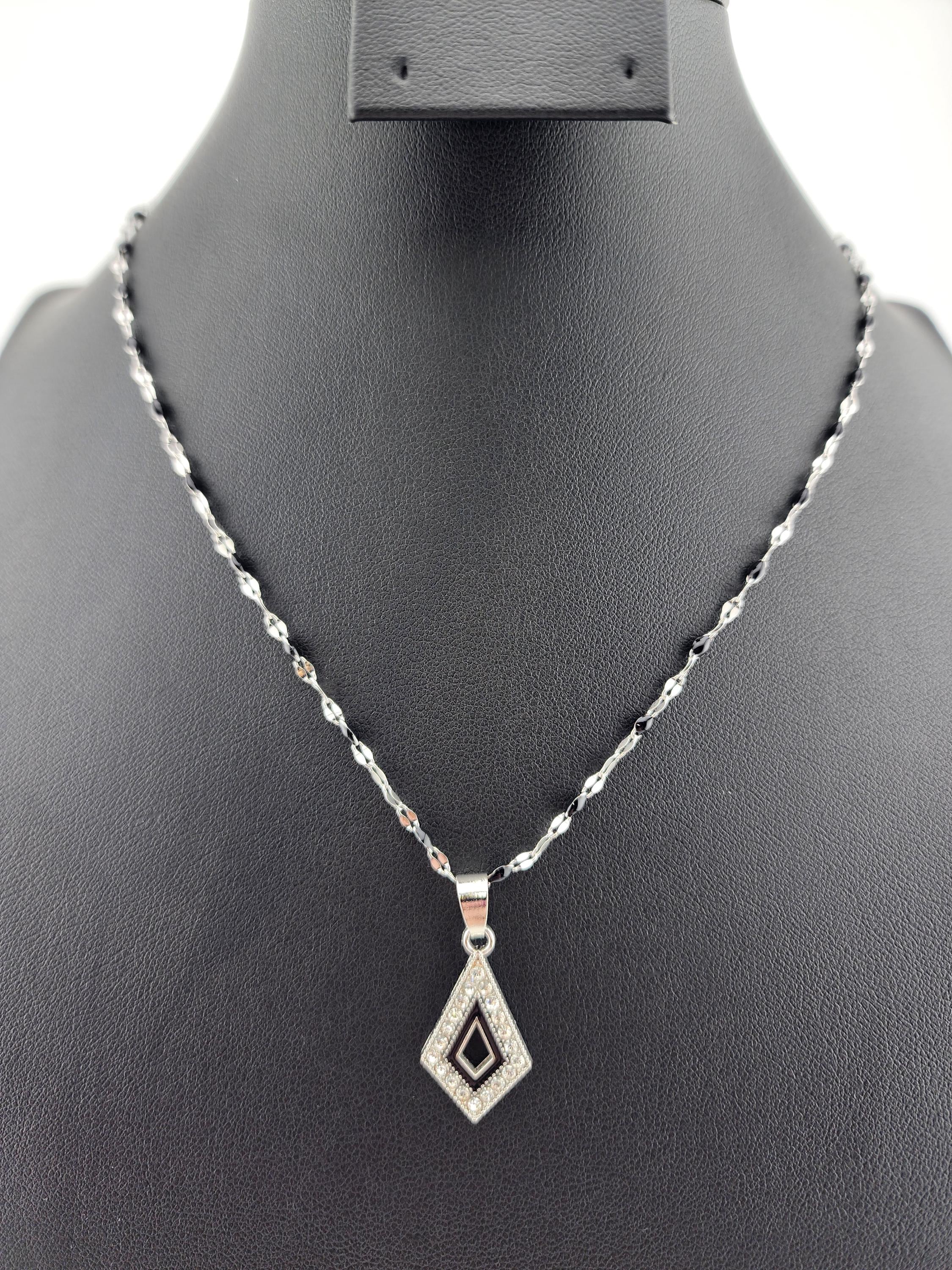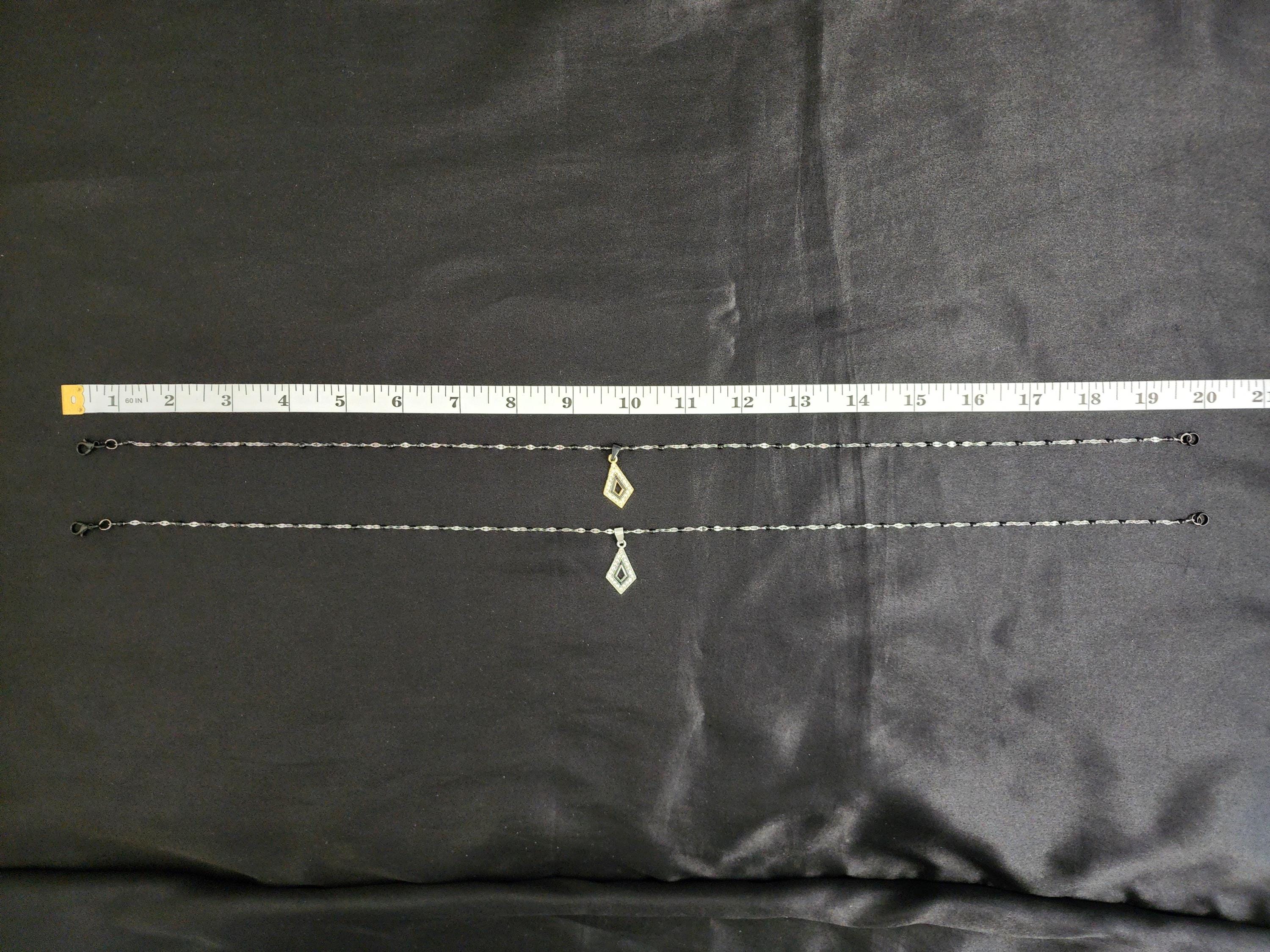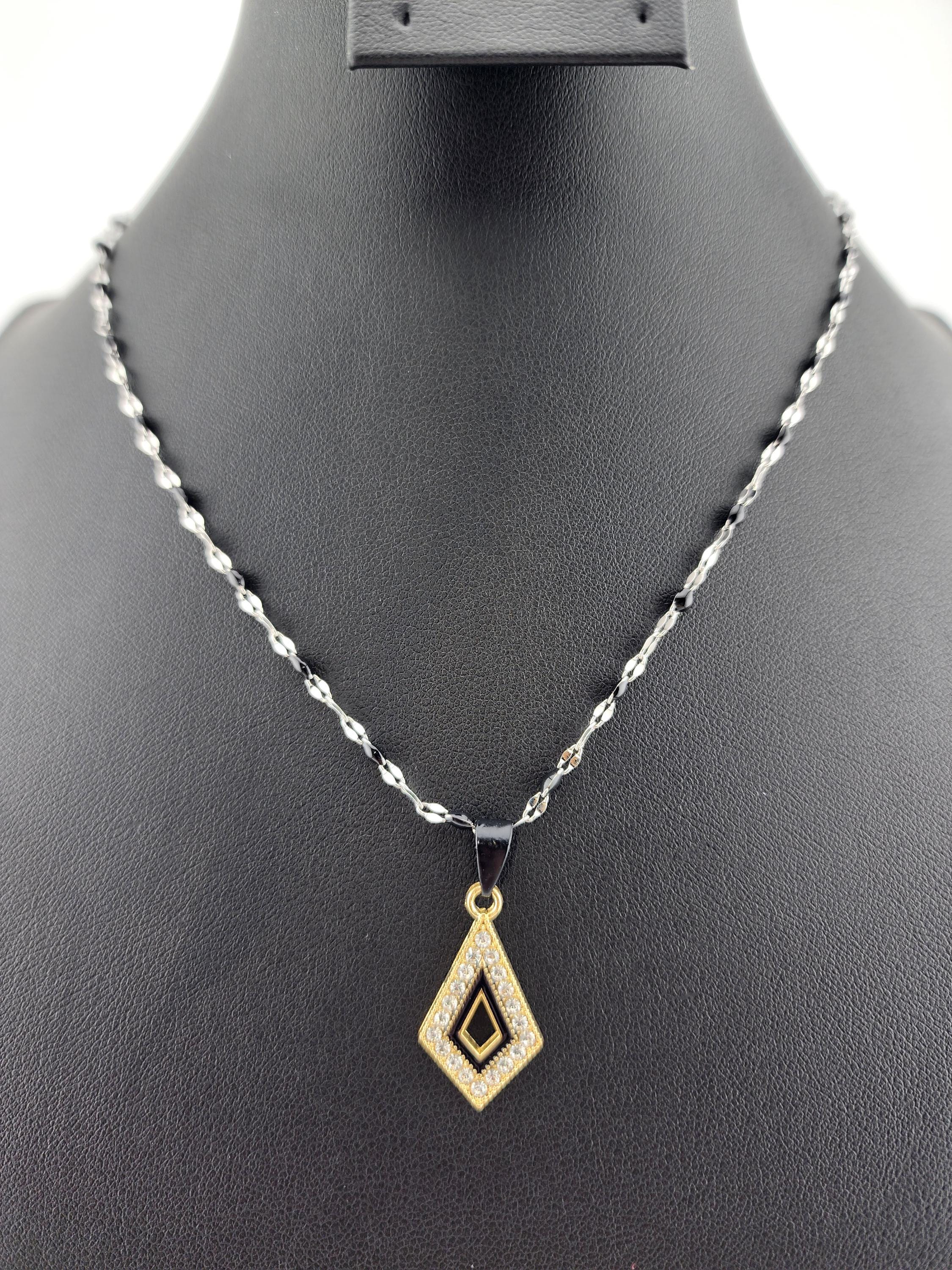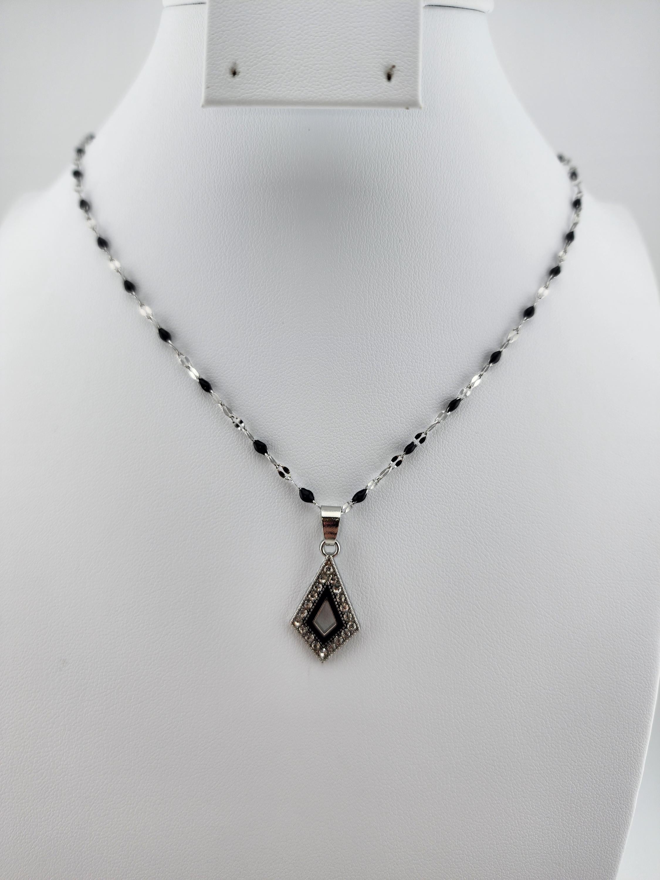 Here two choices of Art Deco inspired necklaces - Gold or Silver #1- is made using black & silver enamel lip chain. The pendant is a rhombus shape with a crystal encrusted gold background and a black inside frame hanging from a black bail. #2- is made using black & silver enamel lip chain. The pendant is a rhombus shape with a crystal encrusted silver background and a black inside frame hanging from a silver bail. * Your purchase will arrive in pretty packaging * Shipping is free within the U.S.