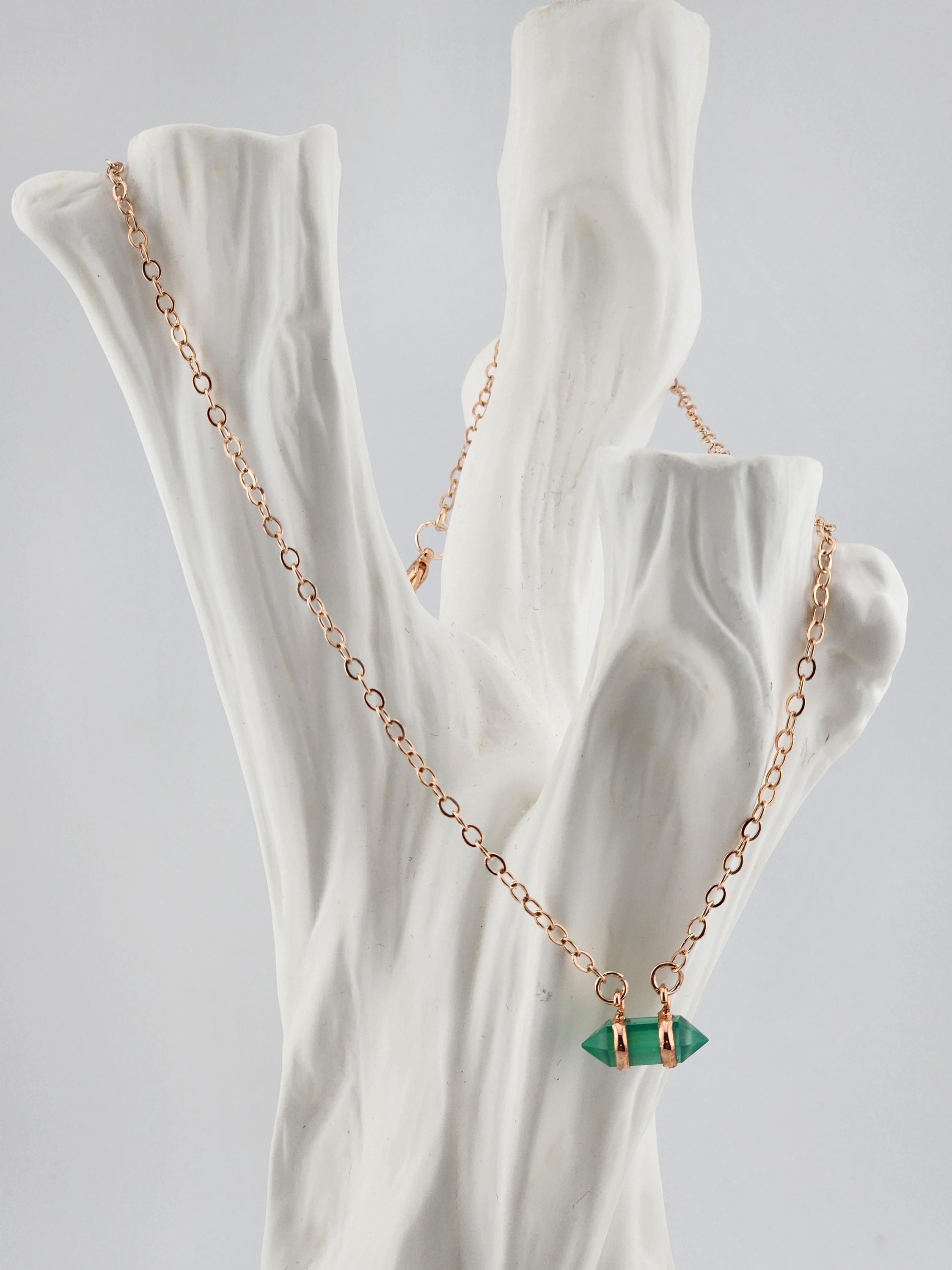 I made this elegant necklace using rose gold filled brass chain and adding a stunning faceted double pointed genuine green onyx stone banded in rose gold plated brass. This stone pendant was handcrafted in India and is of the highest quality. * Your purchase will arrive in pretty packaging