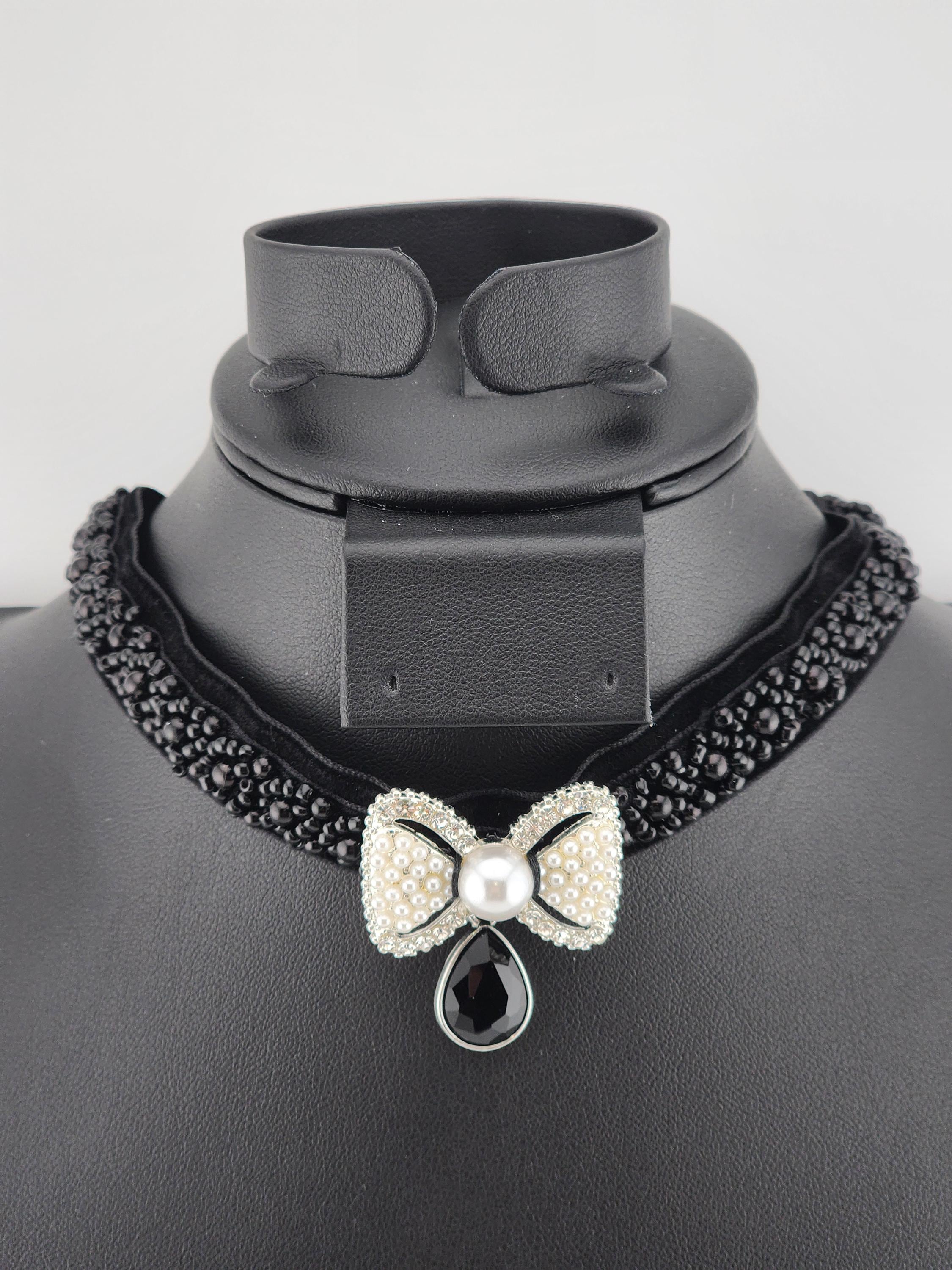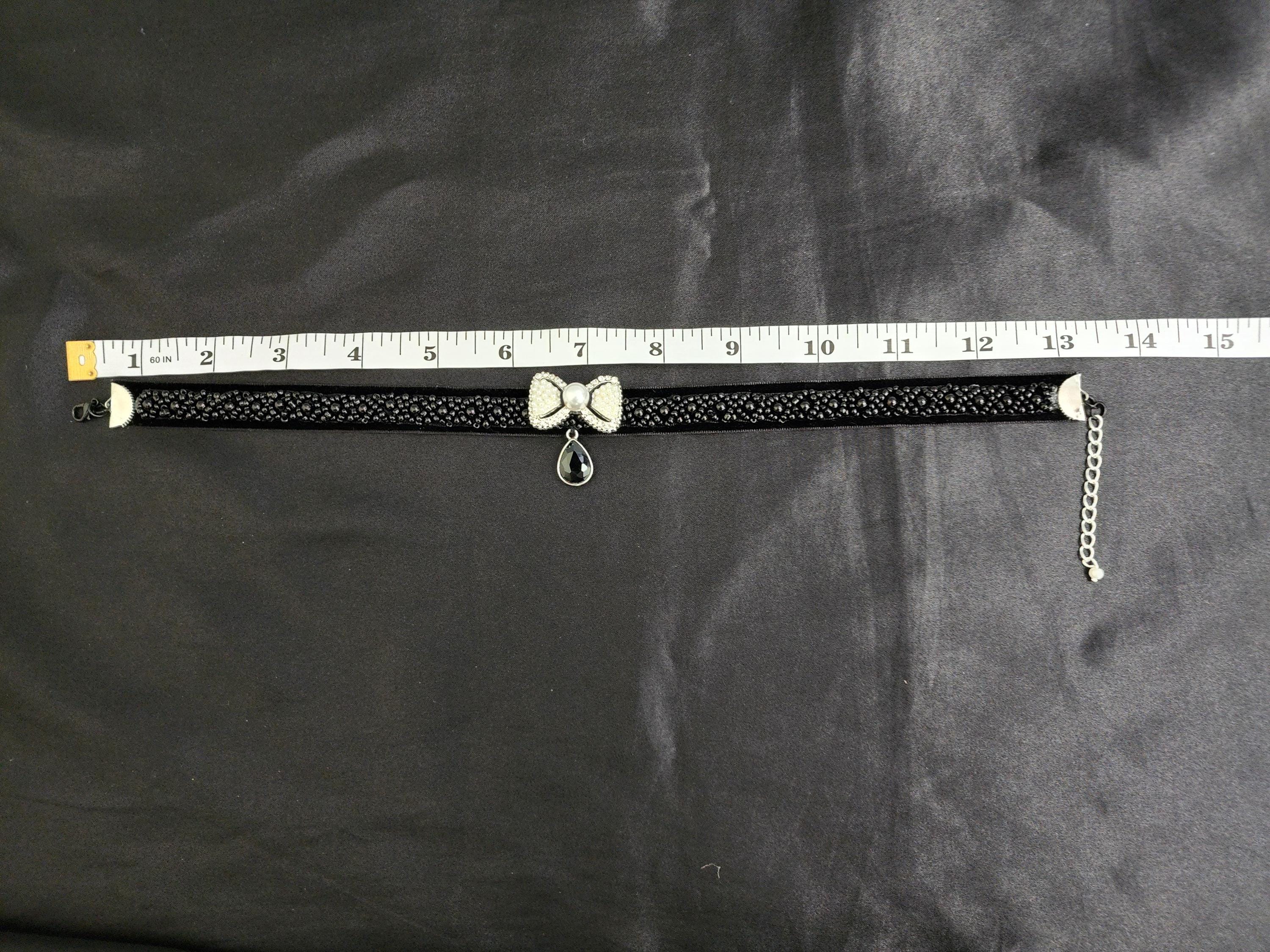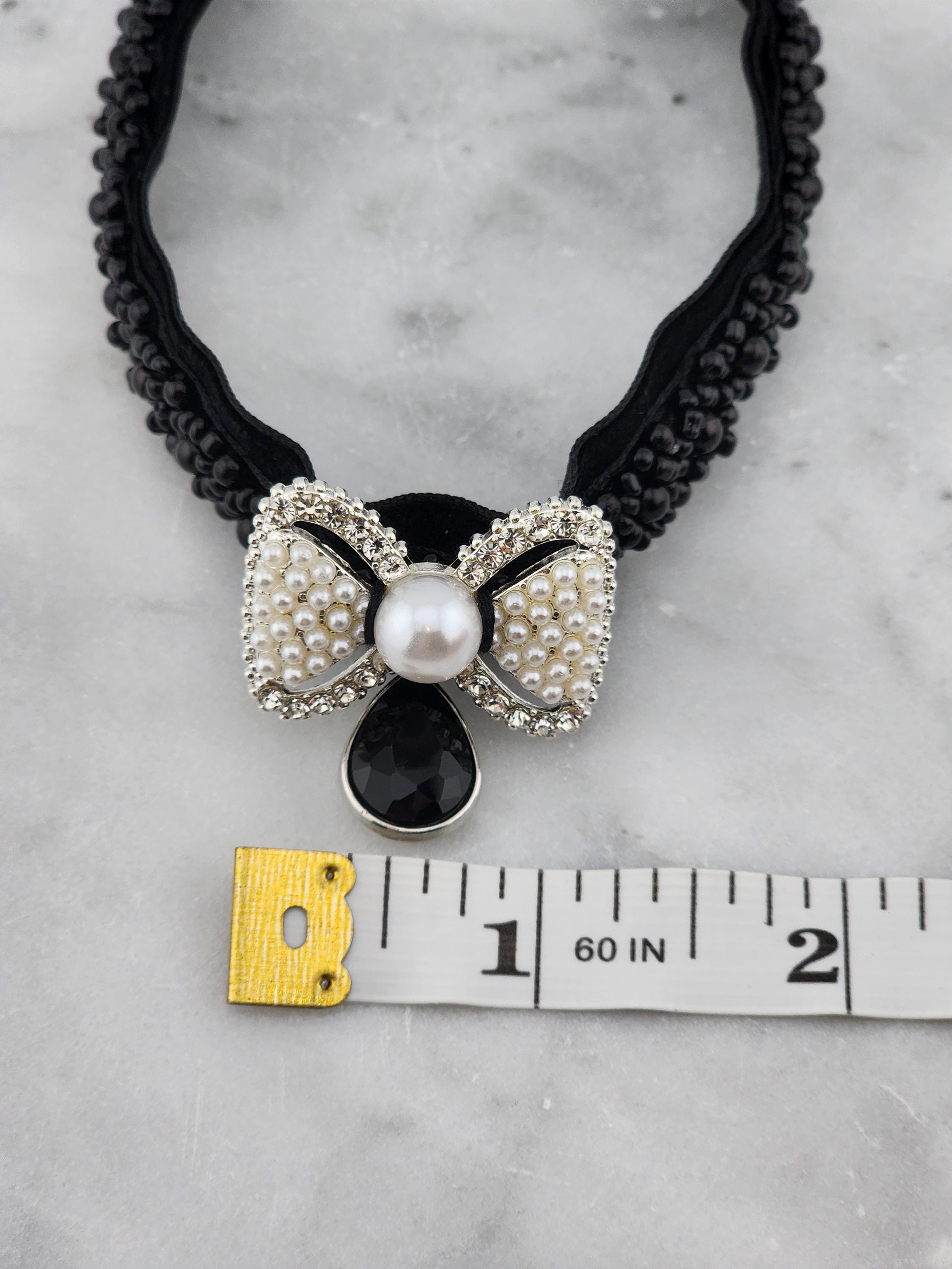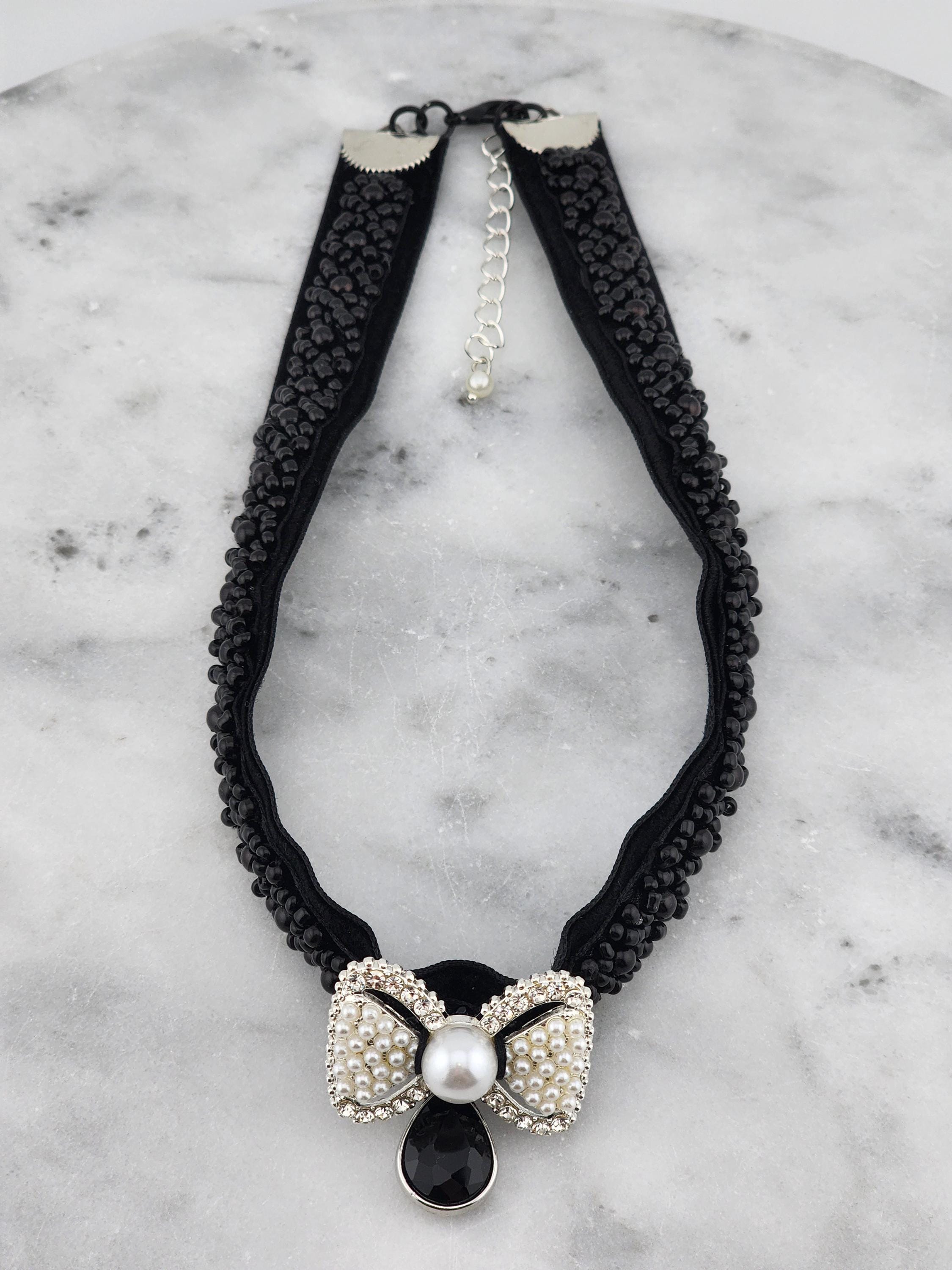 I made this choker necklace using black velvet and black beaded embellishment. I added a fun silver metal white beaded and faux pearl bow, then a silver and black faceted teardrop shaped charm. It is 13" long with a silver extender chain and a white faux pearl finishing adornment. I can see it being worn at an evening party or a black Christmas party. * Your purchase will arrive in pretty packaging * Shipping is free within the U.S.