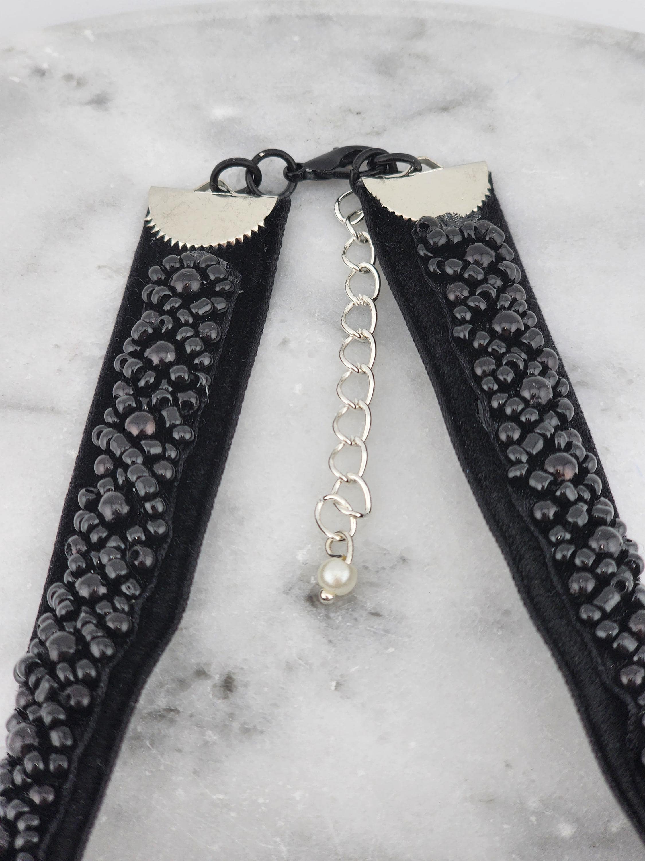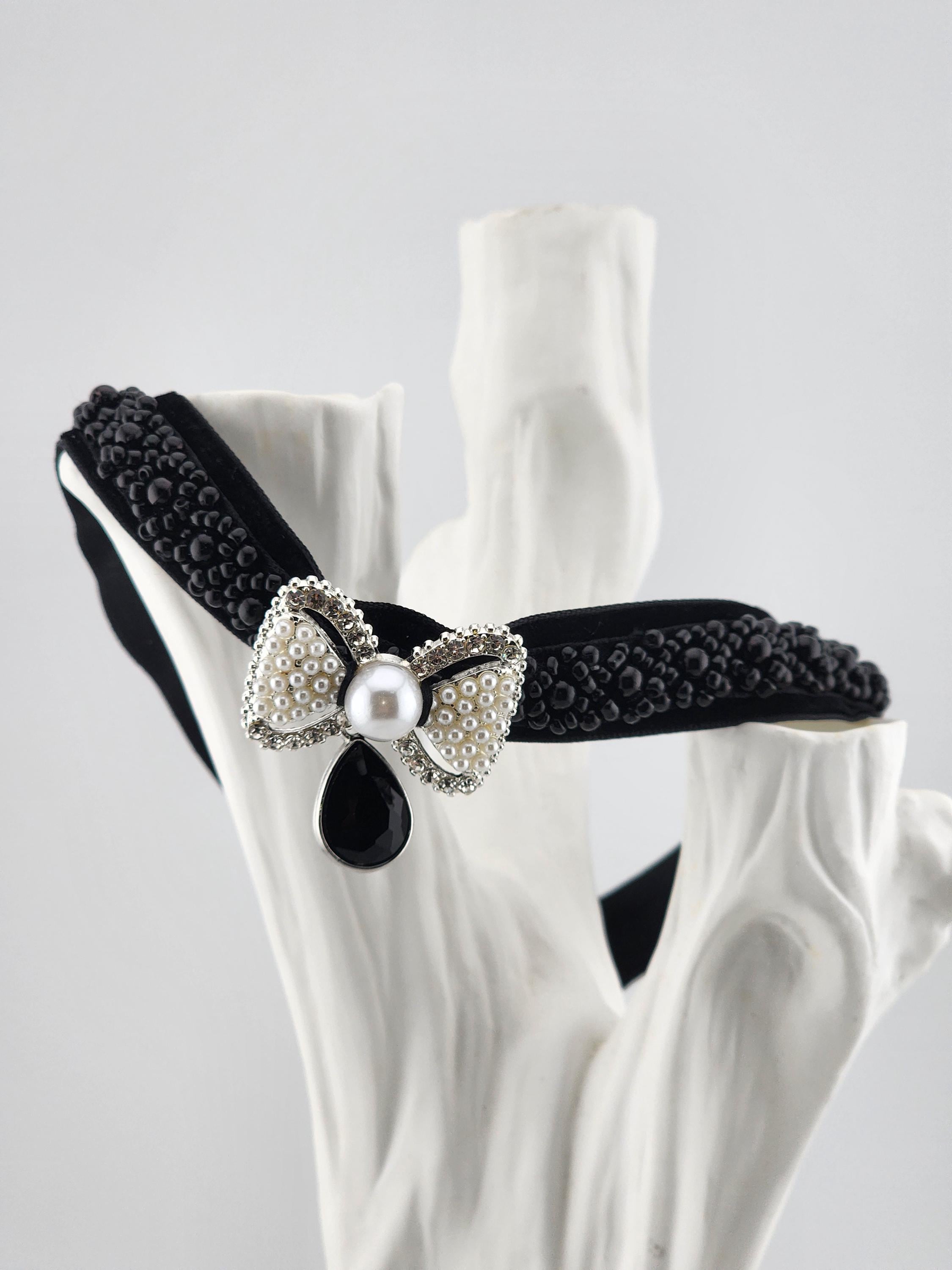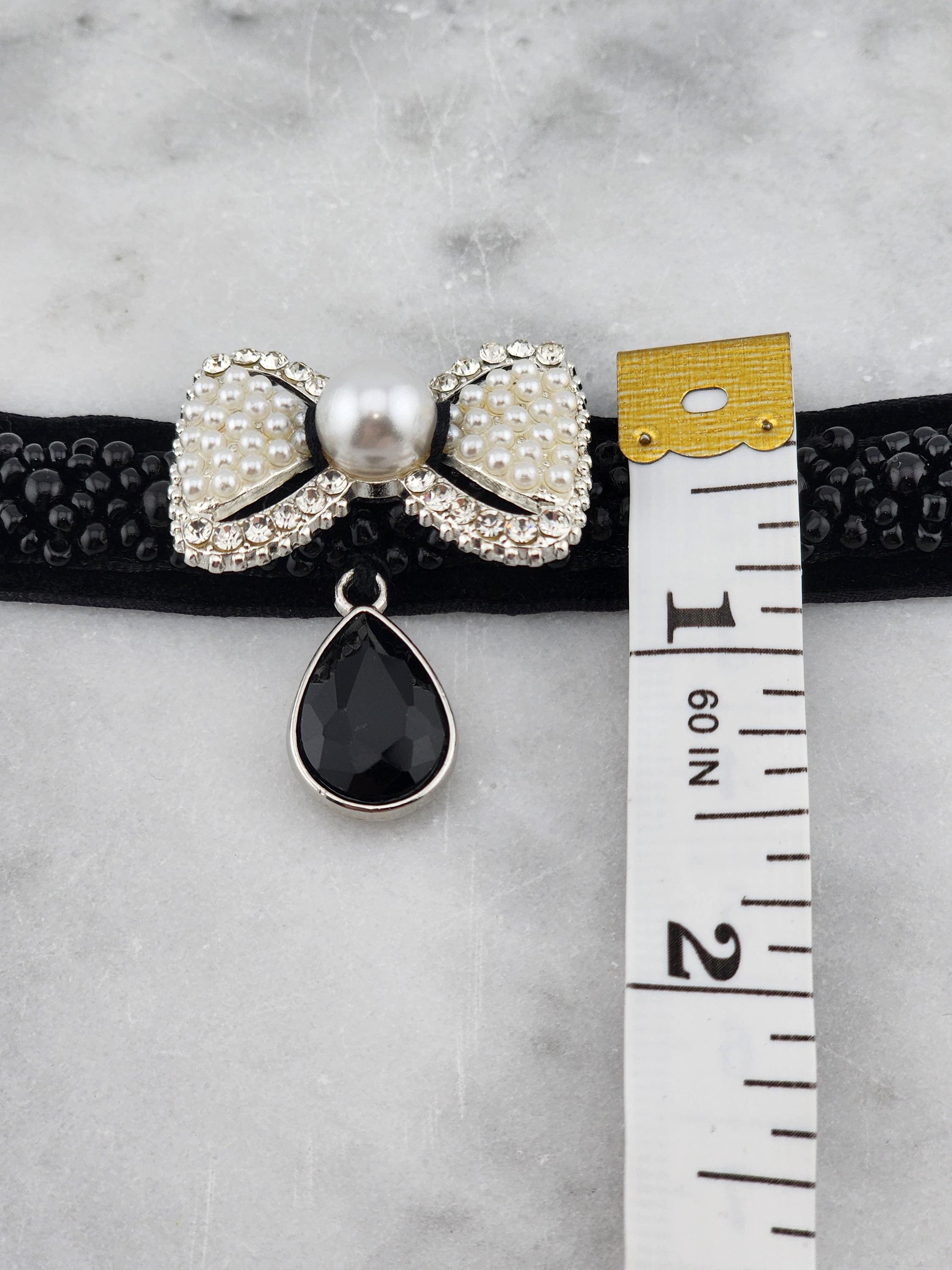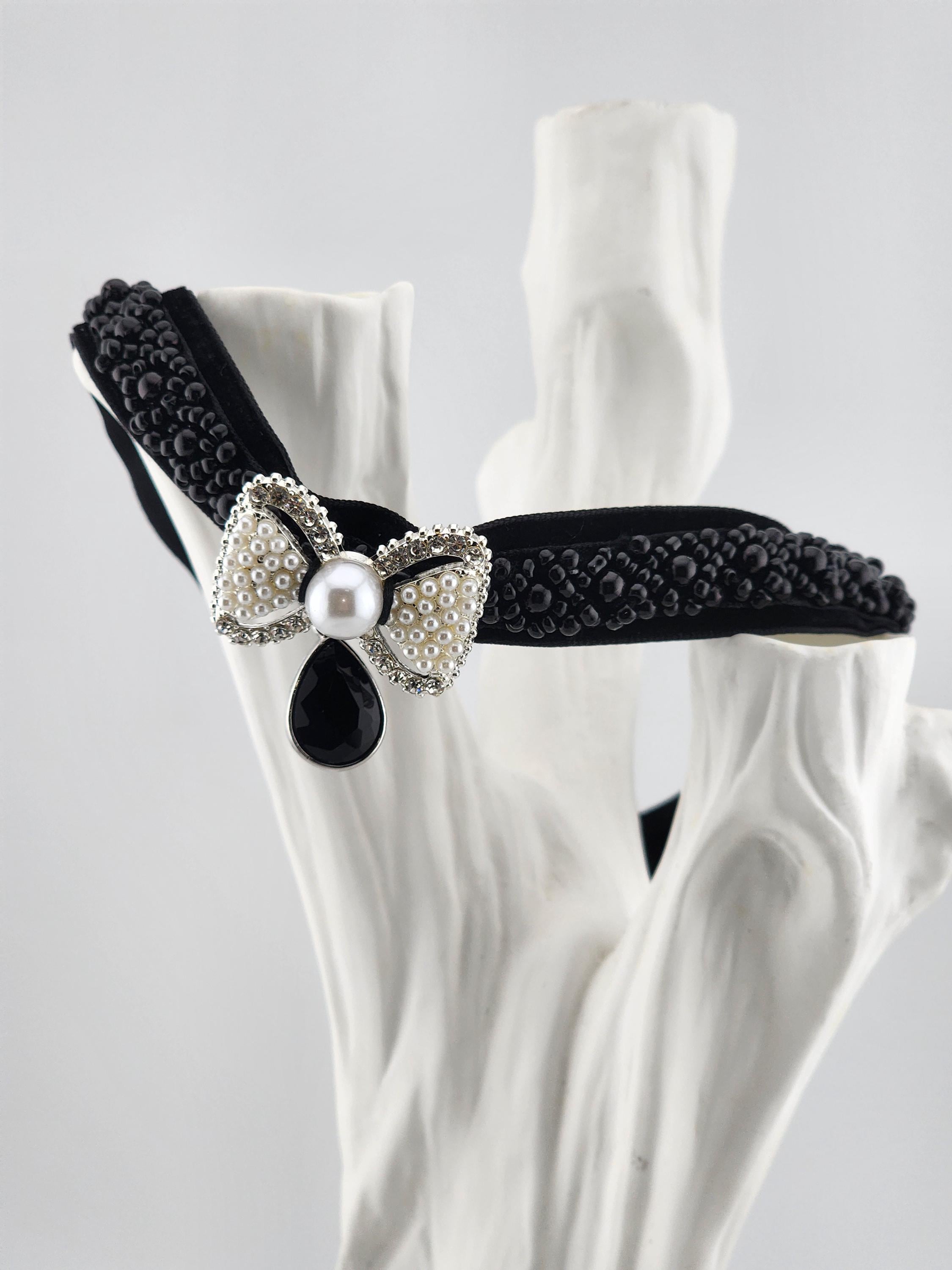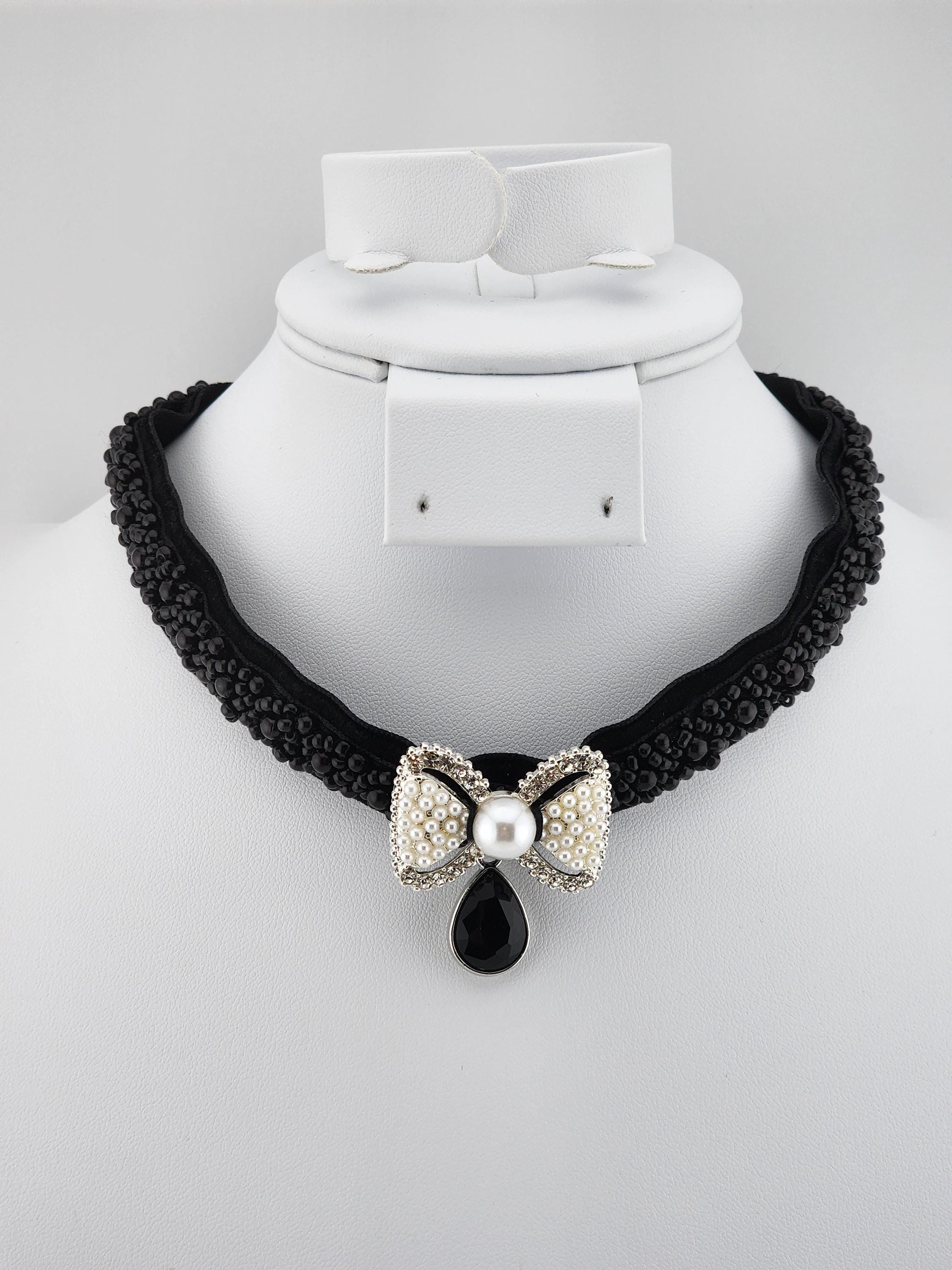I made this choker necklace using black velvet and black beaded embellishment. I added a fun silver metal white beaded and faux pearl bow, then a silver and black faceted teardrop shaped charm. It is 13" long with a silver extender chain and a white faux pearl finishing adornment. I can see it being worn at an evening party or a black Christmas party. * Your purchase will arrive in pretty packaging * Shipping is free within the U.S.