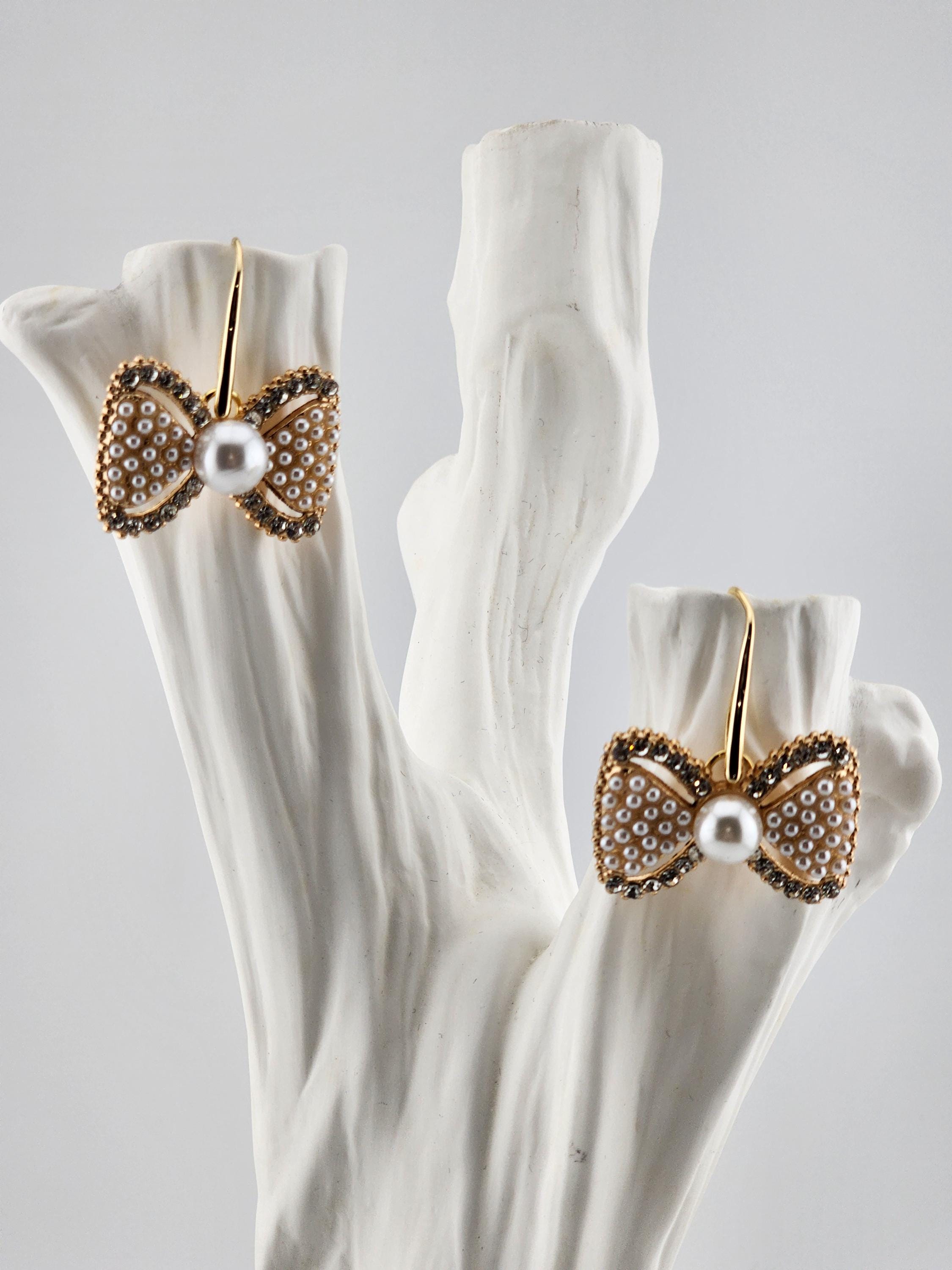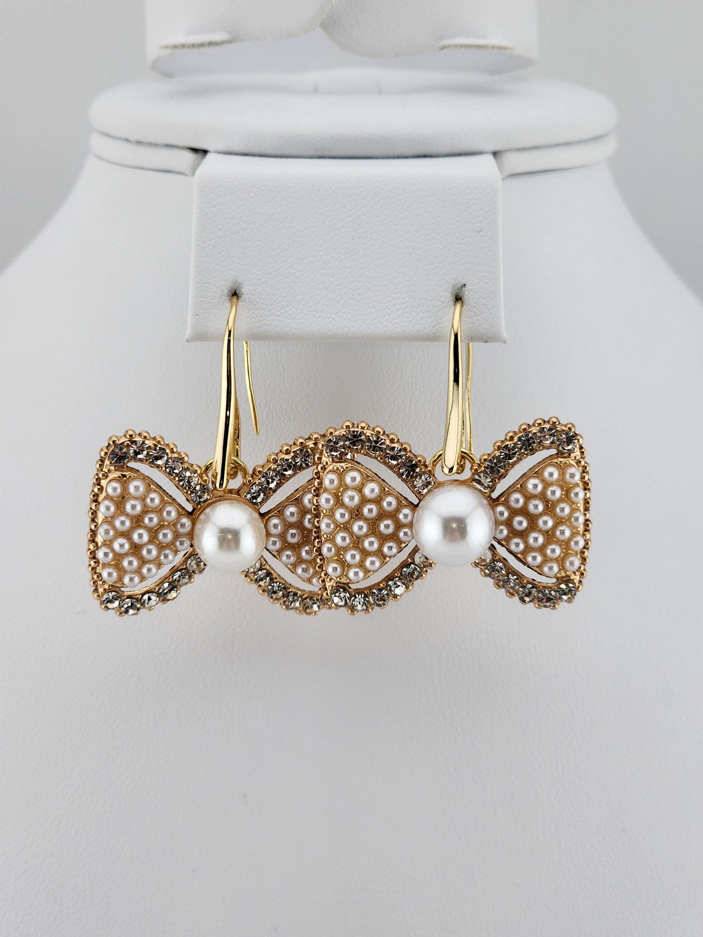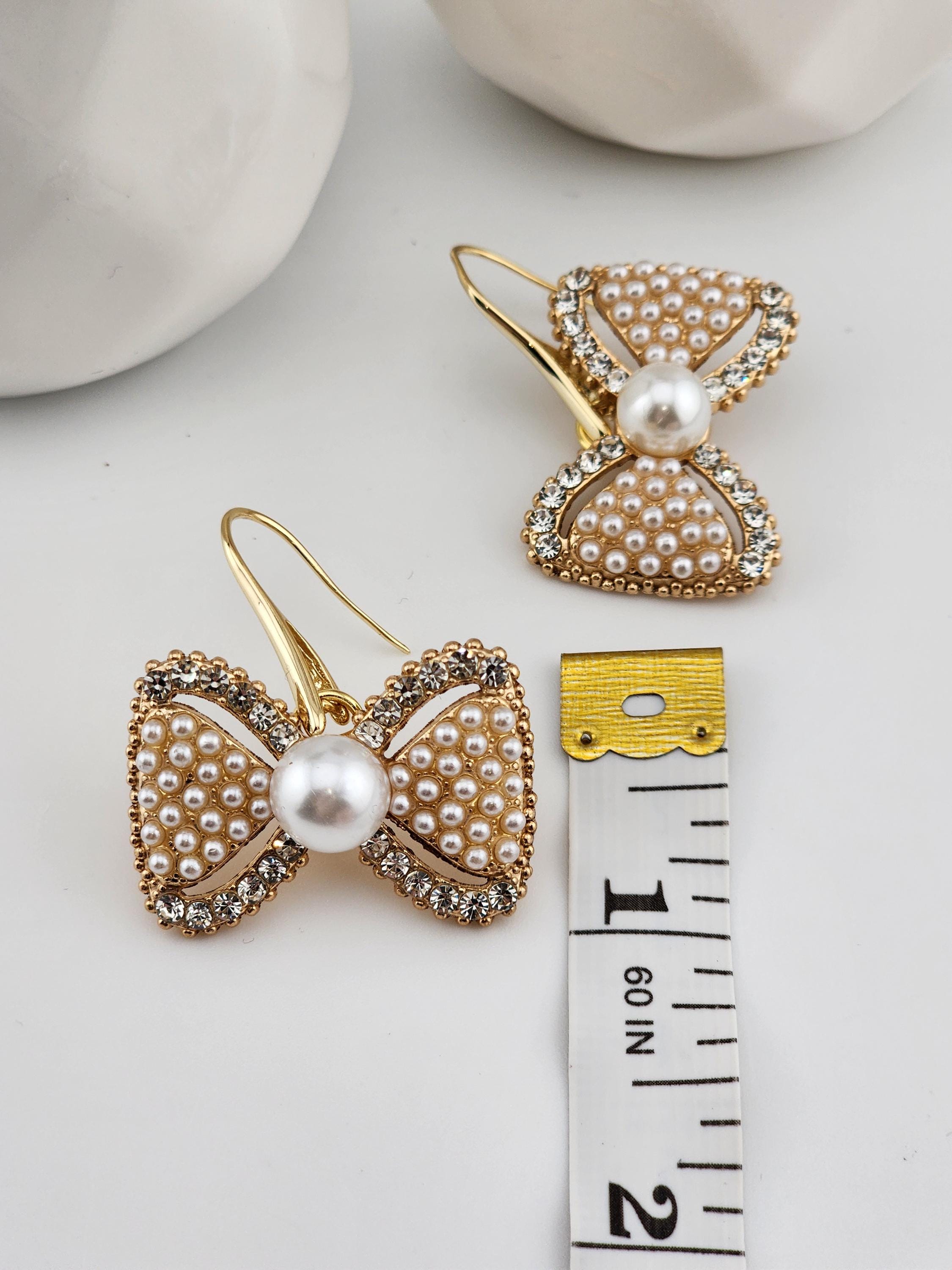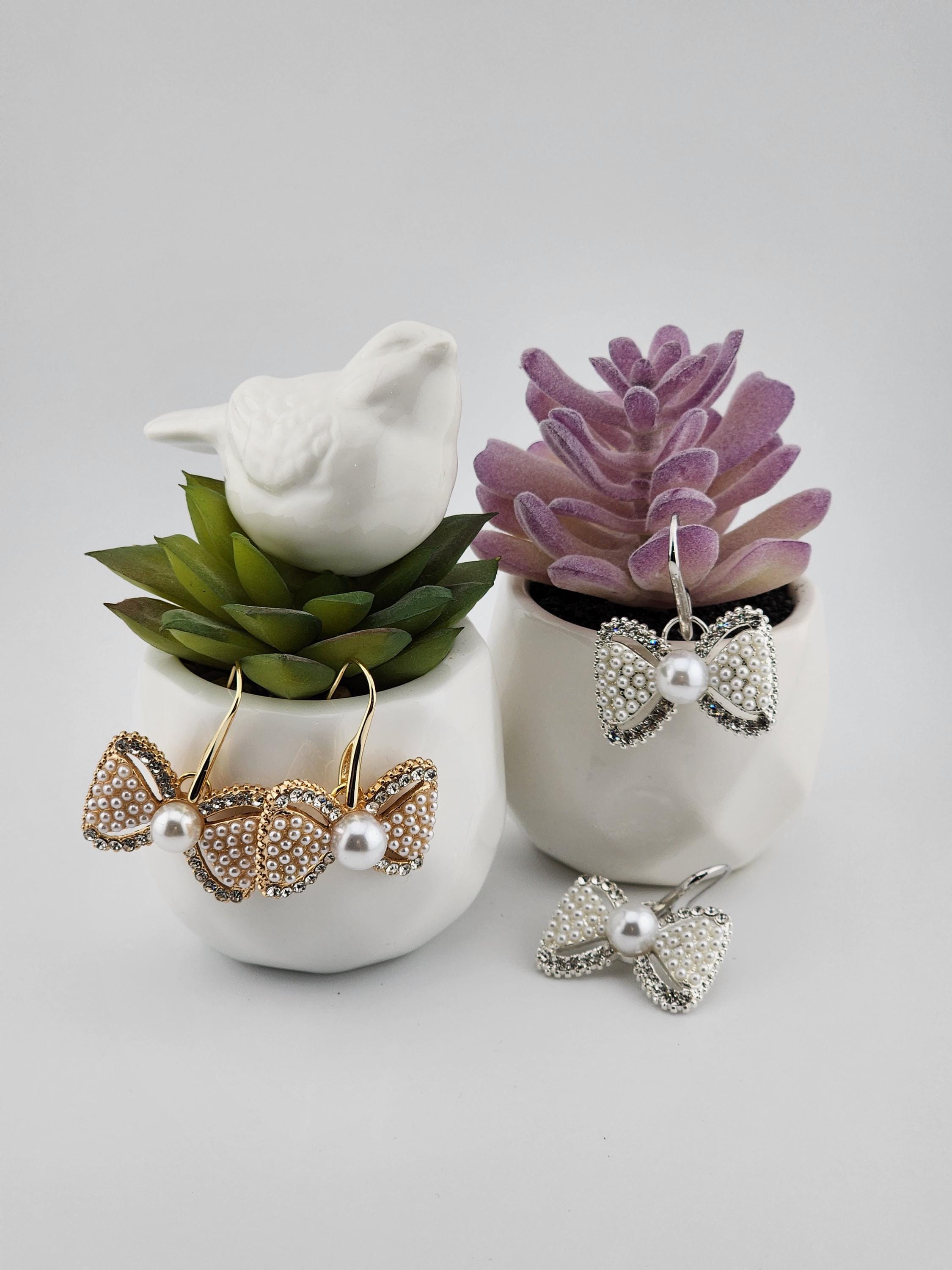 Are these earrings cute, or what?! You have 2 choices of crystal and faux pearl bow earrings. #1 - Tarnish resistant 18k gold plated brass hooks with gold bows. Or, #2- Platinum plated brass hooks with silver bows. They will look great at any party or Christmas party. * Your purchase will arrive in pretty packaging * Shipping is free within the U.S.