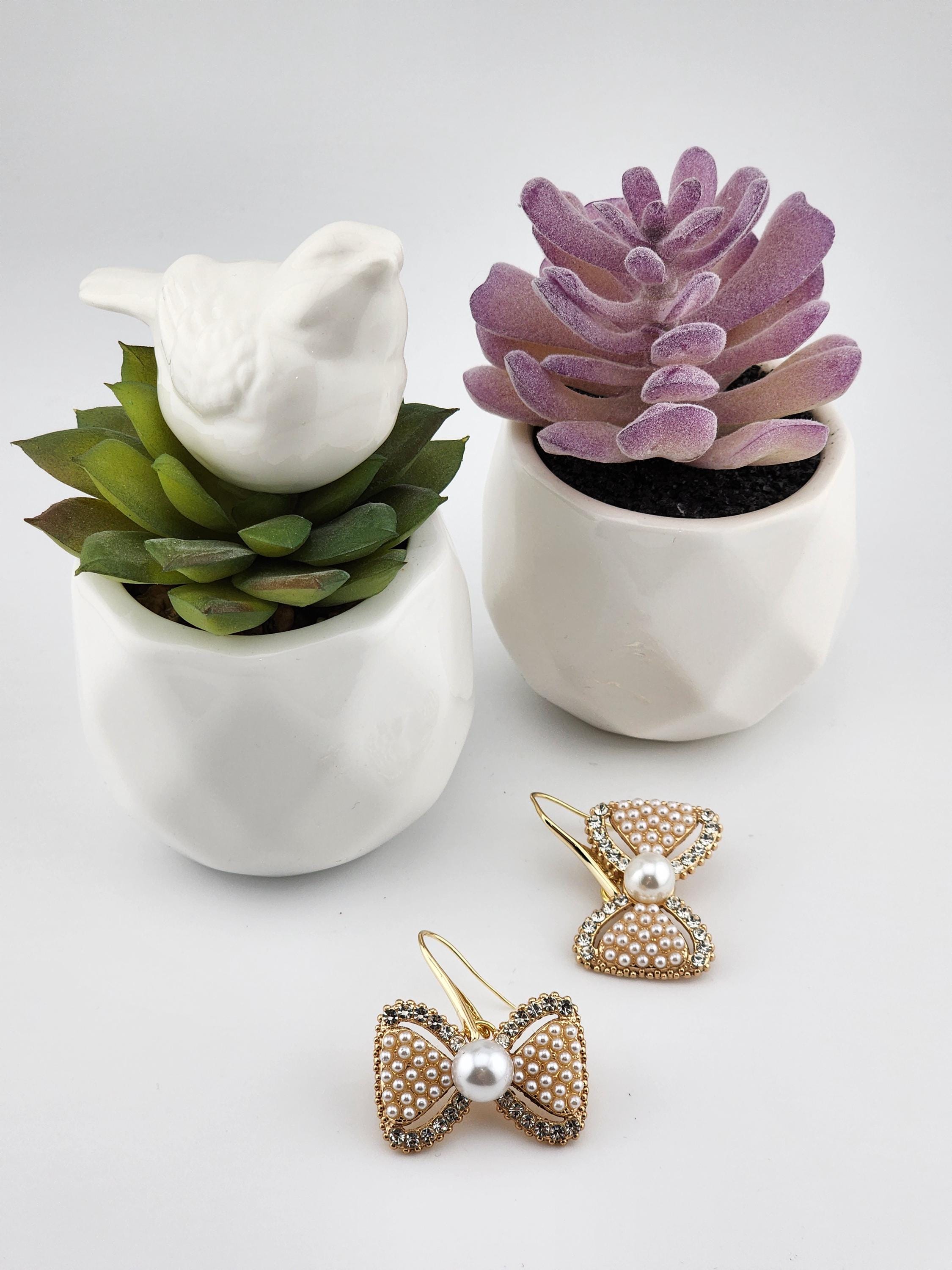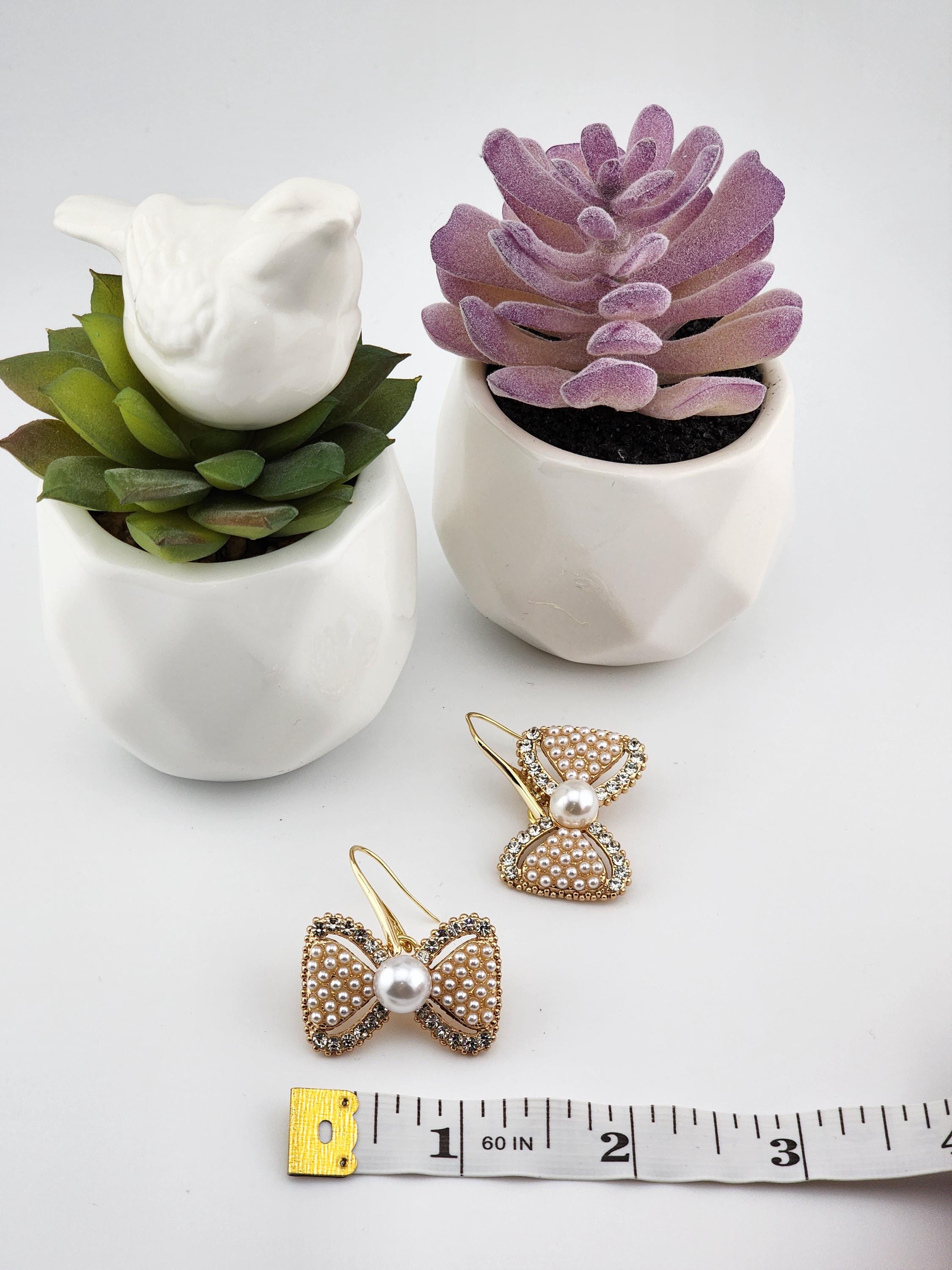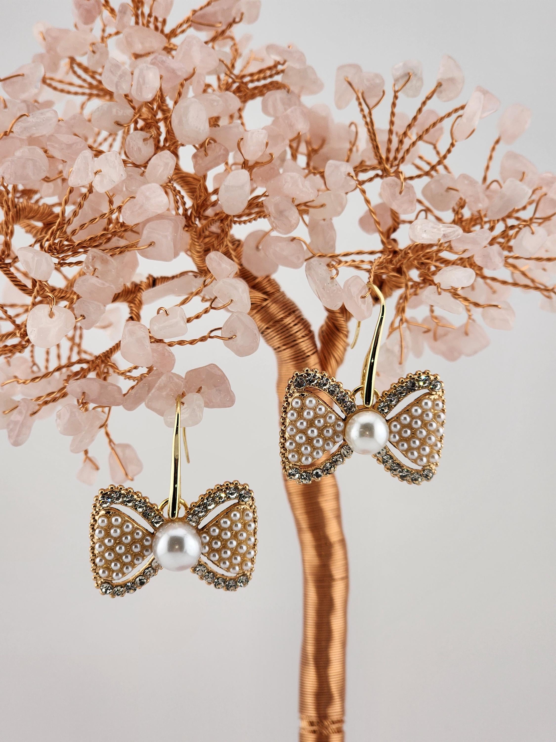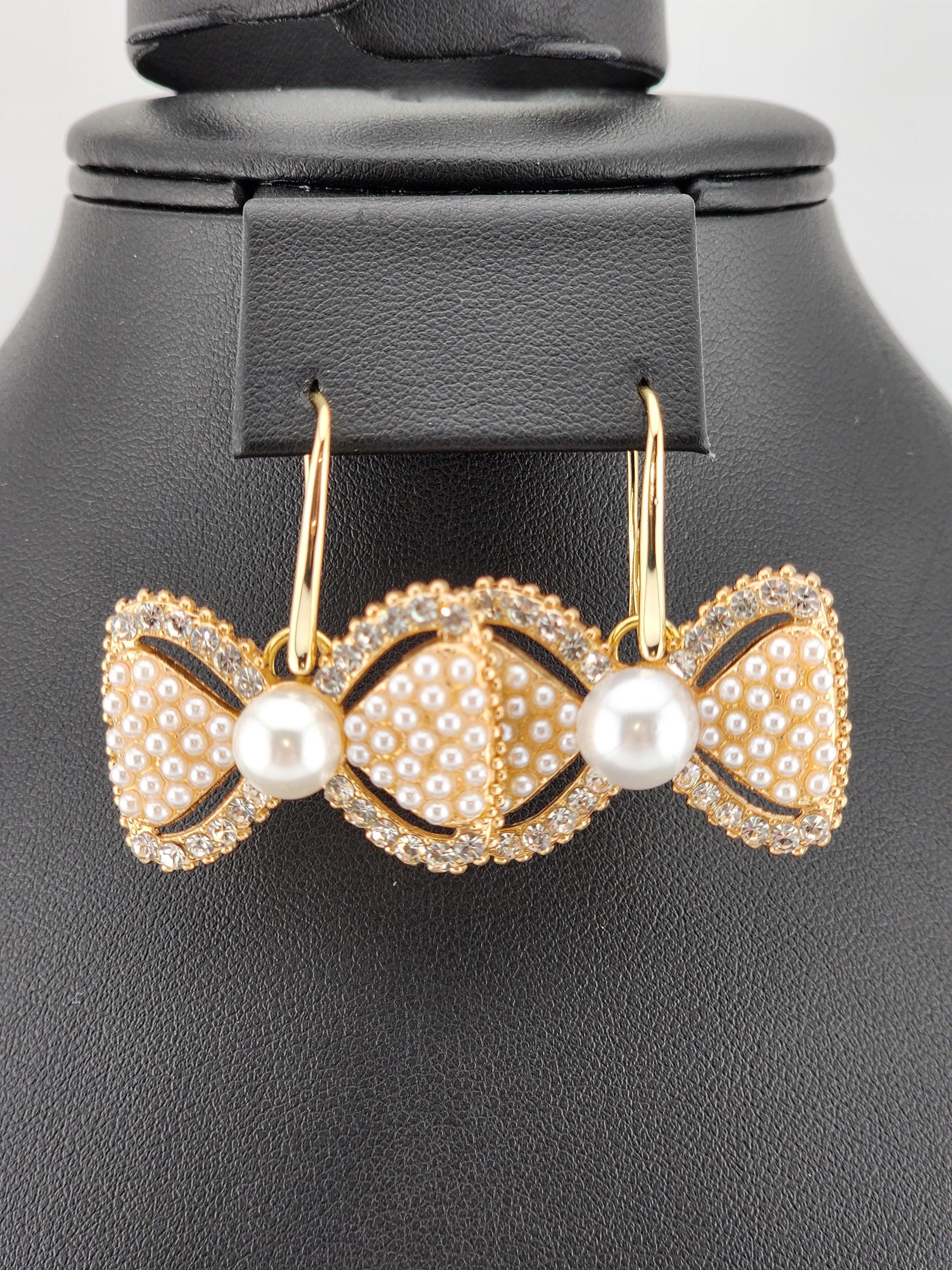 Are these earrings cute, or what?! You have 2 choices of crystal and faux pearl bow earrings. #1 - Tarnish resistant 18k gold plated brass hooks with gold bows. Or, #2- Platinum plated brass hooks with silver bows. They will look great at any party or Christmas party. * Your purchase will arrive in pretty packaging * Shipping is free within the U.S.