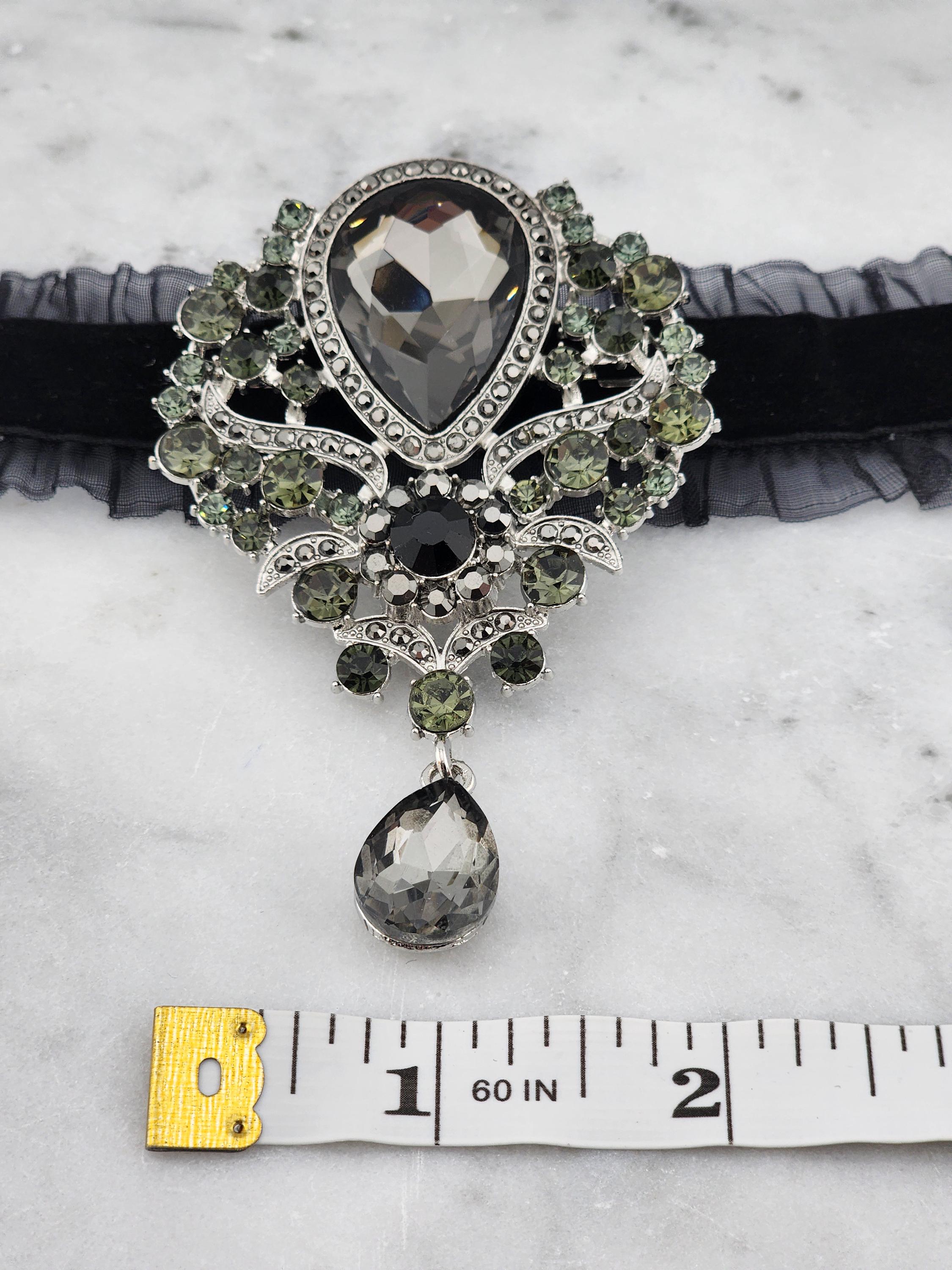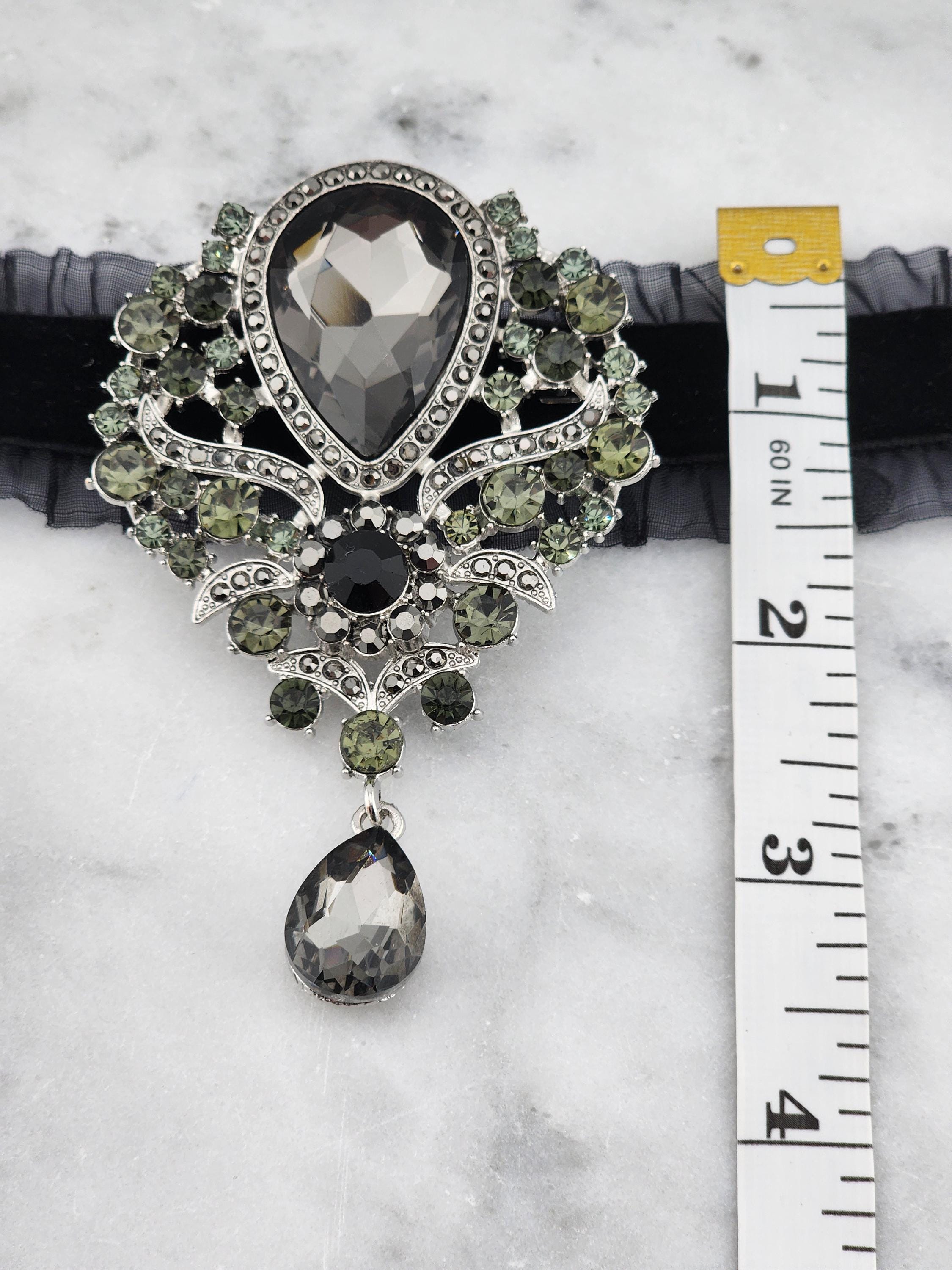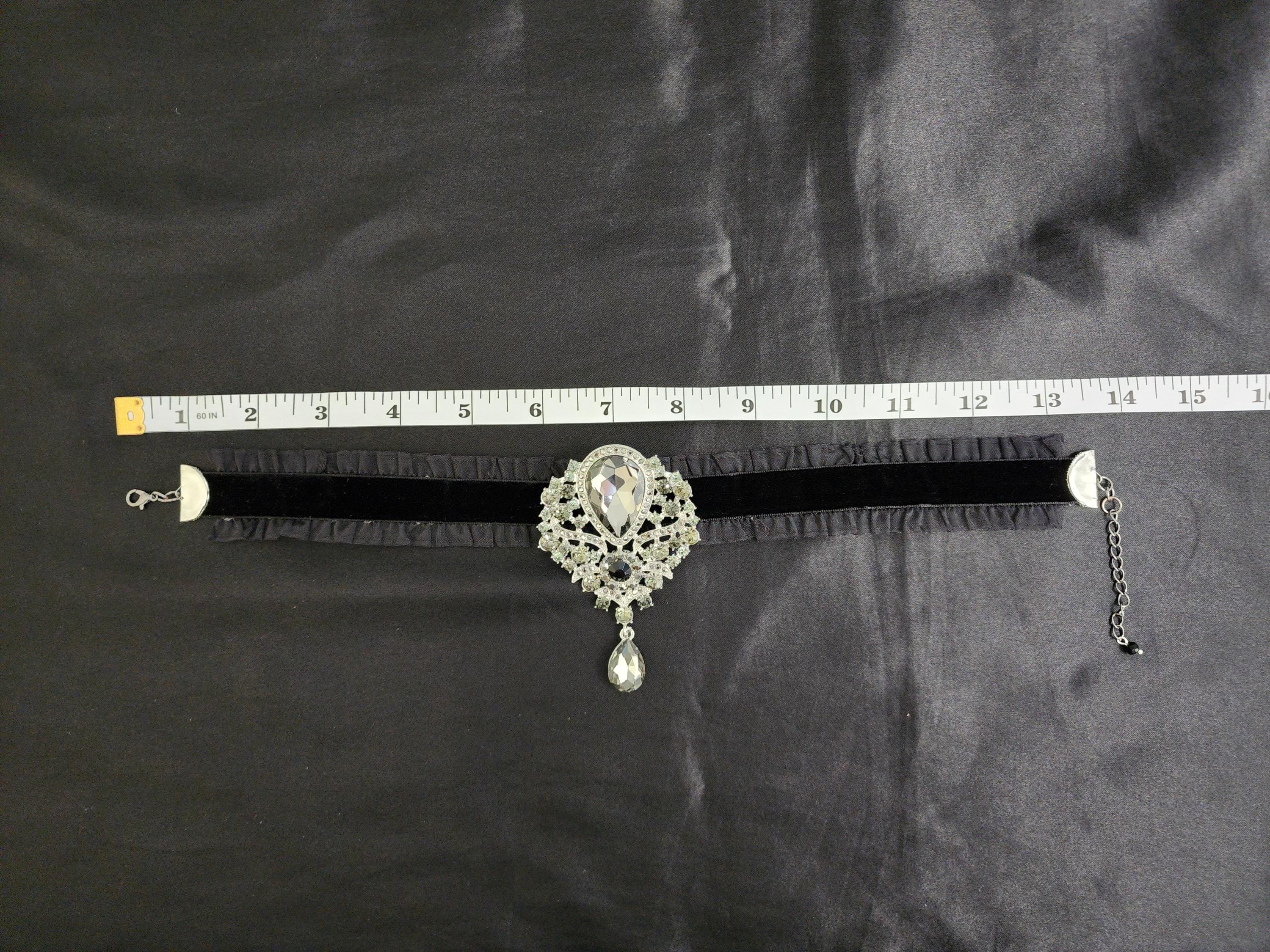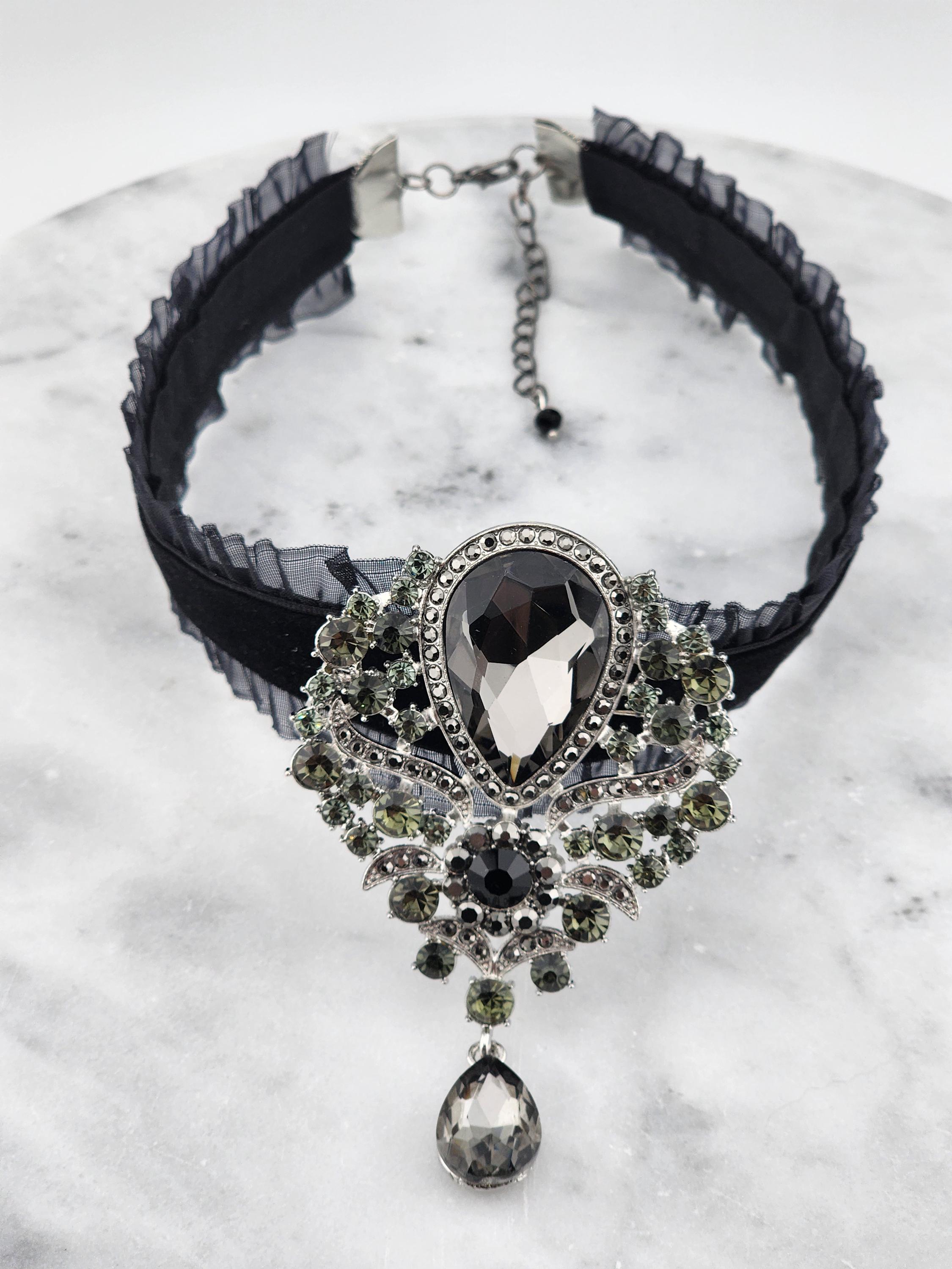 I made this stunning choker necklace with black velvet and black ruffle ribbon. Then I added a large ornate multi-crystal pendant. There are silver accents, a chain extender and a finishing faceted black embellishment. * Your purchase will arrive in pretty packaging * Shipping is free within the U.S.
