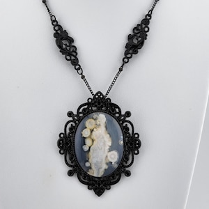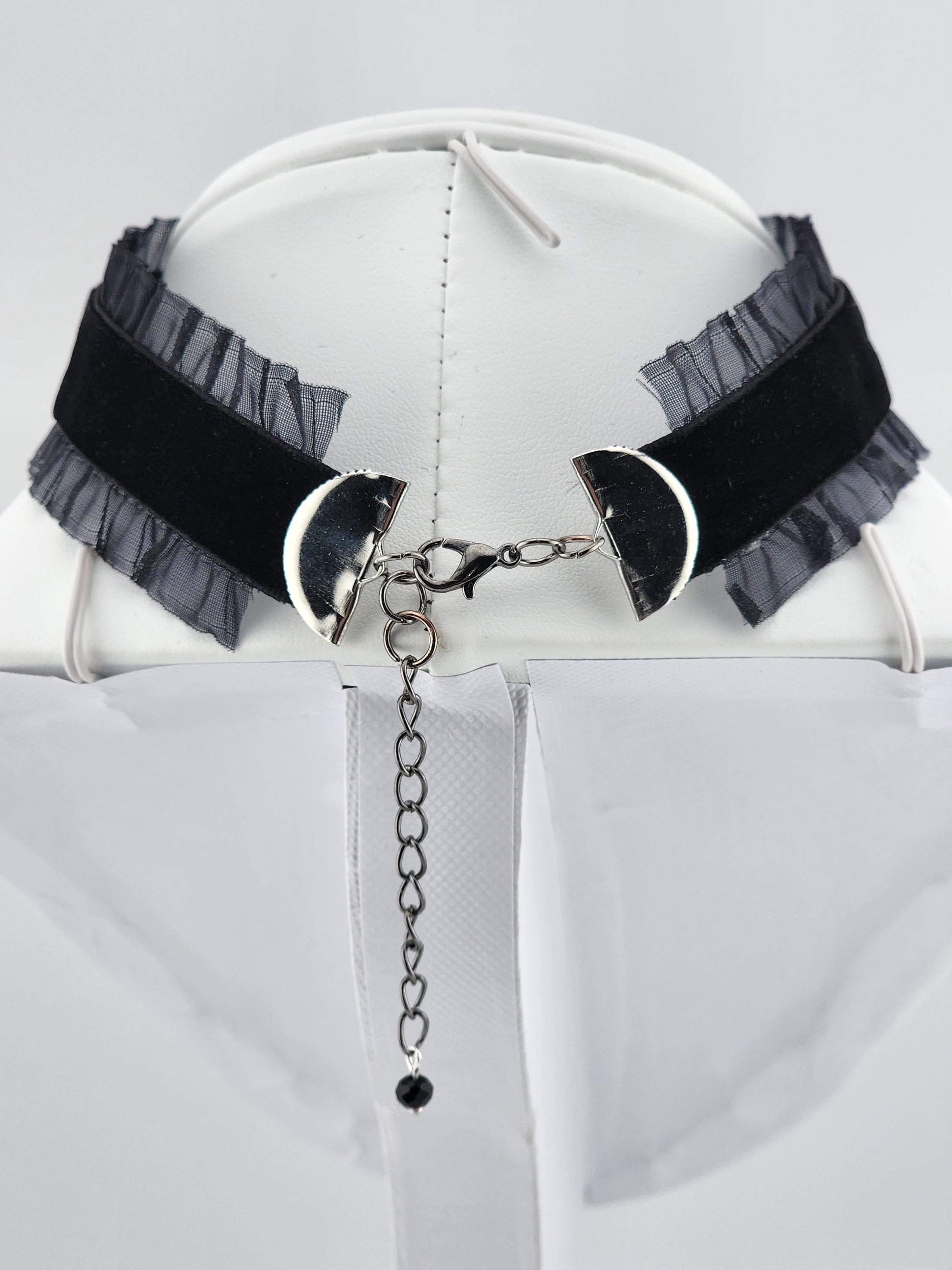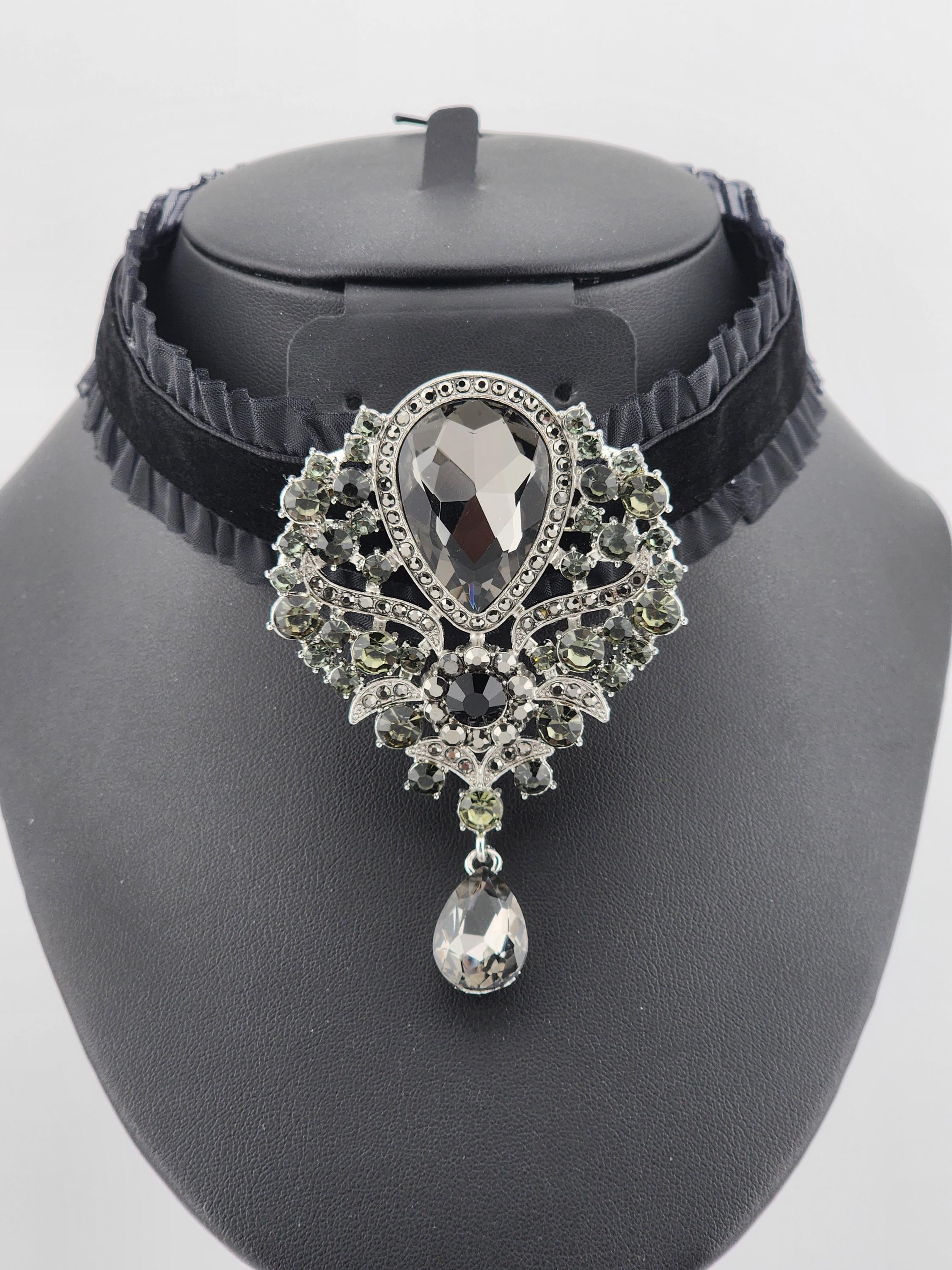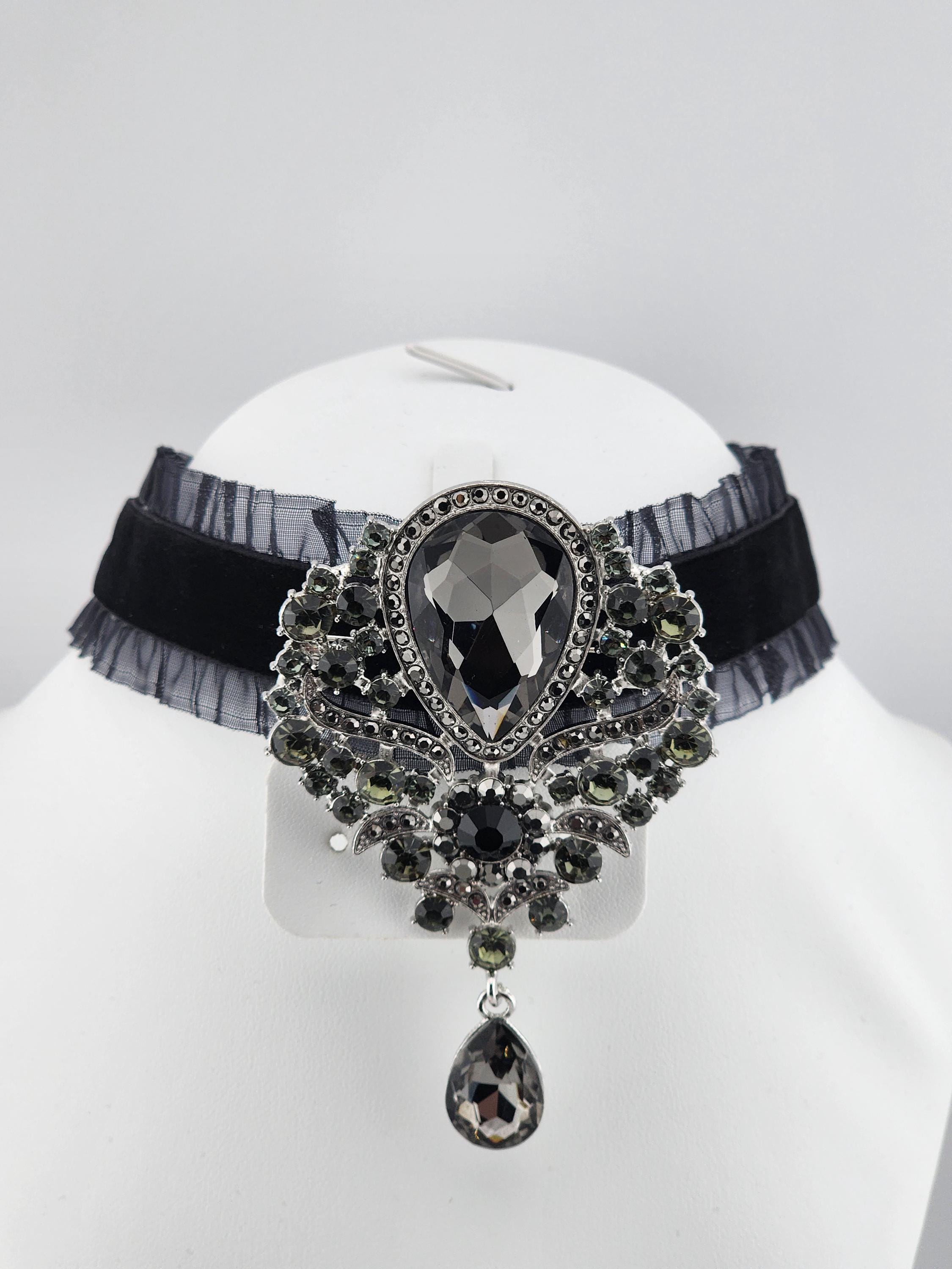 I made this stunning choker necklace with black velvet and black ruffle ribbon. Then I added a large ornate multi-crystal pendant. There are silver accents, a chain extender and a finishing faceted black embellishment. * Your purchase will arrive in pretty packaging * Shipping is free within the U.S.