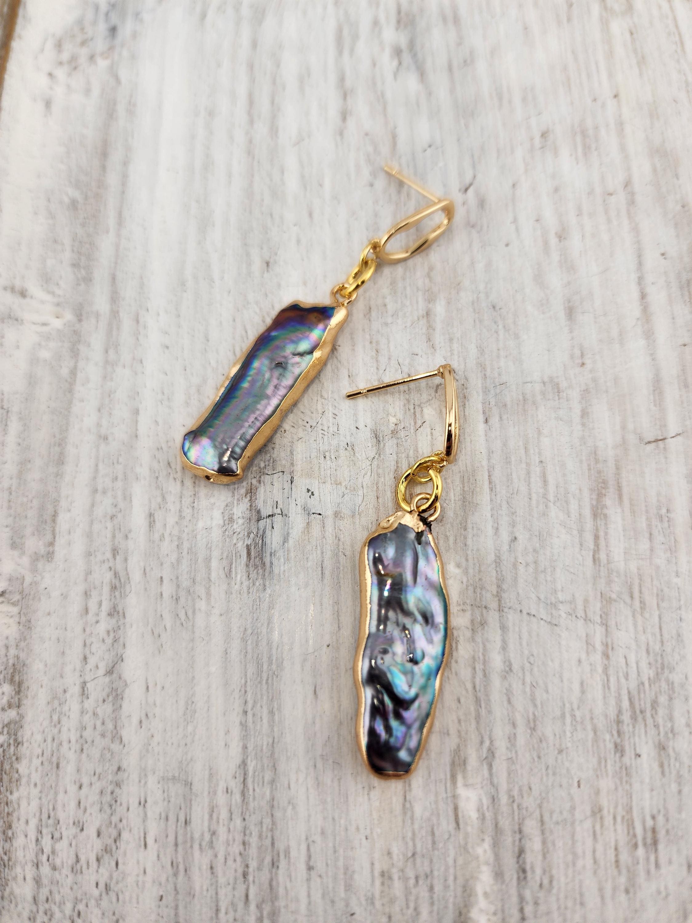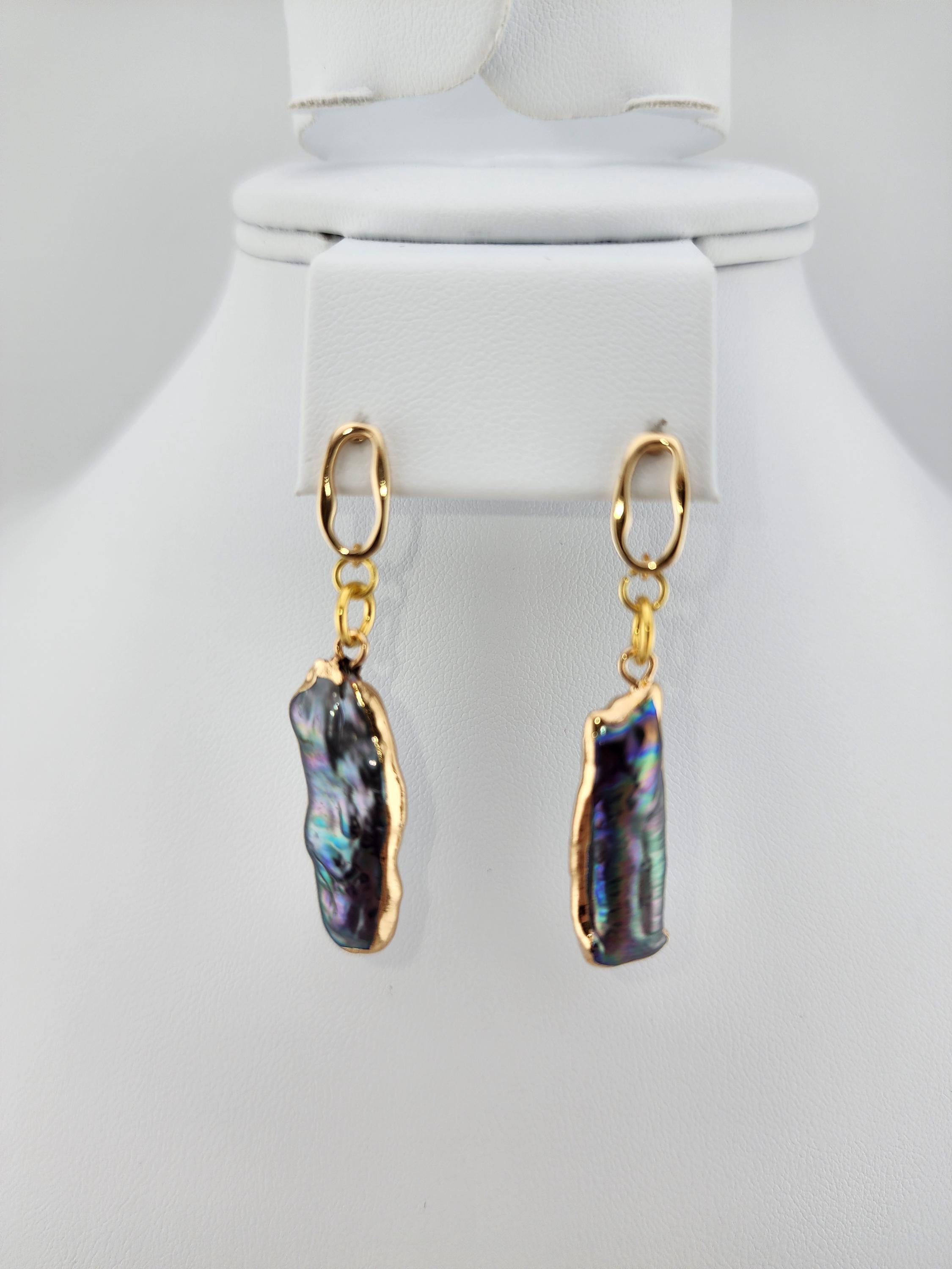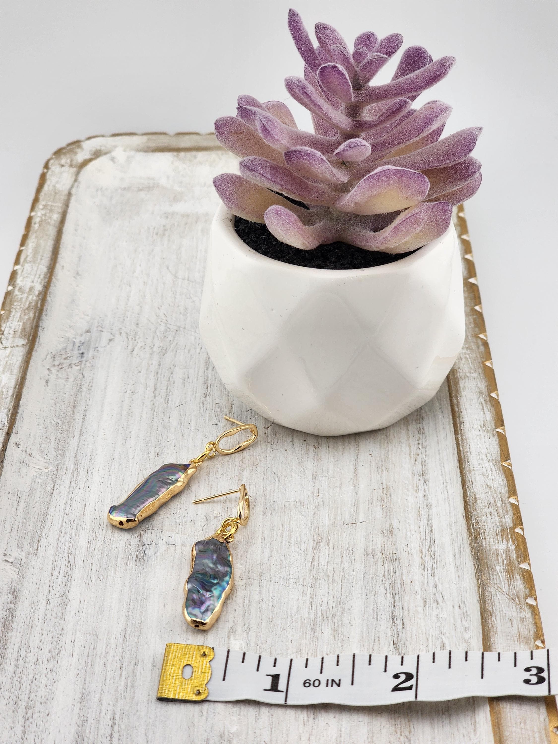 These are really special earrings. I made them with 18k gold plated organic shaped hollow oval posts. I added beautiful natural purple/green irregular rectangular shaped Biwa pearl charms with 24k gold plated connecting rings. Pearls come in all shapes, sizes and colors and these are incredible. * Your purchase will arrive in pretty packaging * Shipping is free within the U.S.