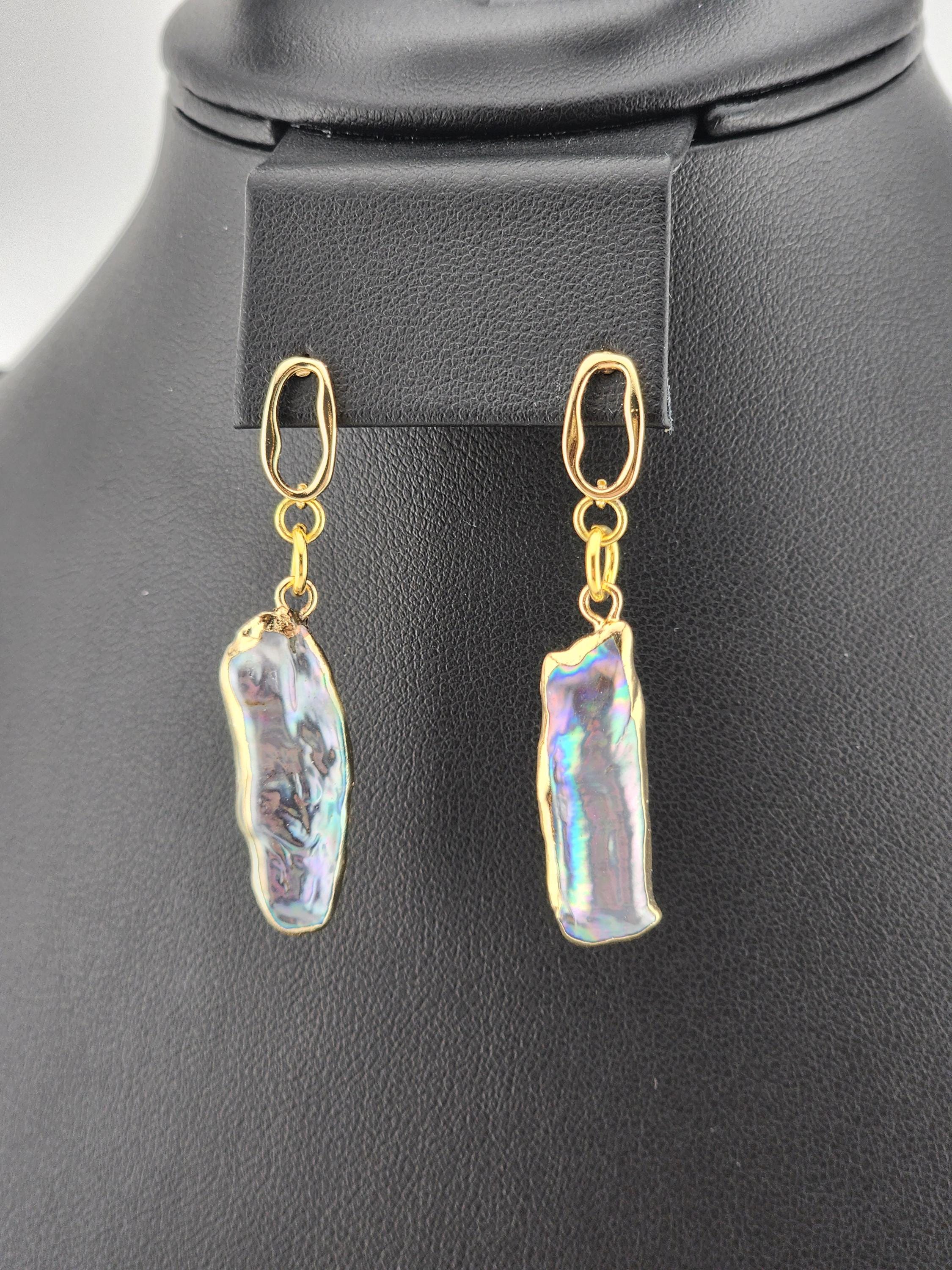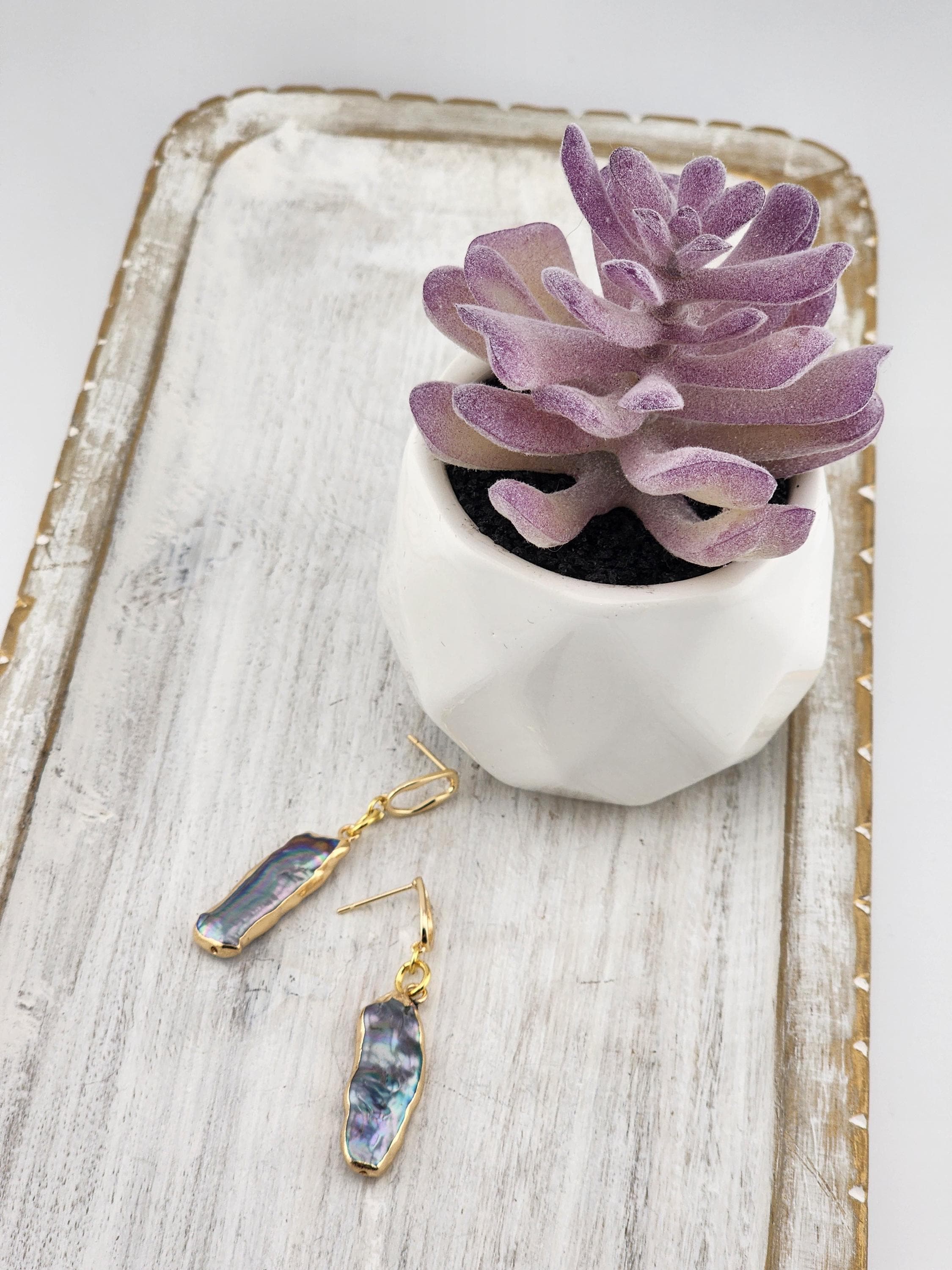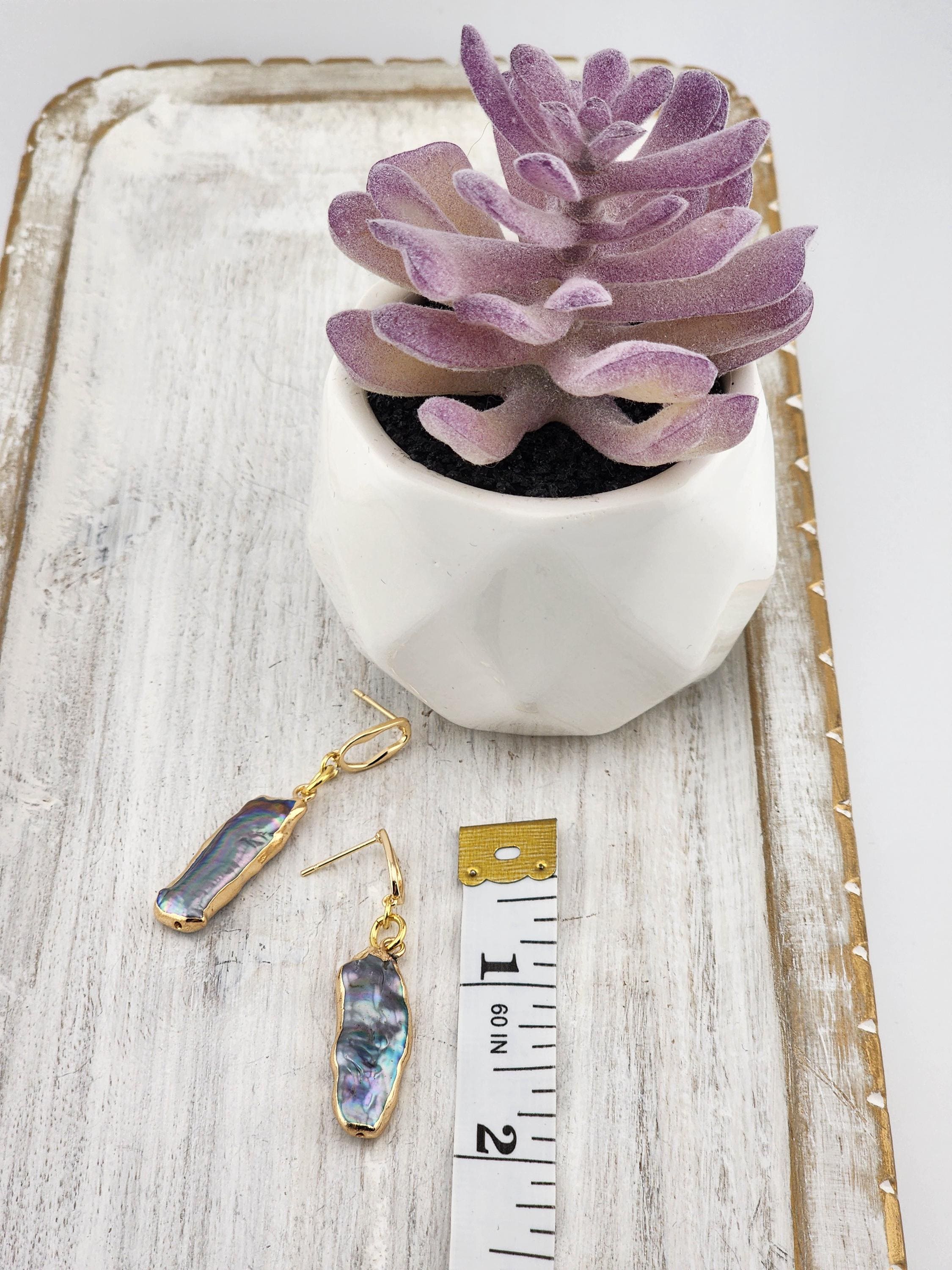 These are really special earrings. I made them with 18k gold plated organic shaped hollow oval posts. I added beautiful natural purple/green irregular rectangular shaped Biwa pearl charms with 24k gold plated connecting rings. Pearls come in all shapes, sizes and colors and these are incredible. * Your purchase will arrive in pretty packaging * Shipping is free within the U.S.