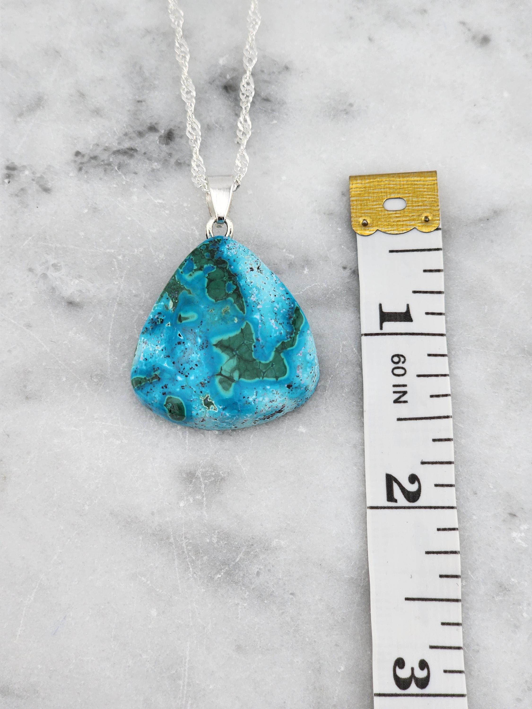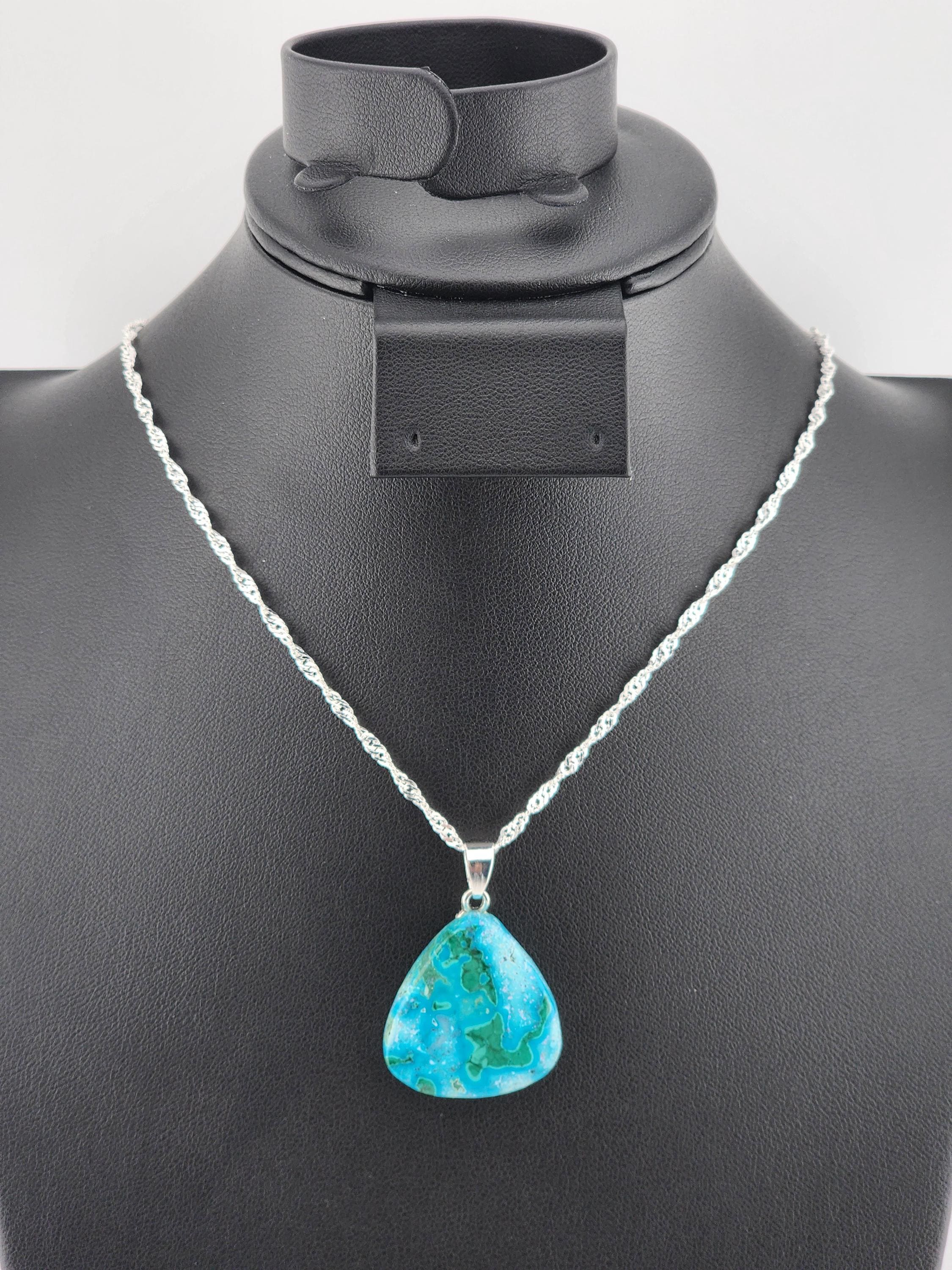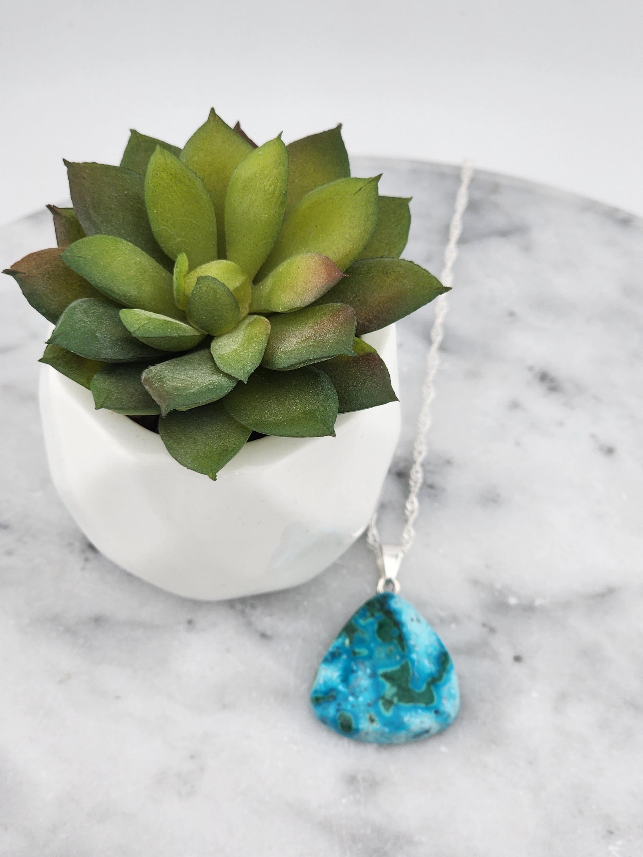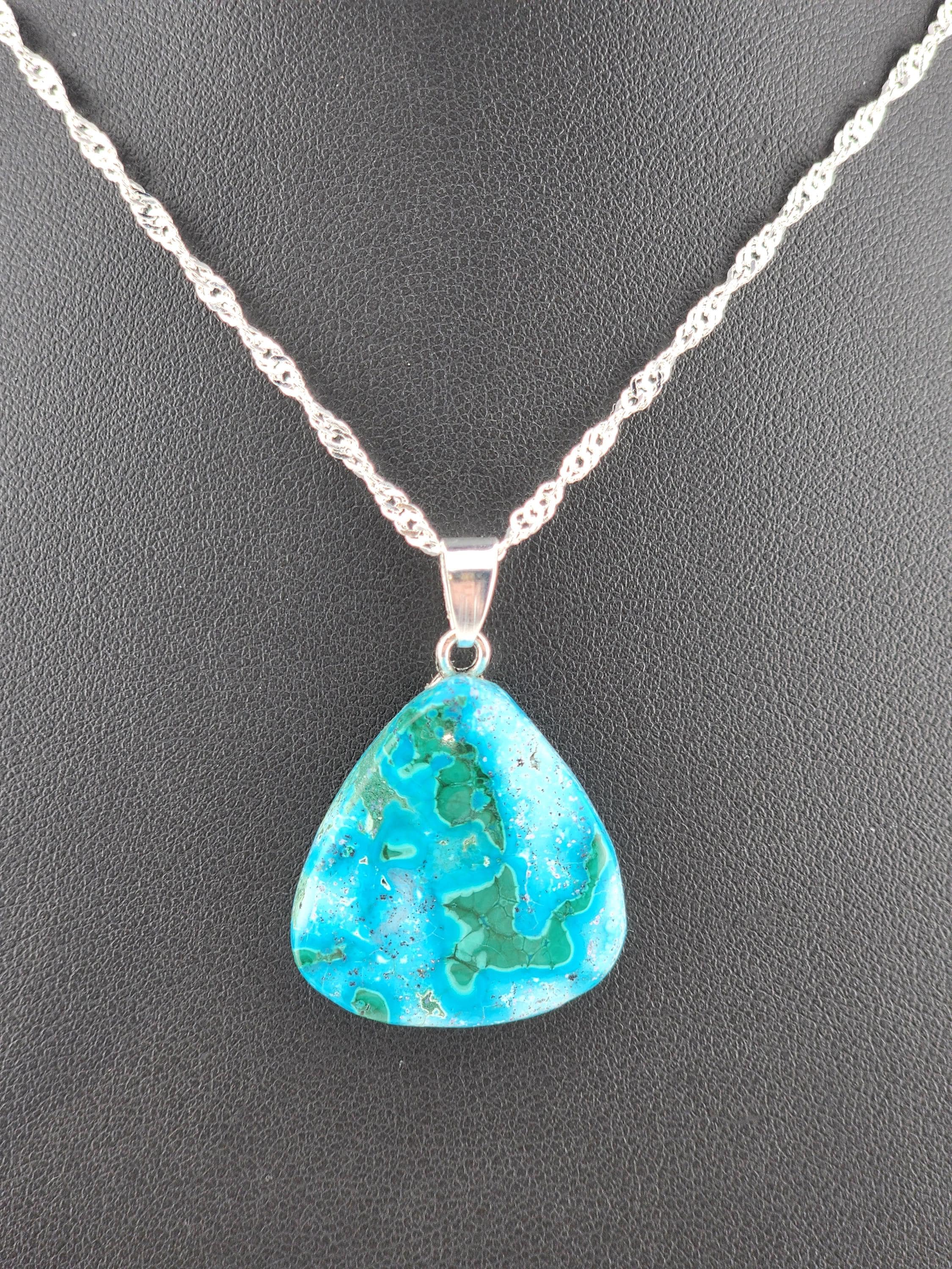 I made this necklace using bright and shiny twisted sterling silver chain with an extender chain. It has a triangular shaped Chrysocolla Malachite stone pendant. Beautiful blues and greens. The length of the chain may be altered upon request. * Your purchase will arrive in pretty packaging * Shipping is free within the U.S.