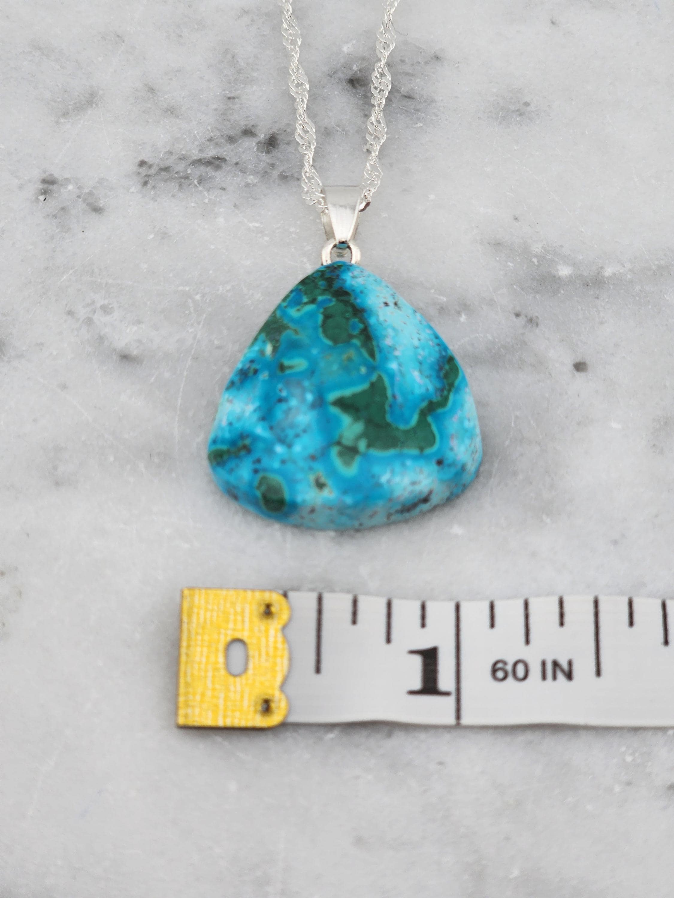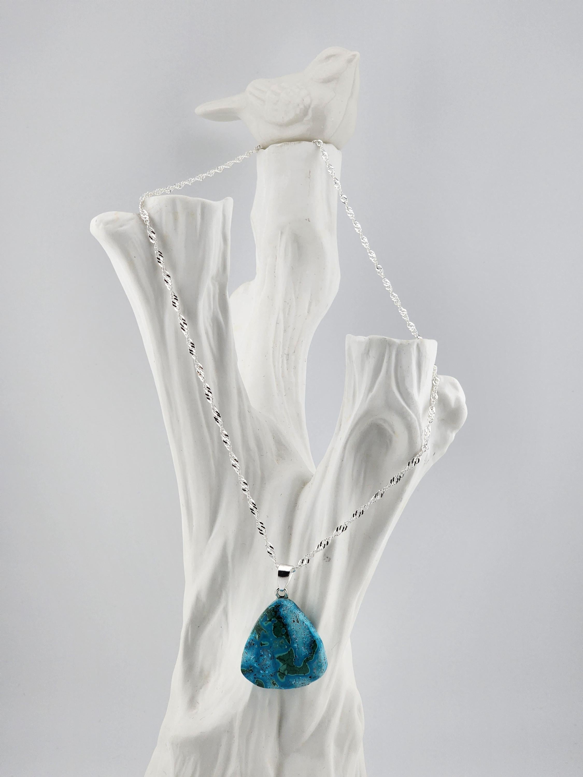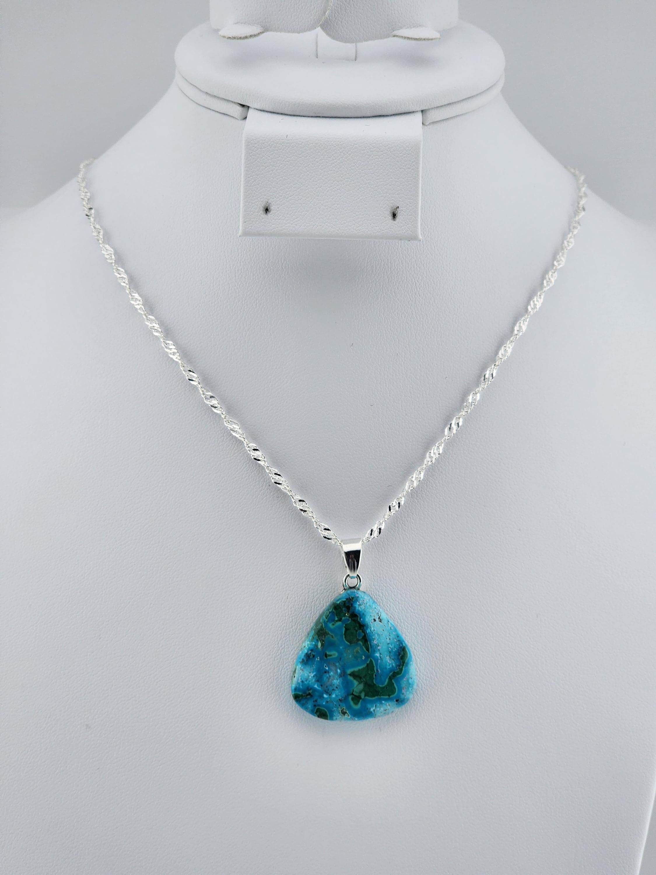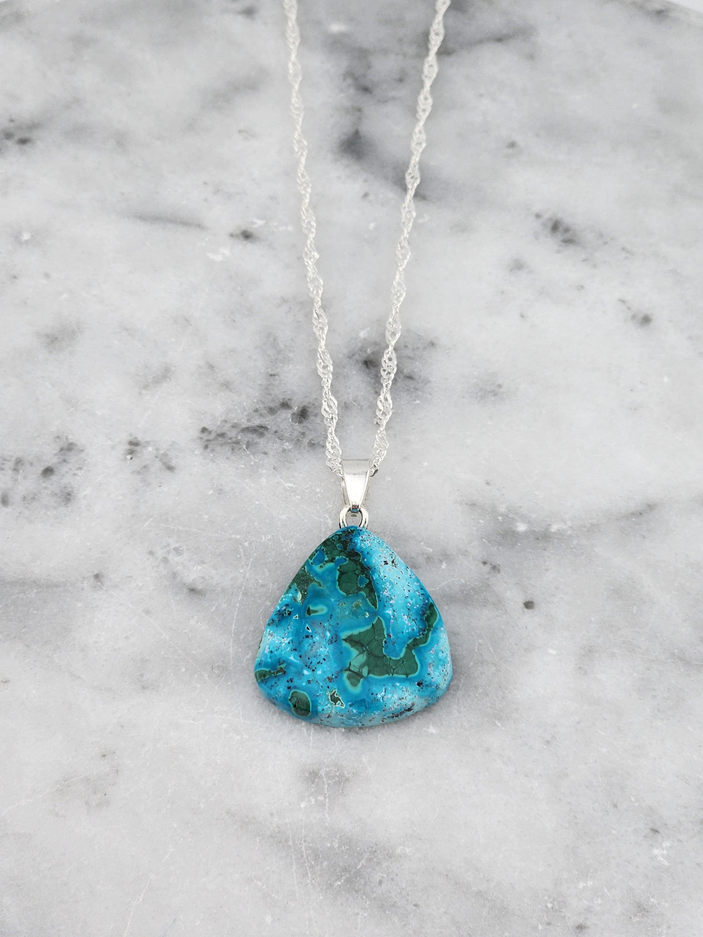 I made this necklace using bright and shiny twisted sterling silver chain with an extender chain. It has a triangular shaped Chrysocolla Malachite stone pendant. Beautiful blues and greens. The length of the chain may be altered upon request. * Your purchase will arrive in pretty packaging * Shipping is free within the U.S.