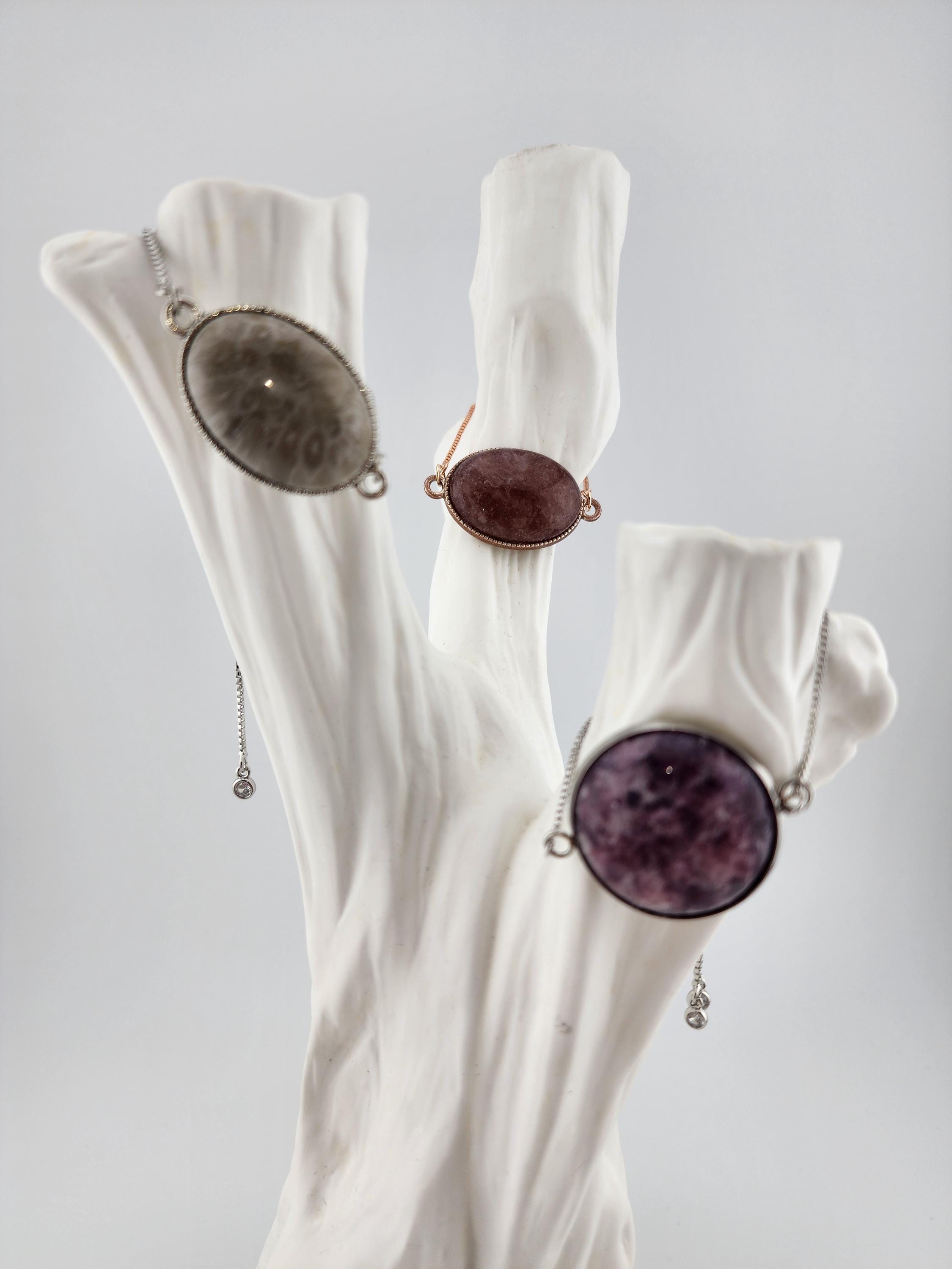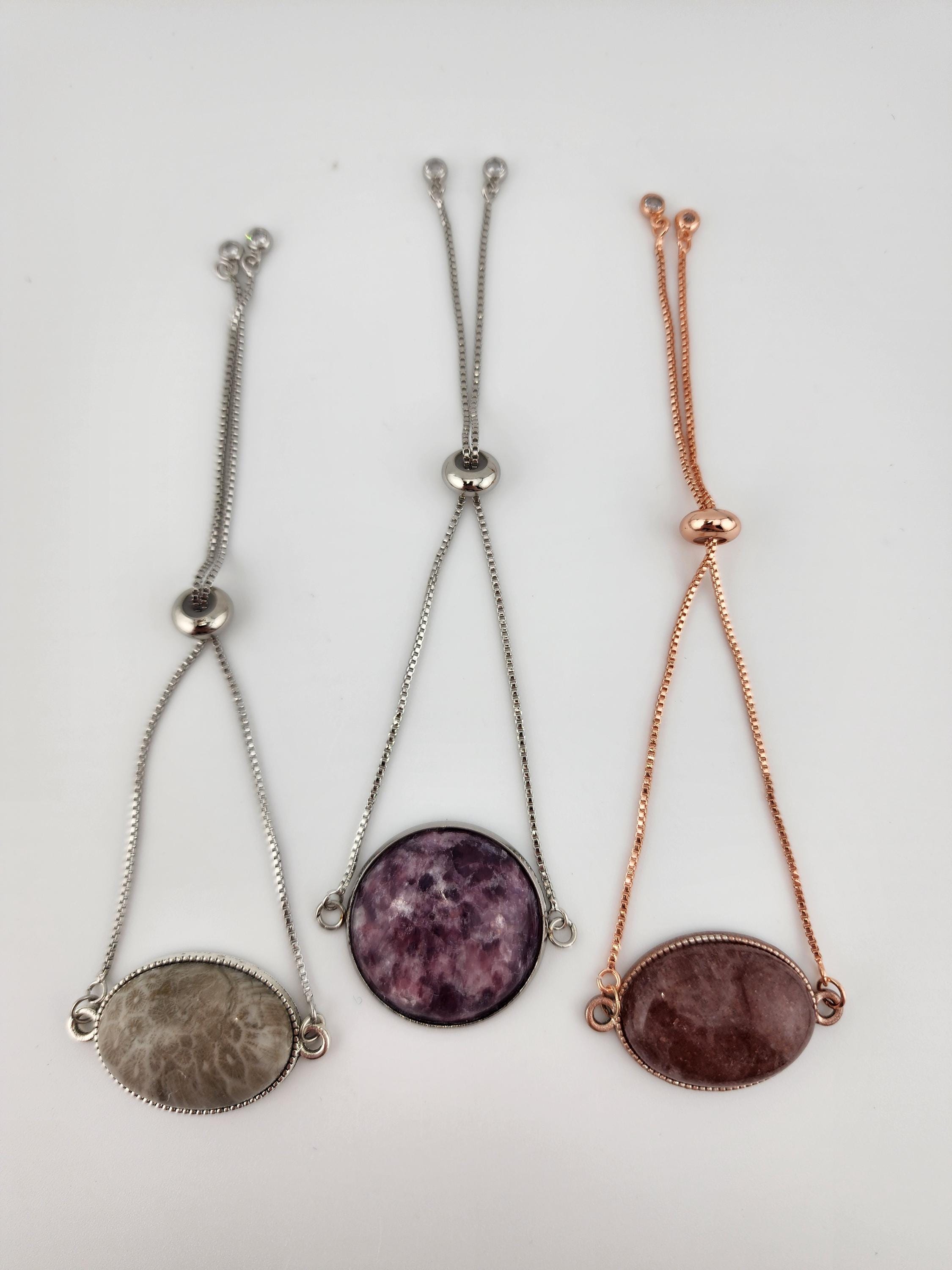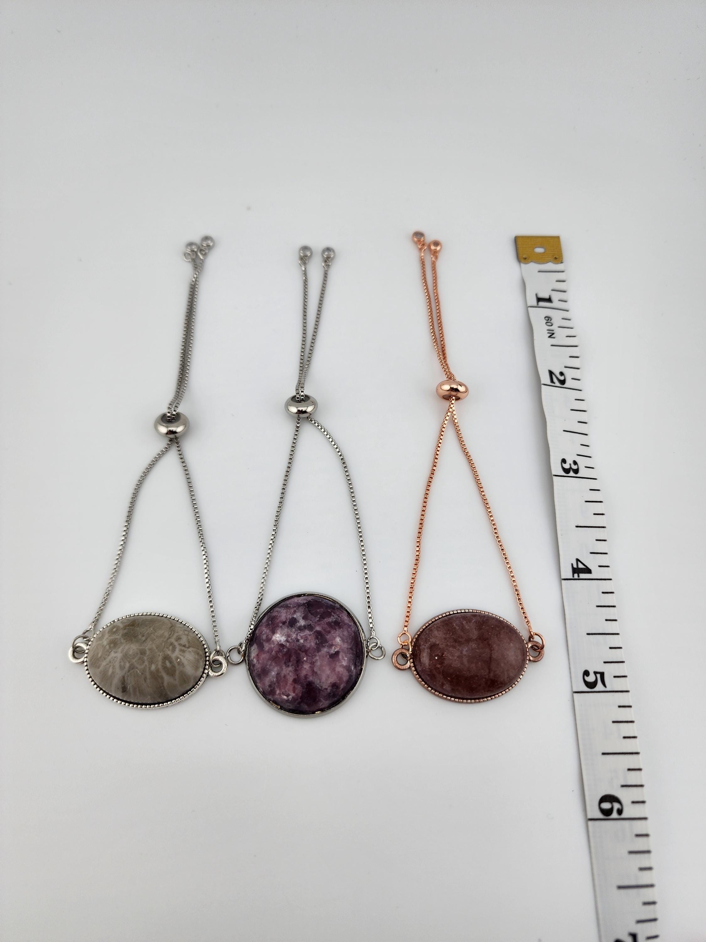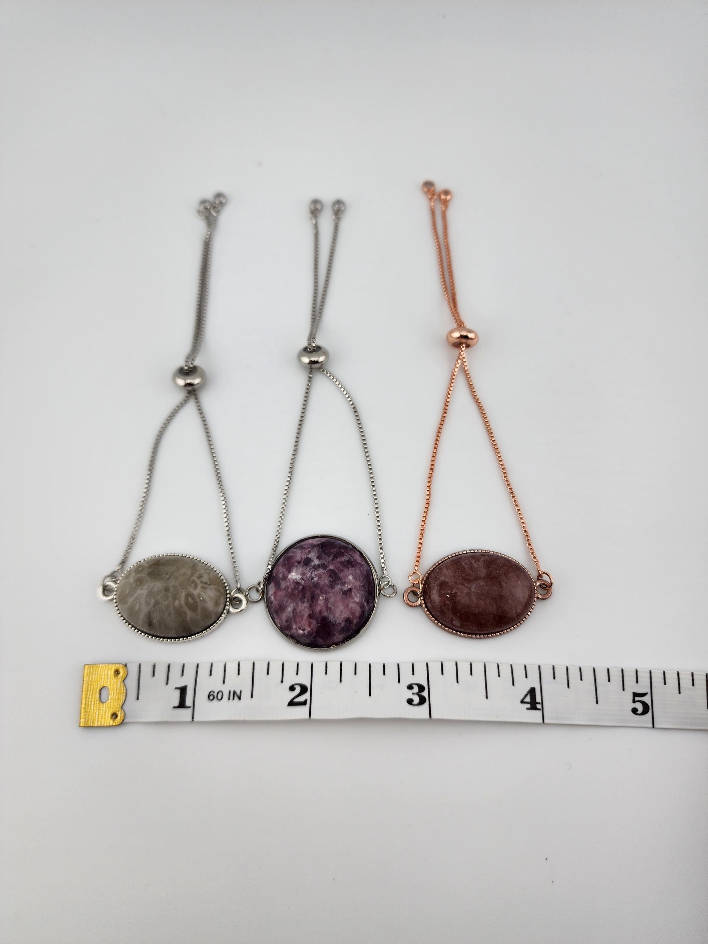 I made three options for you to choose from. #1- Silver slider bracelet with small round finishing crystals. It has an oval shaped Gray Fossilized Coral connector. #2- Silver slider bracelet with small round finishing crystals. It has a Purple Charoite stone connector. #3- Rose Gold slider bracelet with small finishing crystals. It has a Pink Strawberry Quartz connector. * Your purchase will arrive arrive in pretty packaging * Shipping is free within the U.S.
