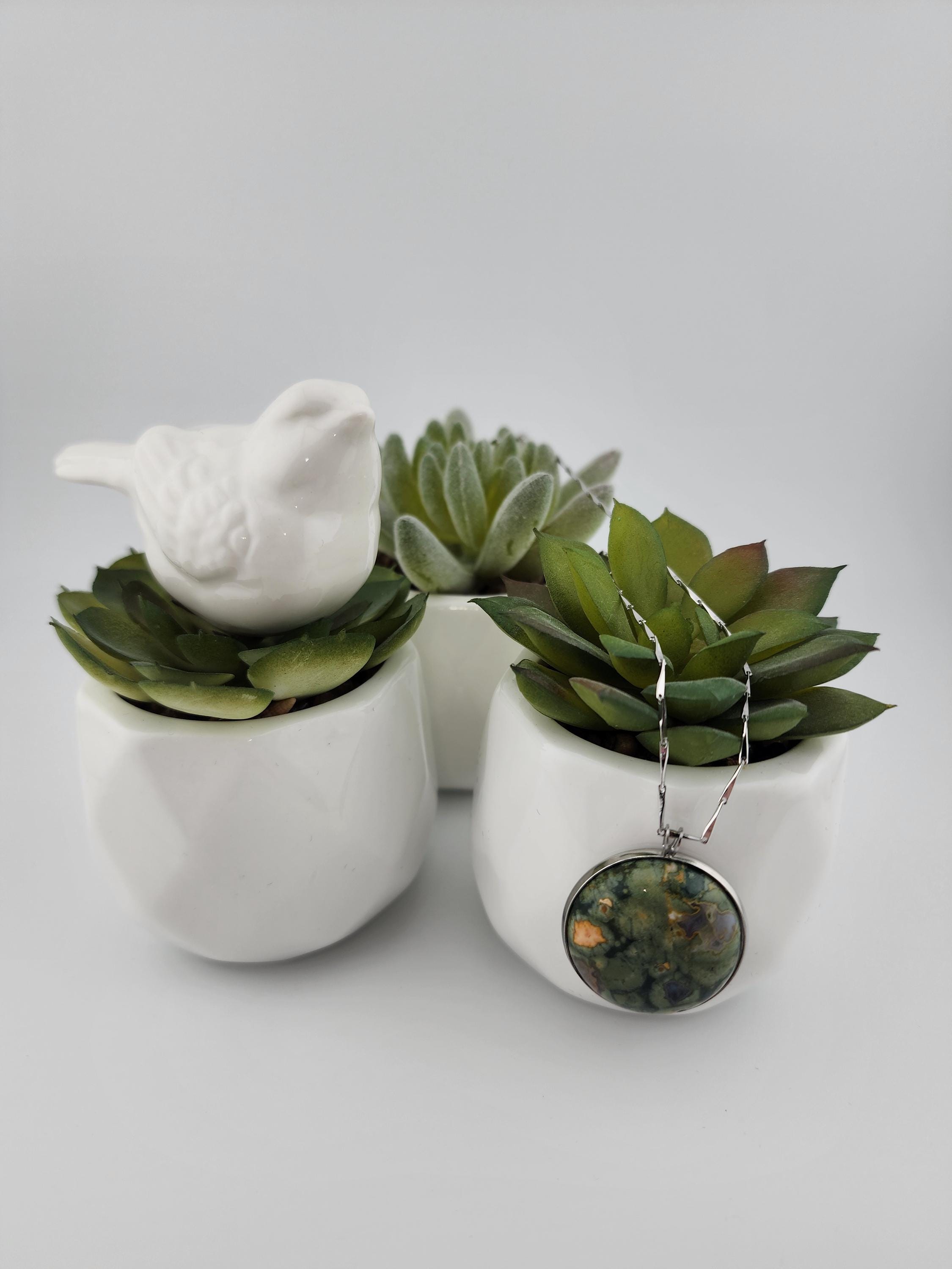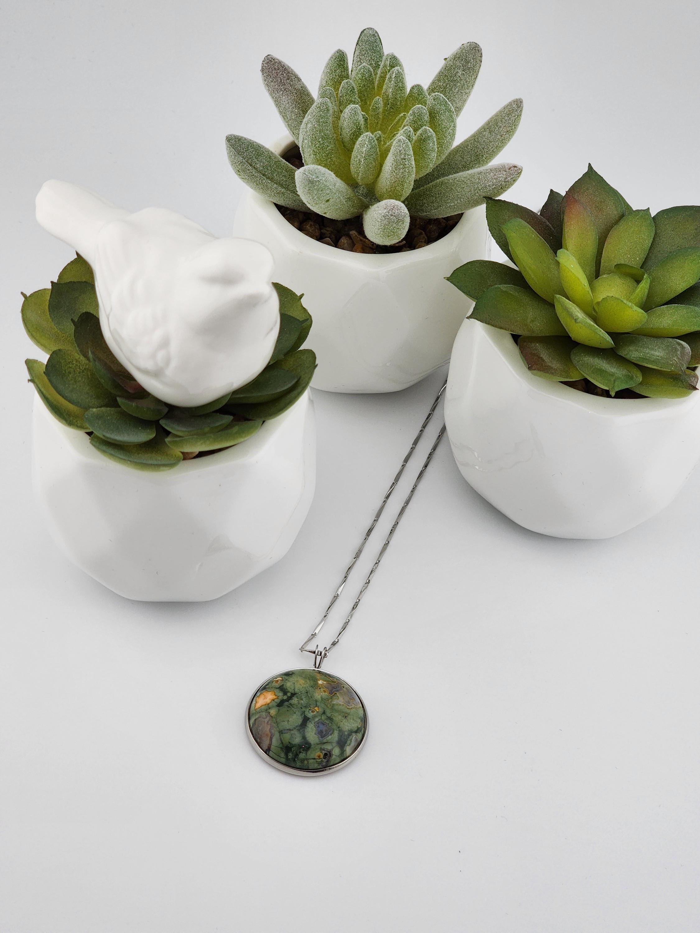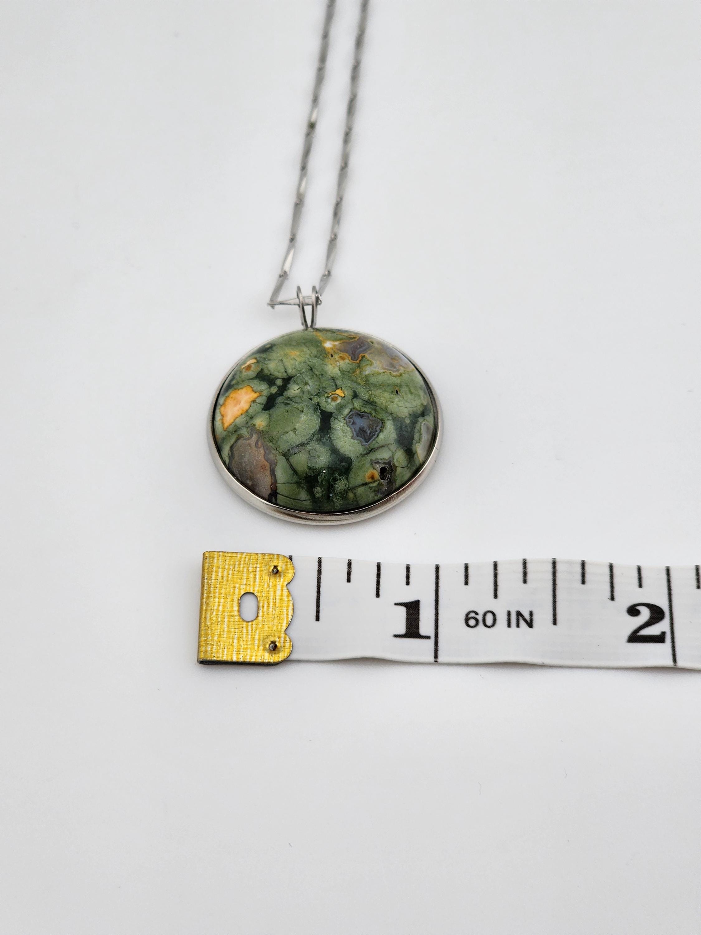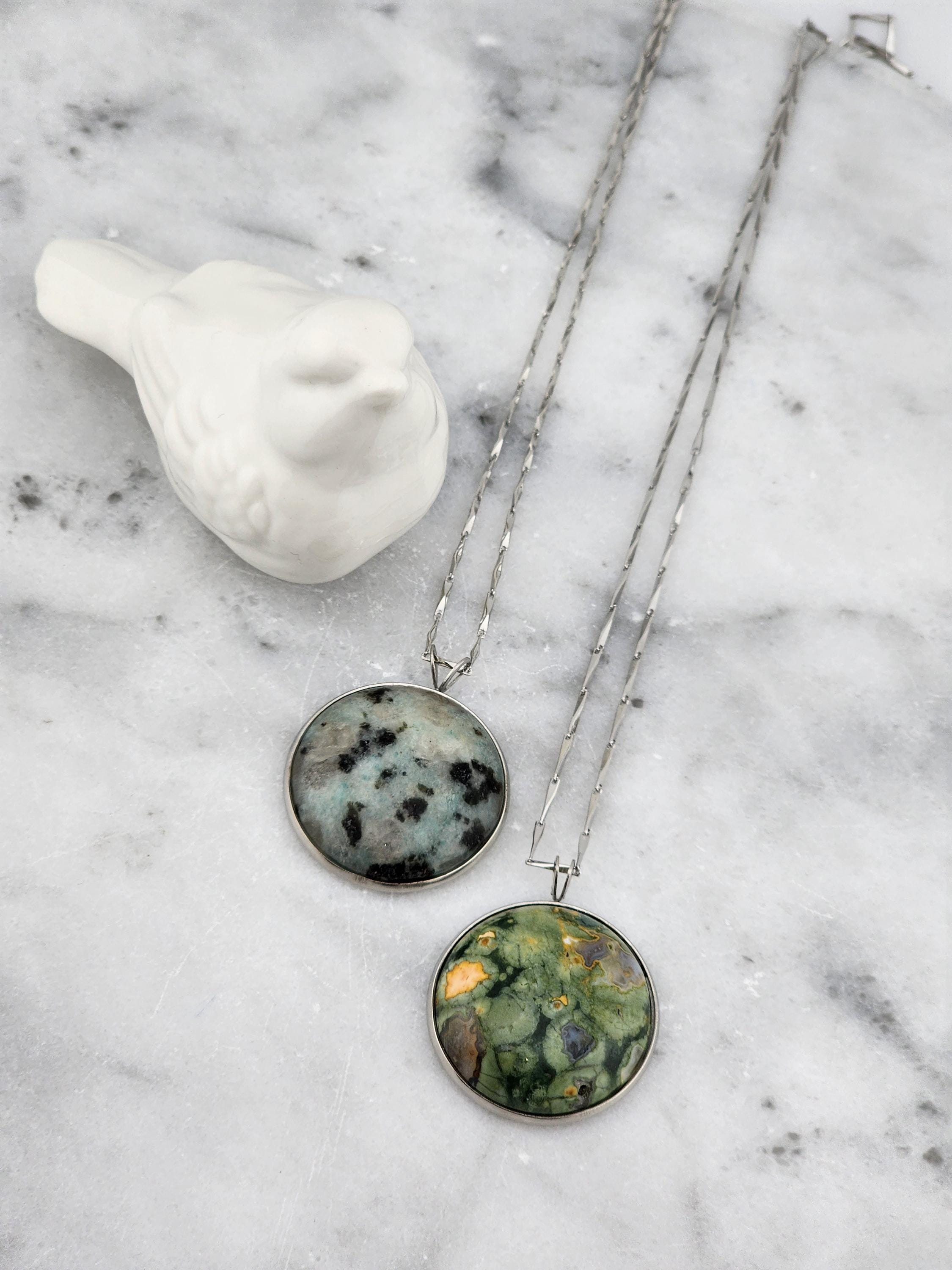 I made these necklaces using ornate sterling silver specialty chain. You have the choice of: #1- a 25mm round purple, green and orange semi-precious gemstone cabochon pendant, or #2- a 25mm round Kiwi Jasper gemstone cabochon pendant * Your purchase will arrive in pretty packaging * Shipping is free within the U.S.