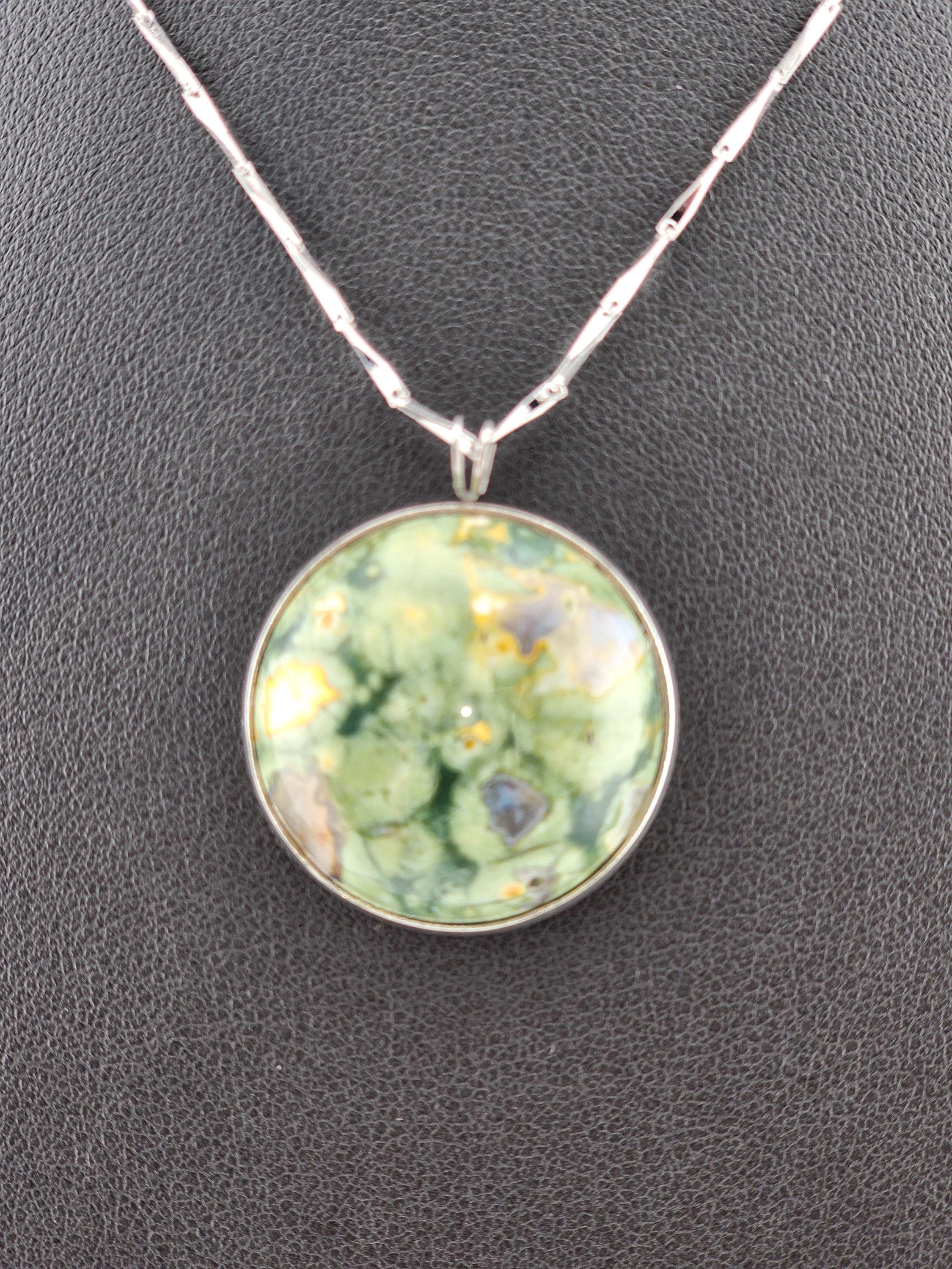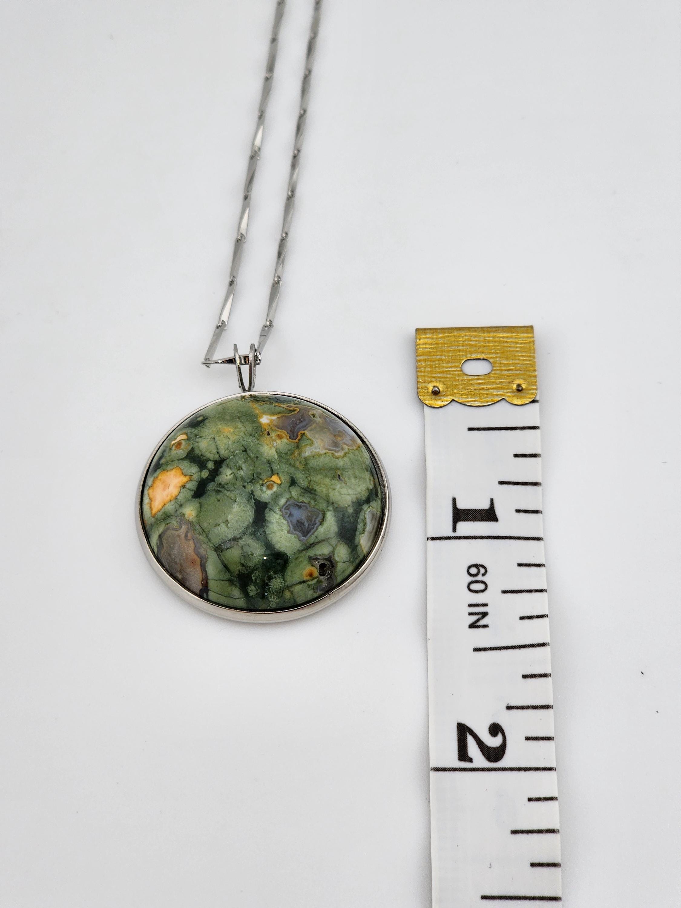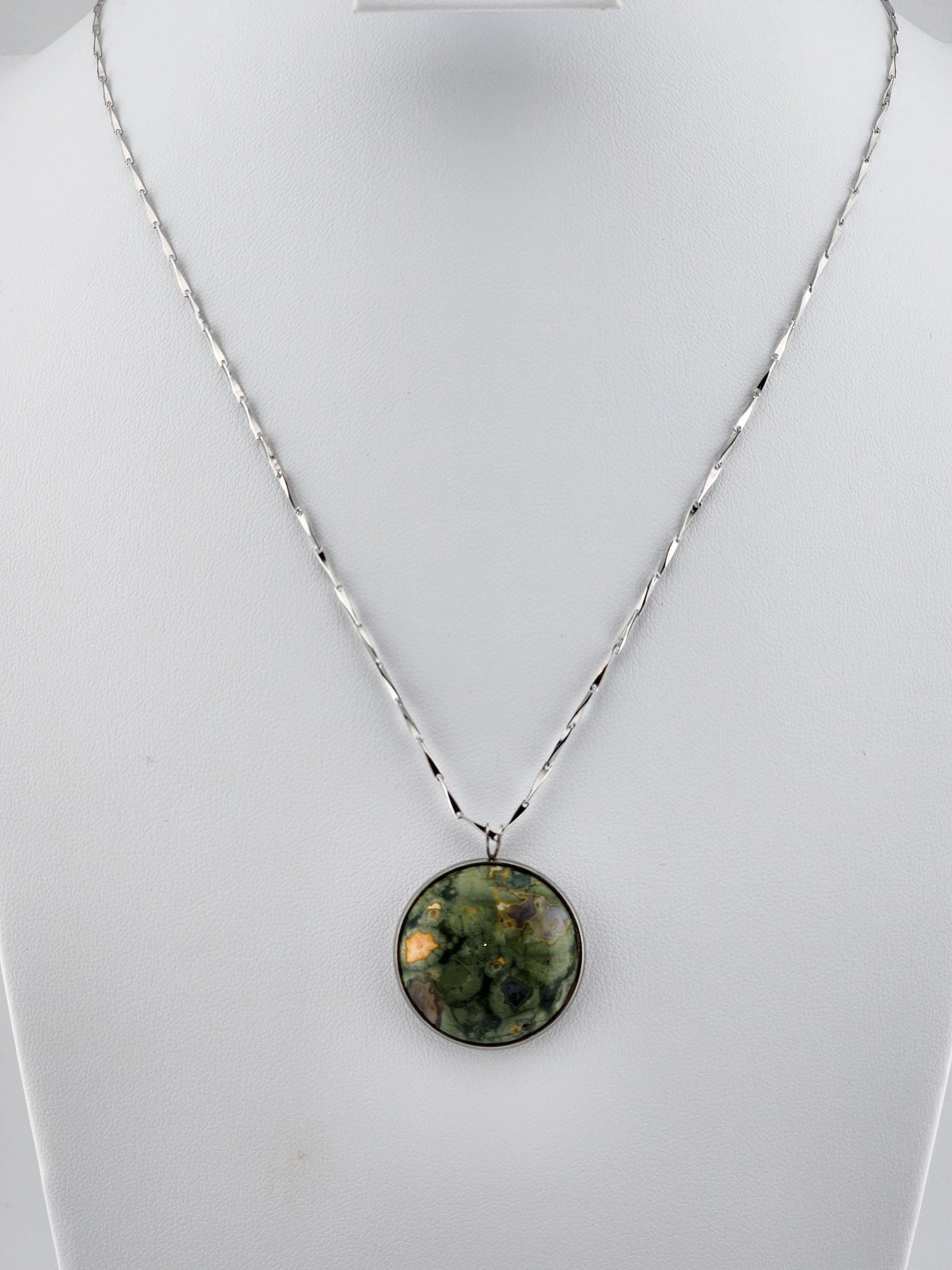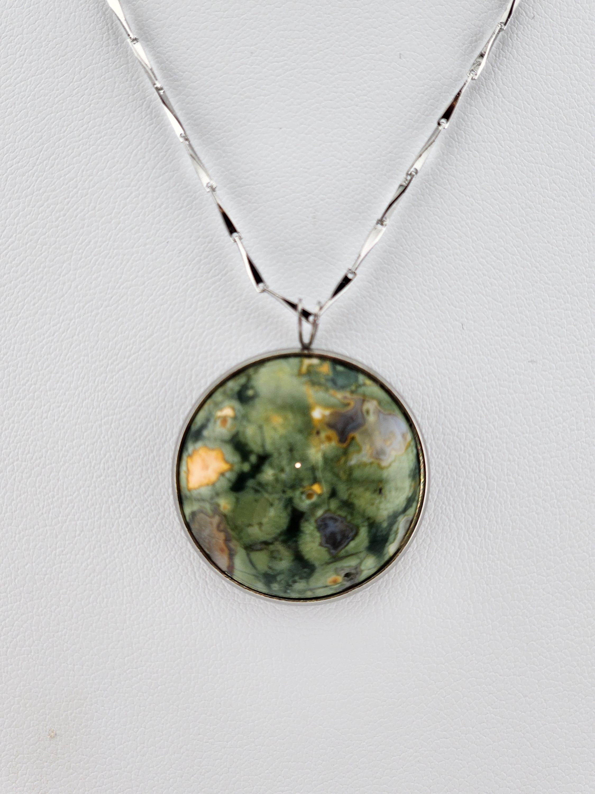 I made these necklaces using ornate sterling silver specialty chain. You have the choice of: #1- a 25mm round purple, green and orange semi-precious gemstone cabochon pendant, or #2- a 25mm round Kiwi Jasper gemstone cabochon pendant * Your purchase will arrive in pretty packaging * Shipping is free within the U.S.