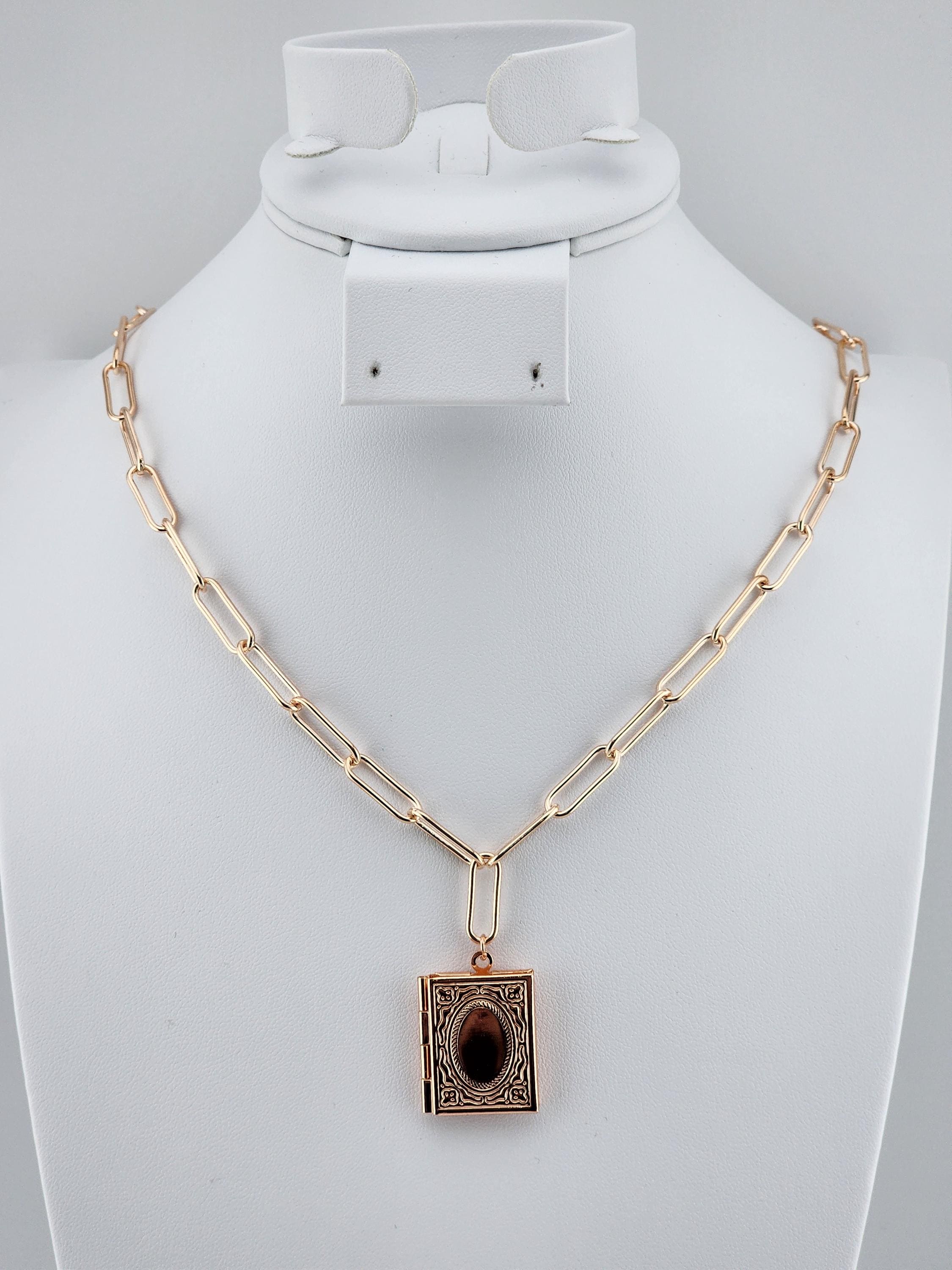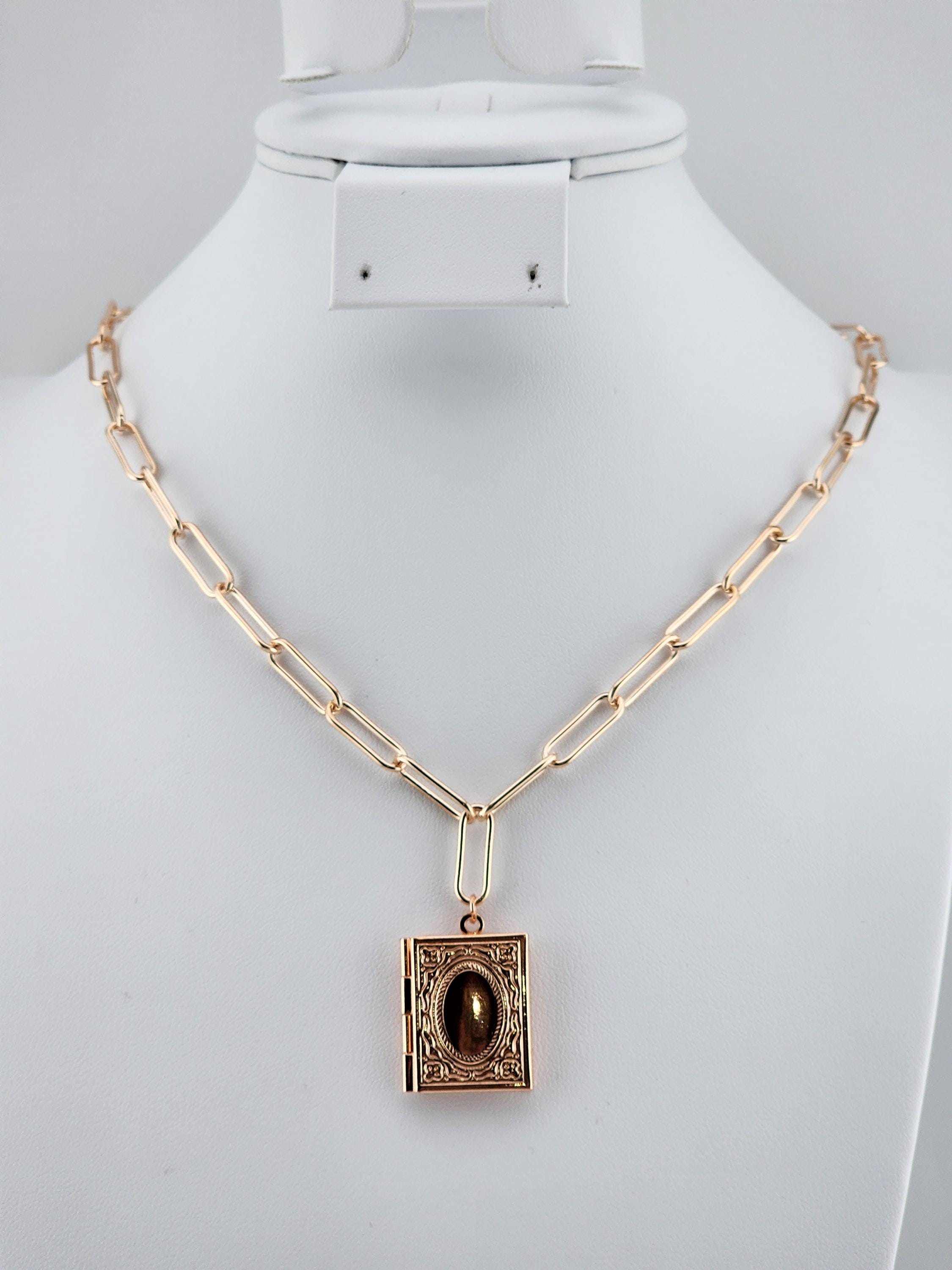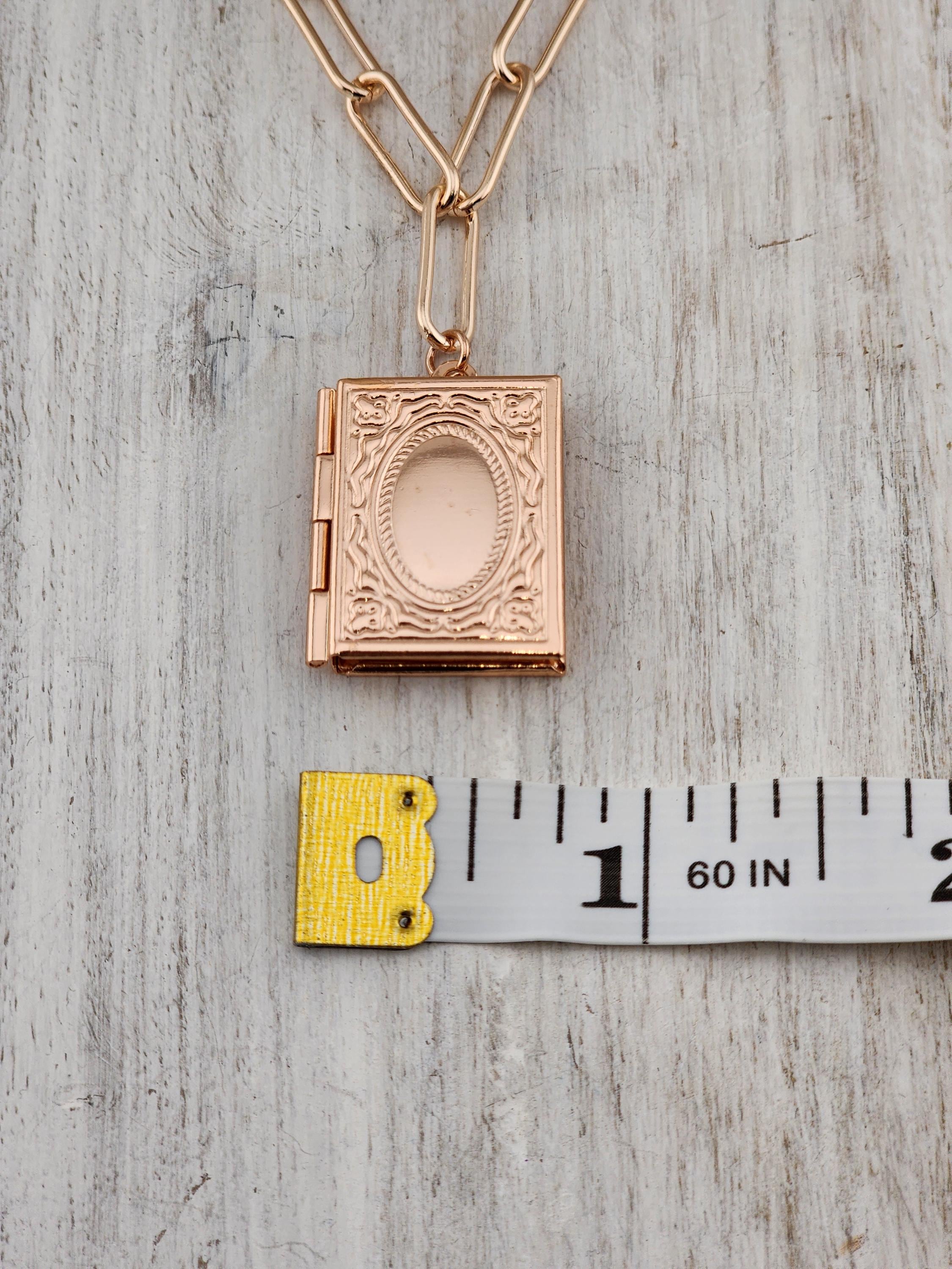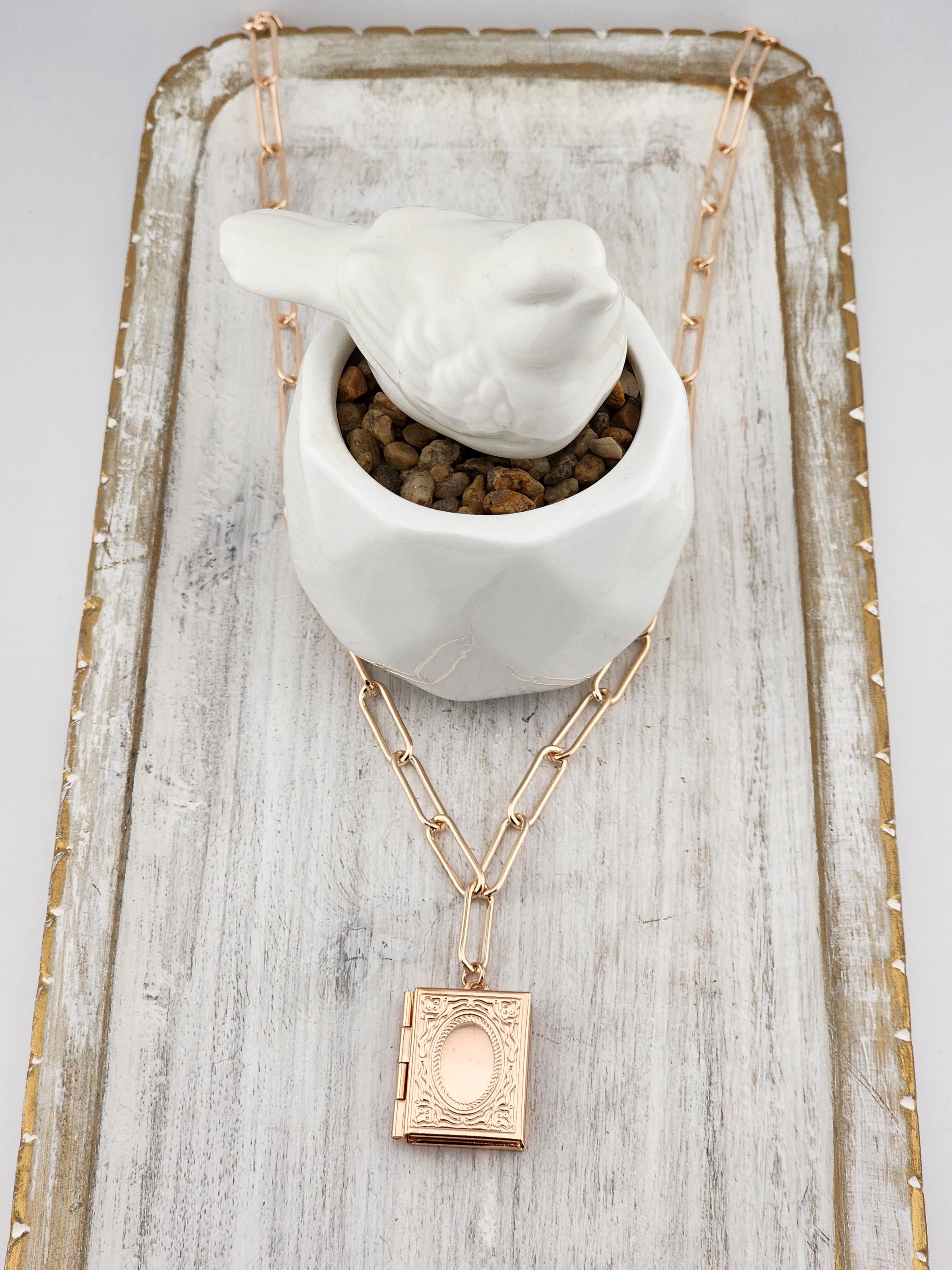 I made this necklace using tarnish resistant rose gold plated paper clip chain with rose gold filled connecting rings and a rose gold plated clasp. It has a rose gold brass "book" shaped locket. * Your purchase will arrive in pretty packaging * Shipping is free within the U.S.