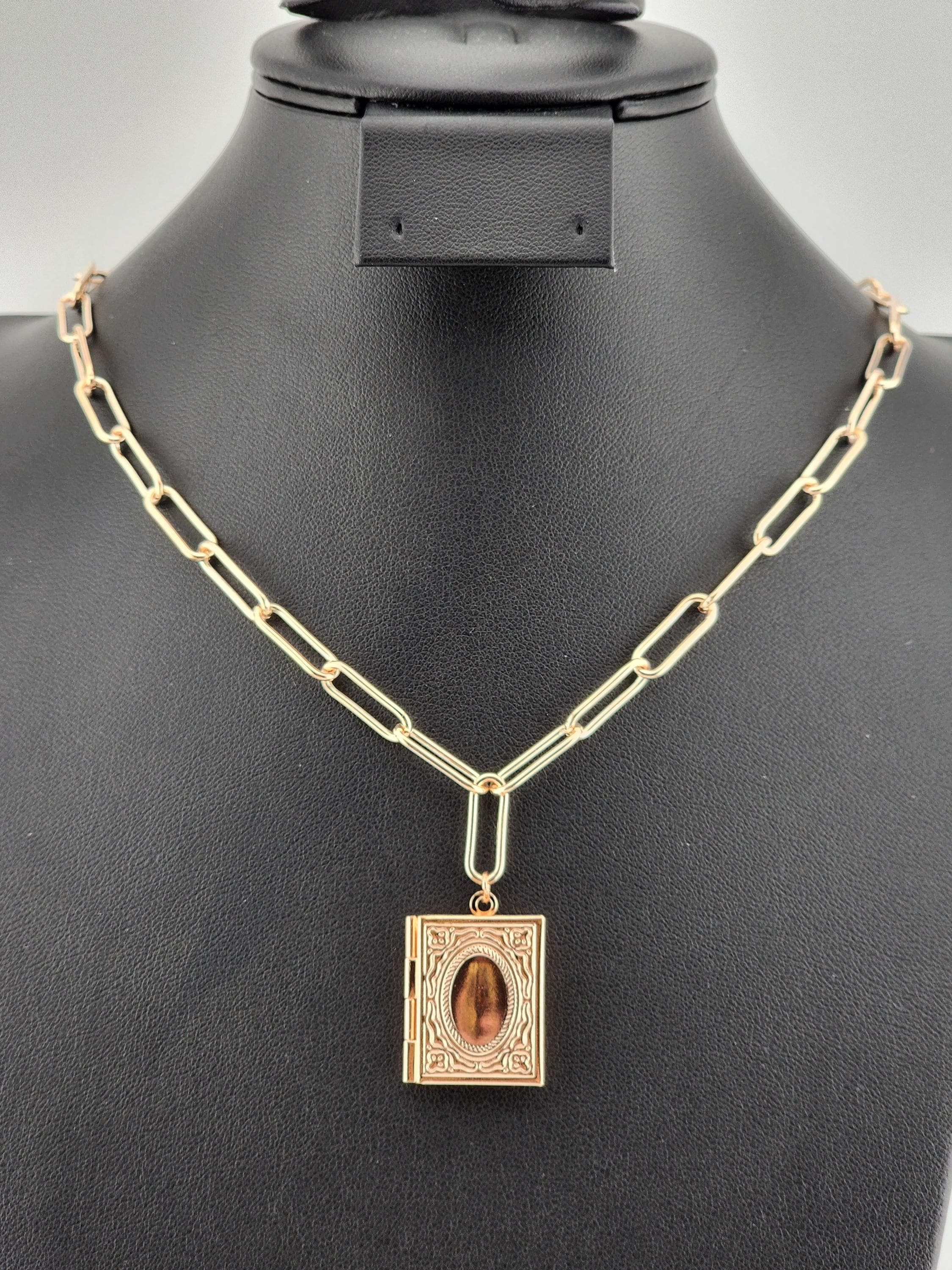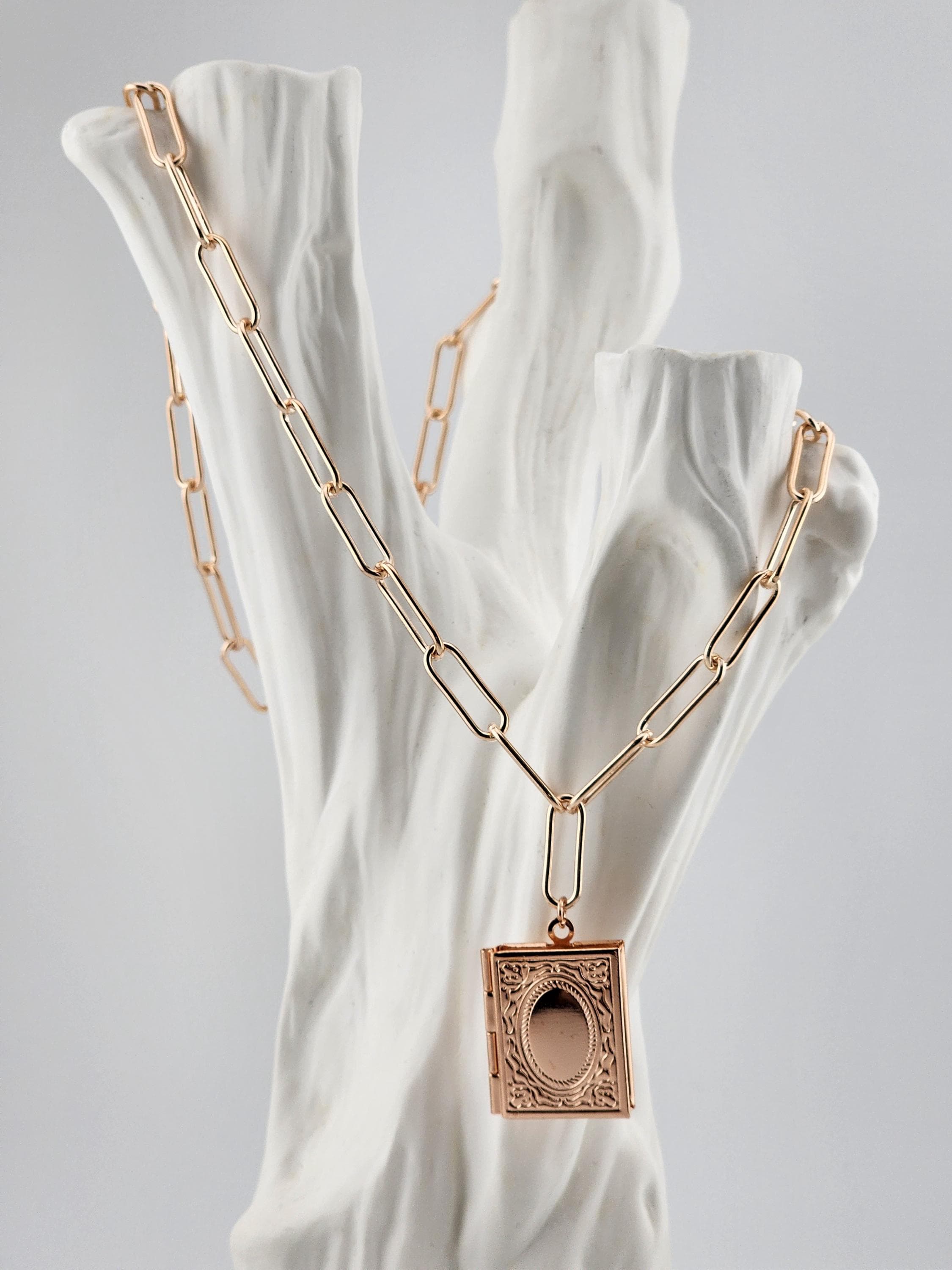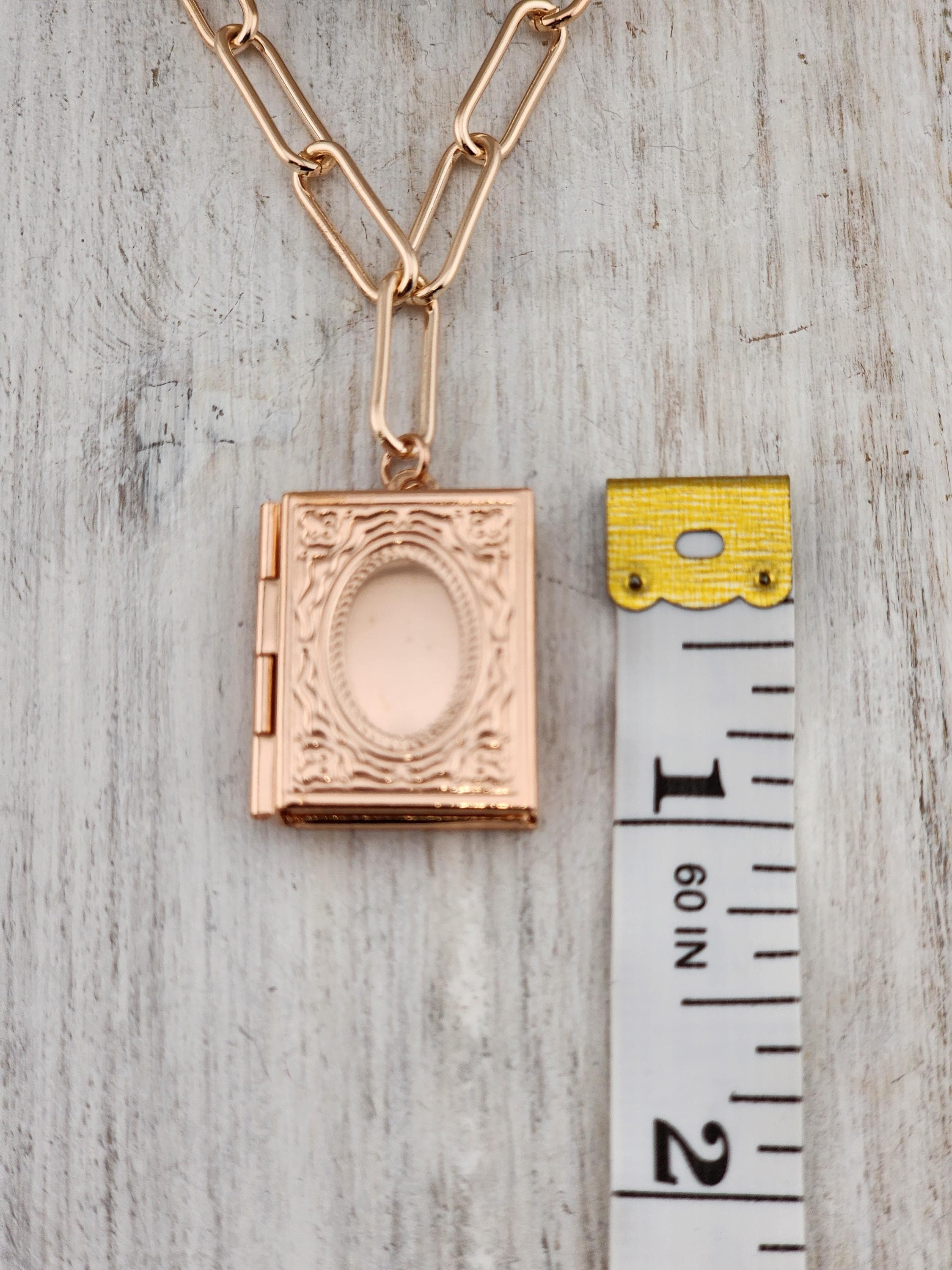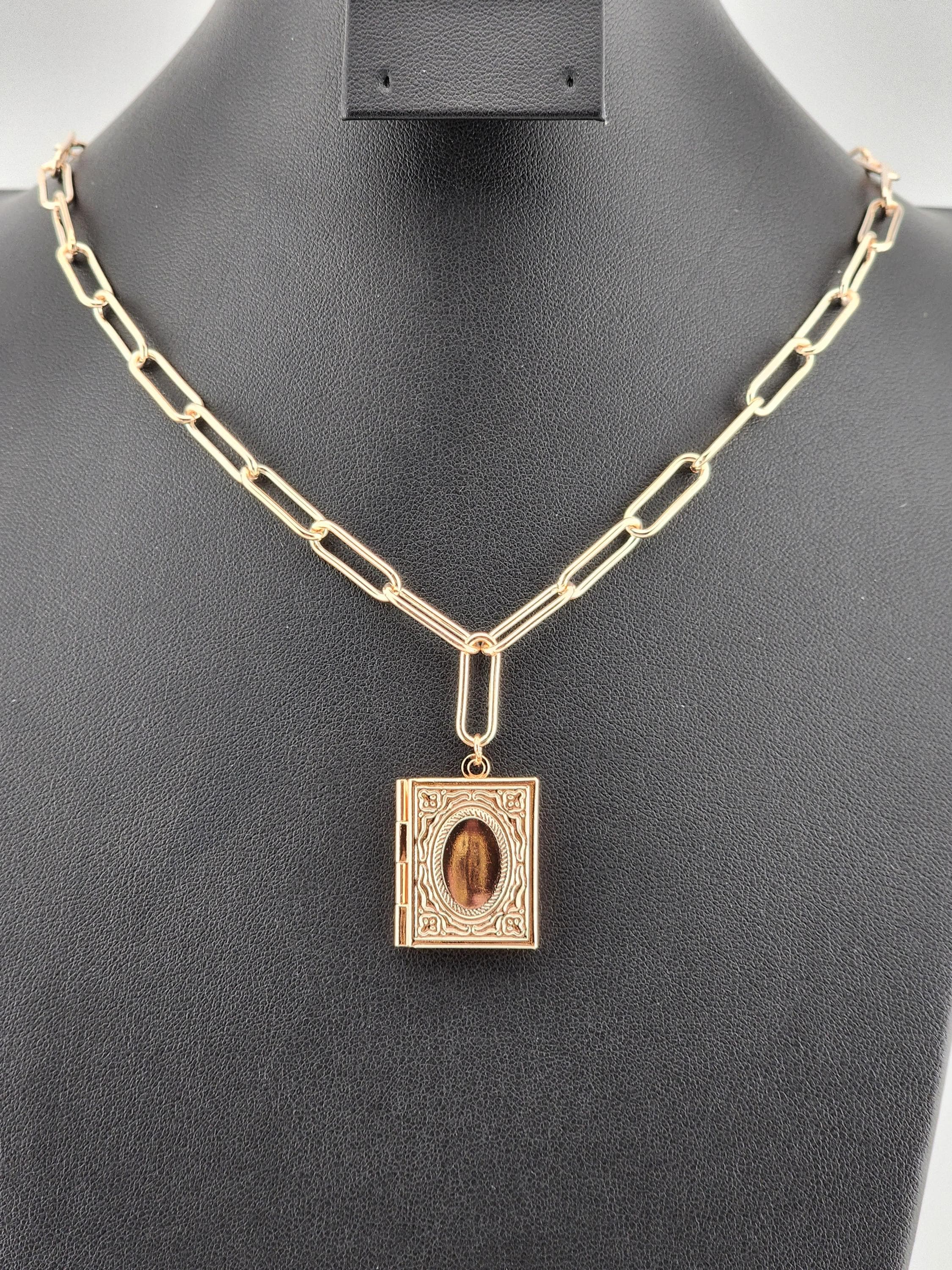 I made this necklace using tarnish resistant rose gold plated paper clip chain with rose gold filled connecting rings and a rose gold plated clasp. It has a rose gold brass "book" shaped locket. * Your purchase will arrive in pretty packaging * Shipping is free within the U.S.