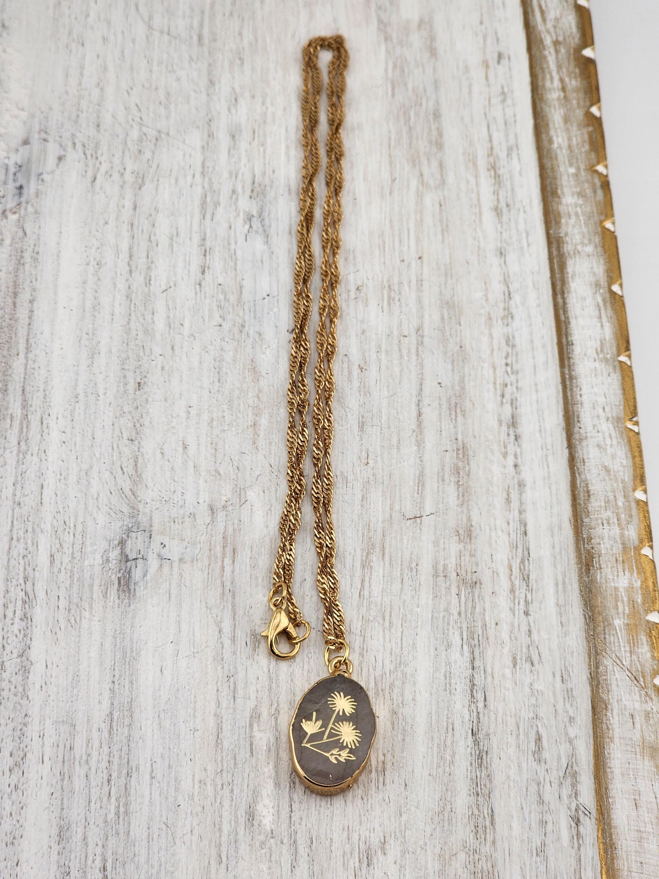 I made this necklace using gorgeous tarnish resistant antique 18k gold plated brass twisted chain with an 18k gold plated clasp and 18k gold plated connecting rings. The pendant is an oval shaped gray quartz crystal wrapped in gold brass that is embellished with gold wildflowers & hangs from an 18k gold plated ring. * Your purchase will arrive in pretty packaging
