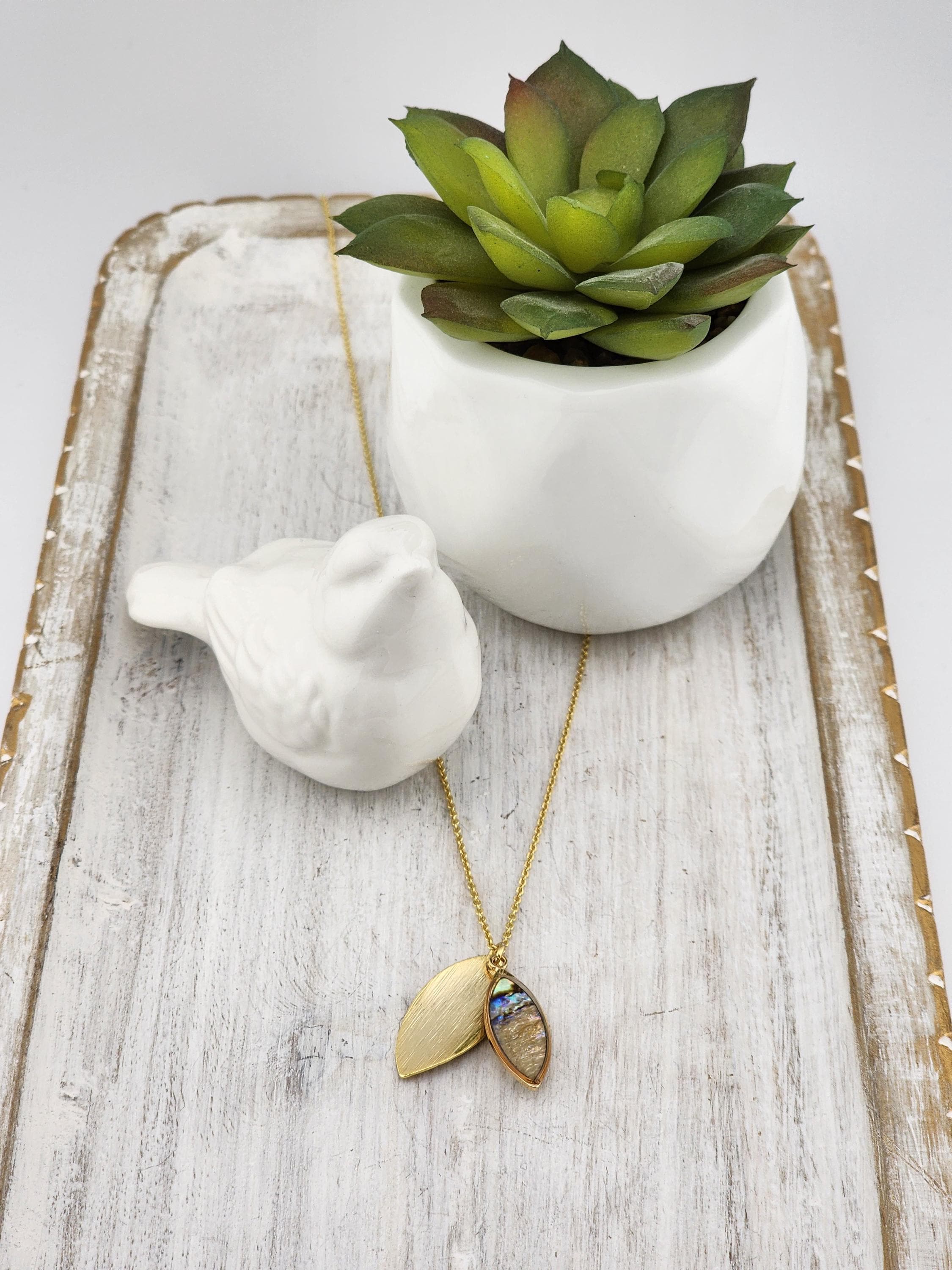 I made this necklace using delicate tarnish resistant 18k gold plated chain. It has a 16k gold plated clasp and connecting rings. The pendant is a 24k gold plated brass leaf with a leaf shaped abalone shell and is hanging from a 24k gold plated ring bail. * Your purchase will arrive in pretty packaging