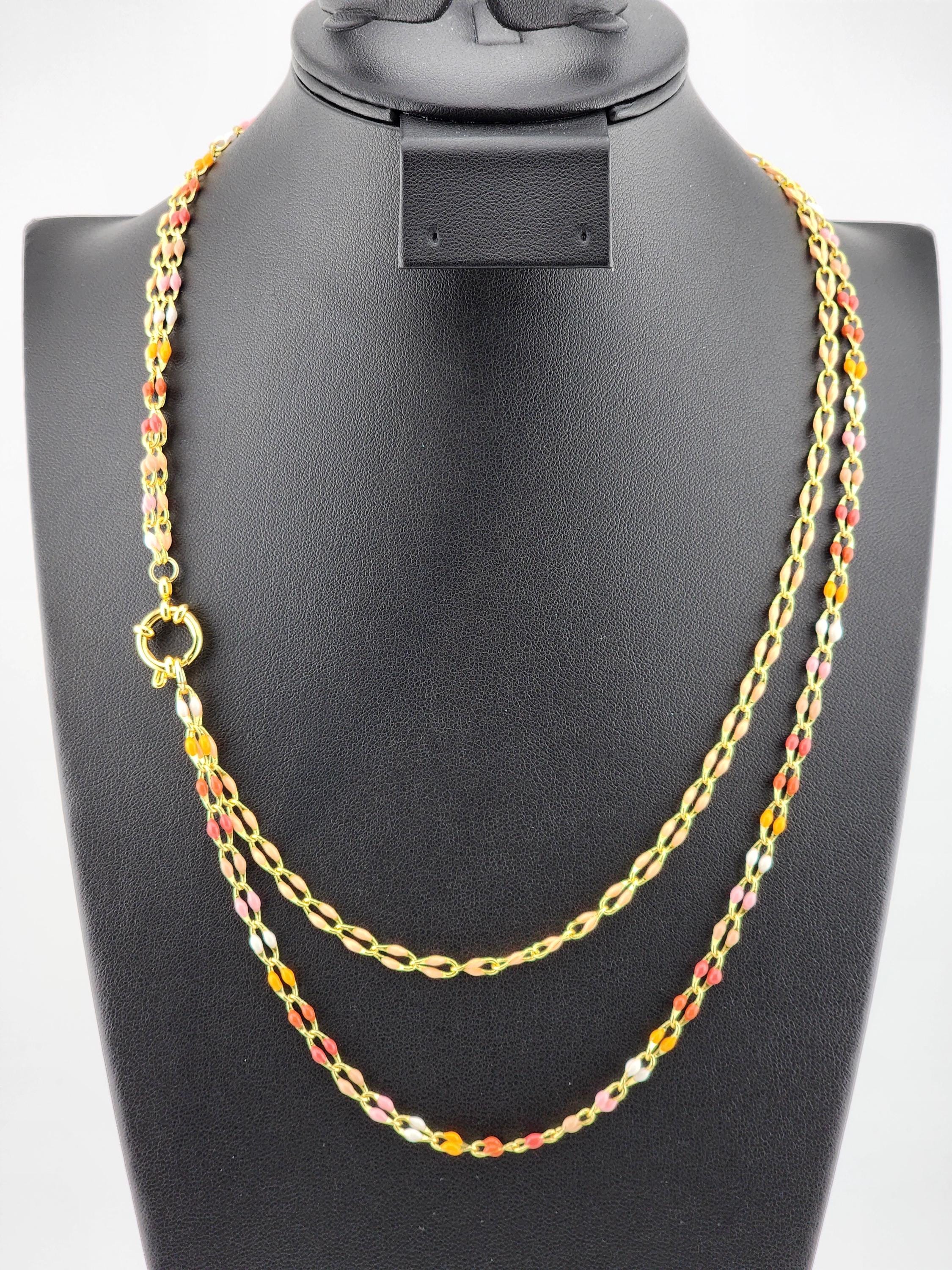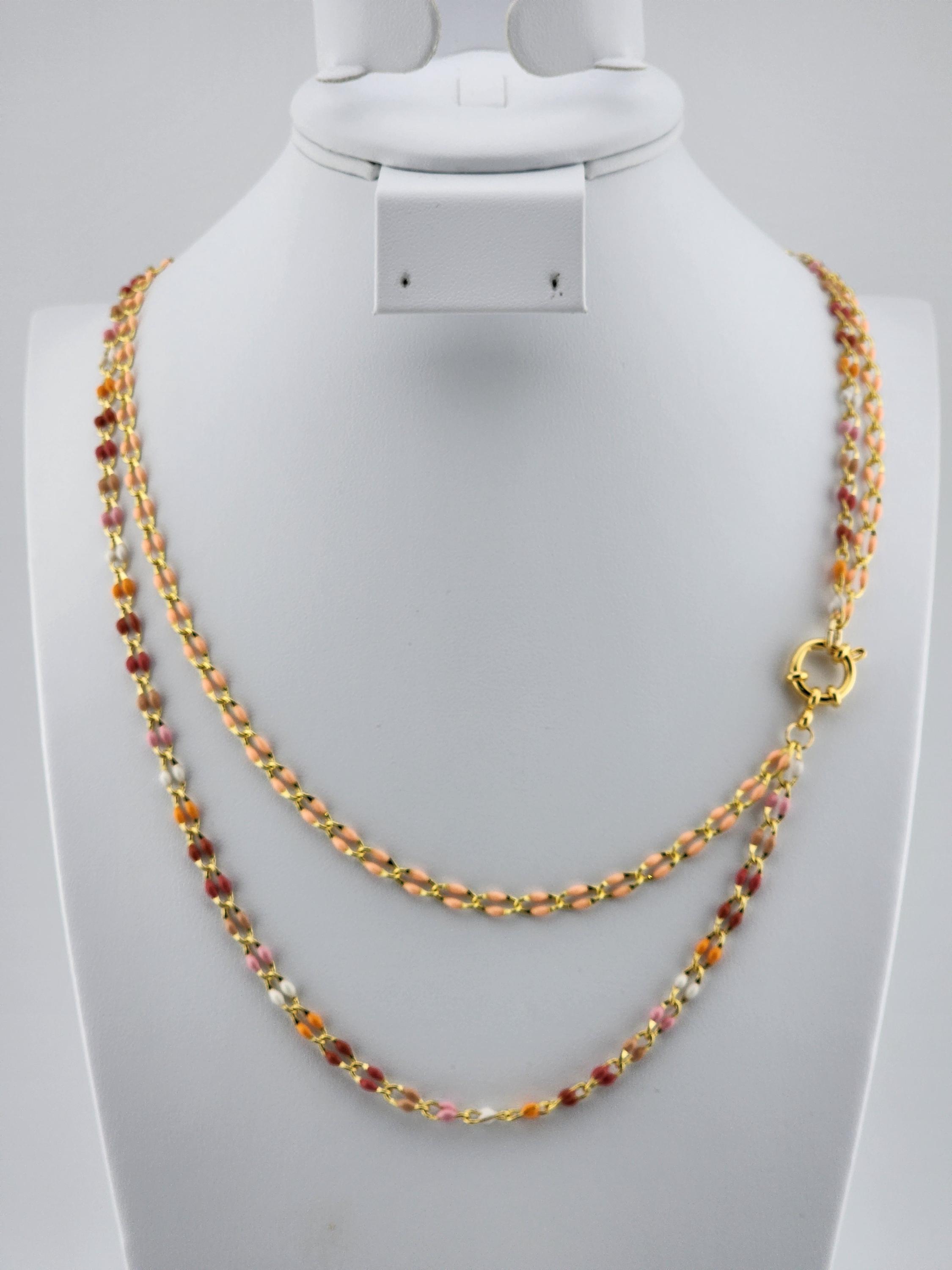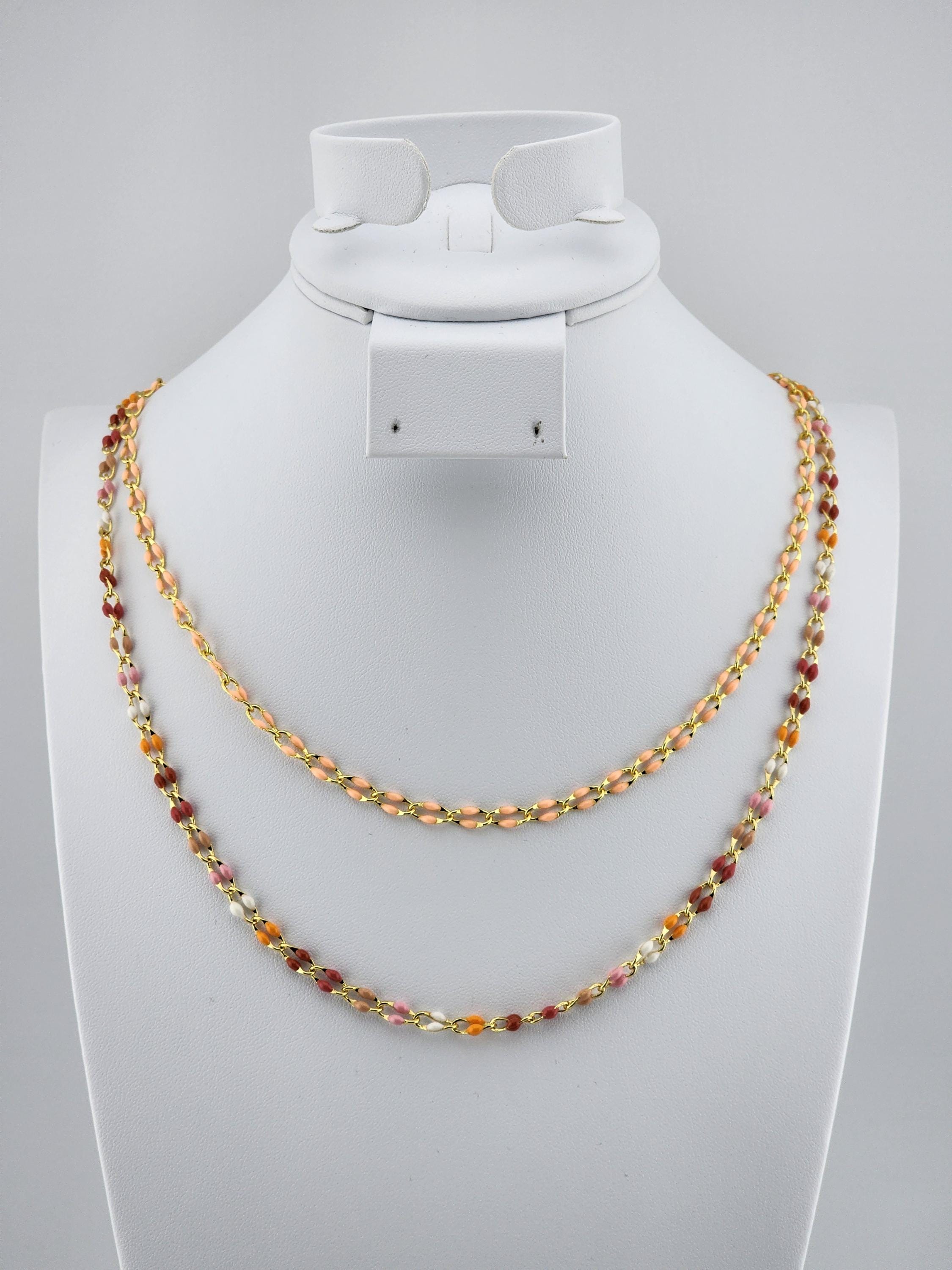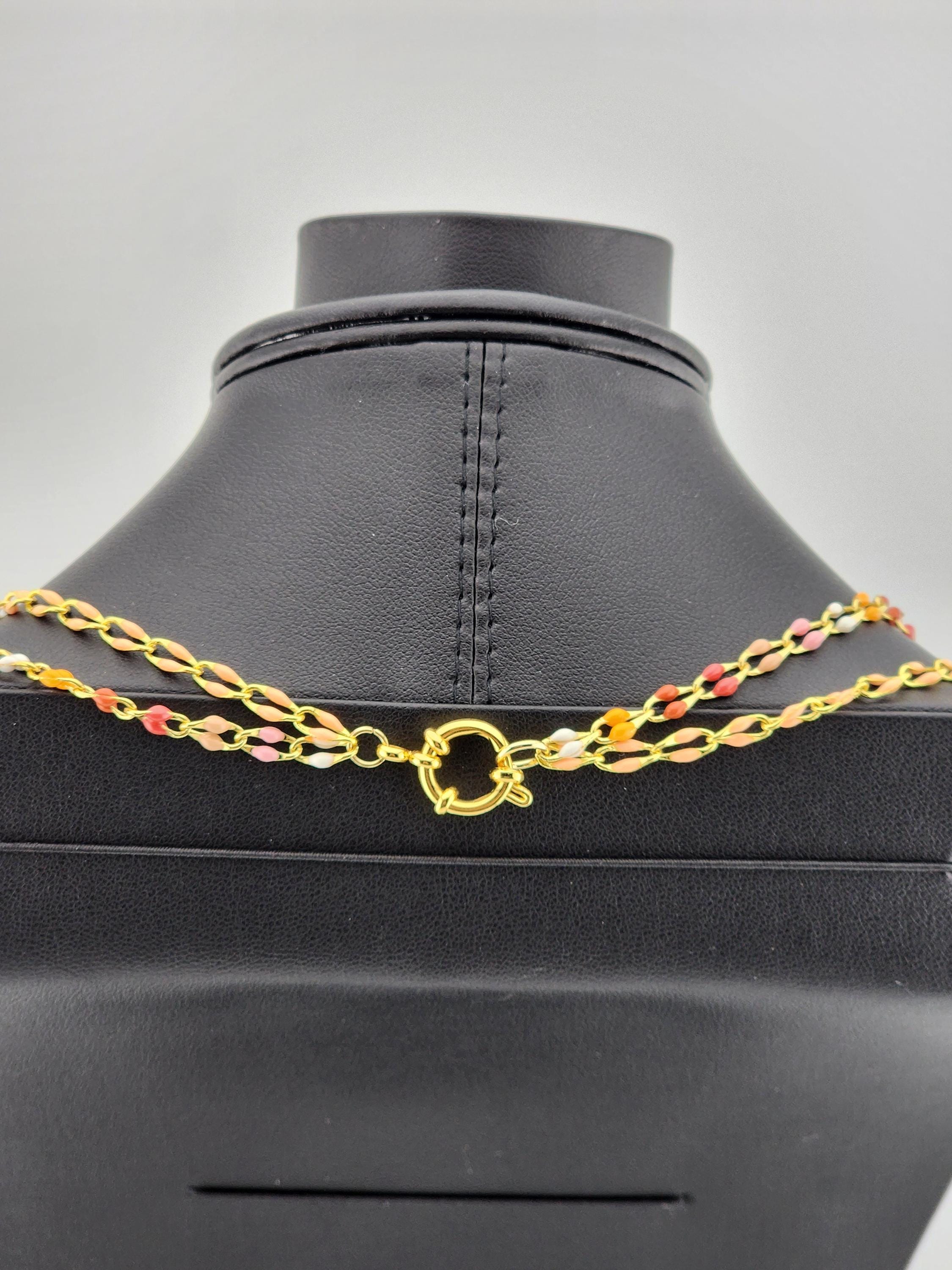 This is a double layered necklace. For the 19" I used peach enamel gold chain. For the 22" I used rose, peach & white enamel gold chain. I connected them with a medium ornate 18k gold plated circle spring clasp and used 24k gold plated connecting rings. This necklace may be worn with the clasp anywhere on the neck. * Your purchase will arrive in pretty packaging * Shipping is free within the U.S.