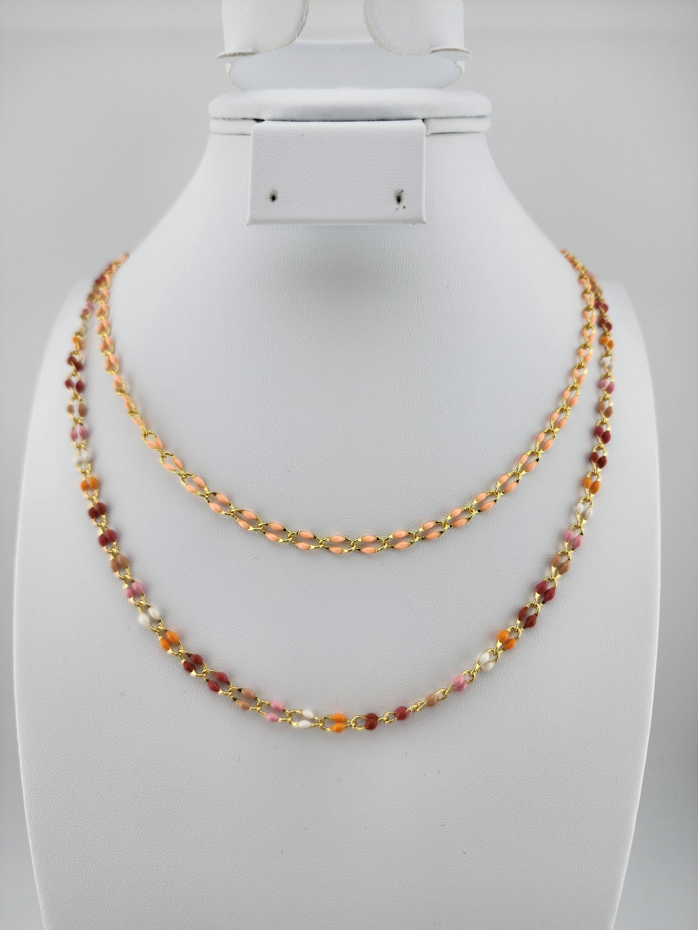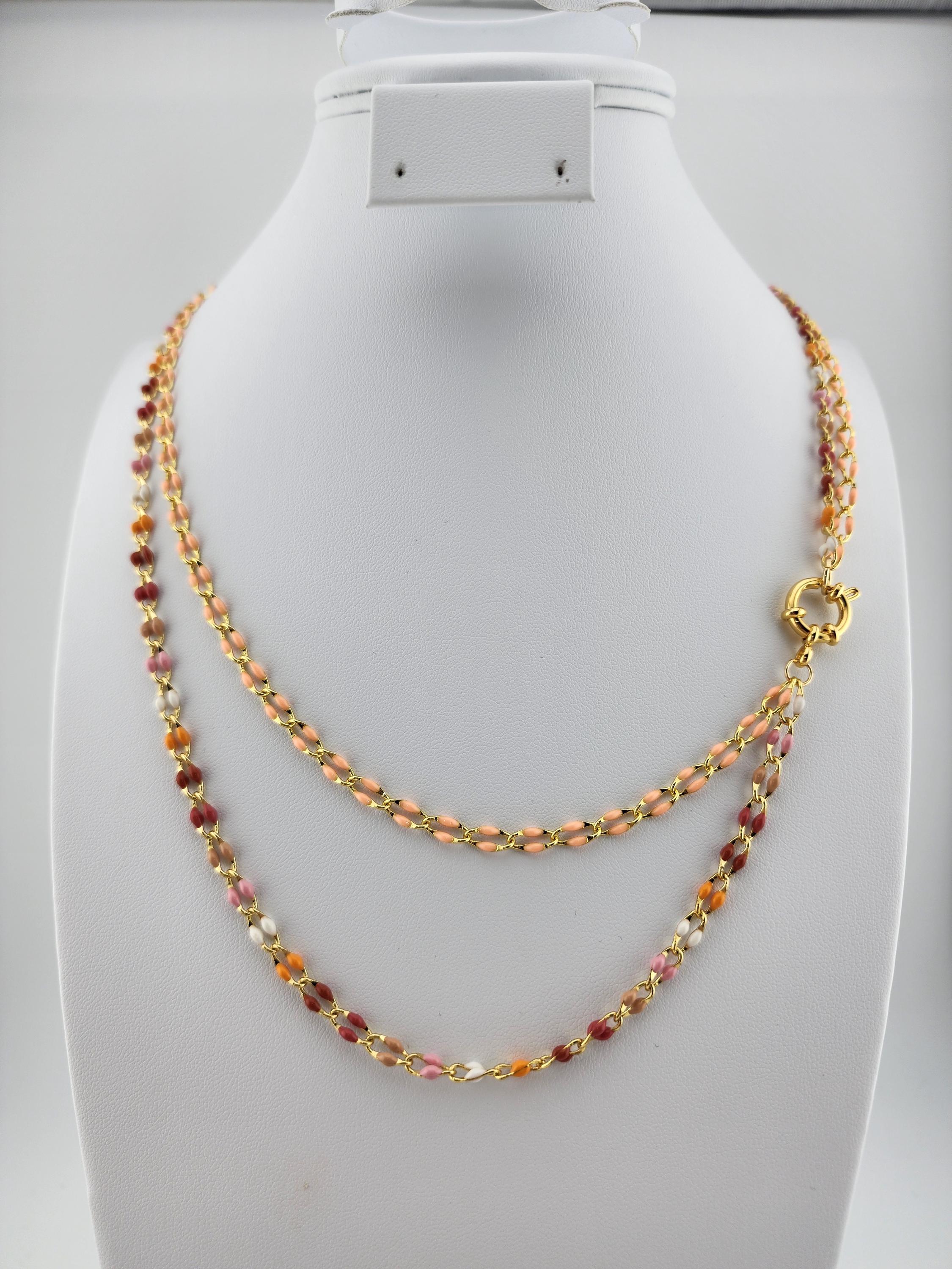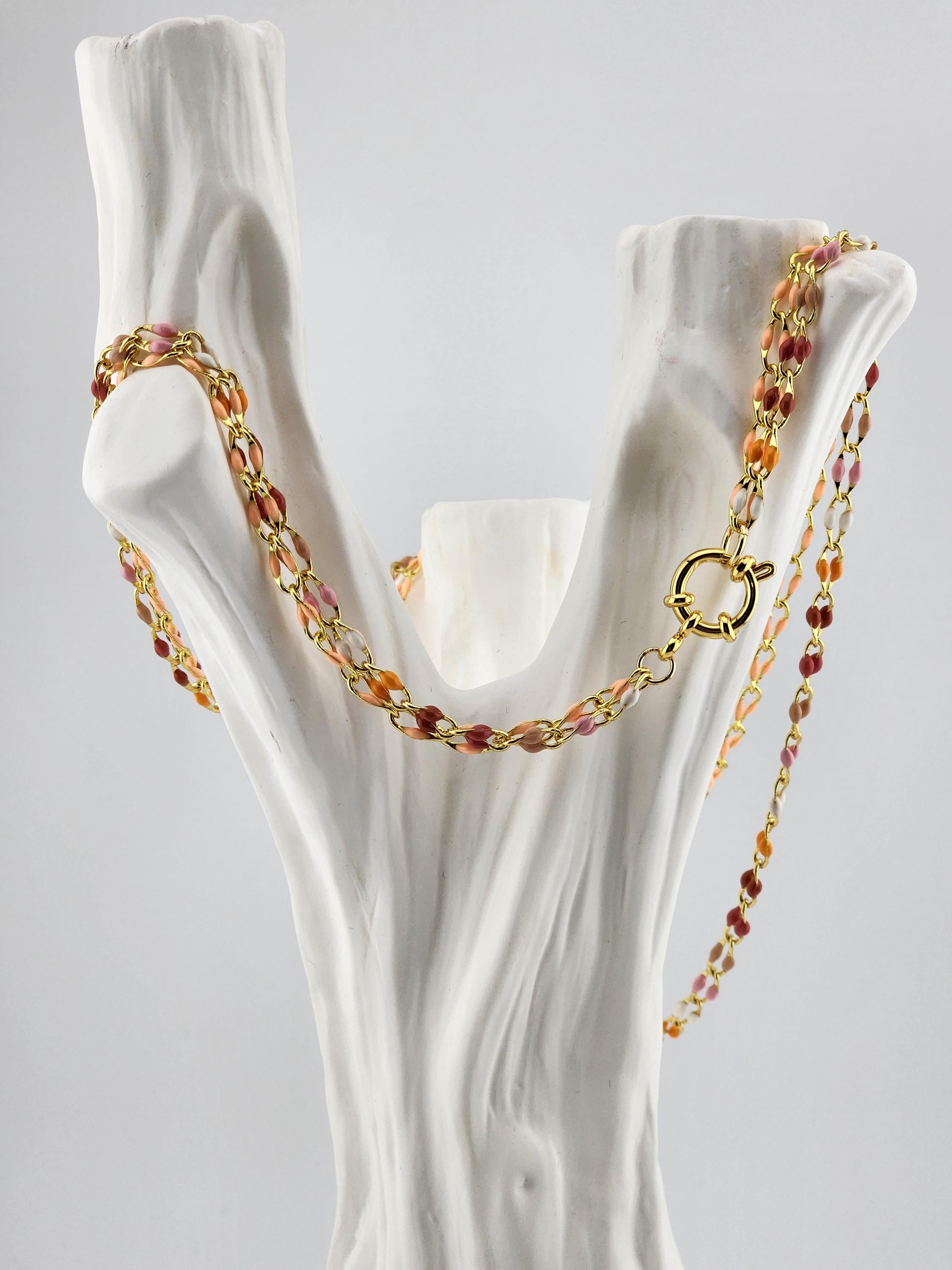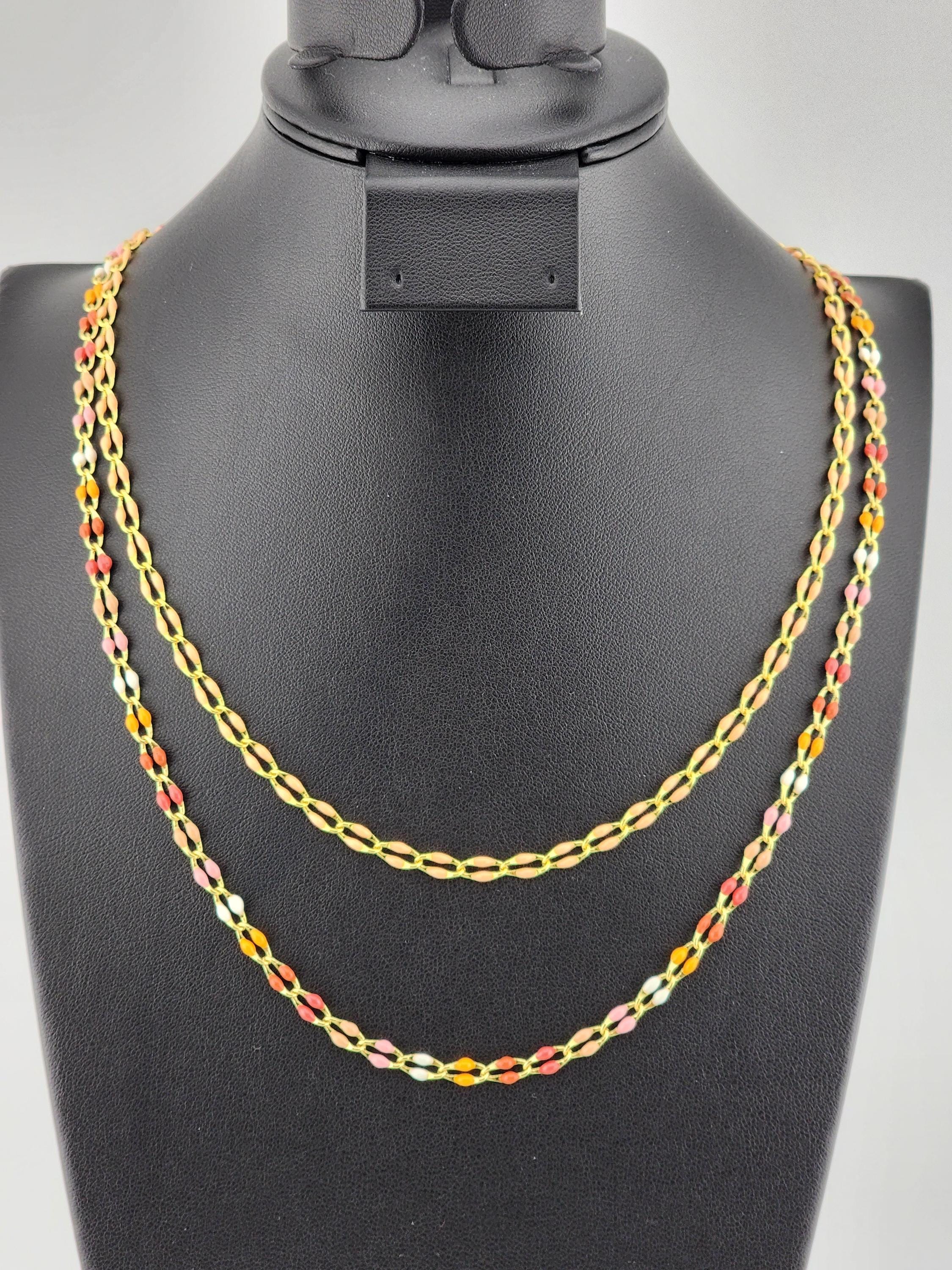 This is a double layered necklace. For the 19" I used peach enamel gold chain. For the 22" I used rose, peach & white enamel gold chain. I connected them with a medium ornate 18k gold plated circle spring clasp and used 24k gold plated connecting rings. This necklace may be worn with the clasp anywhere on the neck. * Your purchase will arrive in pretty packaging * Shipping is free within the U.S.