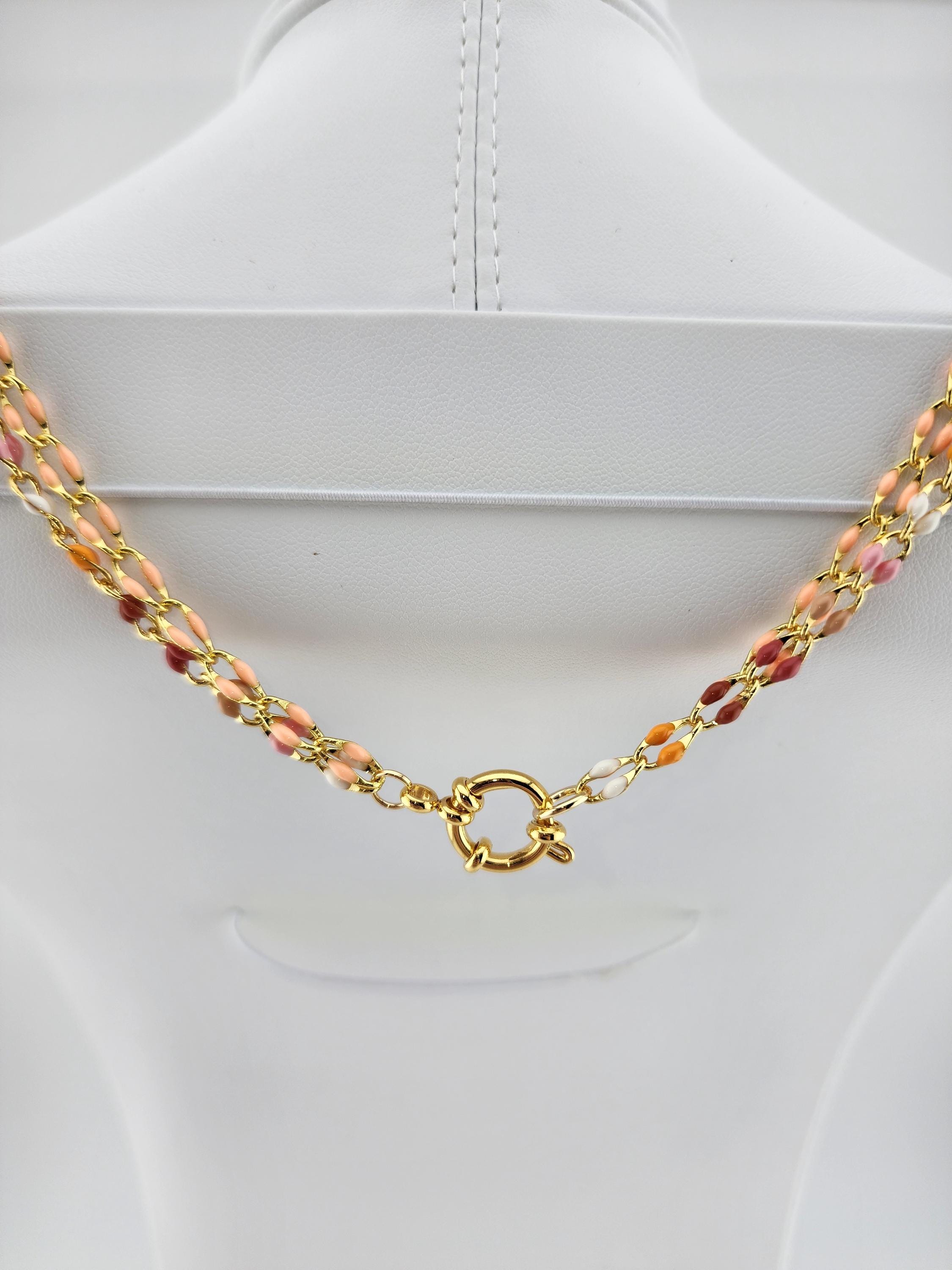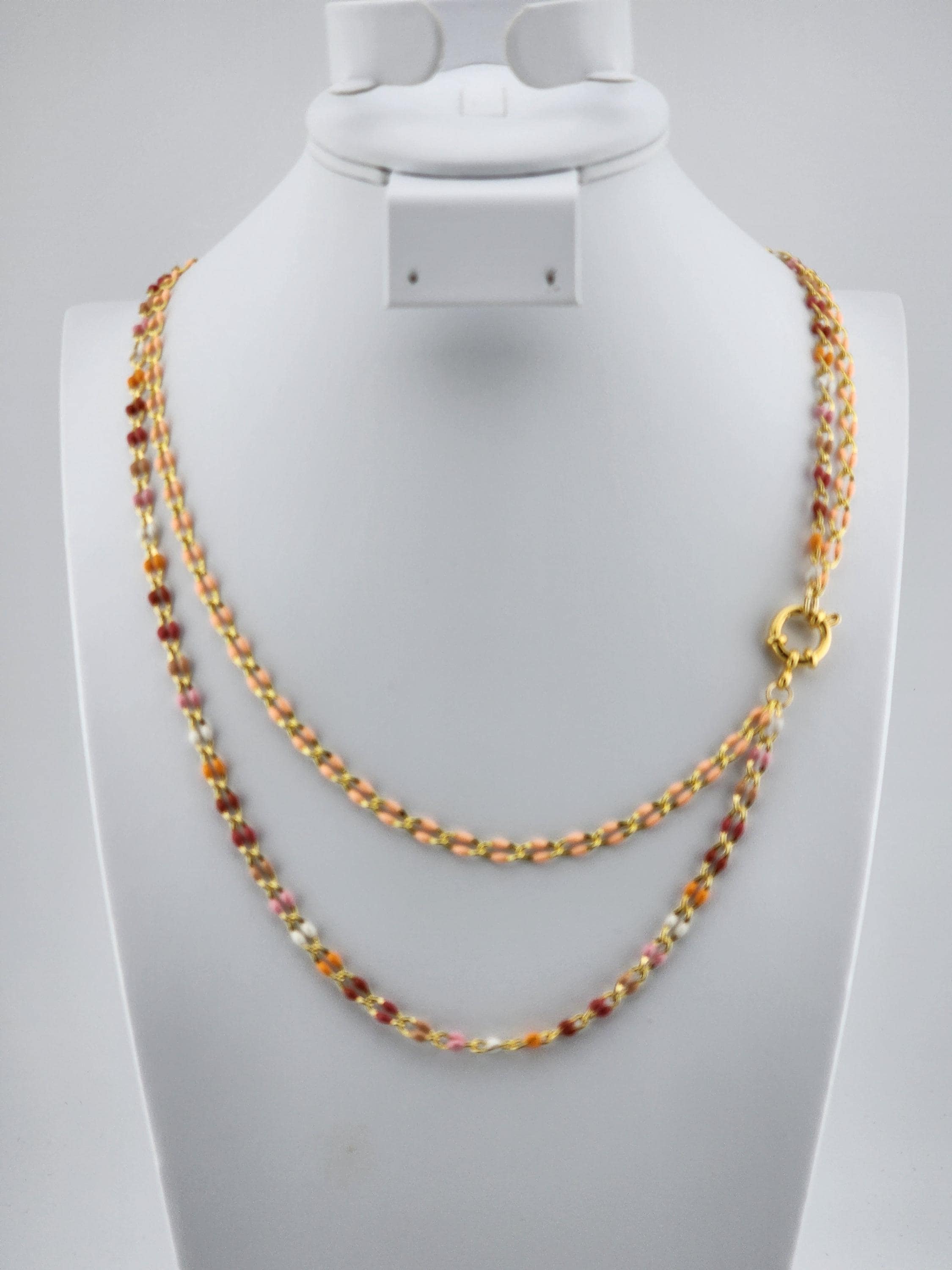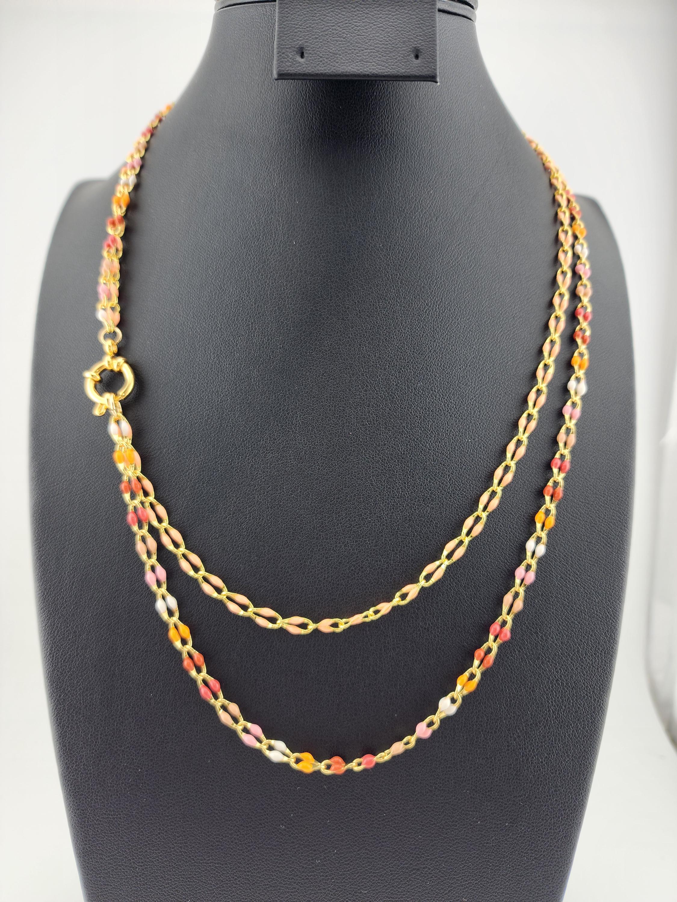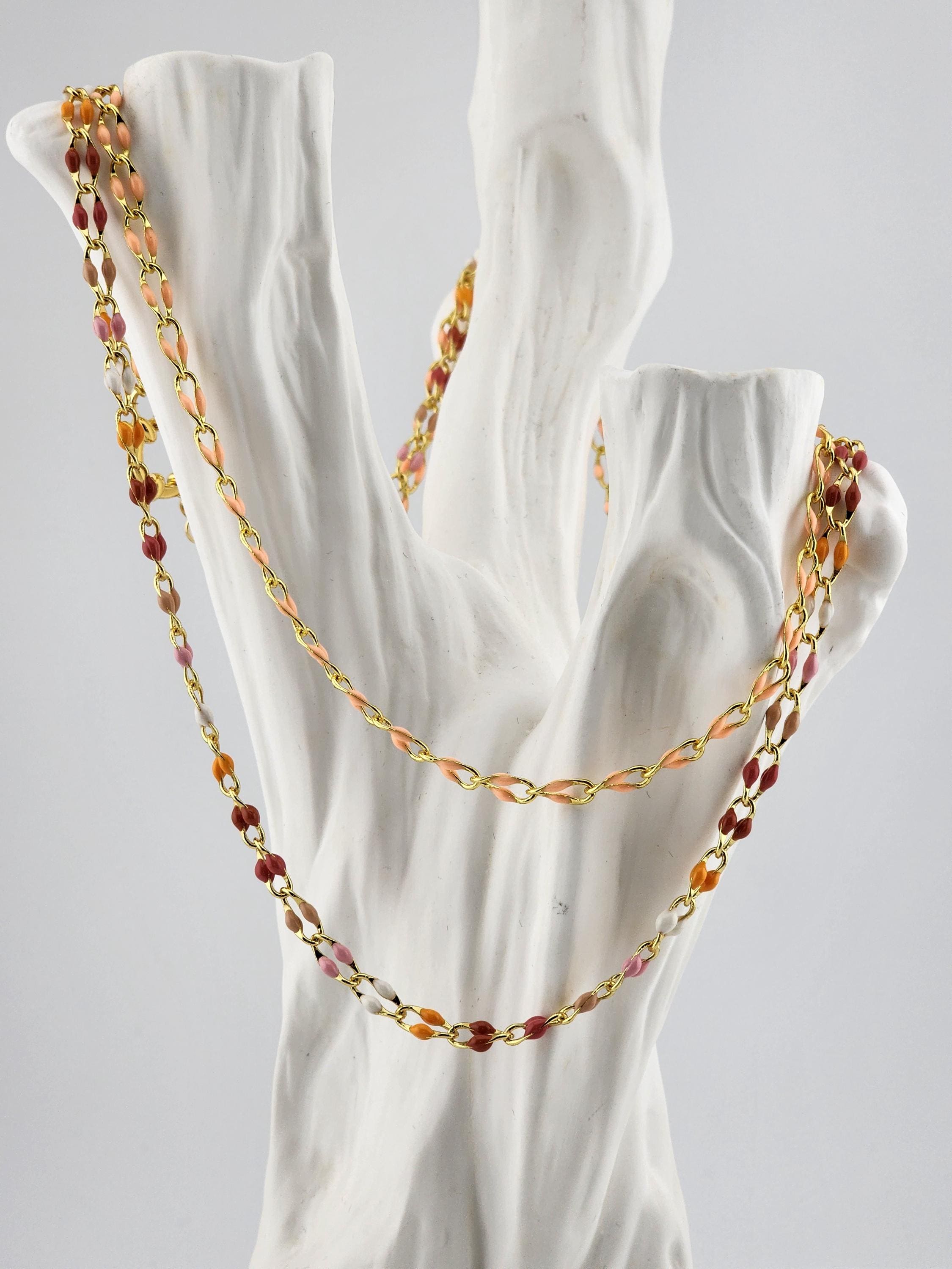This is a double layered necklace. For the 19" I used peach enamel gold chain. For the 22" I used rose, peach & white enamel gold chain. I connected them with a medium ornate 18k gold plated circle spring clasp and used 24k gold plated connecting rings. This necklace may be worn with the clasp anywhere on the neck. * Your purchase will arrive in pretty packaging * Shipping is free within the U.S.