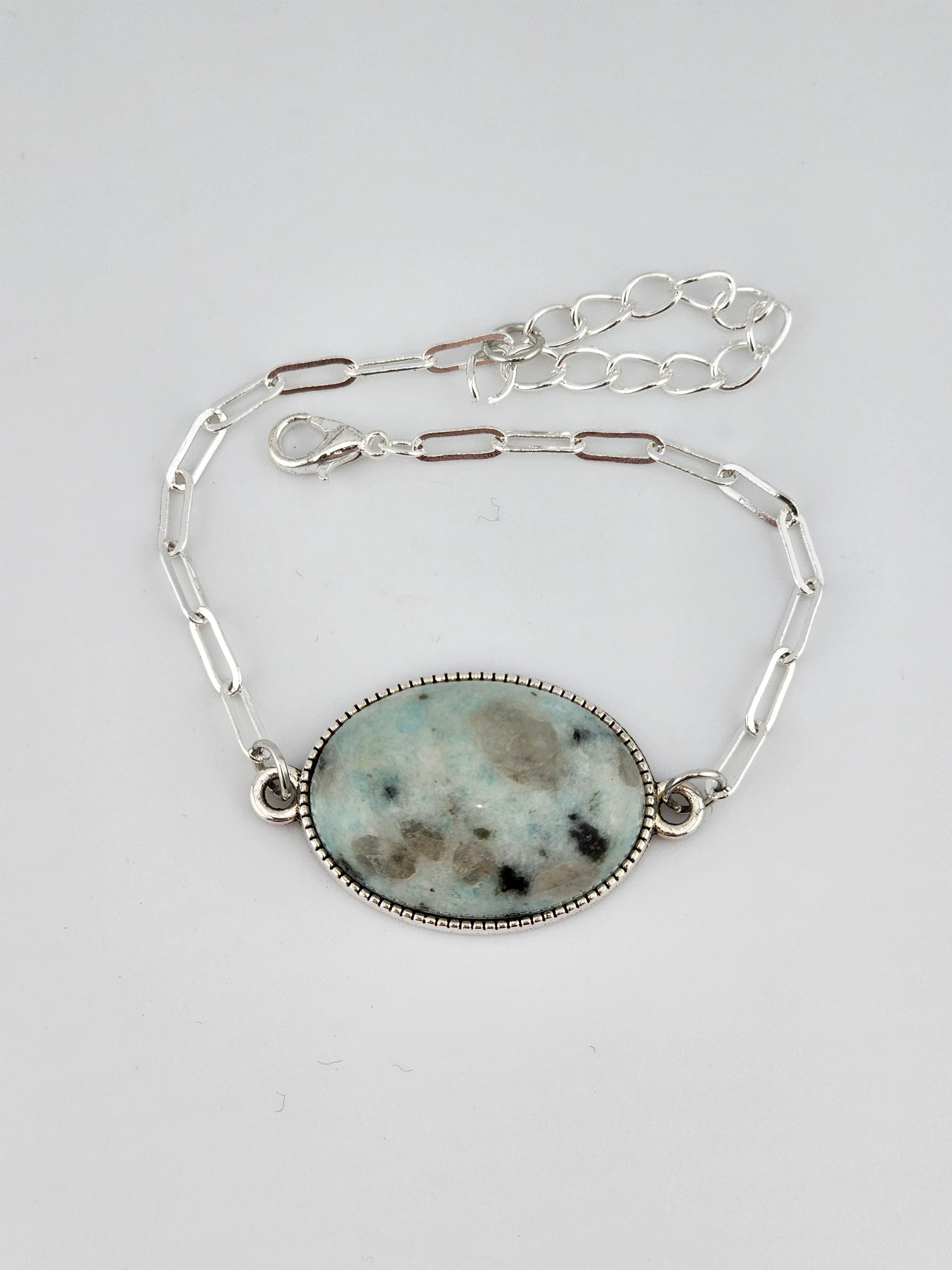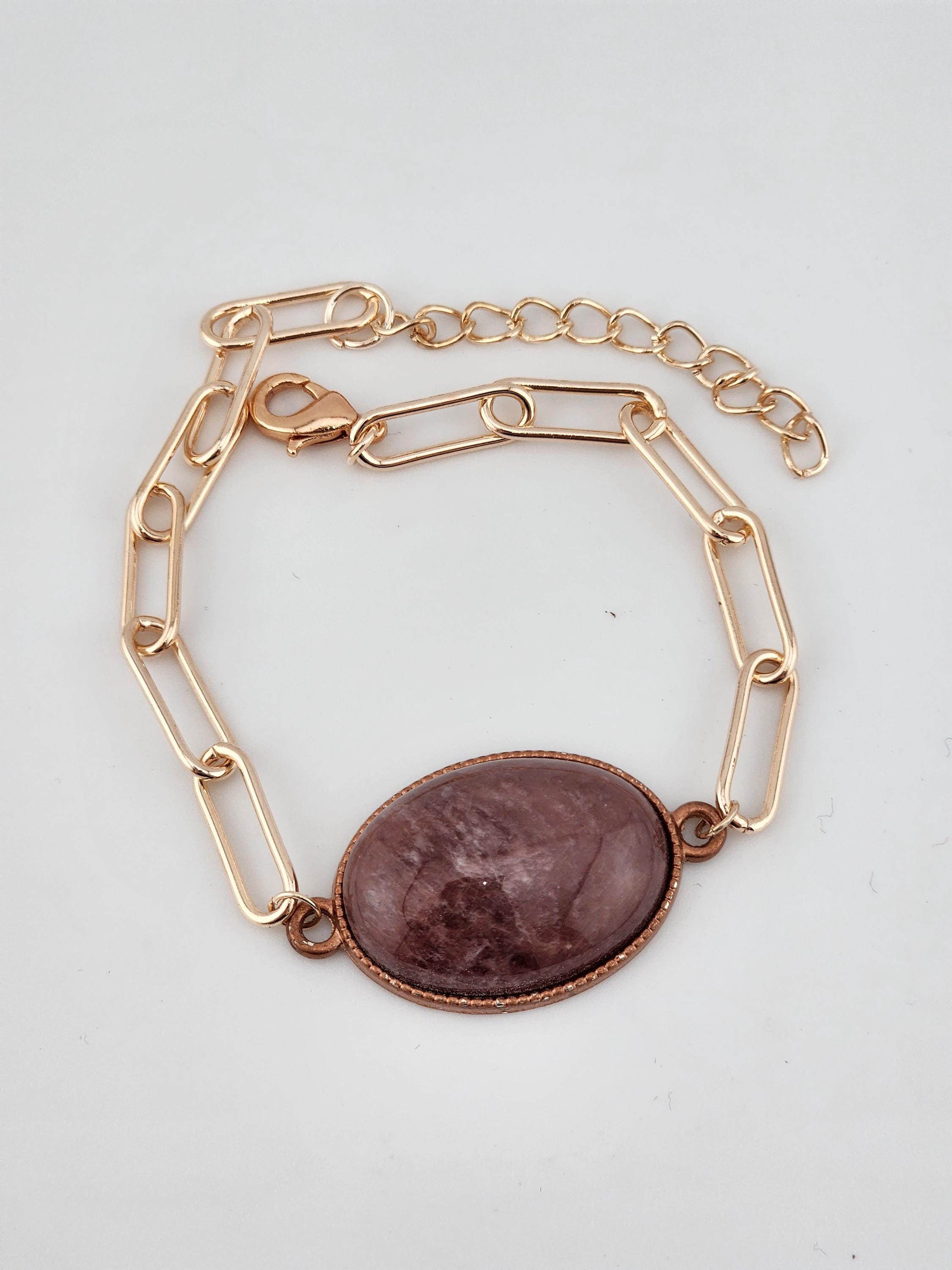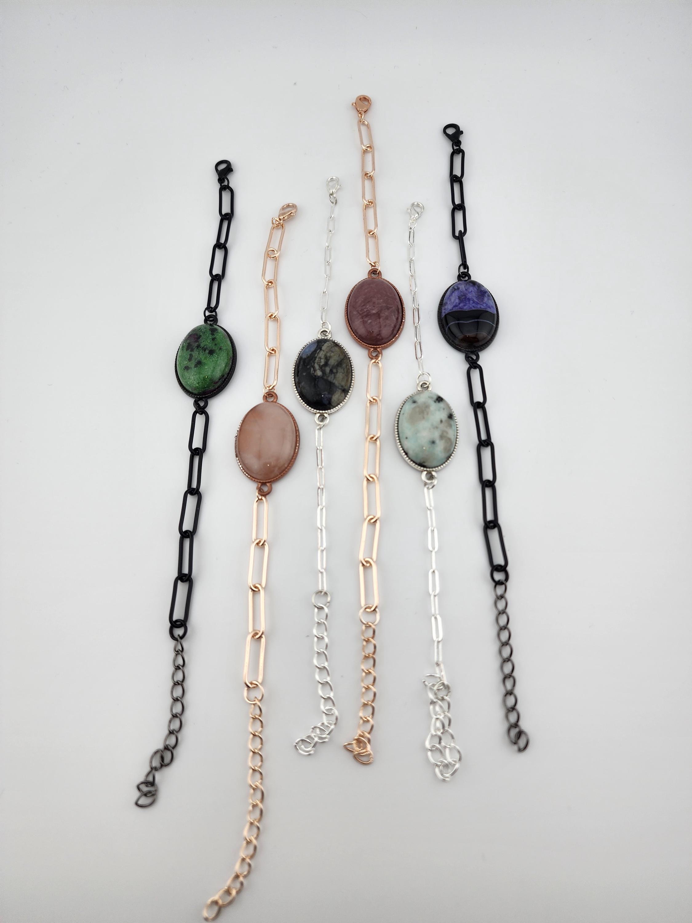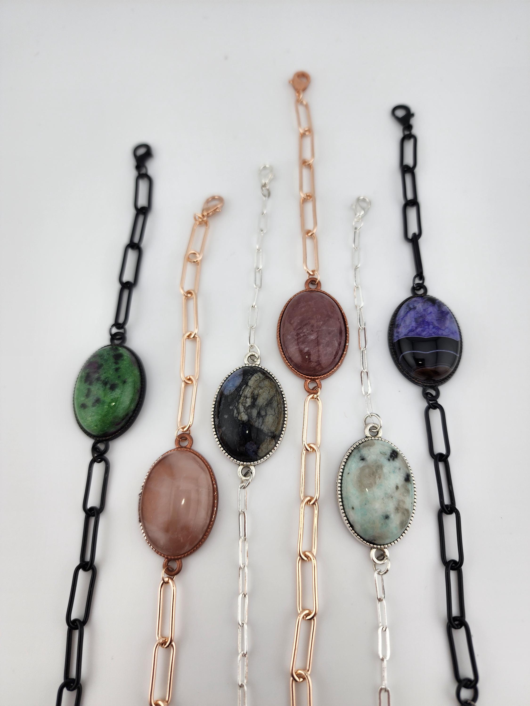 These are paper clip chain and semi-precious gemstone bracelets. There are 6 styles to choose from: #1- Black/Zoisite #2- Rose Gold/Rose Quartz #3- Sterling Silver/Llanite #4- Rose Gold/Strawberry Quartz #5- Sterling Silver/Kiwi Jasper #6- Black/Purple Banded Agate * Your purchase will arrive in pretty packaging * Shipping is free within the U.S.