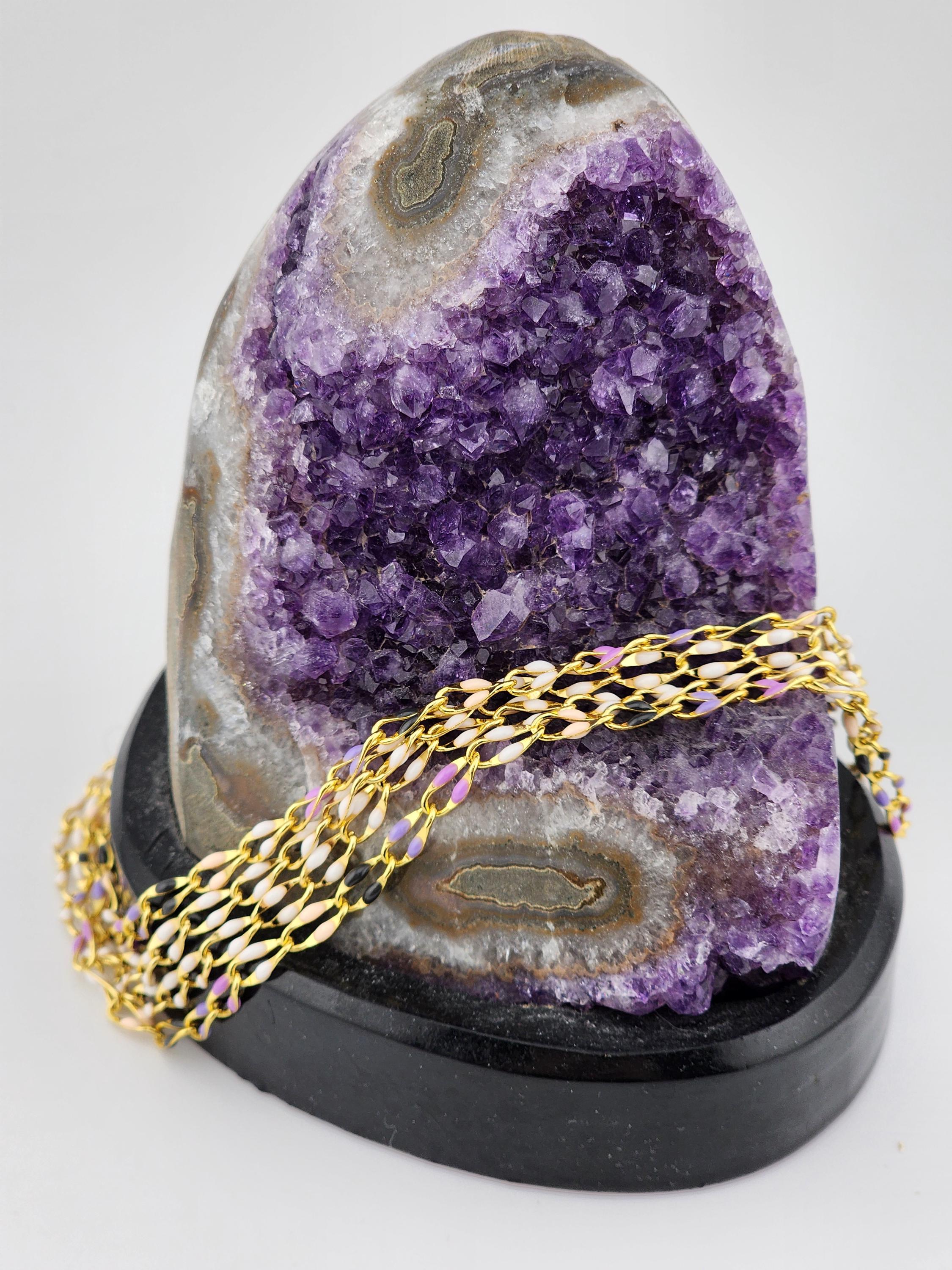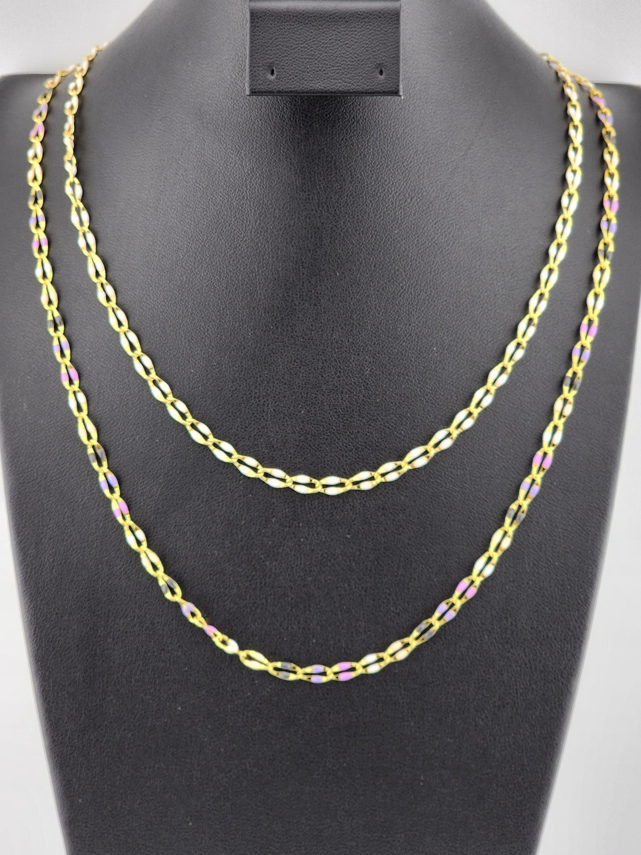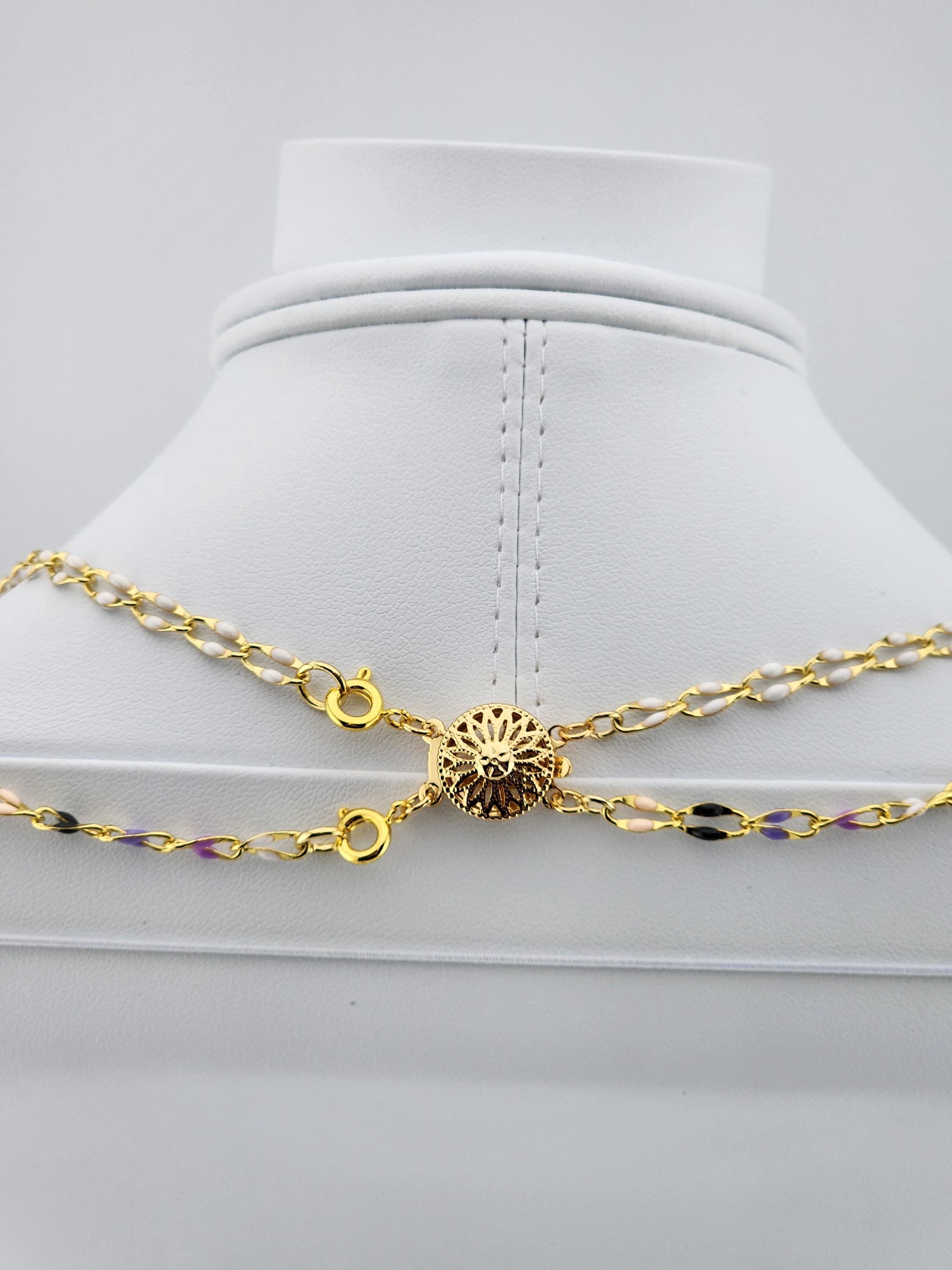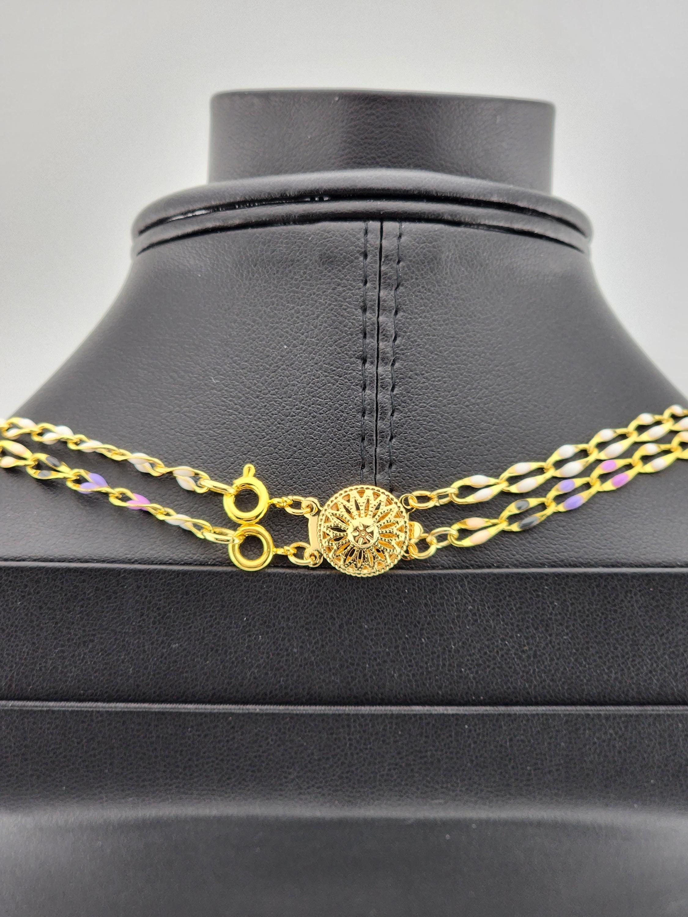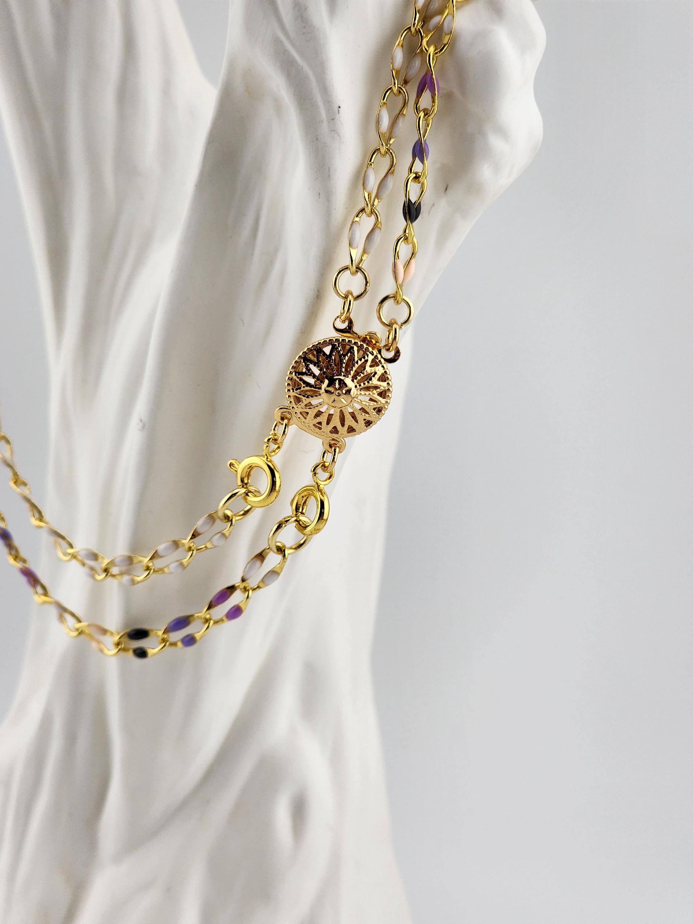 I made this double layered necklace using gold & enamel lip chains. The 1st is white enamel and the 2nd is black, purple & white enamel. They are connected by a tarnish resistant 18k gold plated ornate filigree clasp and 24k gold plated connecting rings. * Your purchase will arrive in pretty packaging * Shipping is free within the U.S.