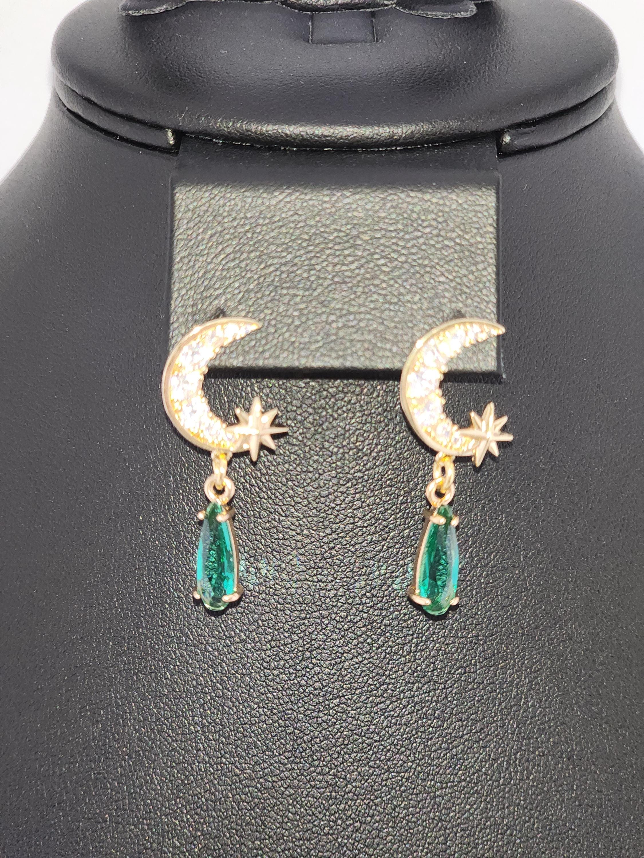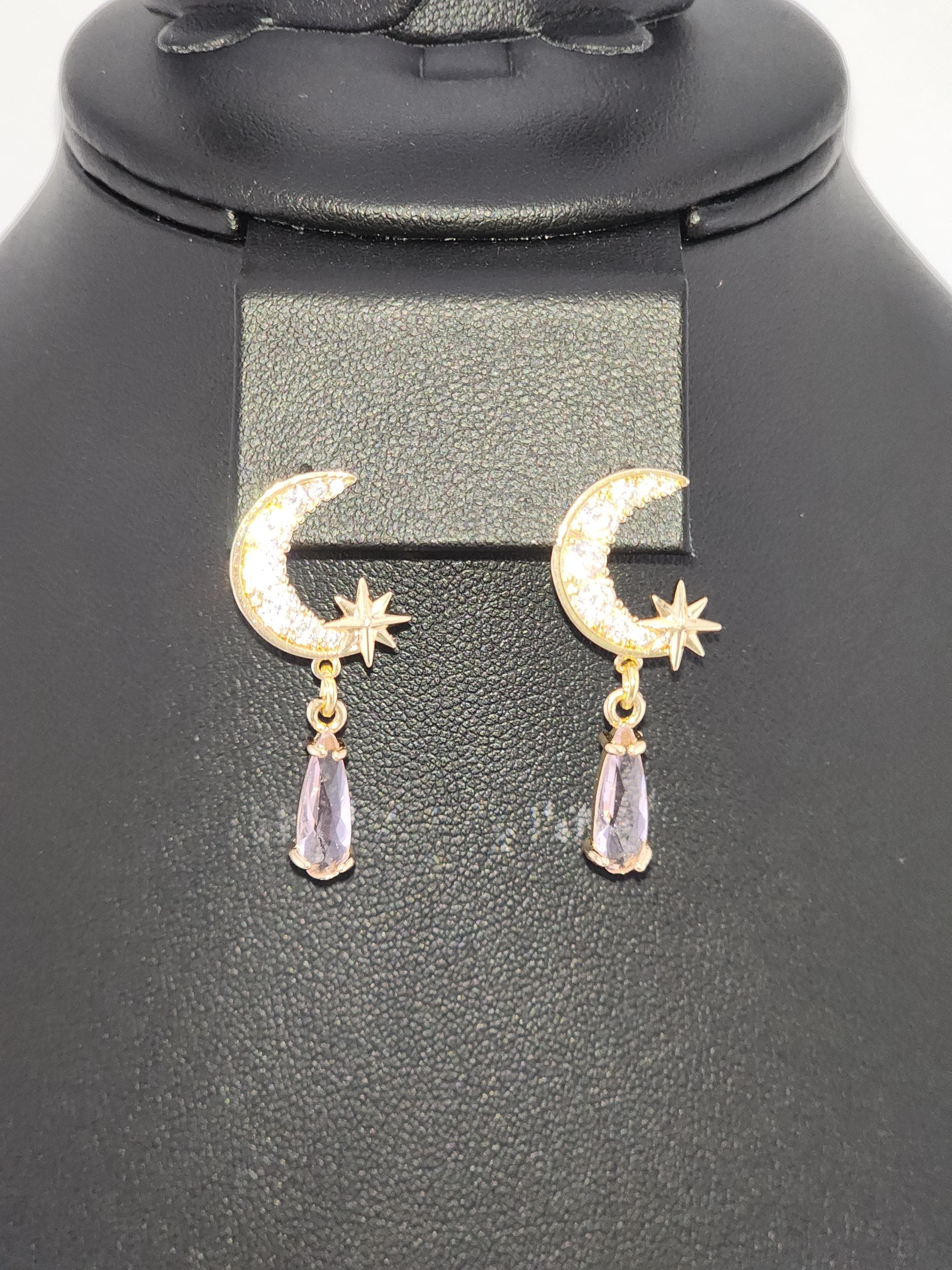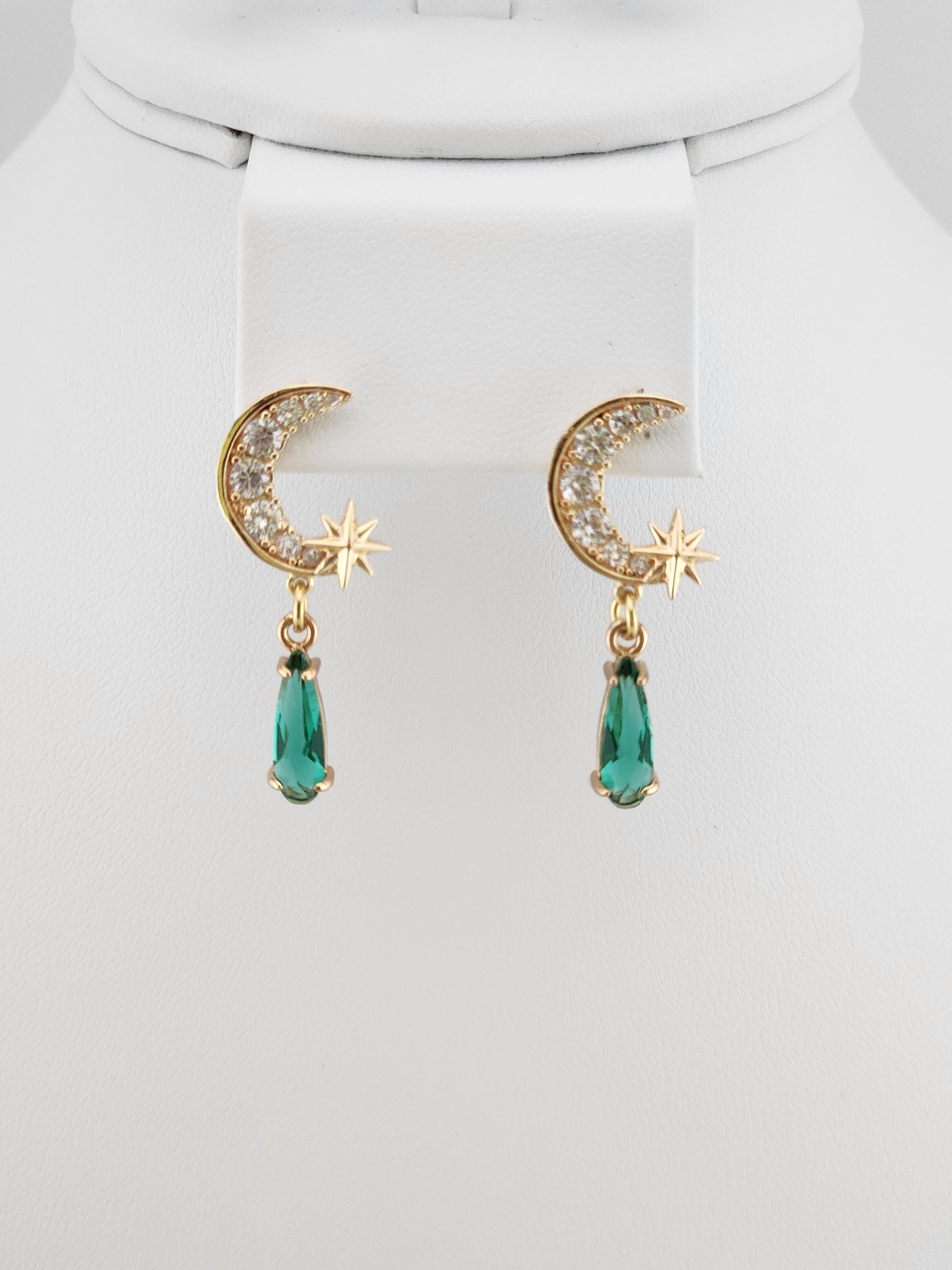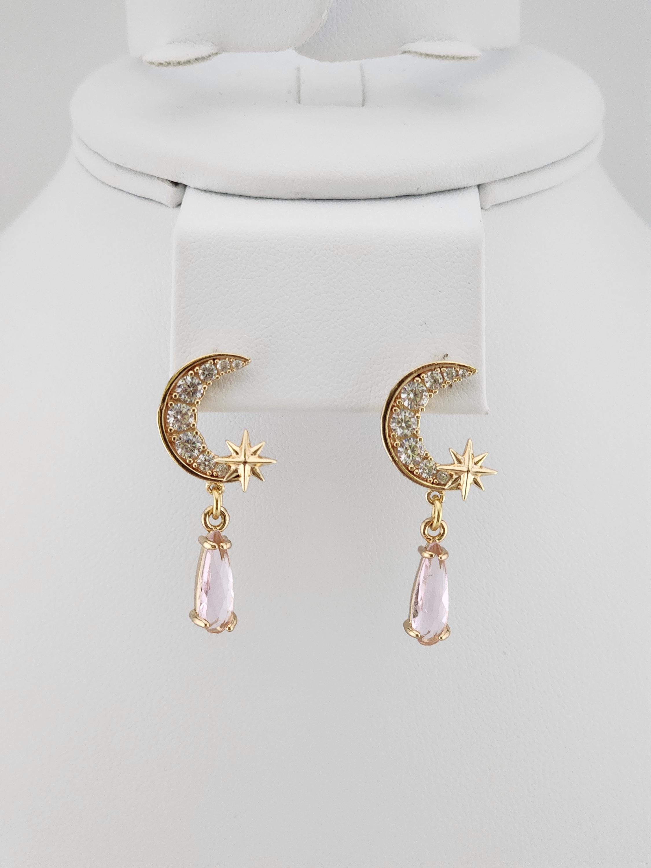 I made these earrings using tarnish resistant 18k gold plated brass Pave' star and crescent moon shape posts with cubic zirconia crystals. From 24k gold plated connecting rings are faceted teardrop shape crystal charms. YOUR CHOICE OF COLORS ARE: #1- Green #2- Light Pink #3- Blue * Your purchase will arrive in pretty packaging * Shipping is included