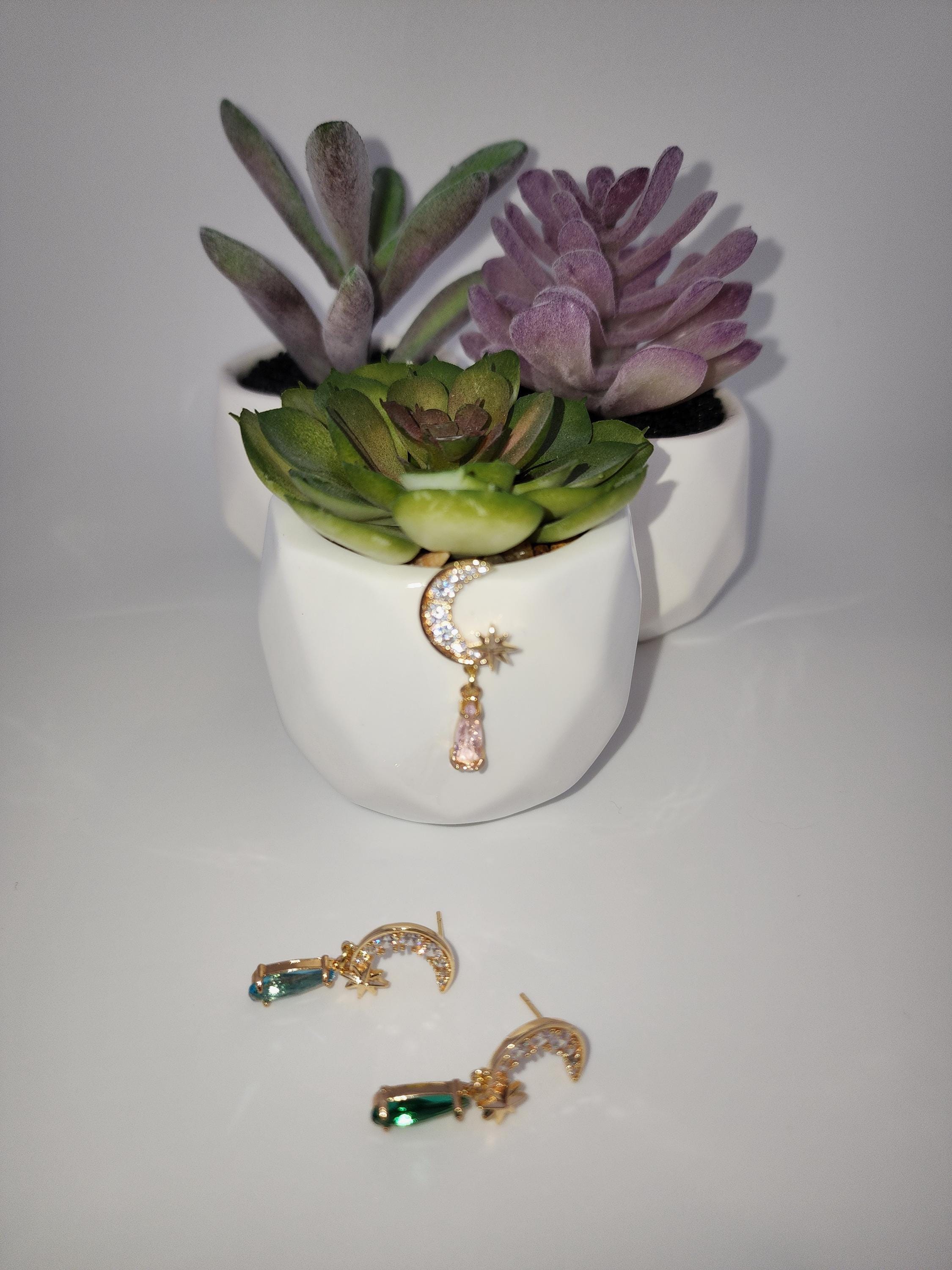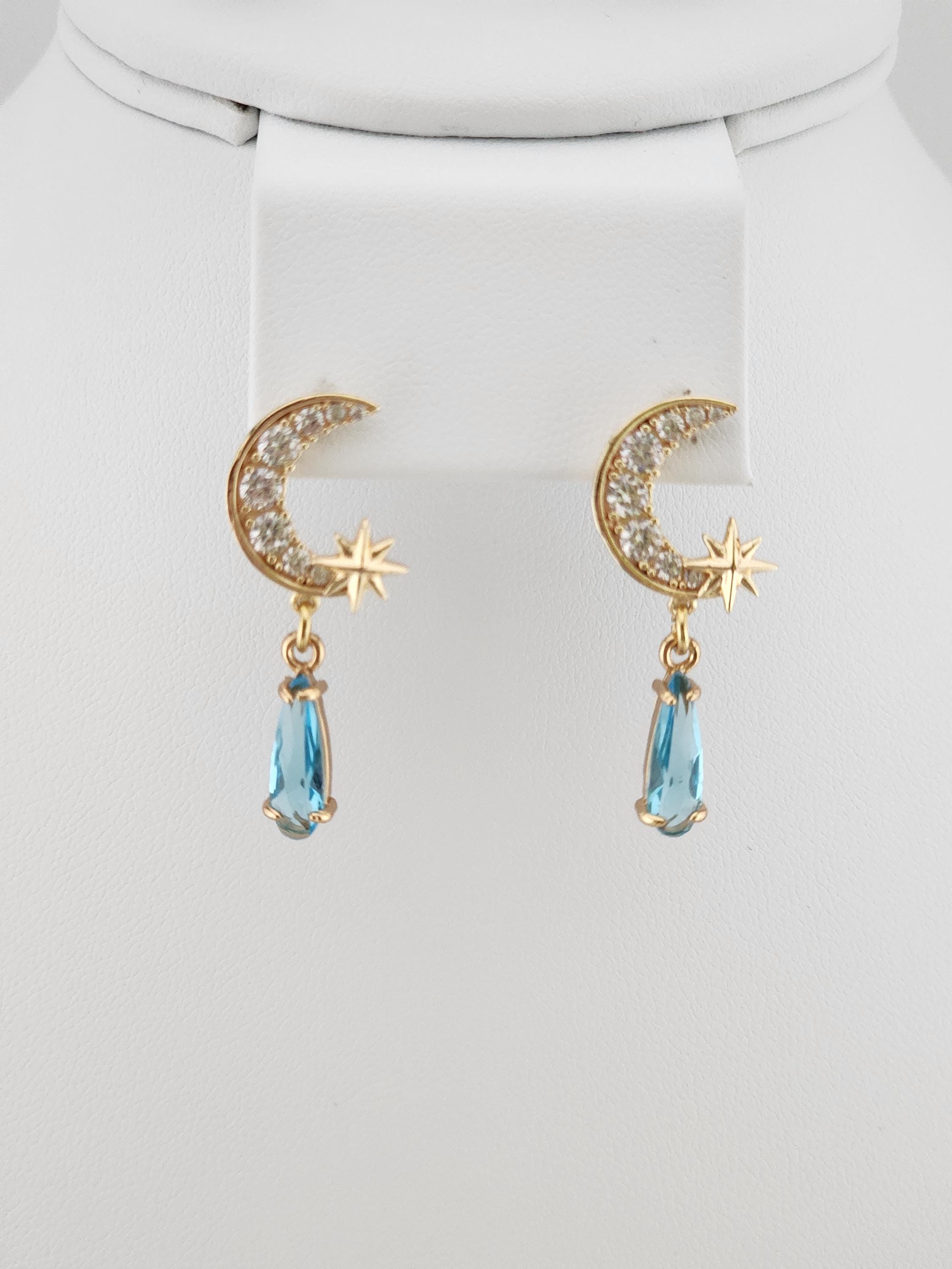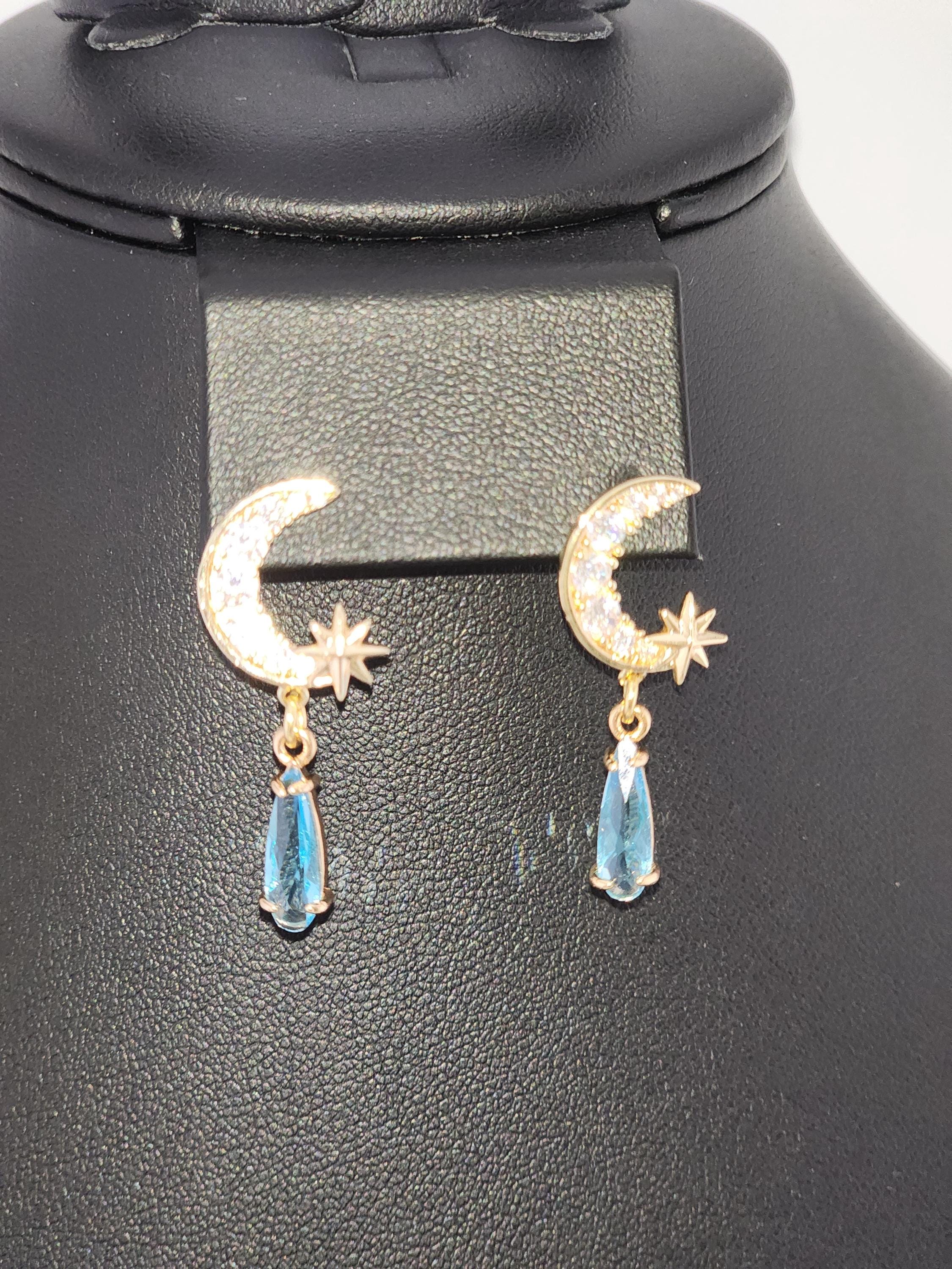 I made these earrings using tarnish resistant 18k gold plated brass Pave' star and crescent moon shape posts with cubic zirconia crystals. From 24k gold plated connecting rings are faceted teardrop shape crystal charms. YOUR CHOICE OF COLORS ARE: #1- Green #2- Light Pink #3- Blue * Your purchase will arrive in pretty packaging * Shipping is included