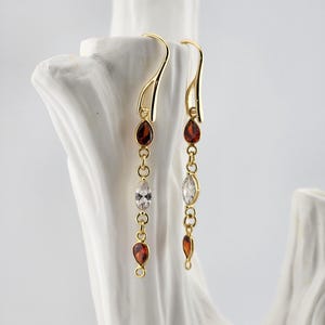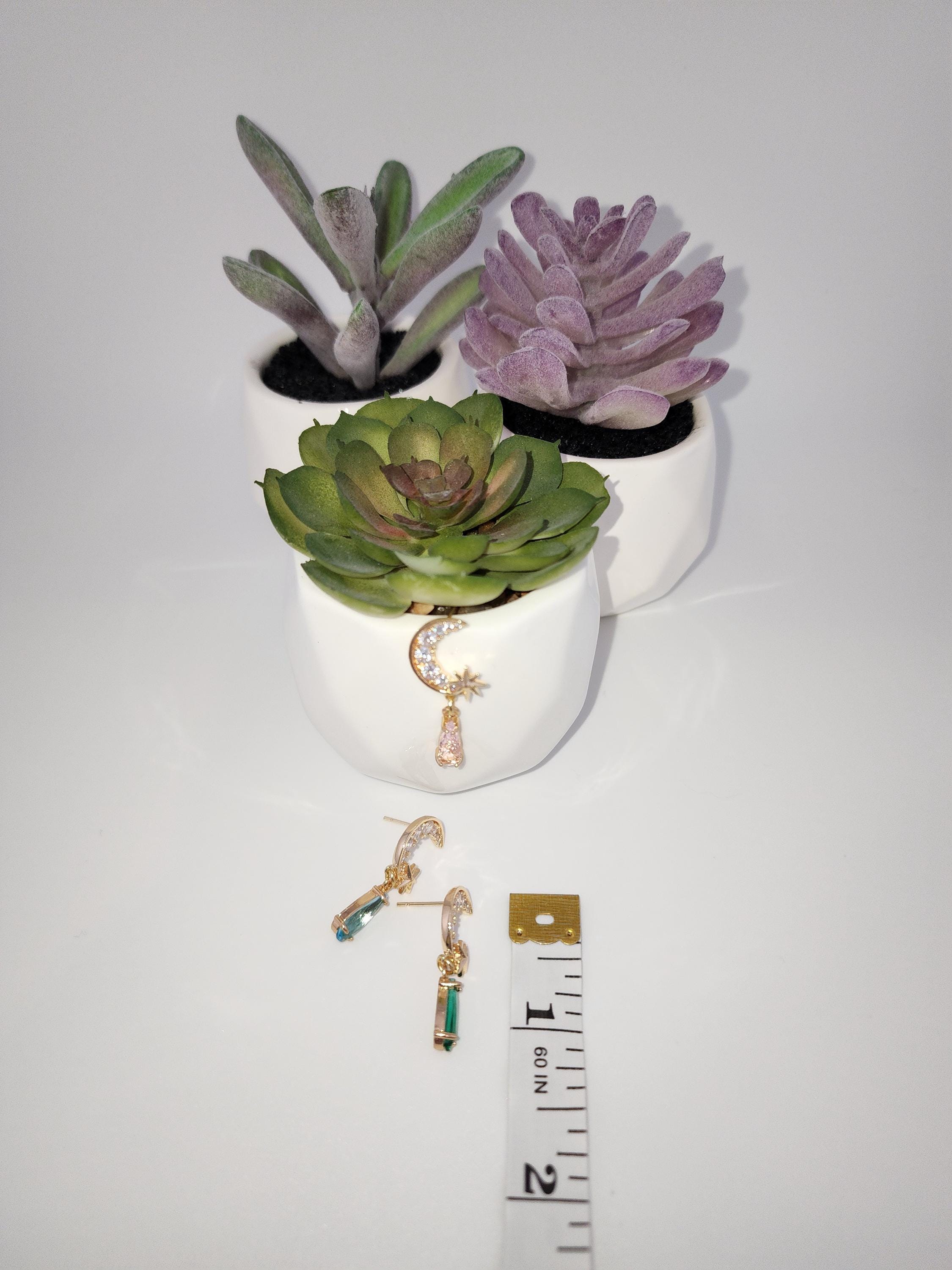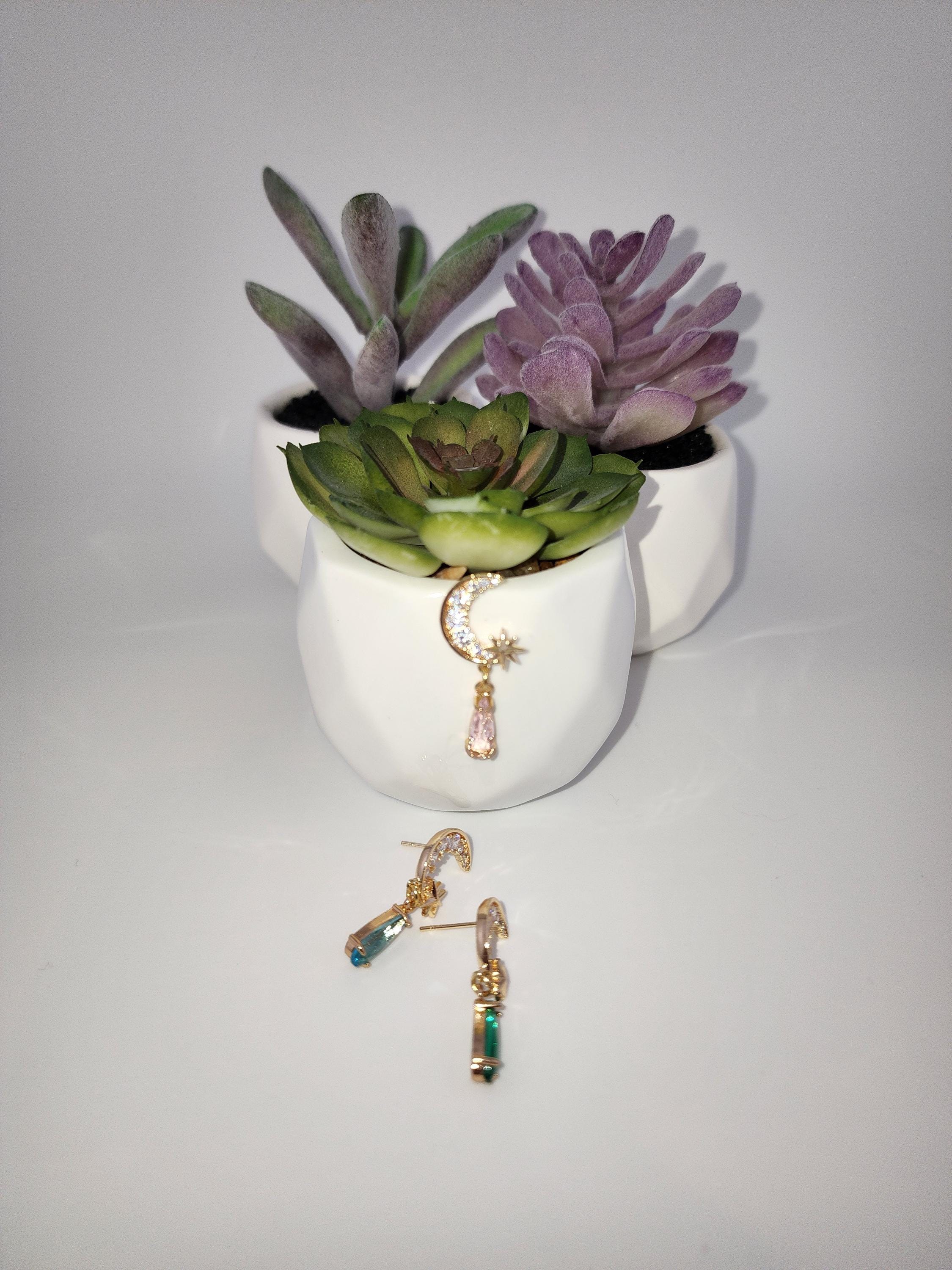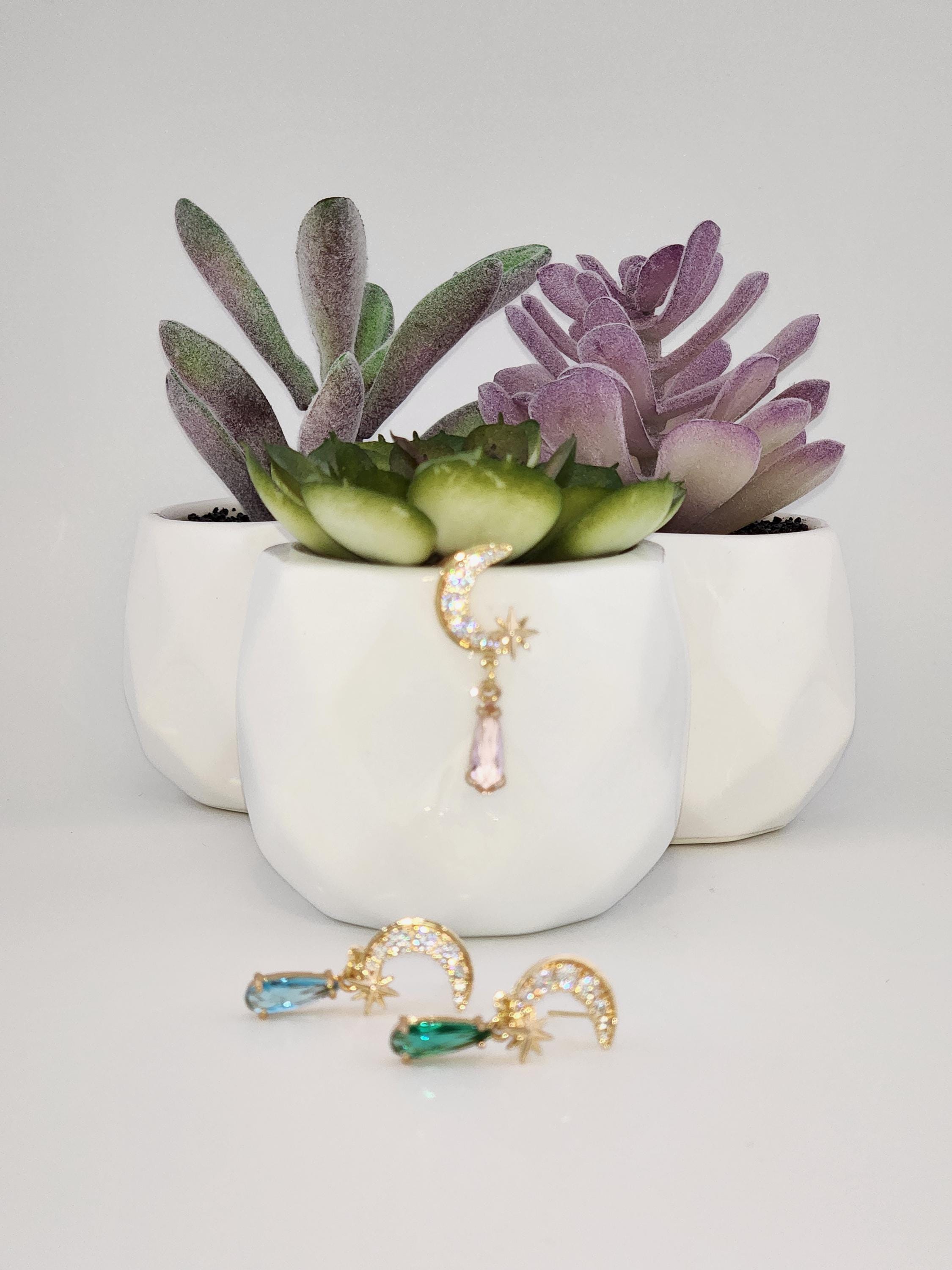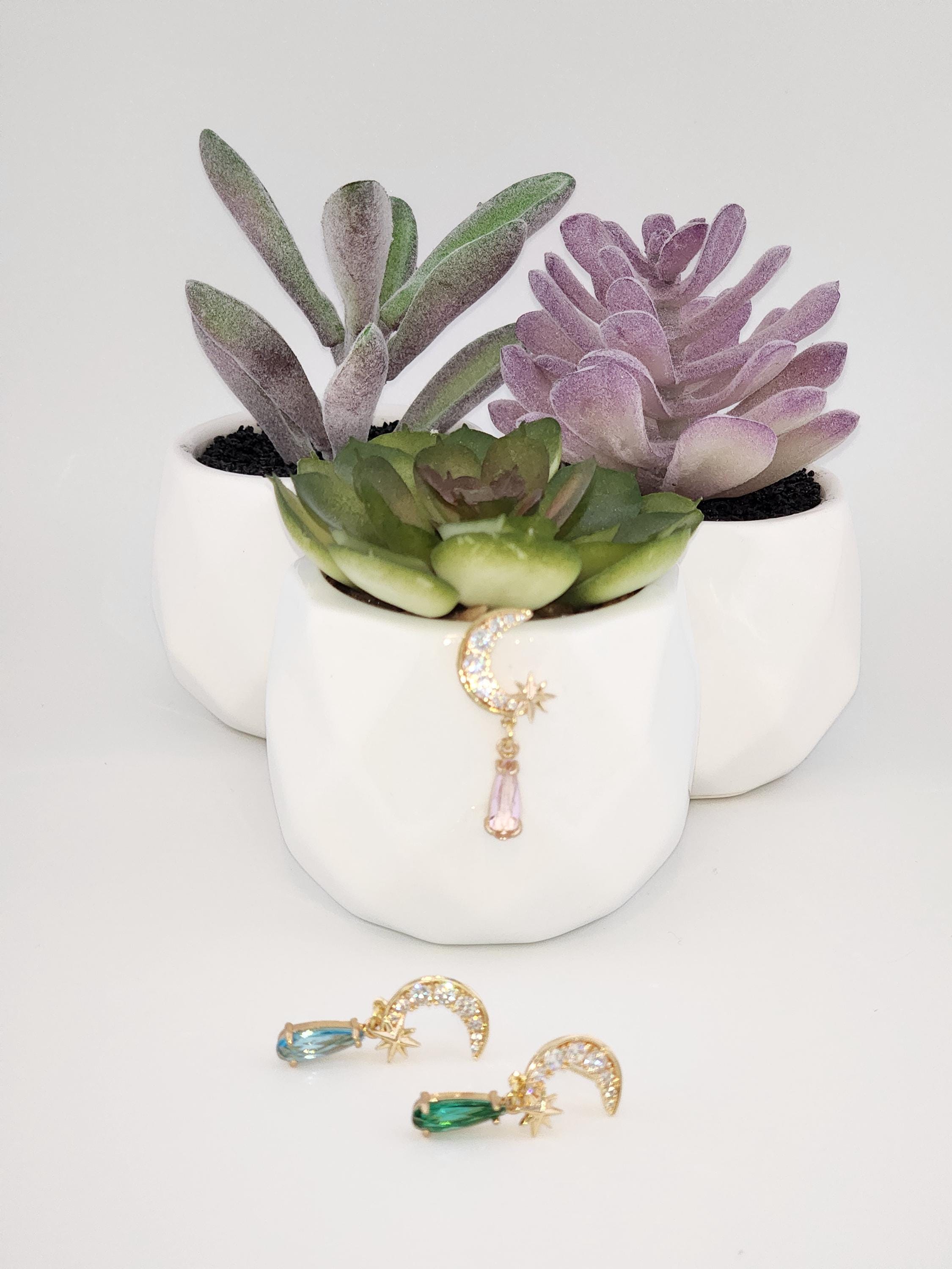 I made these earrings using tarnish resistant 18k gold plated brass Pave' star and crescent moon shape posts with cubic zirconia crystals. From 24k gold plated connecting rings are faceted teardrop shape crystal charms. YOUR CHOICE OF COLORS ARE: #1- Green #2- Light Pink #3- Blue * Your purchase will arrive in pretty packaging * Shipping is included