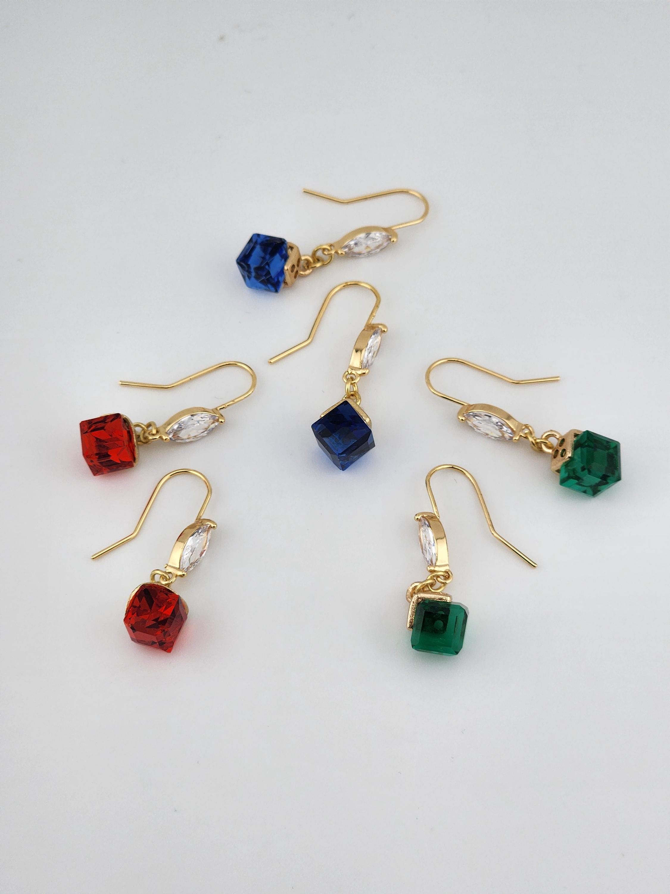 I made these earrings using 18k gold plated brass hooks that have marquise shaped cubic zirconia crystals. From them are fun gold capped cubes in 3 color options: #1- Red #2- Blue #3- Green * Your purchase will arrive in pretty packaging * Shipping is included