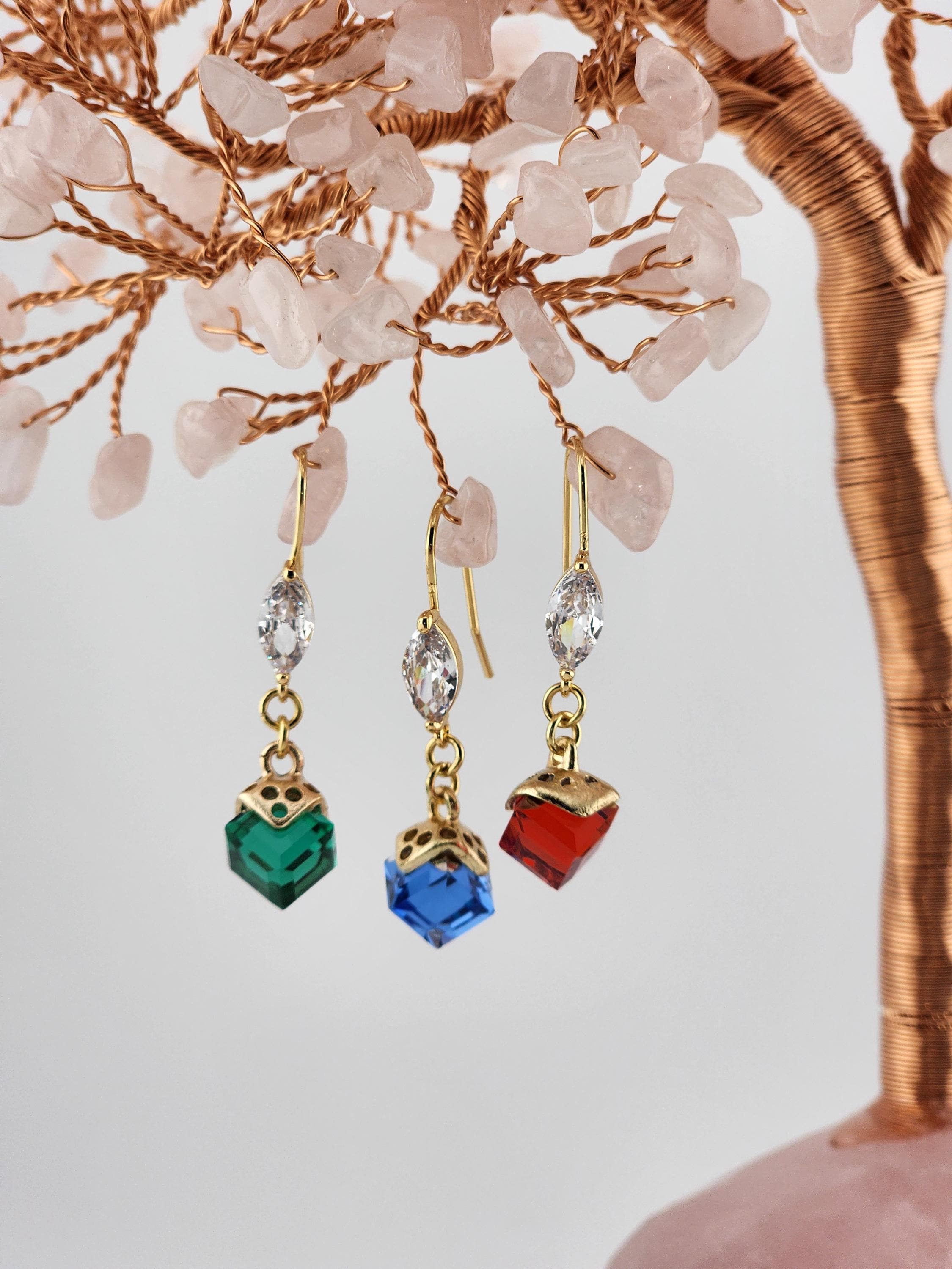 Red, Blue or Green Crystal Cube Charms on Gold Dangle Earrings