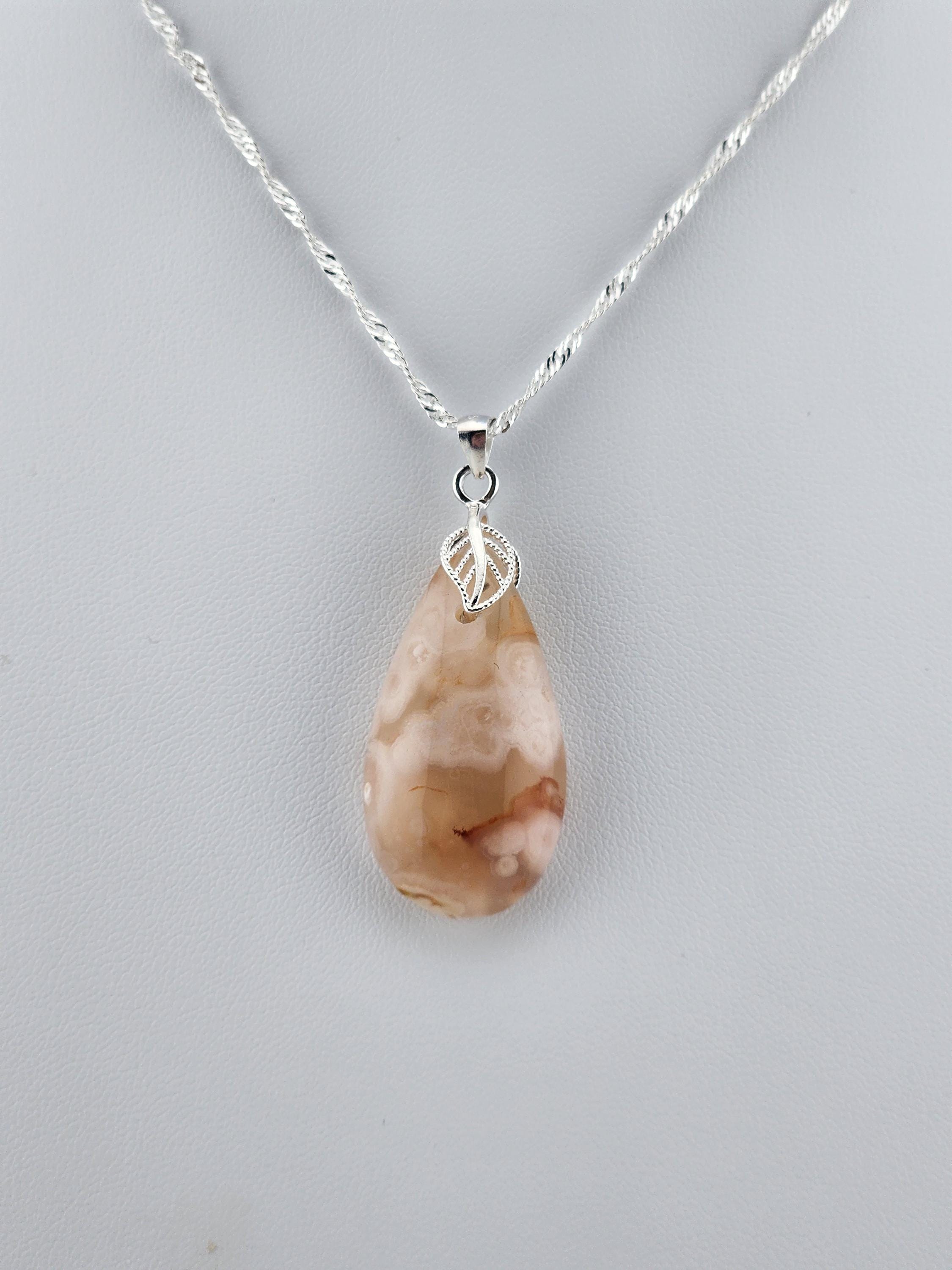 I made this necklace using delicate, dainty twisted sterling silver chain that has an extender chain and sterling silver connecting rings. The pendant is an amazing teardrop shaped natural Cherry Blossom stone that hangs from a sterling silver leaf shaped bail. It is GORGEOUS! * Your purchase will arrive in pretty packaging * Shipping is included