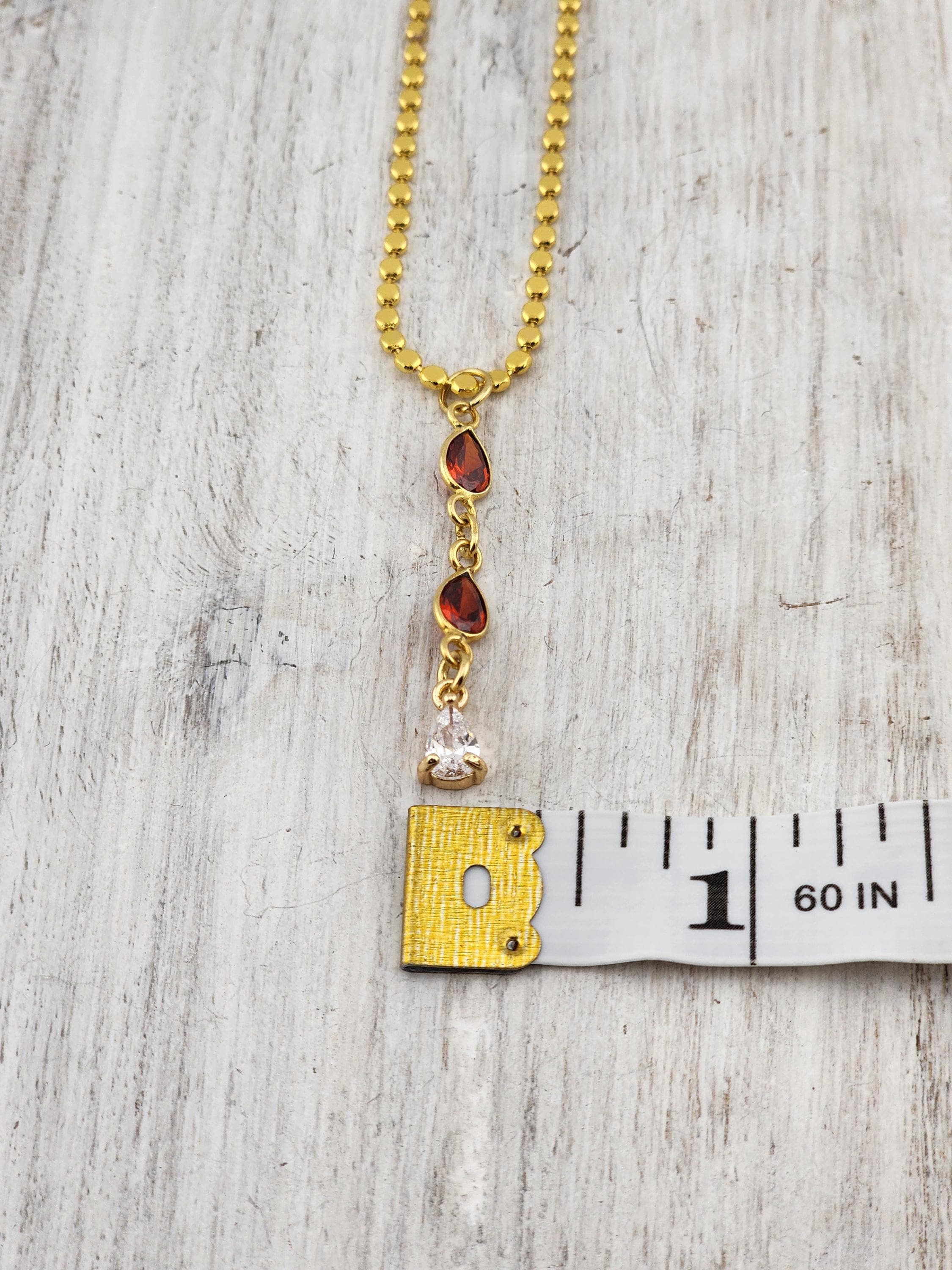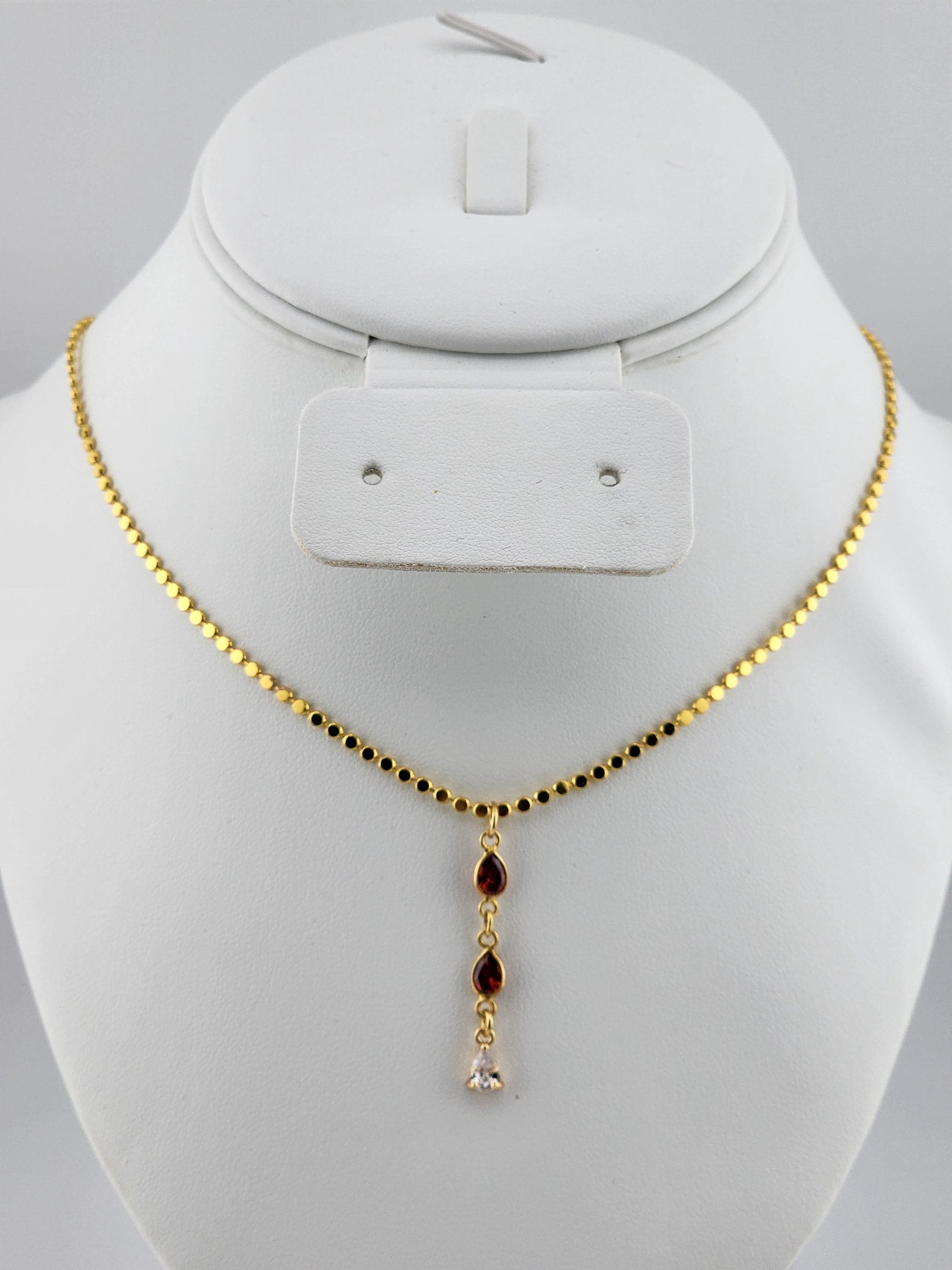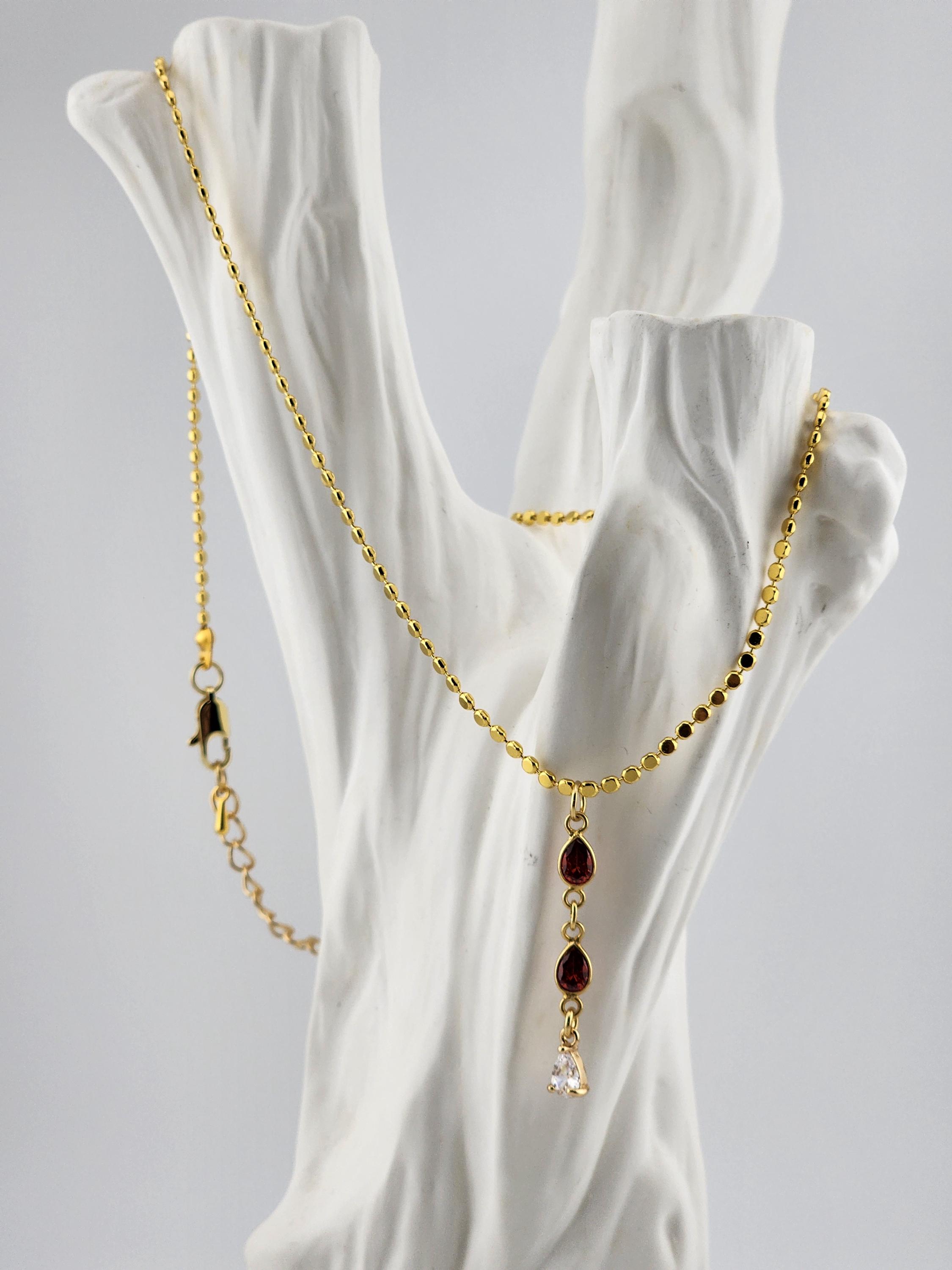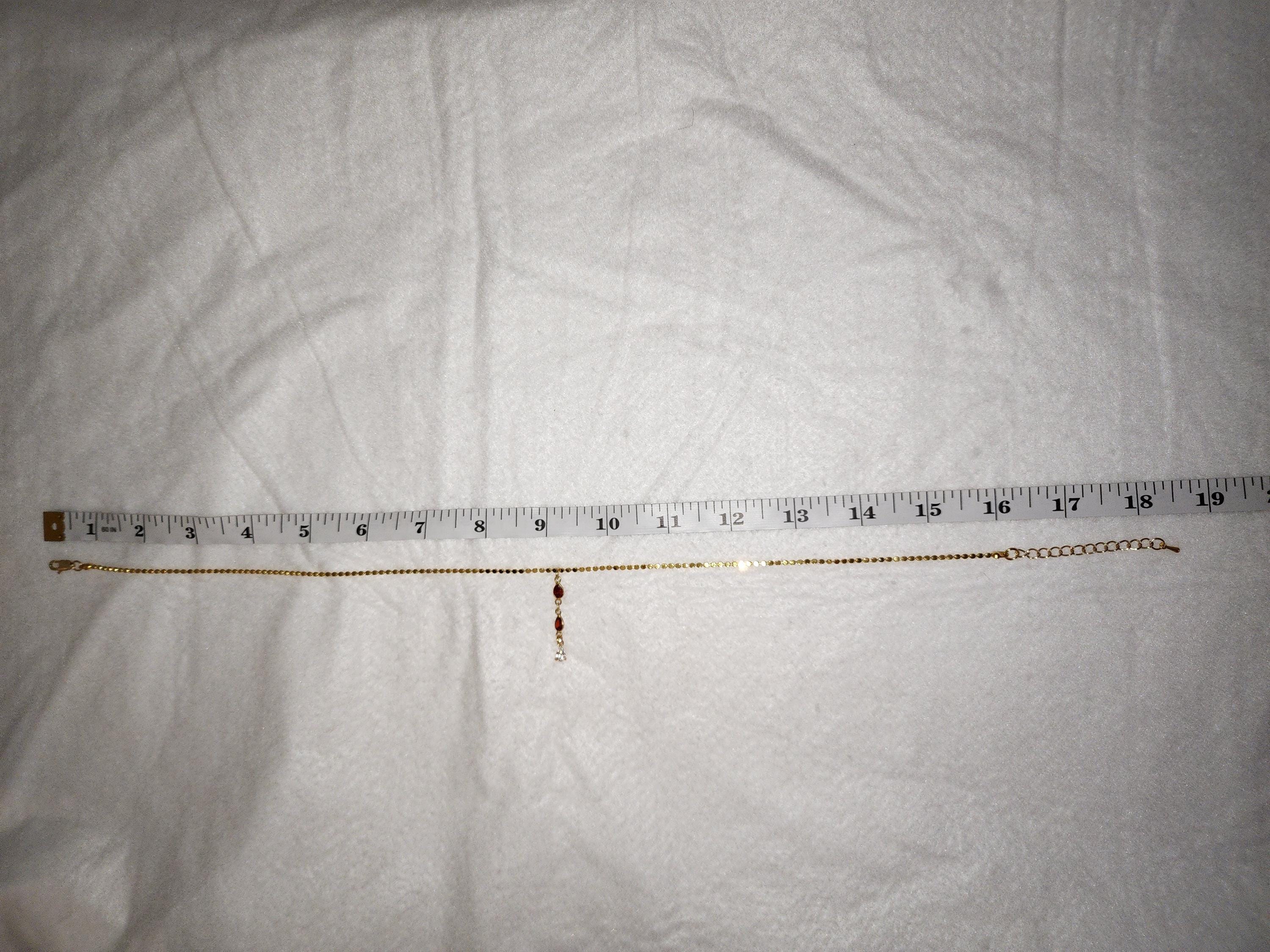 I made this stunning choker necklace using tarnish resistant 18k gold plated brass flat dot chain, an extender chain, a 16k gold plated clasp, and 24k gold plated connecting rings. The pendant are two 22k gold plated pear shaped Garnet stone links handcrafted from India, with a single pear shaped crystal and hangs from a 24k gold plated ring. * Your purchase will arrive in pretty packaging * Shipping is free within the U.S.