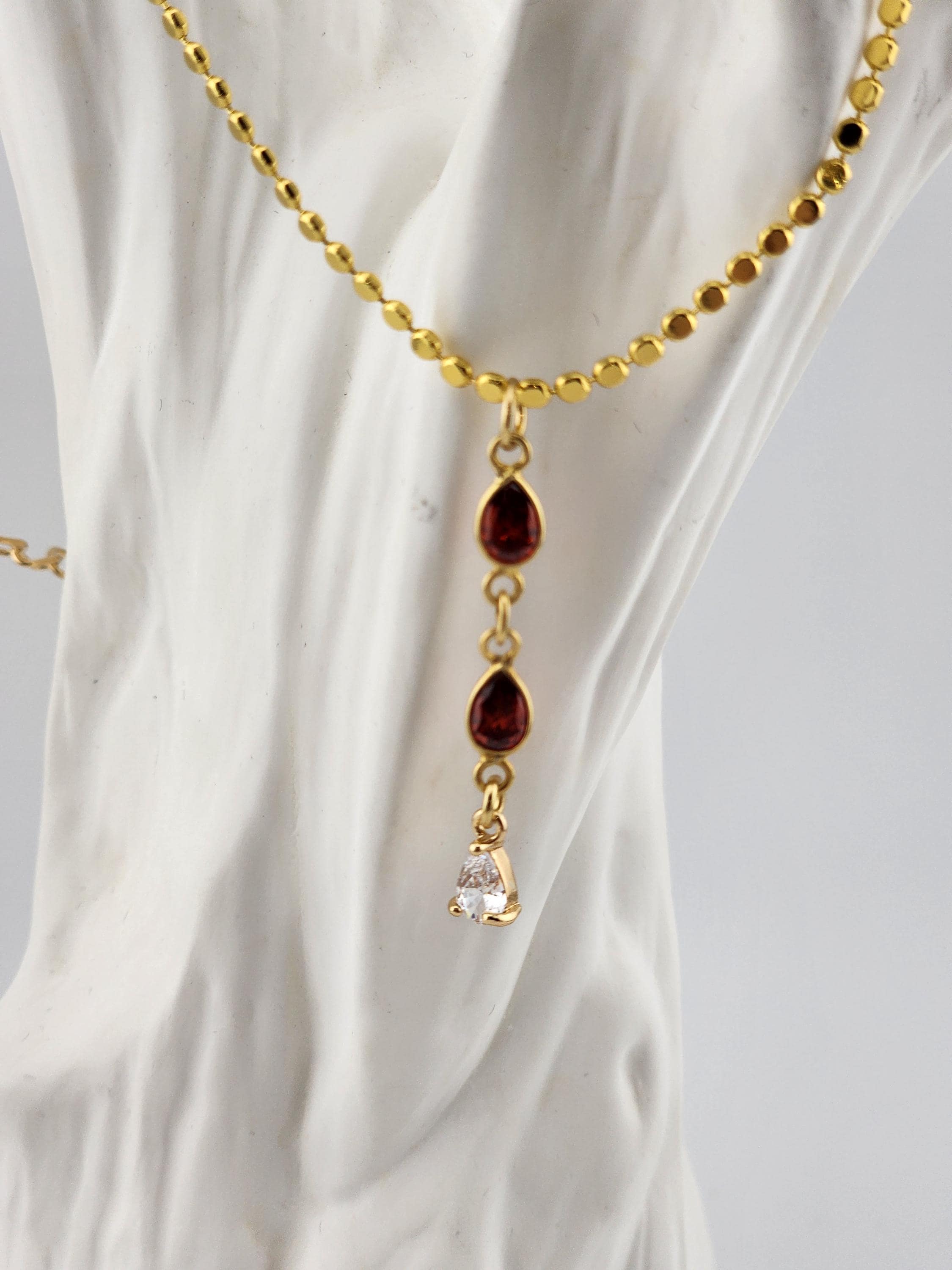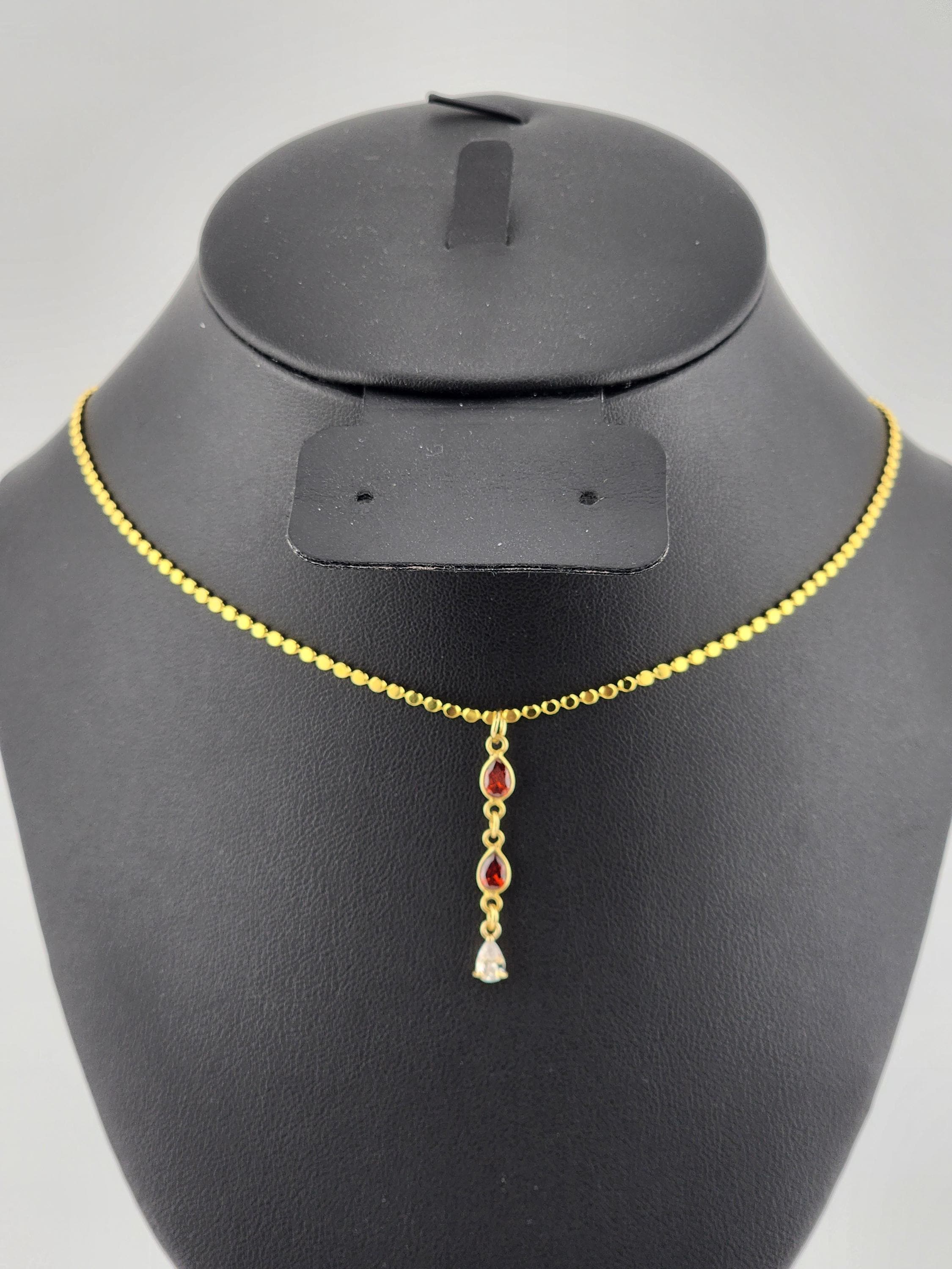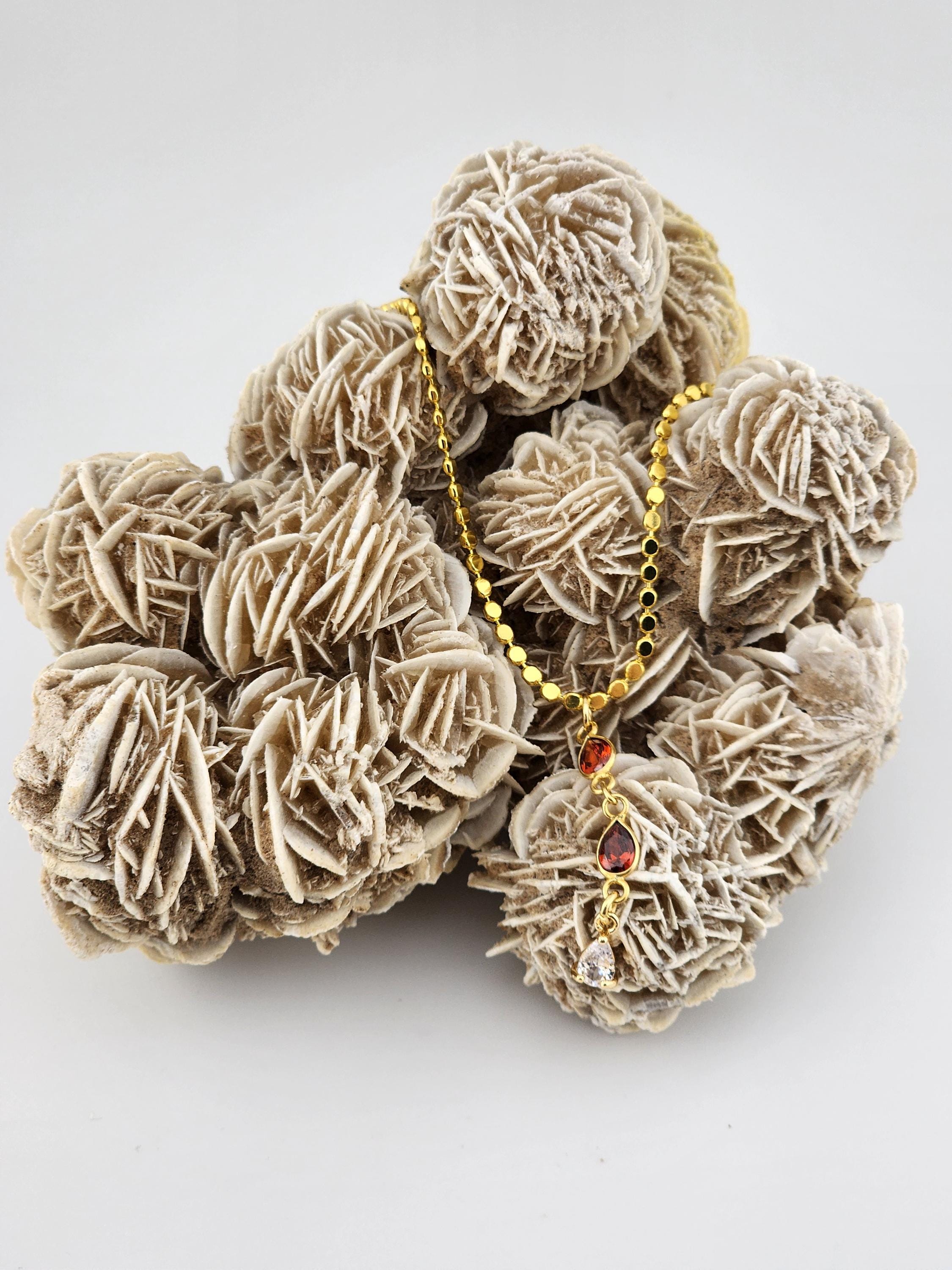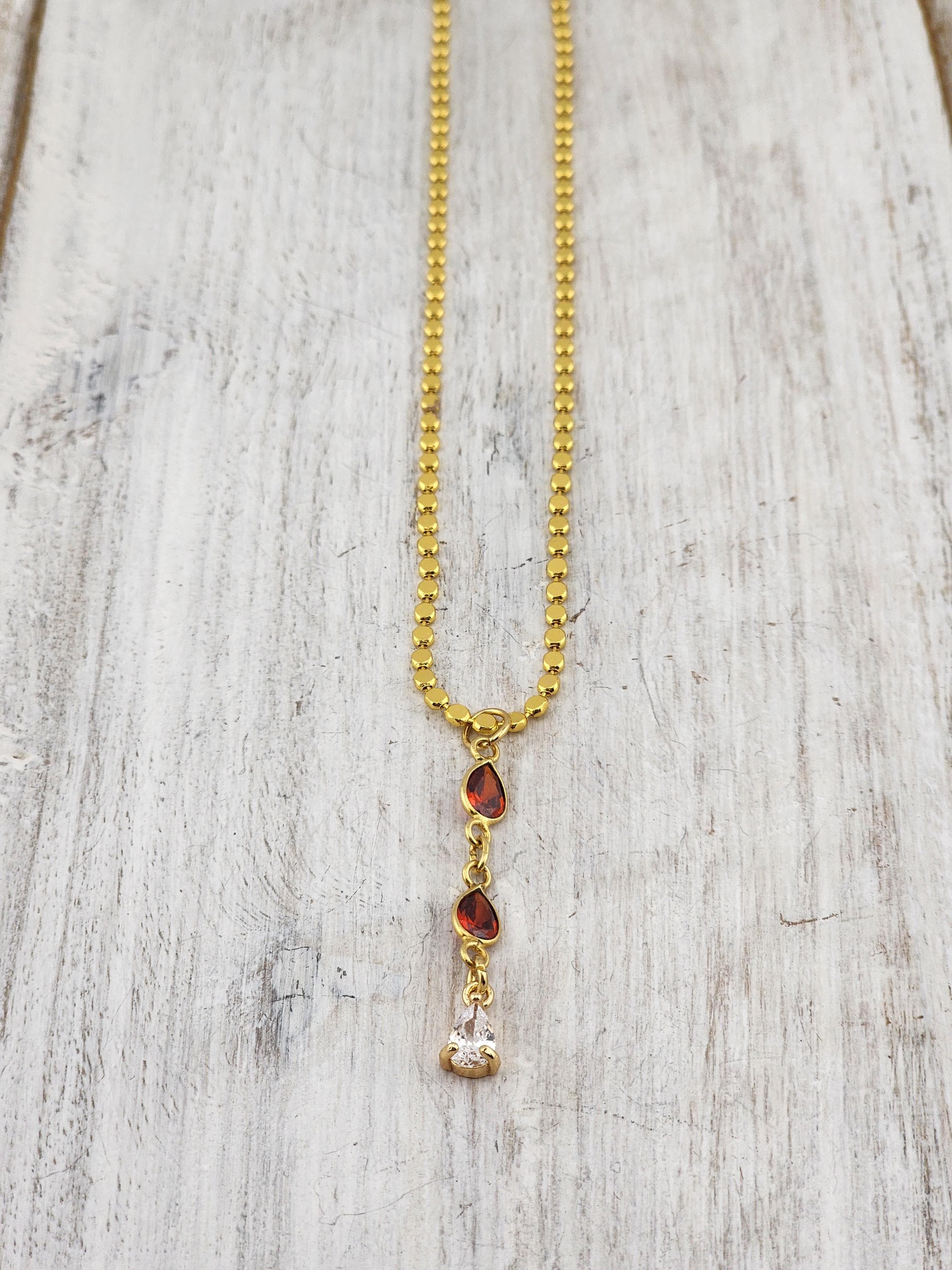 I made this stunning choker necklace using tarnish resistant 18k gold plated brass flat dot chain, an extender chain, a 16k gold plated clasp, and 24k gold plated connecting rings. The pendant are two 22k gold plated pear shaped Garnet stone links handcrafted from India, with a single pear shaped crystal and hangs from a 24k gold plated ring. * Your purchase will arrive in pretty packaging * Shipping is free within the U.S.
