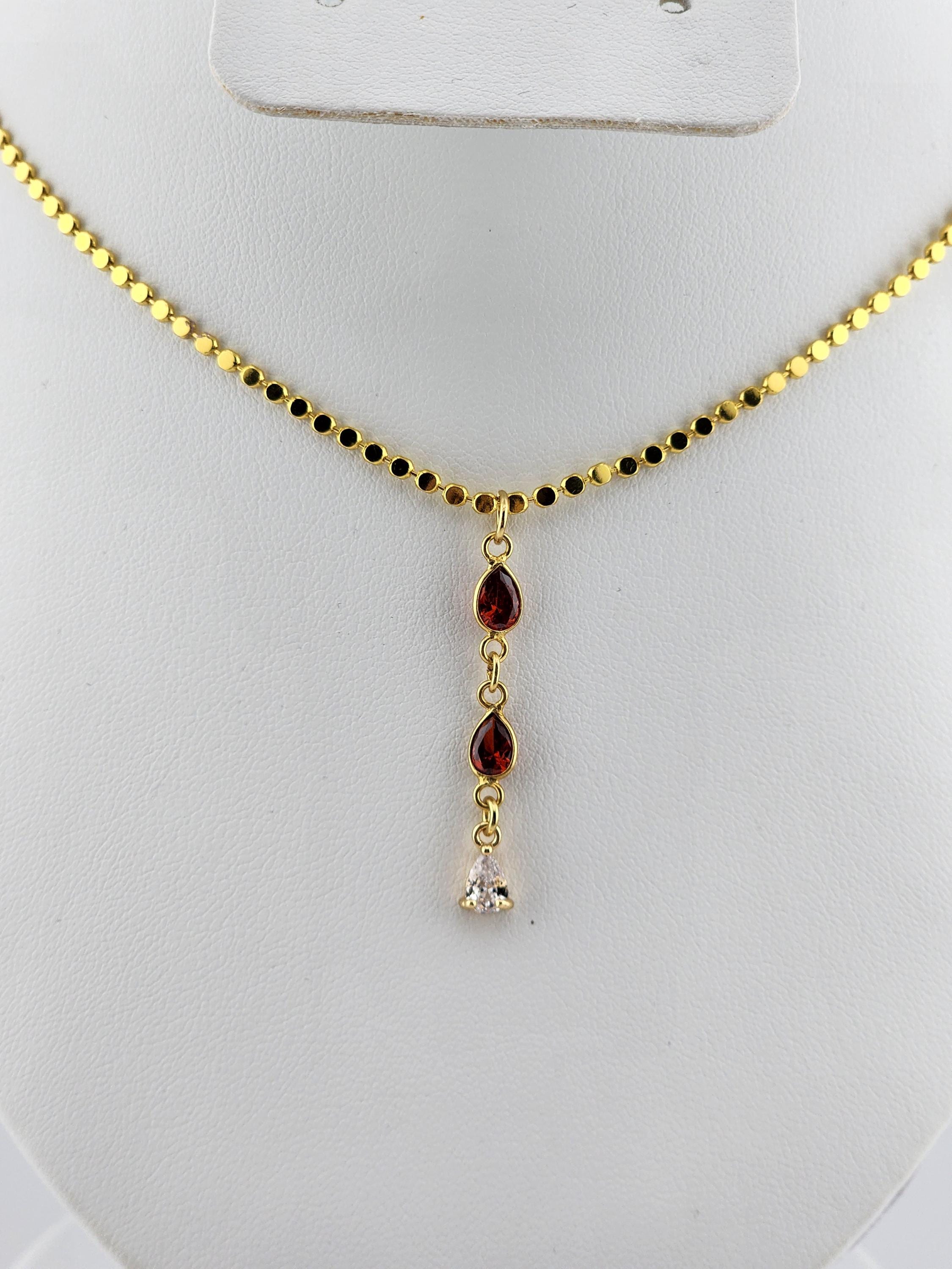 I made this stunning necklace using tarnish resistant 18k gold plated brass flat dot chain with an extender that makes it adjustable from 16"-18" in length. It has a 16k gold plated clasp and 24k gold plated connecting rings. The pendant has two 22k gold plated natural pear shaped Garnet stone connectors, handcrafted from India. There is a single teardrop shaped crystal that hangs from a 24k gold plated ring. * Your purchase will arrive in pretty packaging