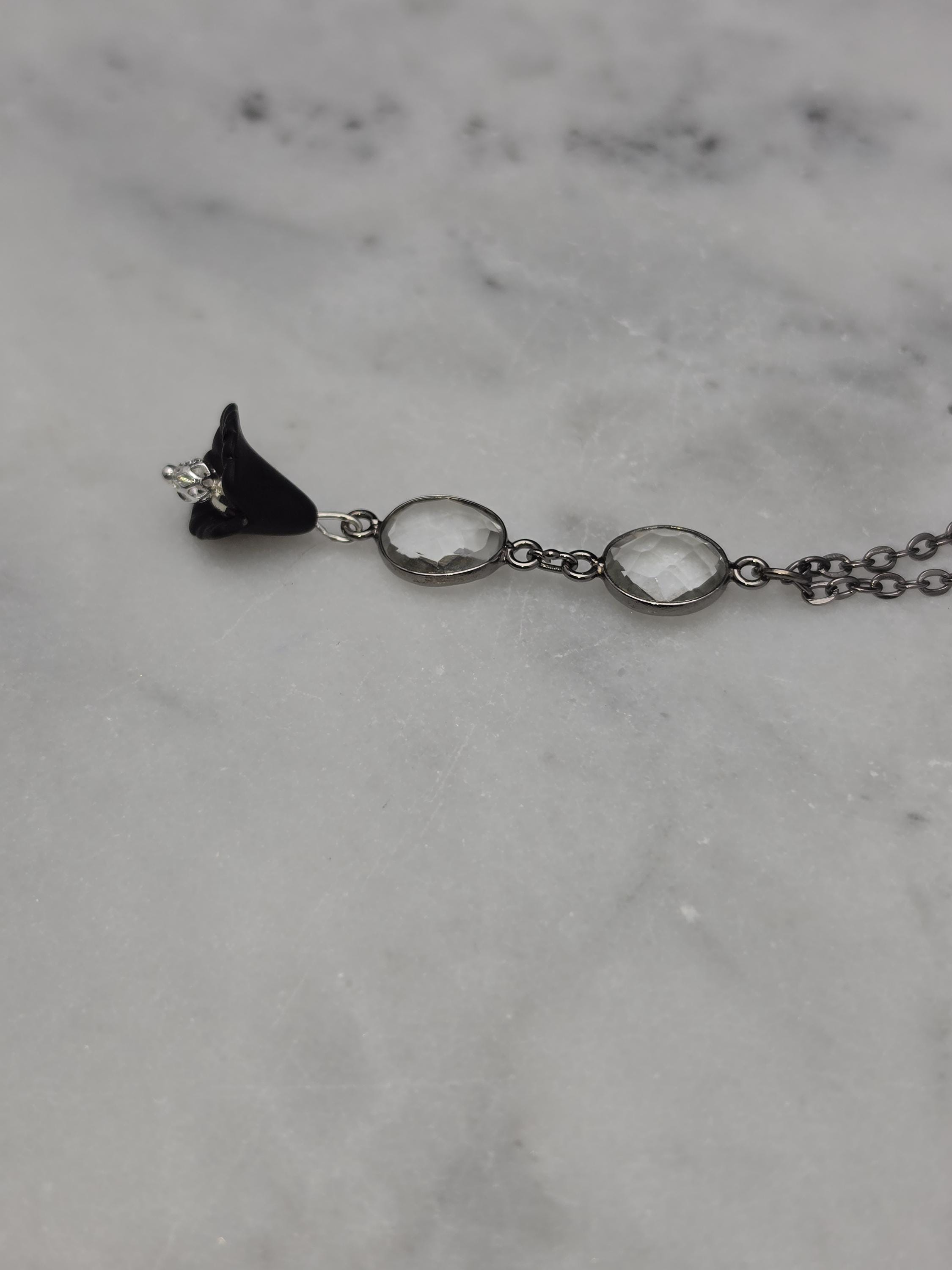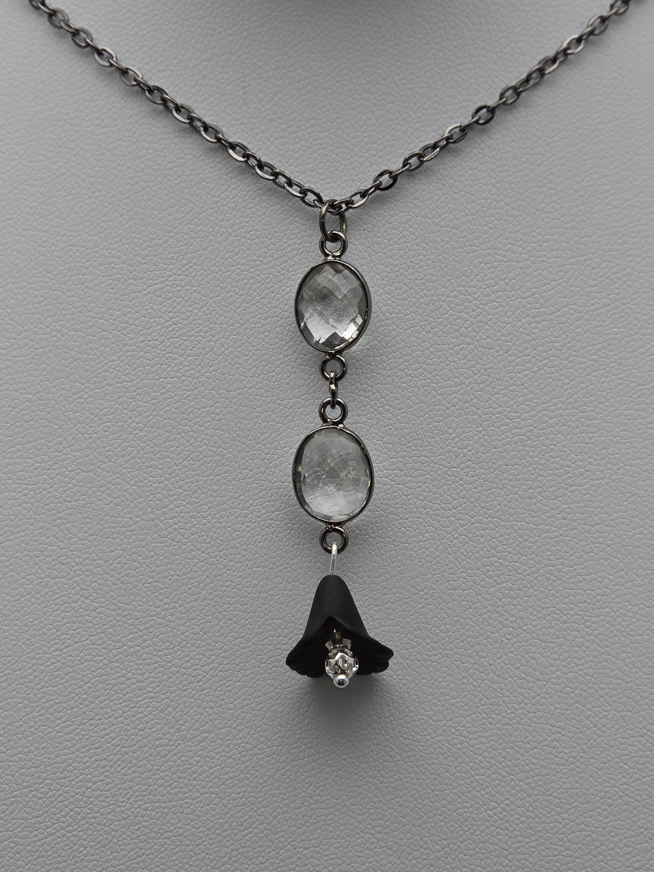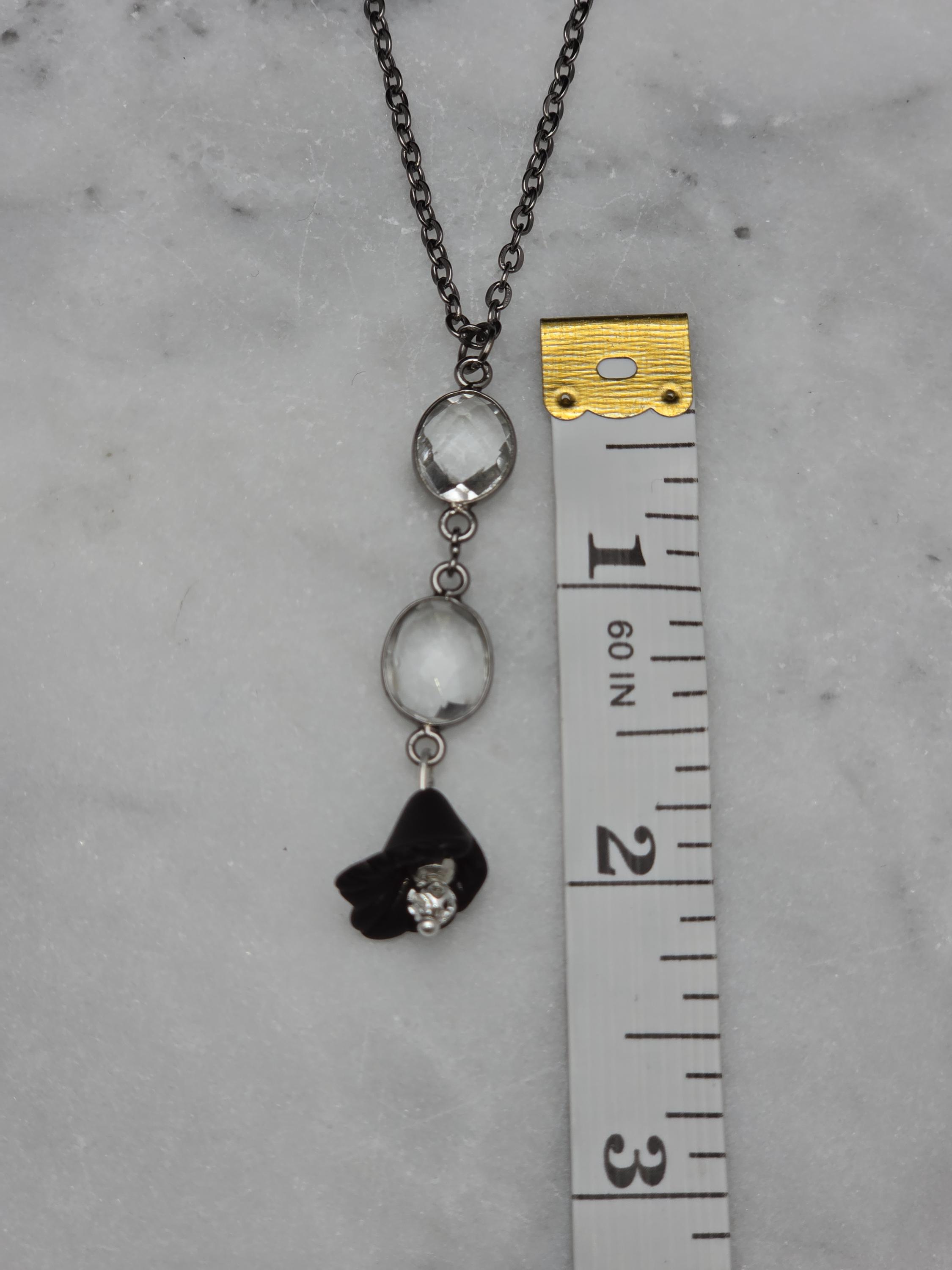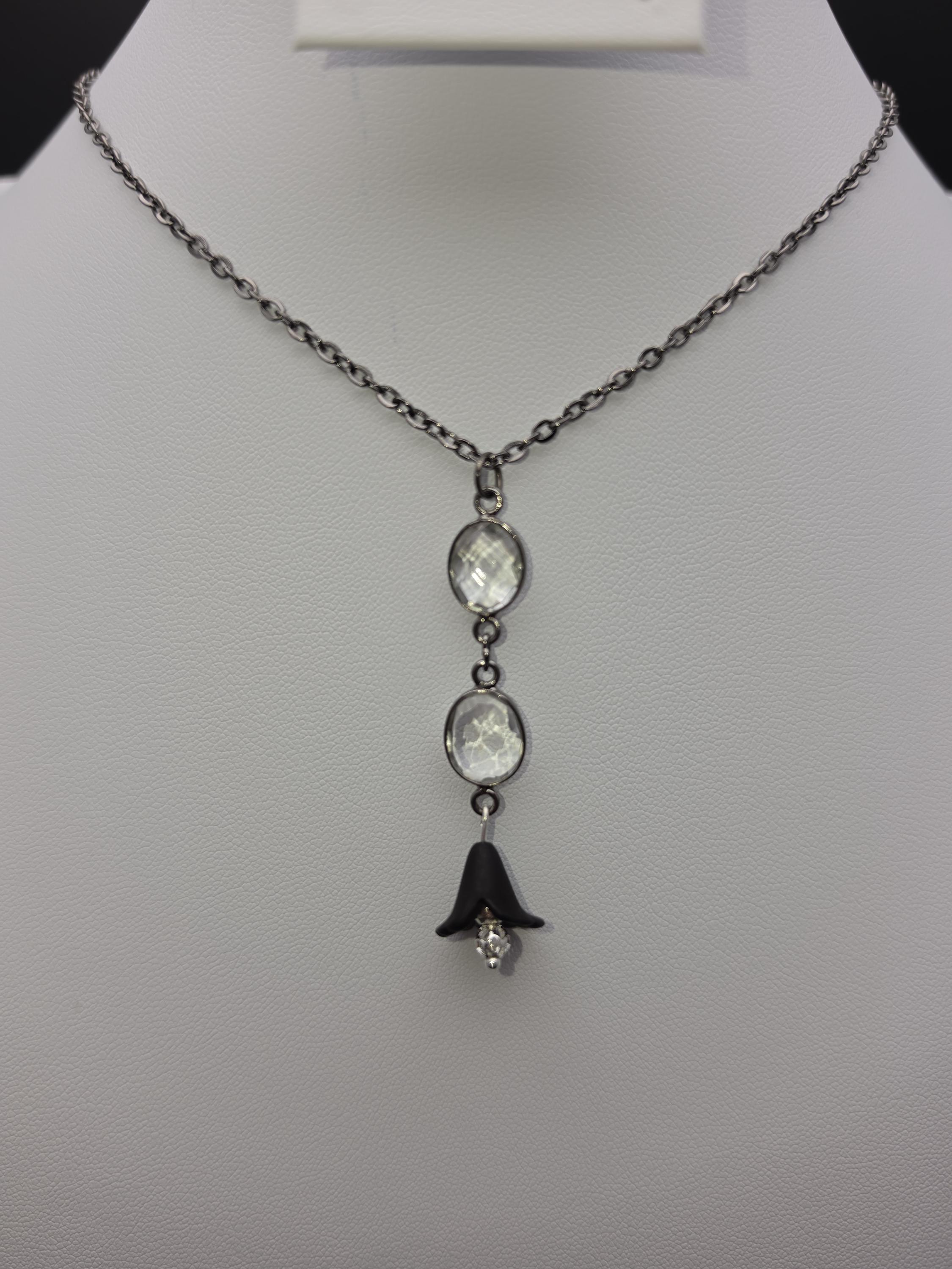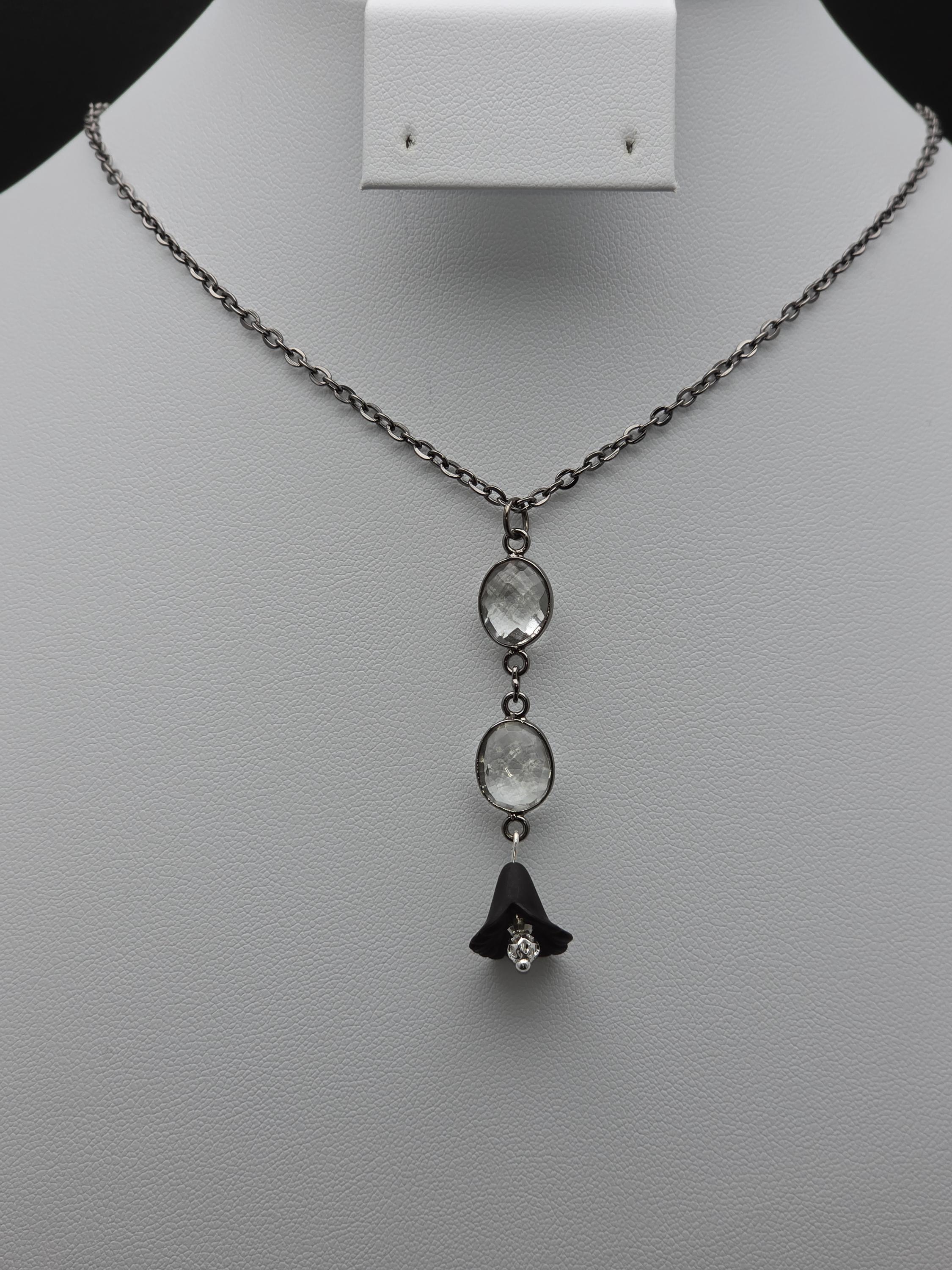 I made this choker necklace using elegant black chain with an extender chain. I added a stunningly beautiful pendant made of two faceted oval clear crystal connectors in black rhodium bezel, handcrafted in India. Below that is a black lucite calla lily that has a sterling silver filigree bead in the center and sterling silver pin. * Your purchase will arrive in pretty packaging * Gemstone -Crystal * Shape - Oval Shape * Stone Size - 8x10mm to 8x12mm
