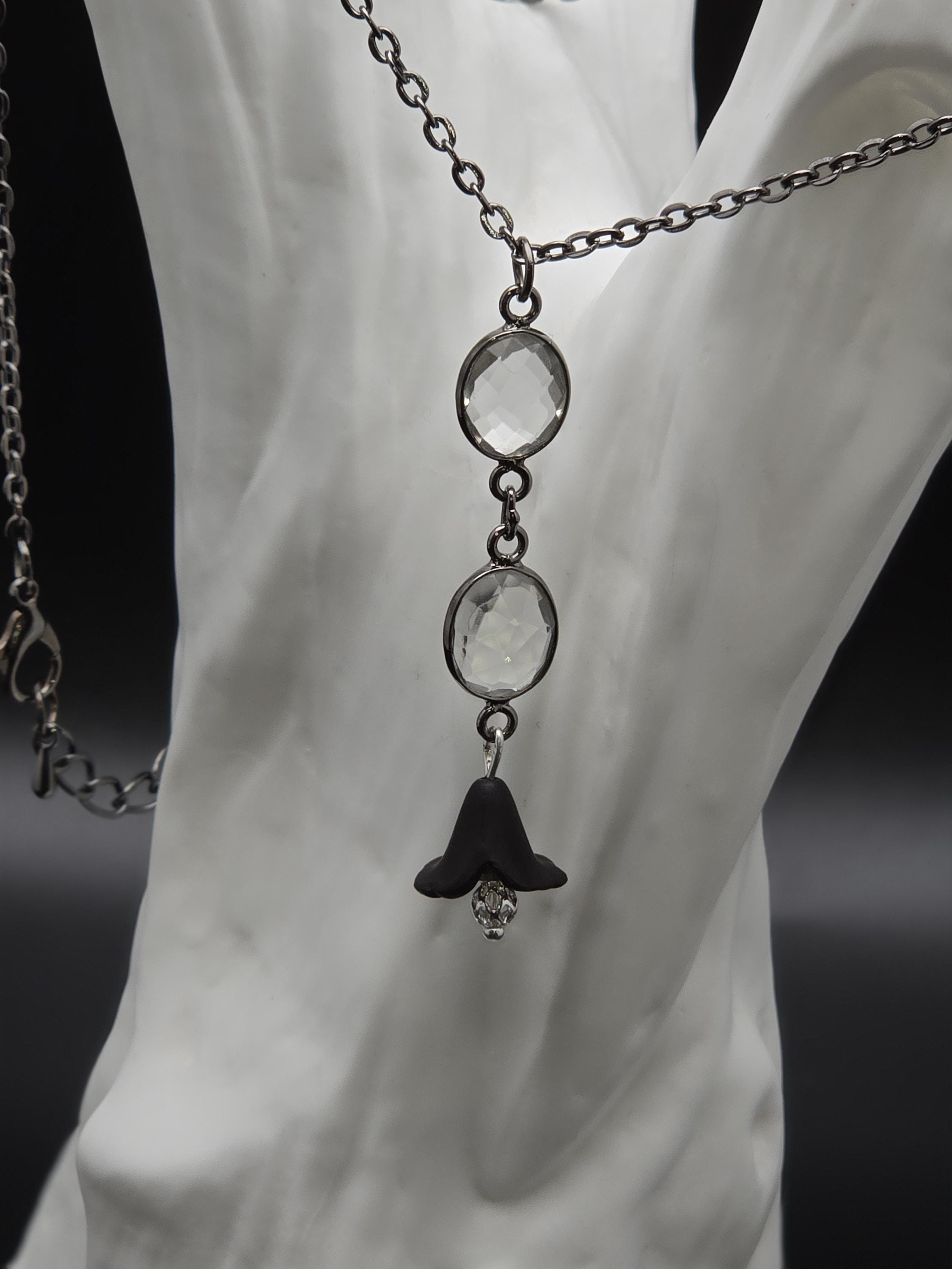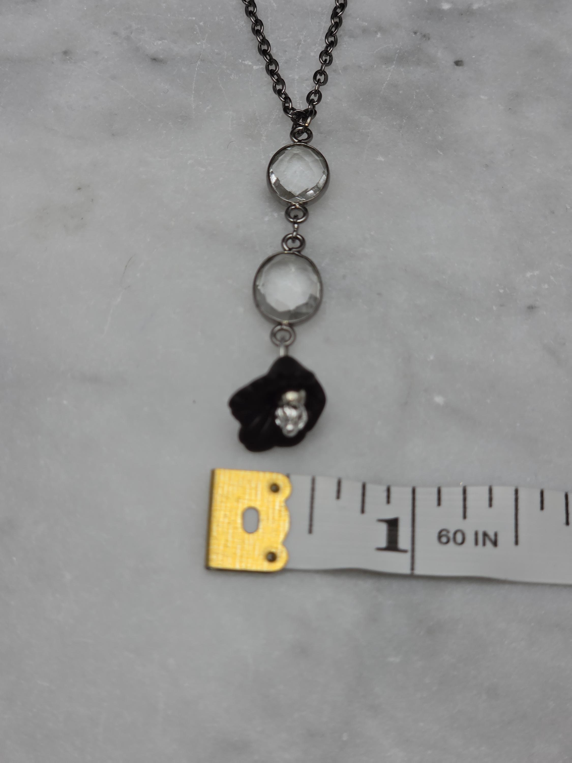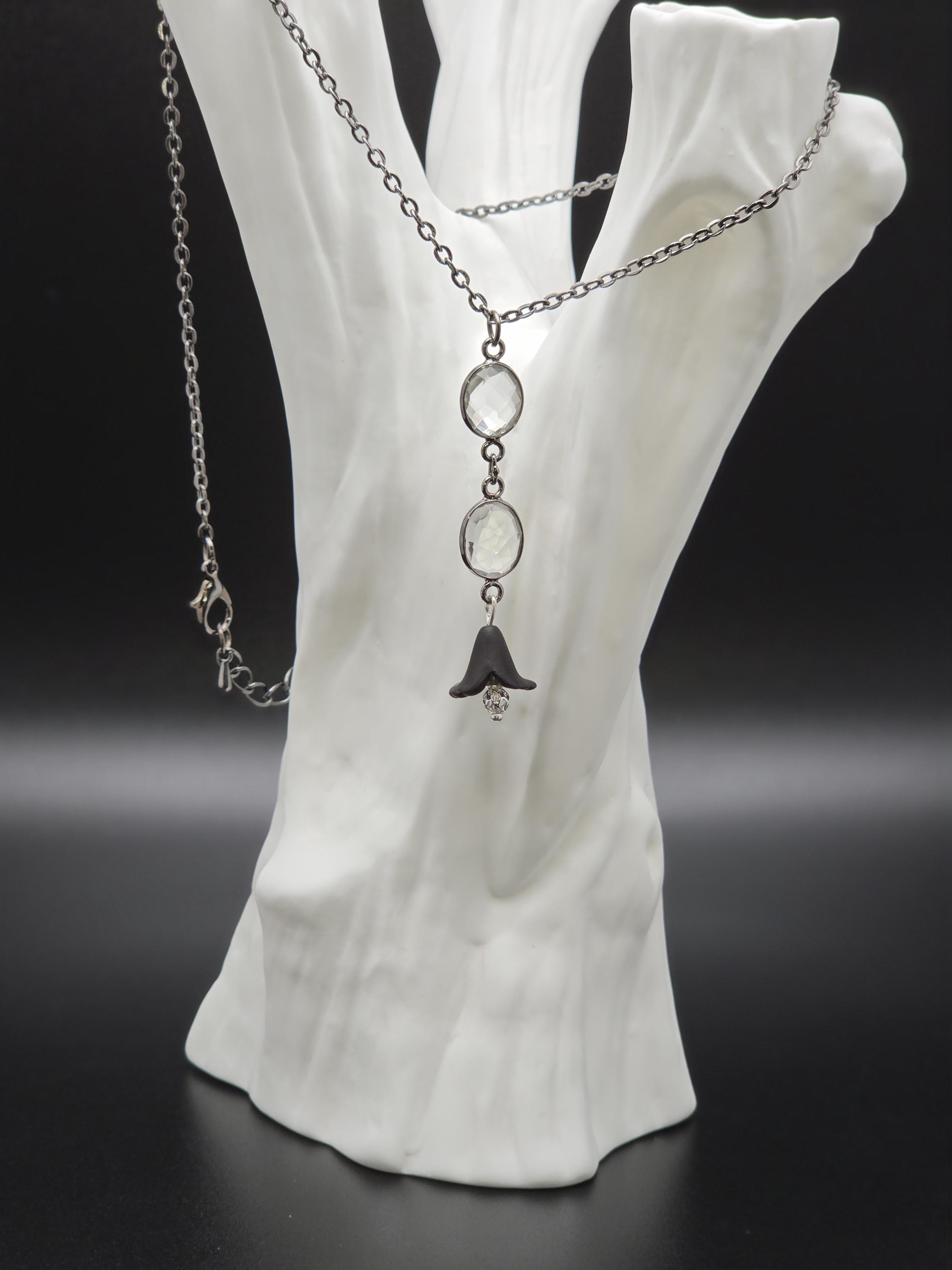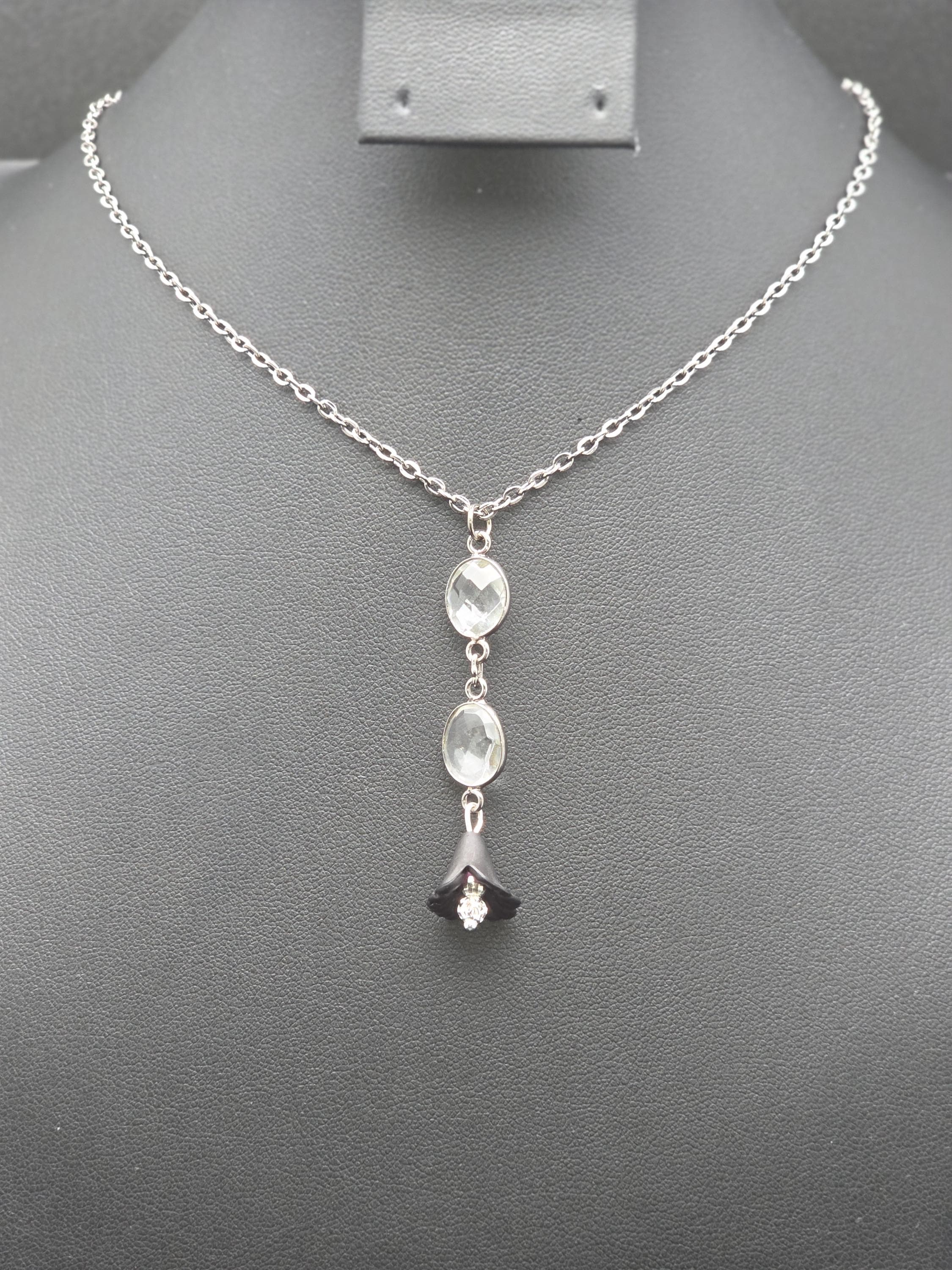 I made this choker necklace using elegant black chain with an extender chain. I added a stunningly beautiful pendant made of two faceted oval clear crystal connectors in black rhodium bezel, handcrafted in India. Below that is a black lucite calla lily that has a sterling silver filigree bead in the center and sterling silver pin. * Your purchase will arrive in pretty packaging * Gemstone -Crystal * Shape - Oval Shape * Stone Size - 8x10mm to 8x12mm