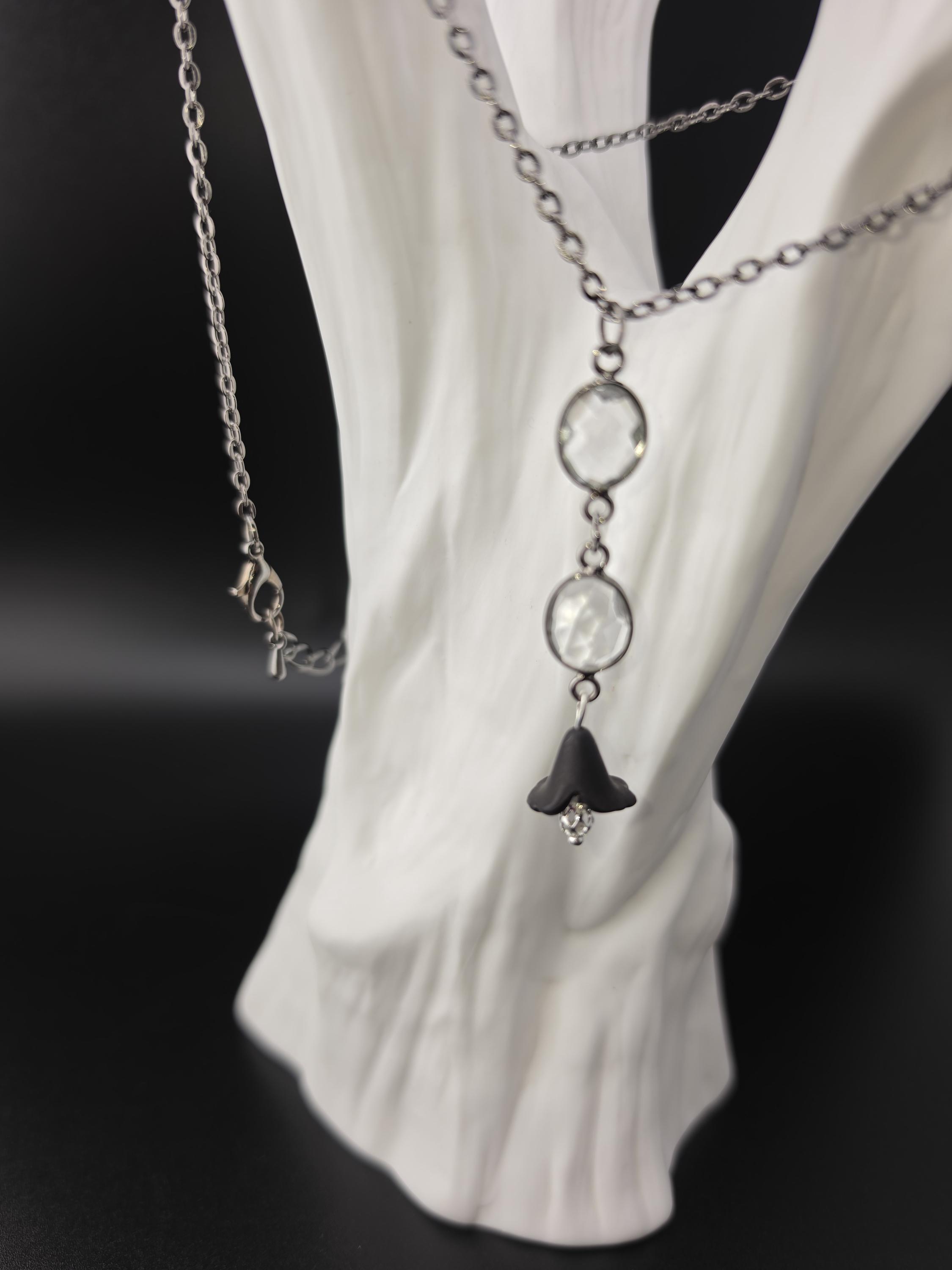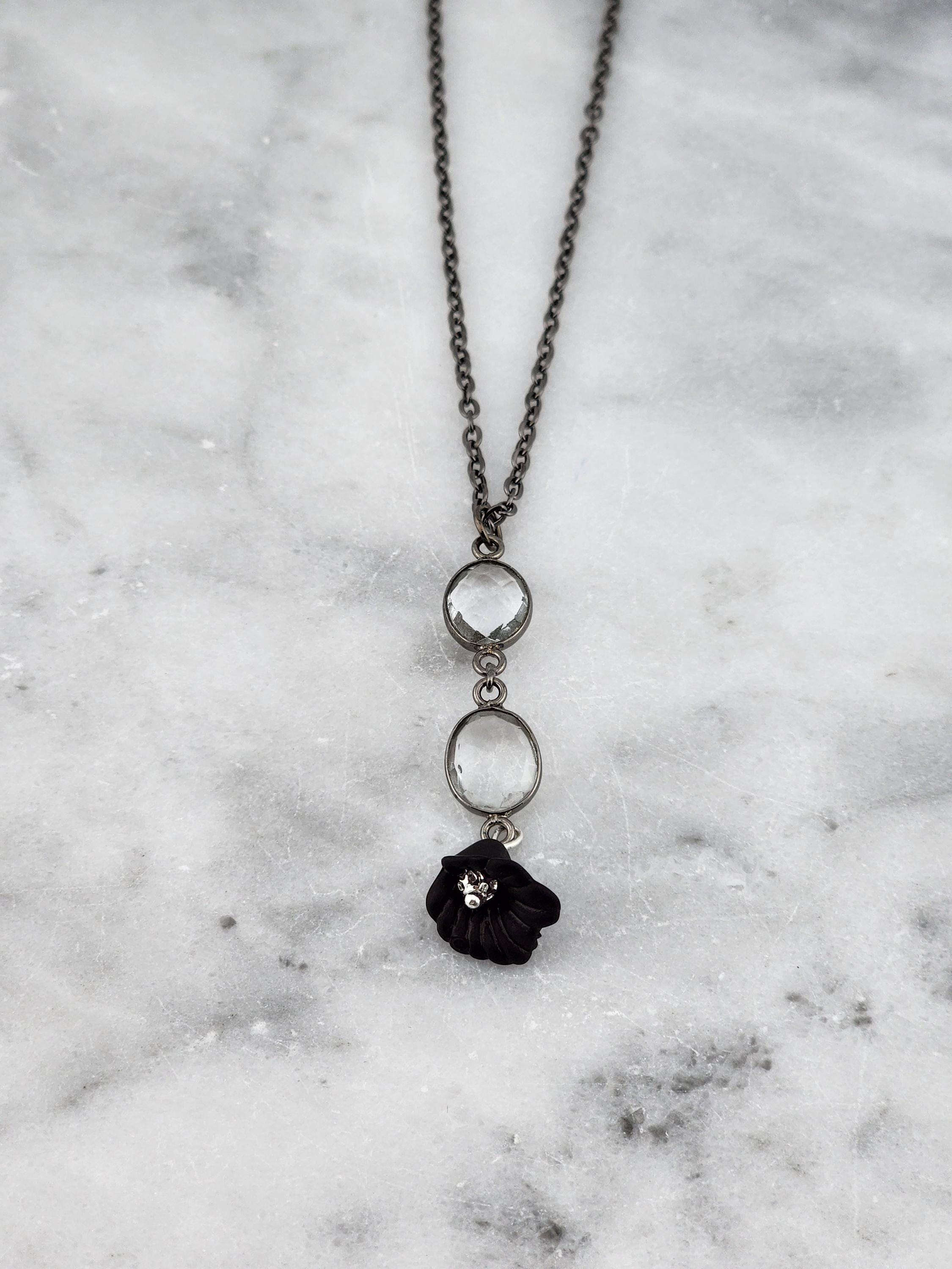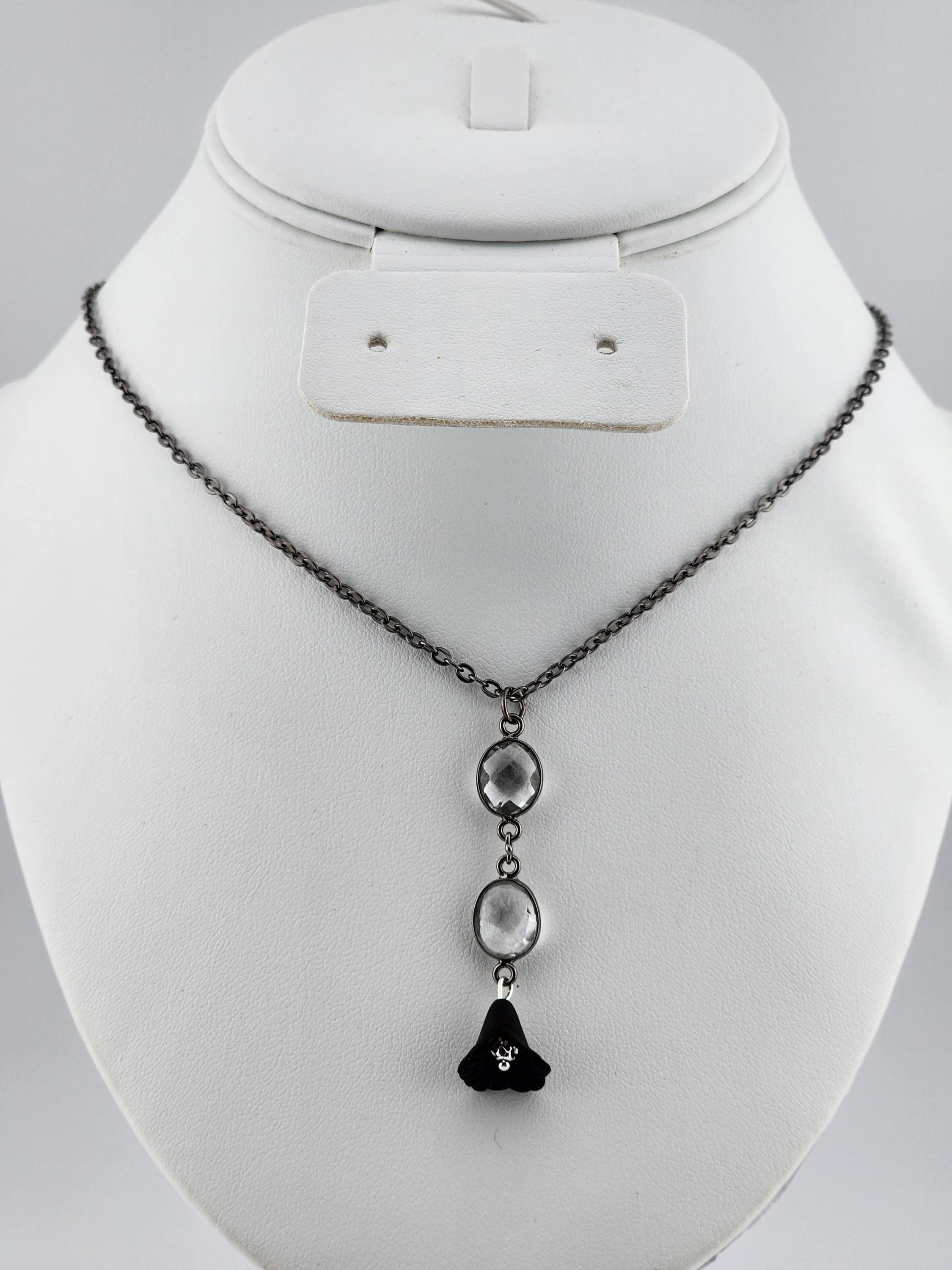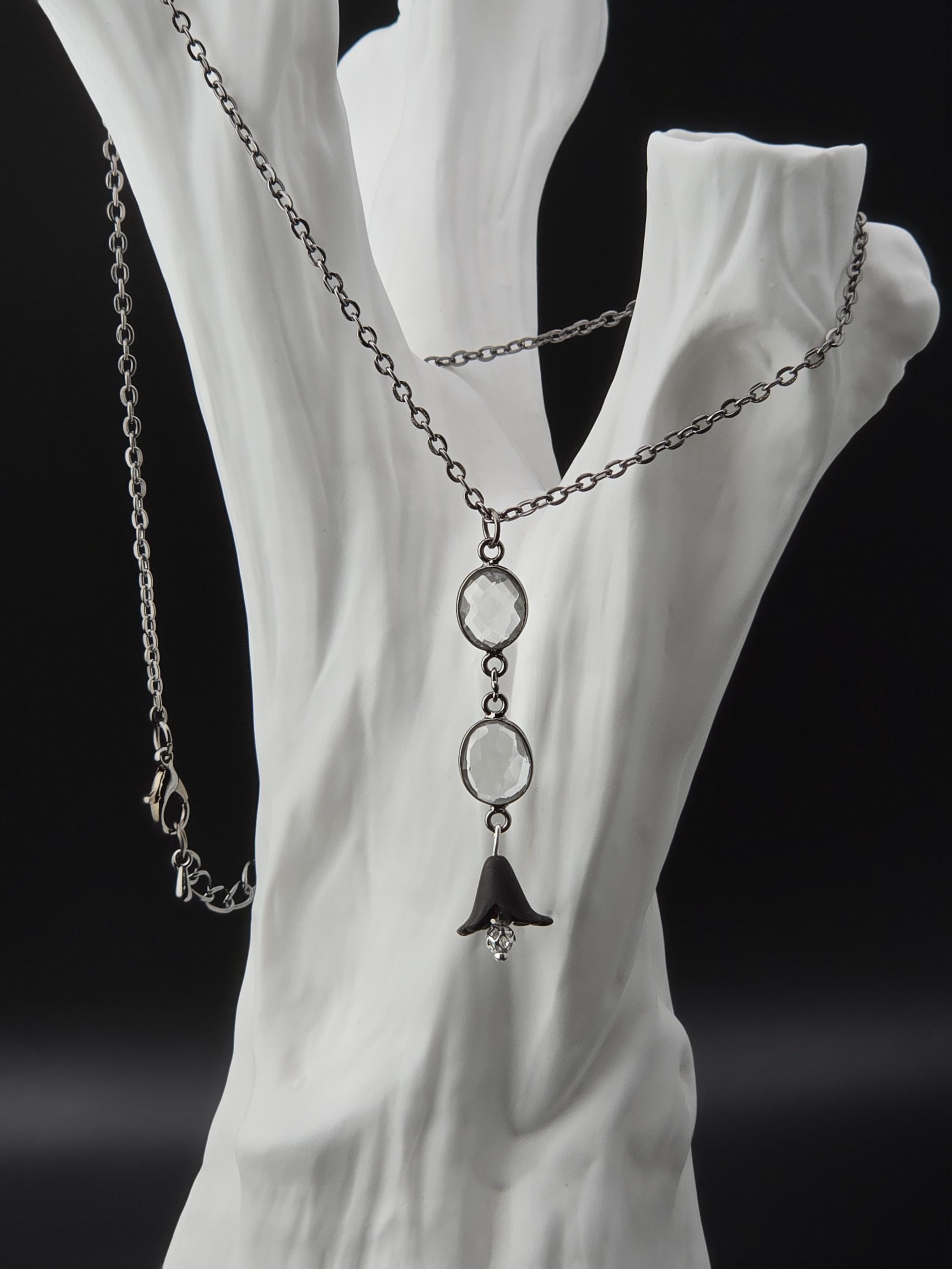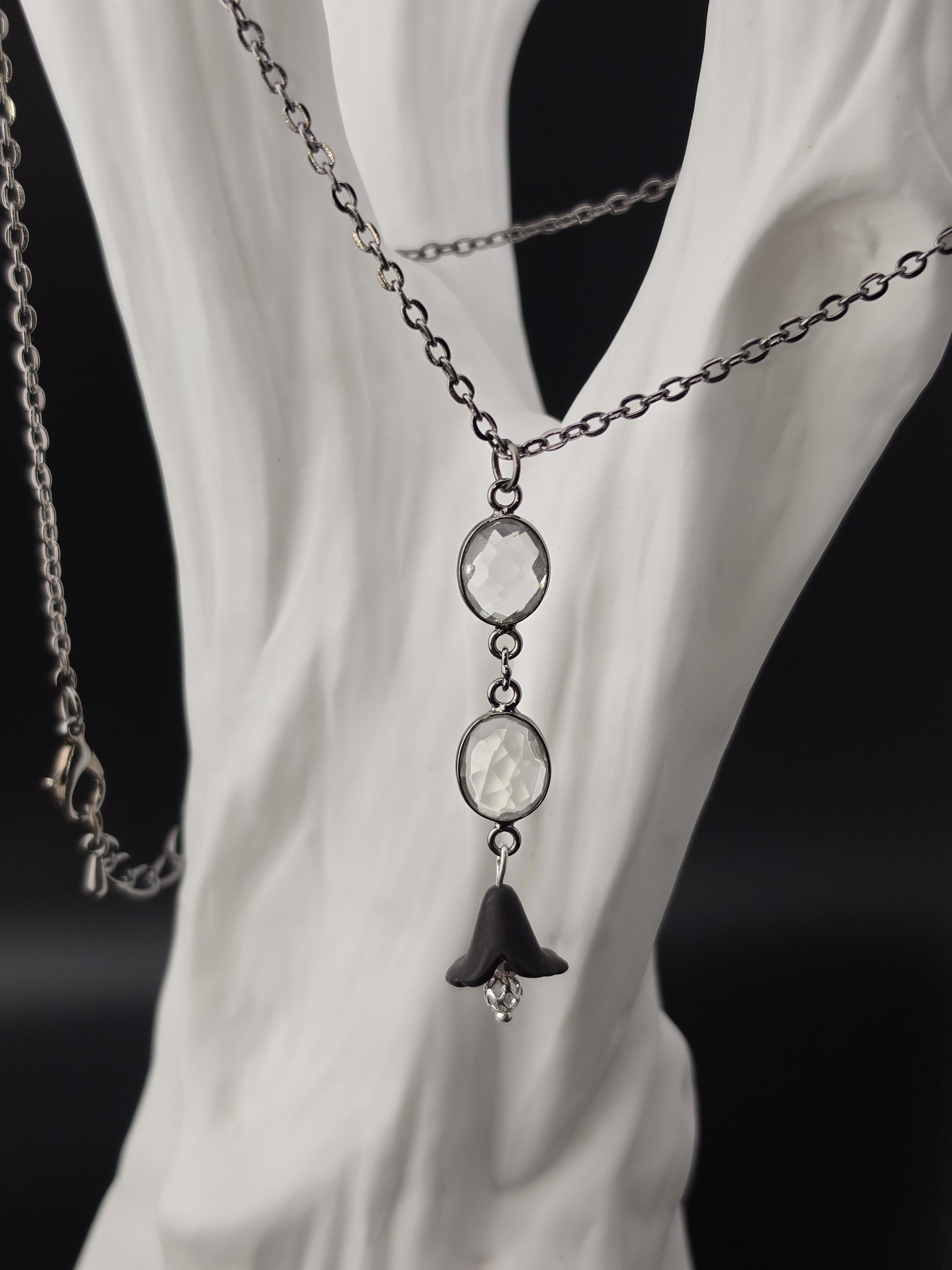 I made this choker necklace using elegant black chain with an extender chain. I added a stunningly beautiful pendant made of two faceted oval clear crystal connectors in black rhodium bezel, handcrafted in India. Below that is a black lucite calla lily that has a sterling silver filigree bead in the center and sterling silver pin. * Your purchase will arrive in pretty packaging * Gemstone -Crystal * Shape - Oval Shape * Stone Size - 8x10mm to 8x12mm