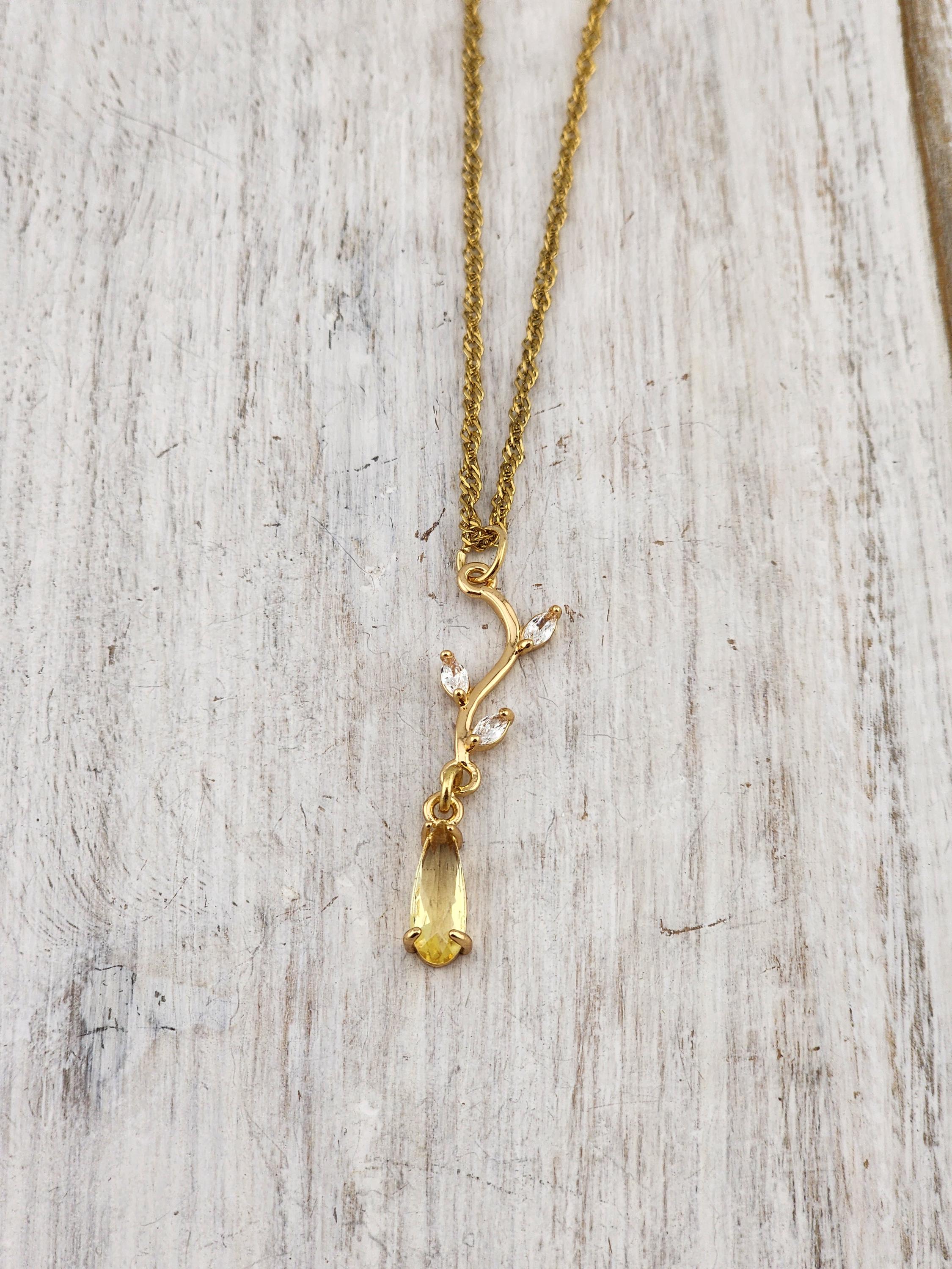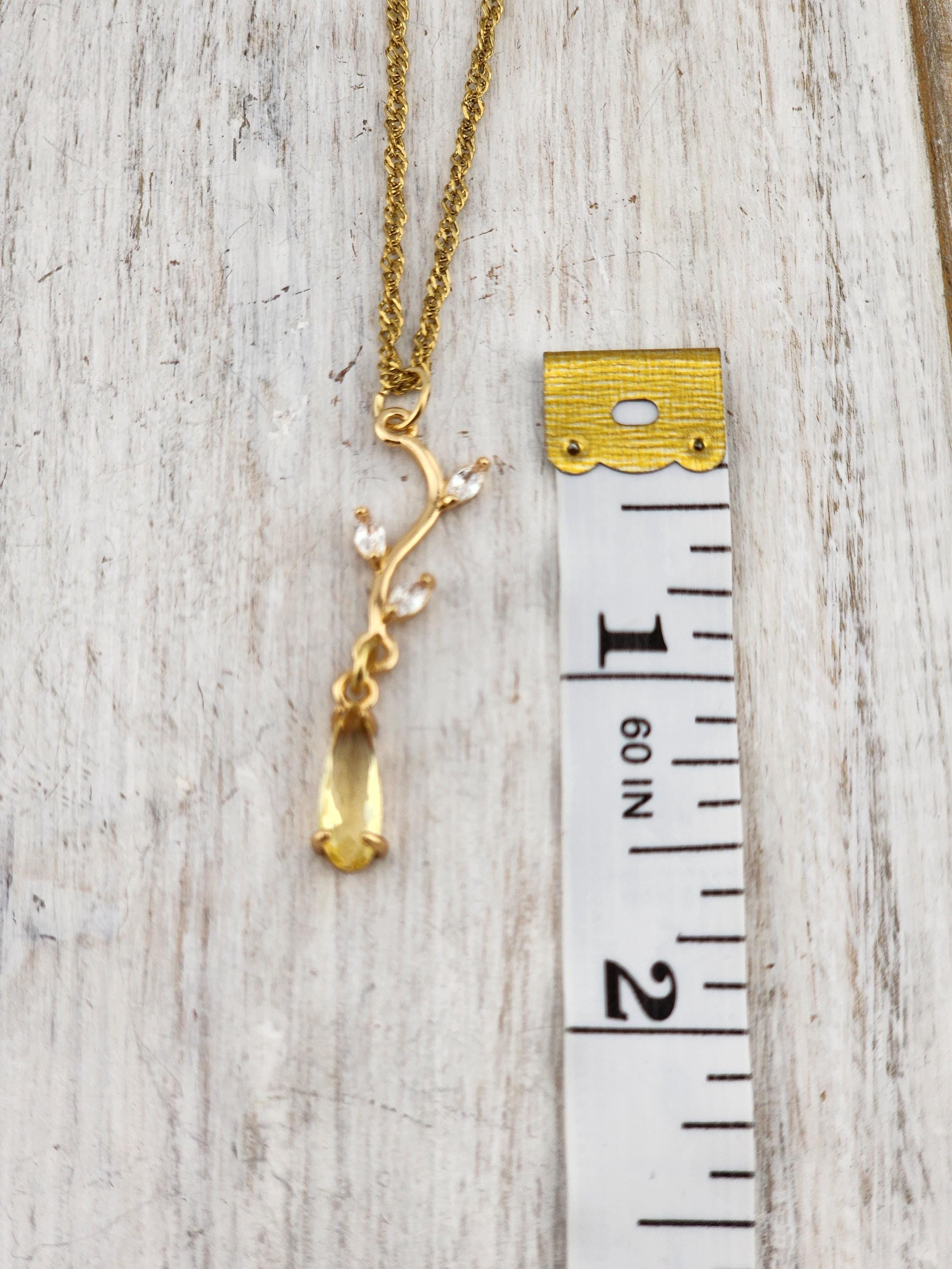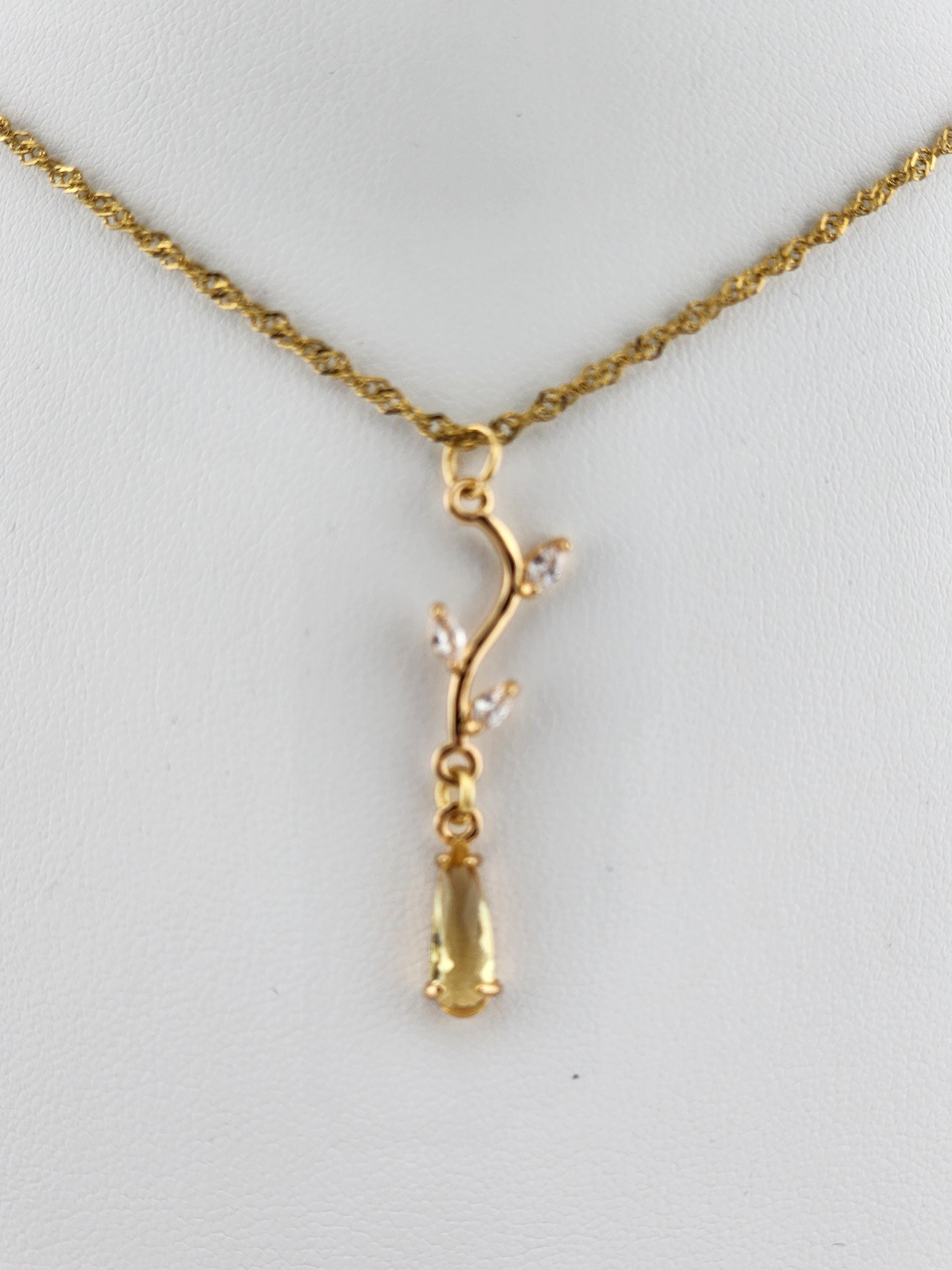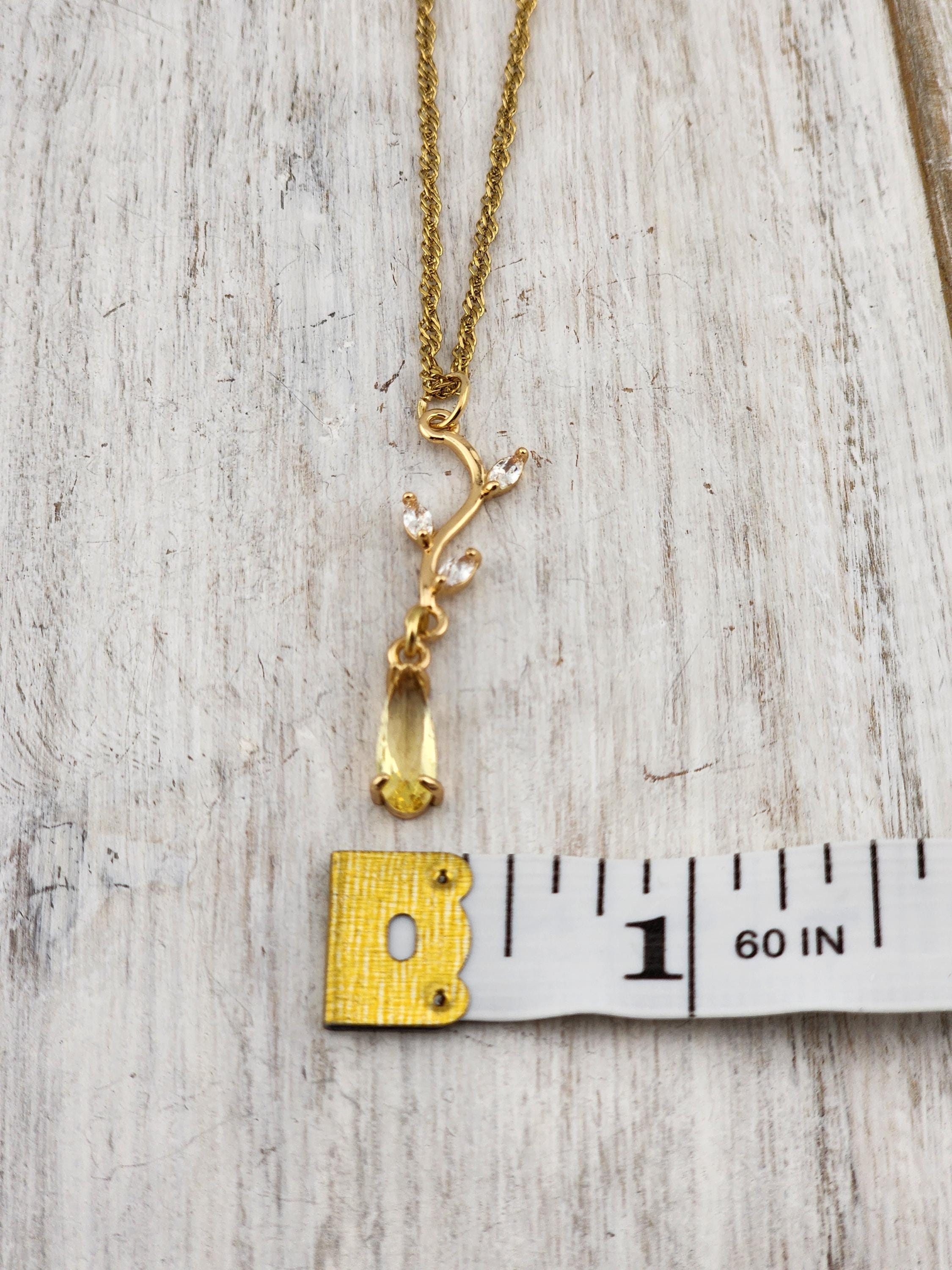 I made this choker using very beautiful vintage twisted Singapore 18k gold plated brass chain that has a 2" extender. It has an 18k gold plated crystal leaf branch connector and a teardrop faceted pale yellow charm. There are 24k gold plated connecting rings.