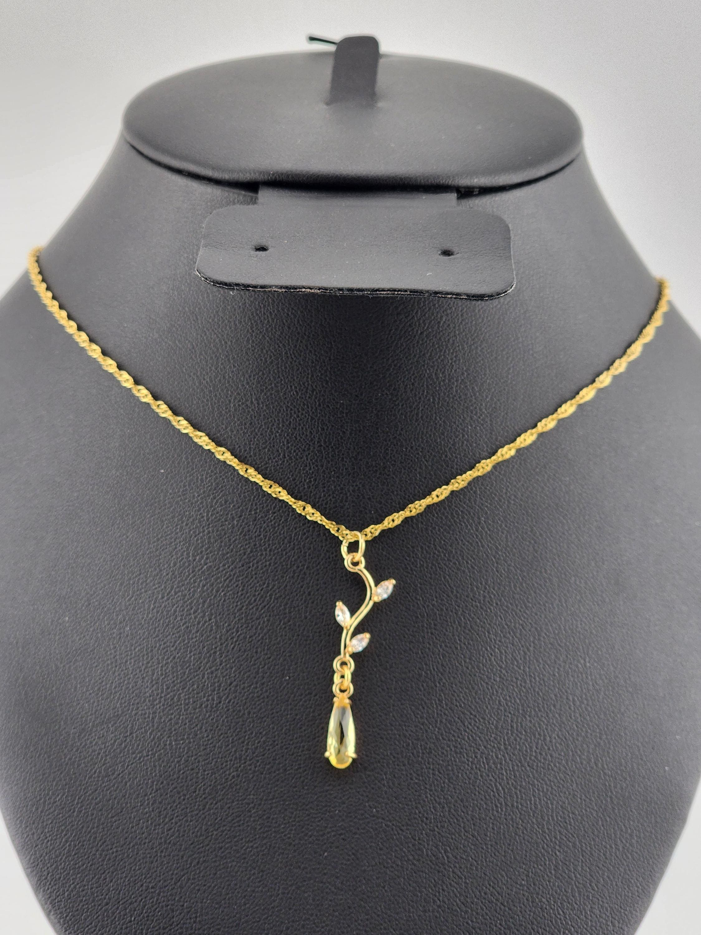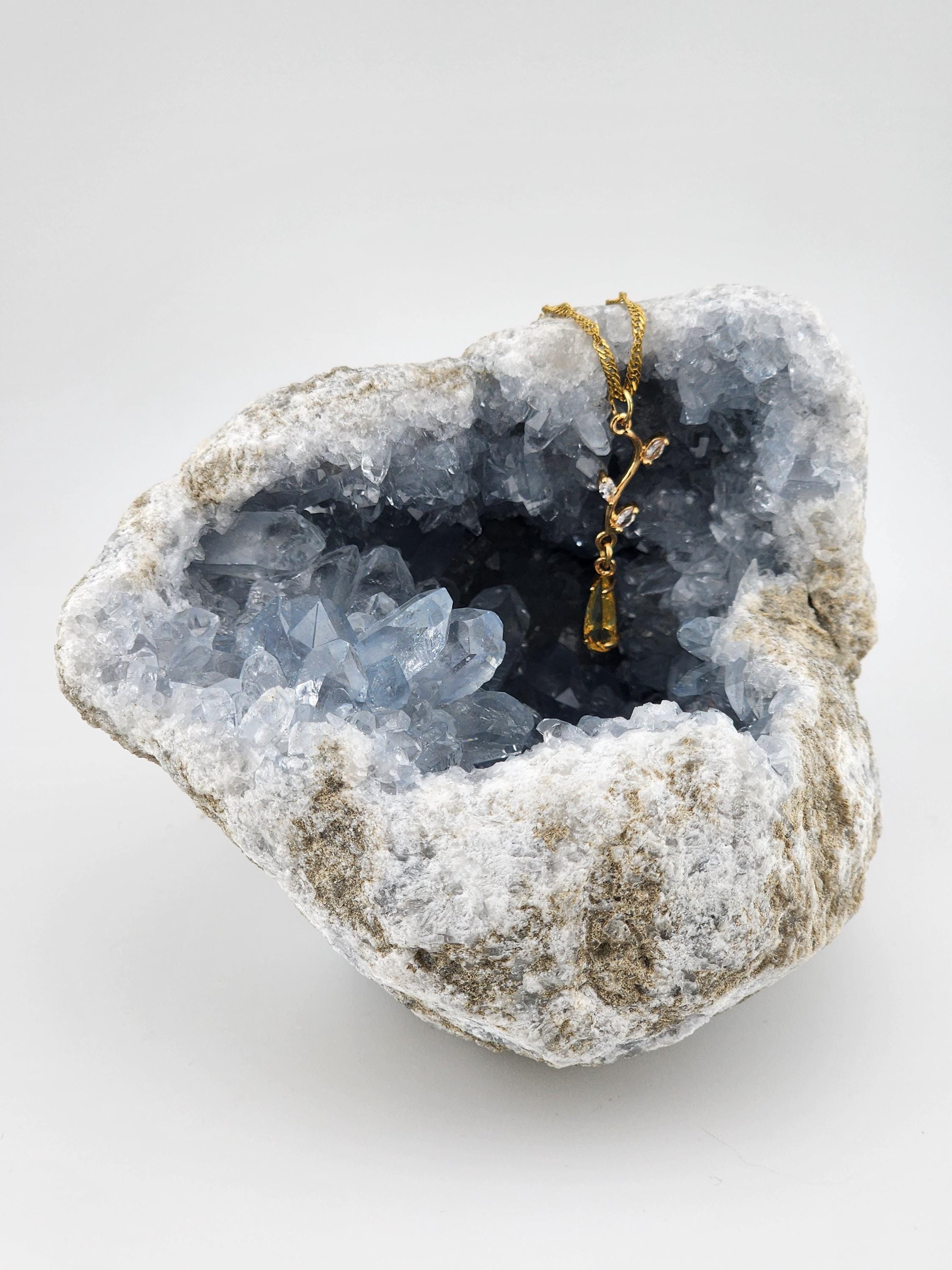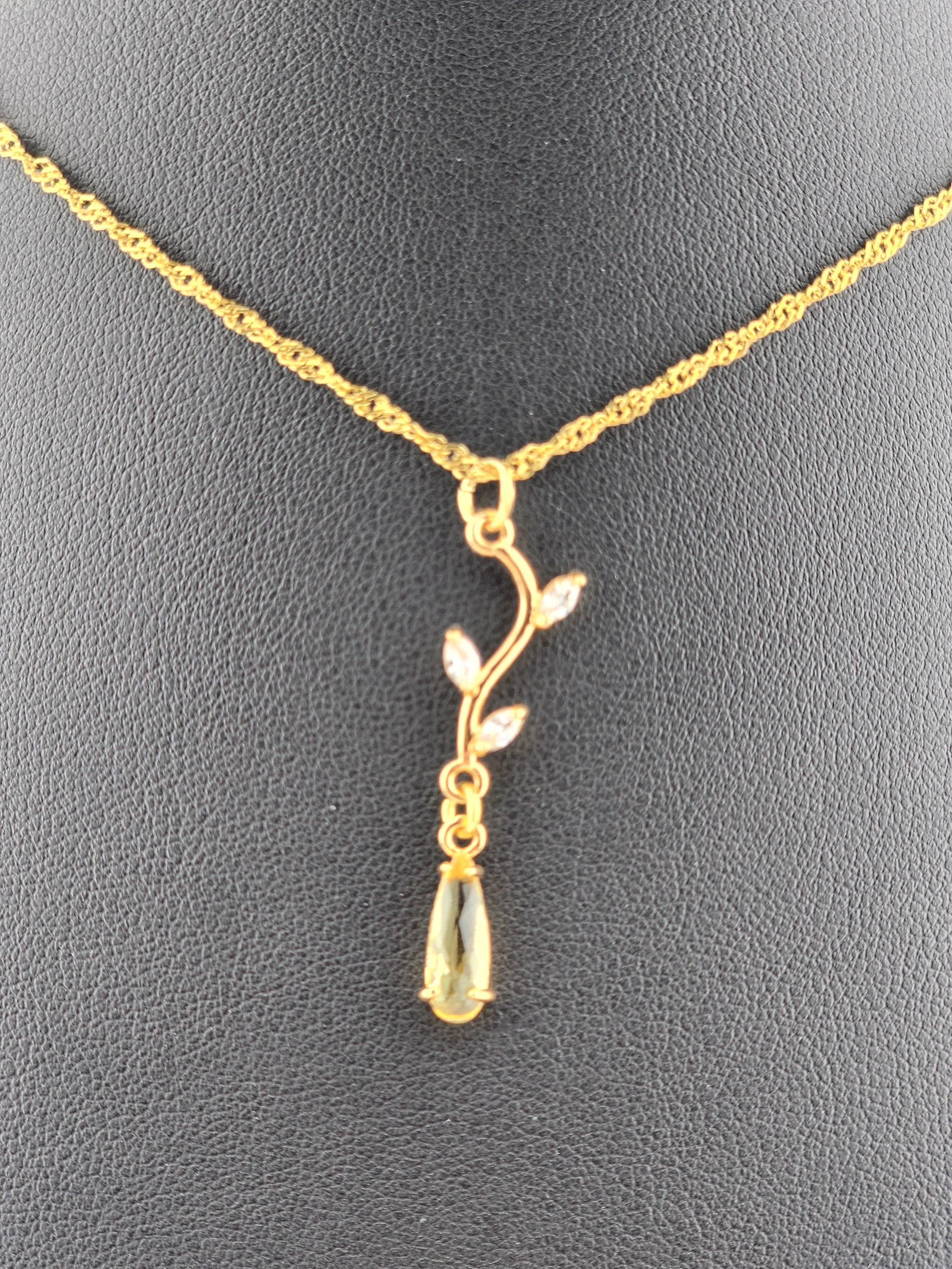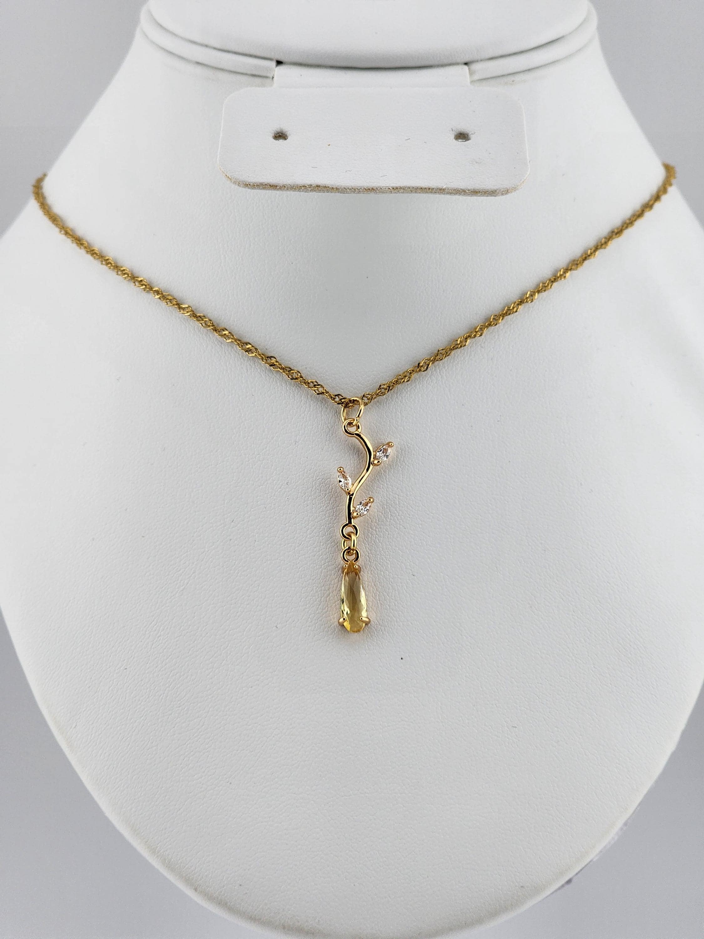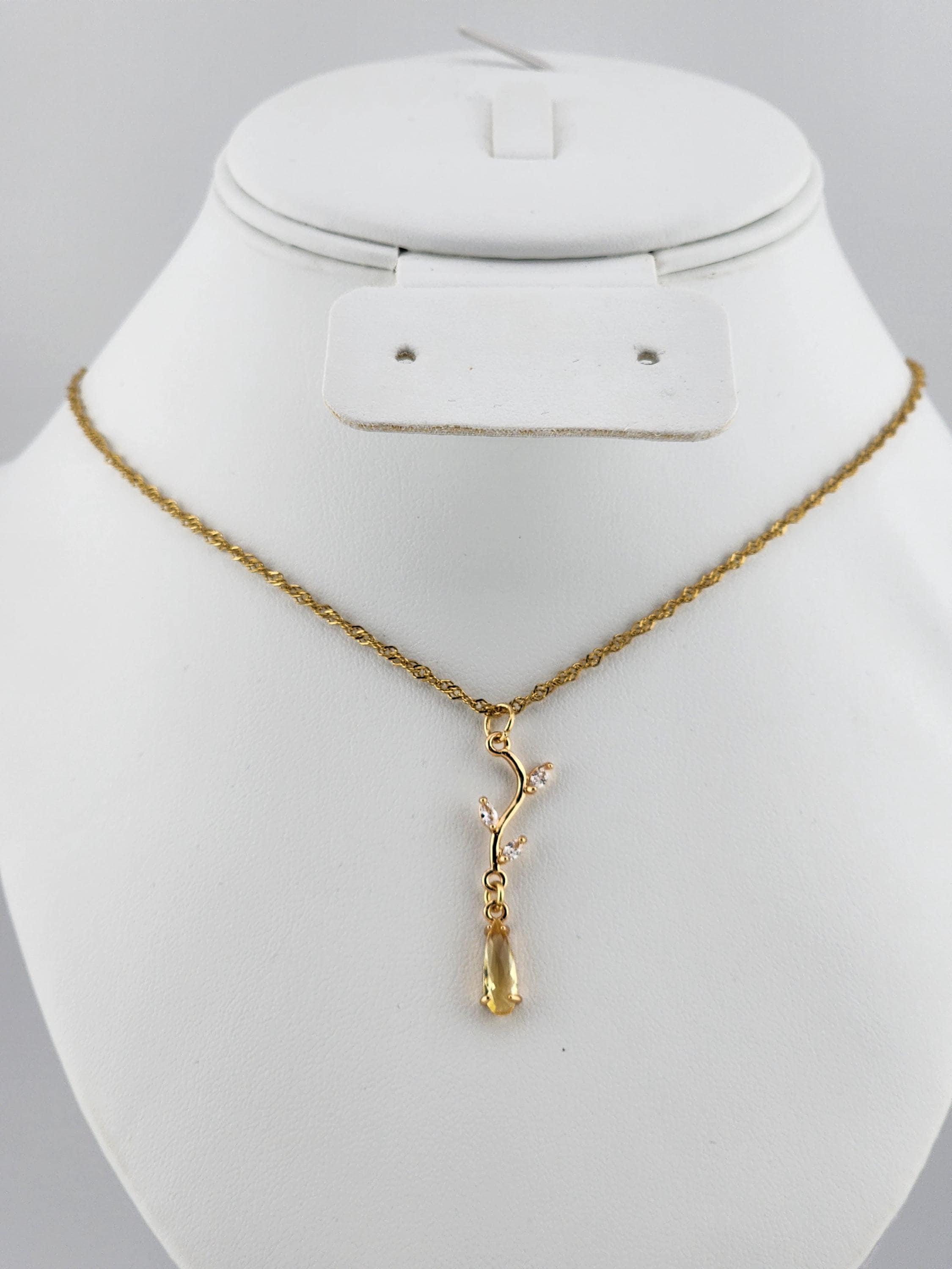 I made this choker using very beautiful vintage twisted Singapore 18k gold plated brass chain that has a 2" extender. It has an 18k gold plated crystal leaf branch connector and a teardrop faceted pale yellow charm. There are 24k gold plated connecting rings.
