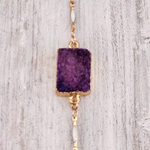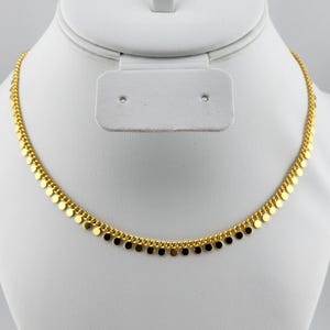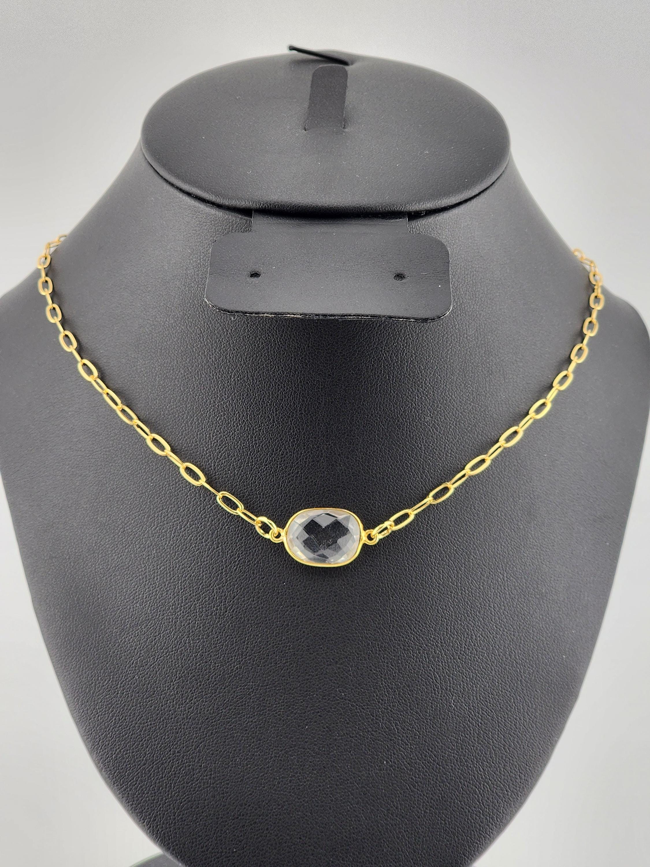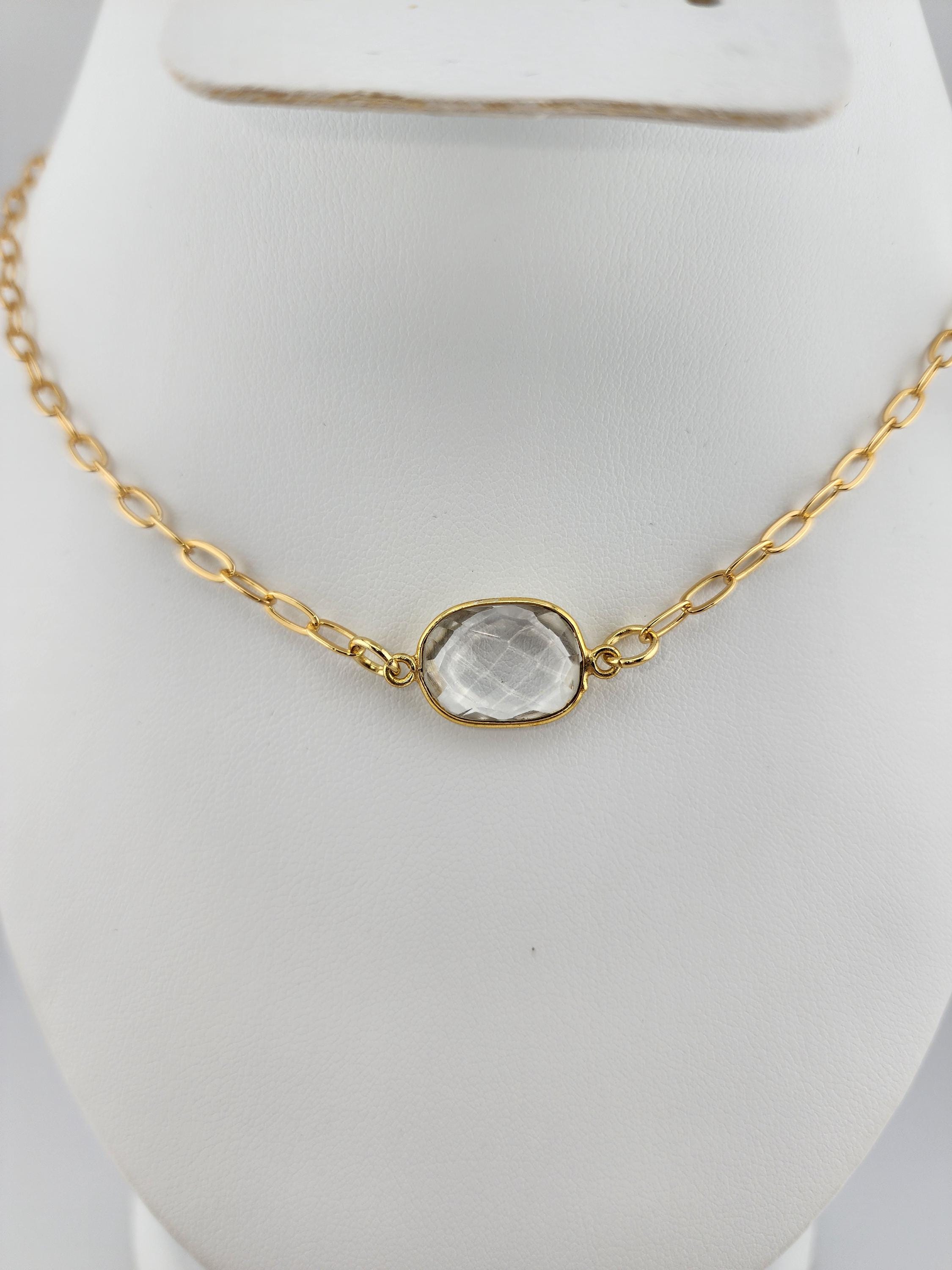 I made this choker necklace using tarnish resistant 18k gold plated curb chain with an extender that makes it adjustable from 16"-18.5" in length. I added an irregular shaped faceted clear crystal connector in gold, handcrafted from India. There is an 18k gold plated clasp and 24k gold plated connecting rings. * Your purchase will arrive in pretty packaging * Stone Name : Clear Quartz * Shape : Assorted Shape * Size : 15-20mm
