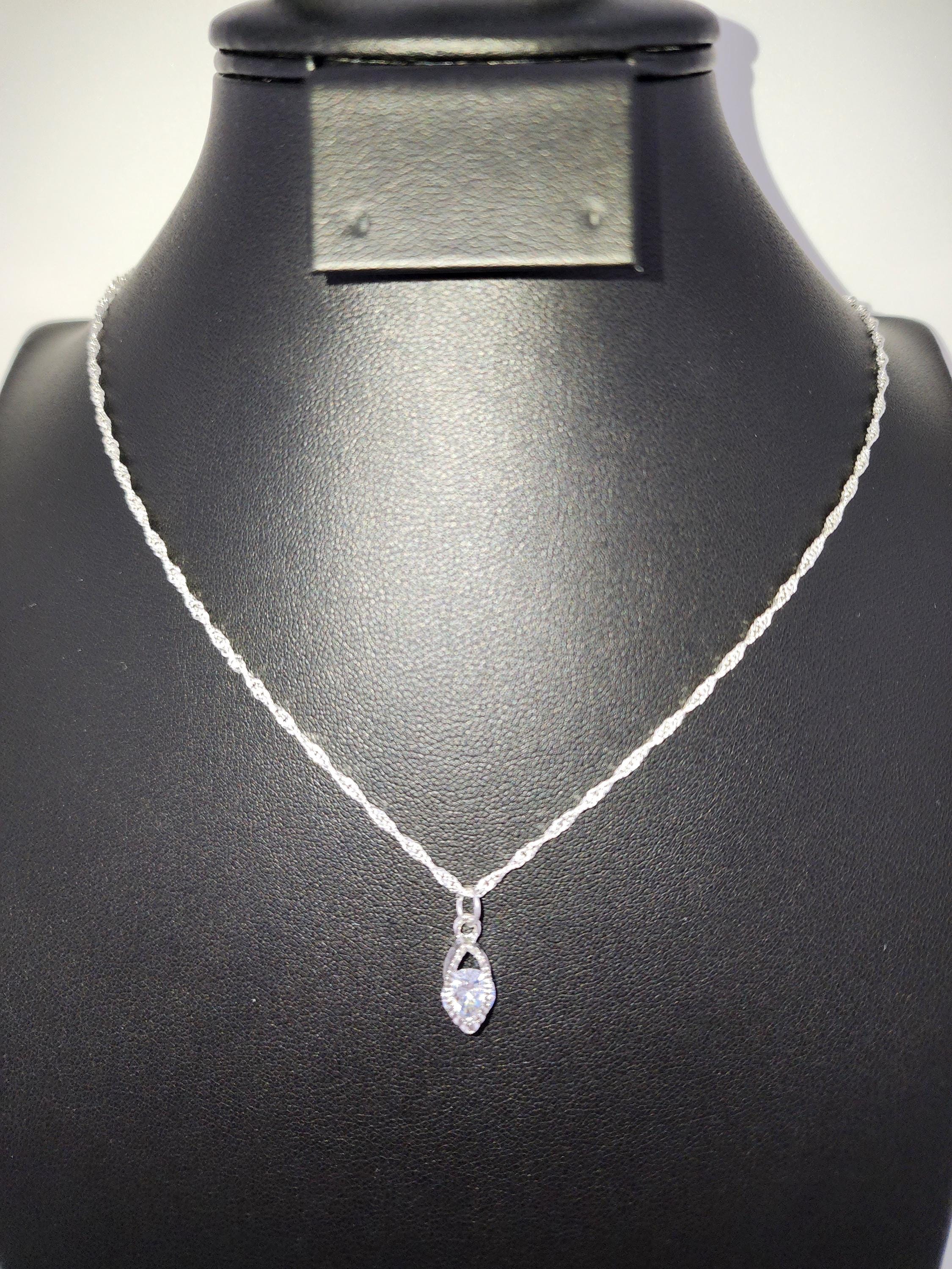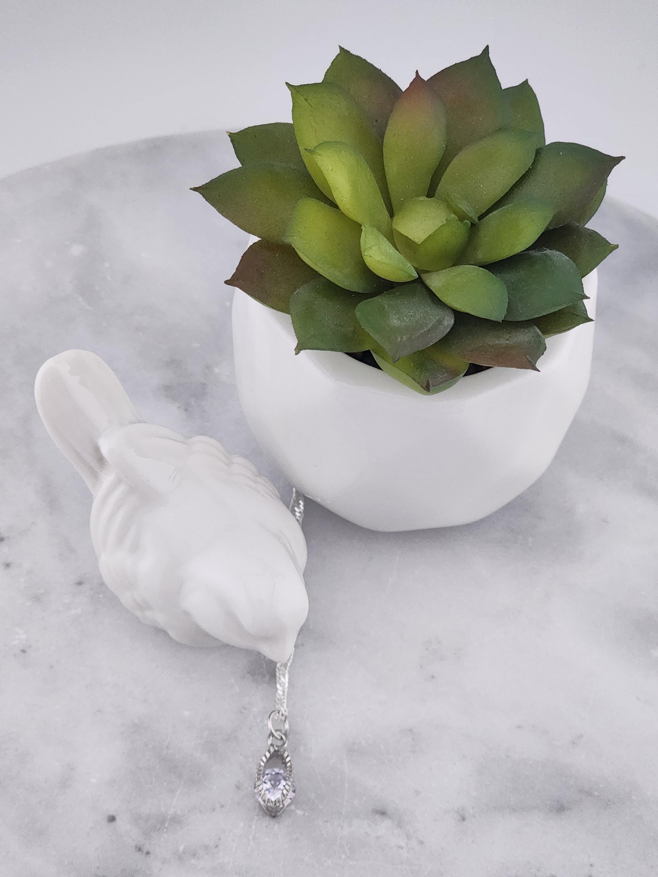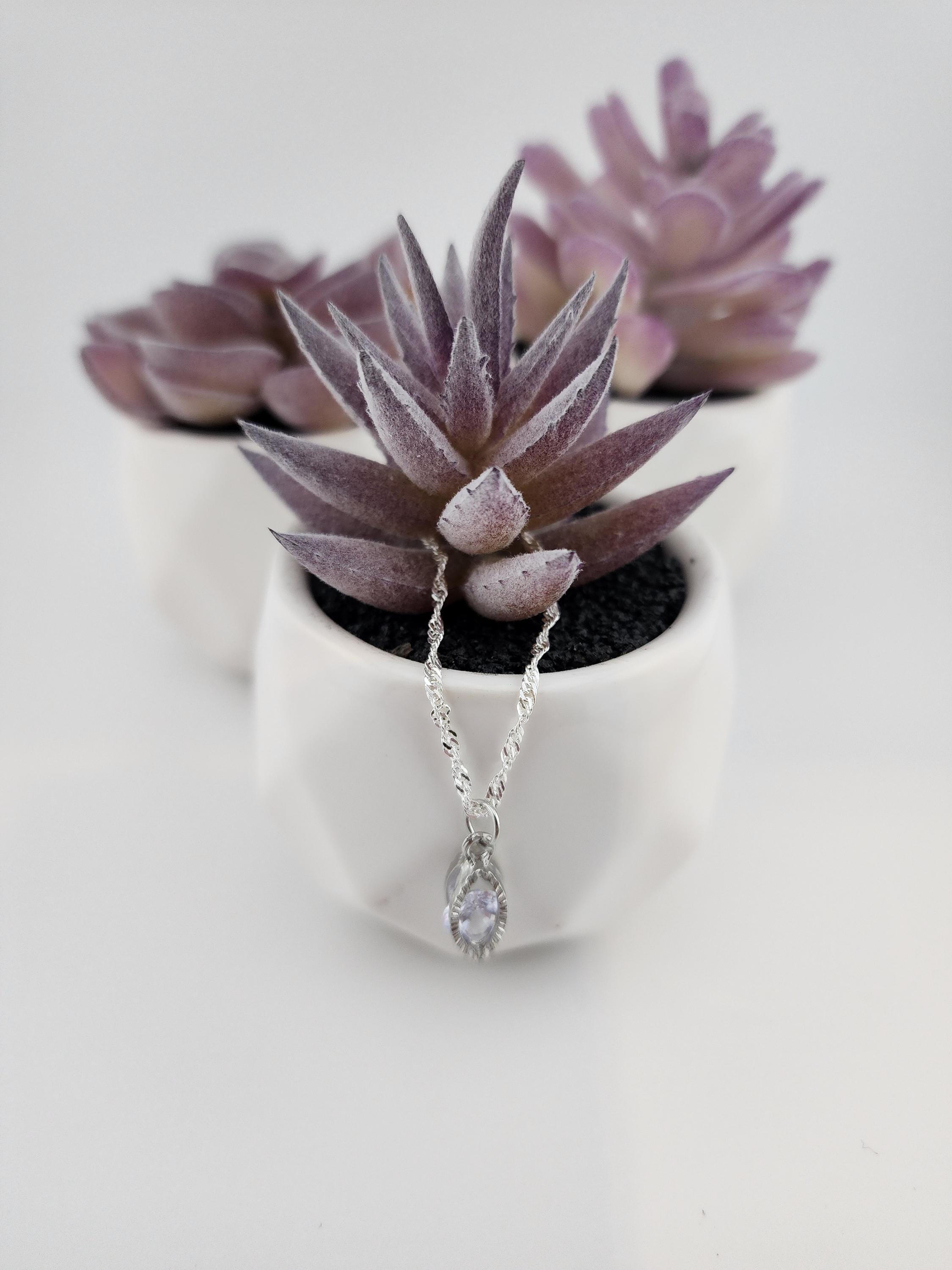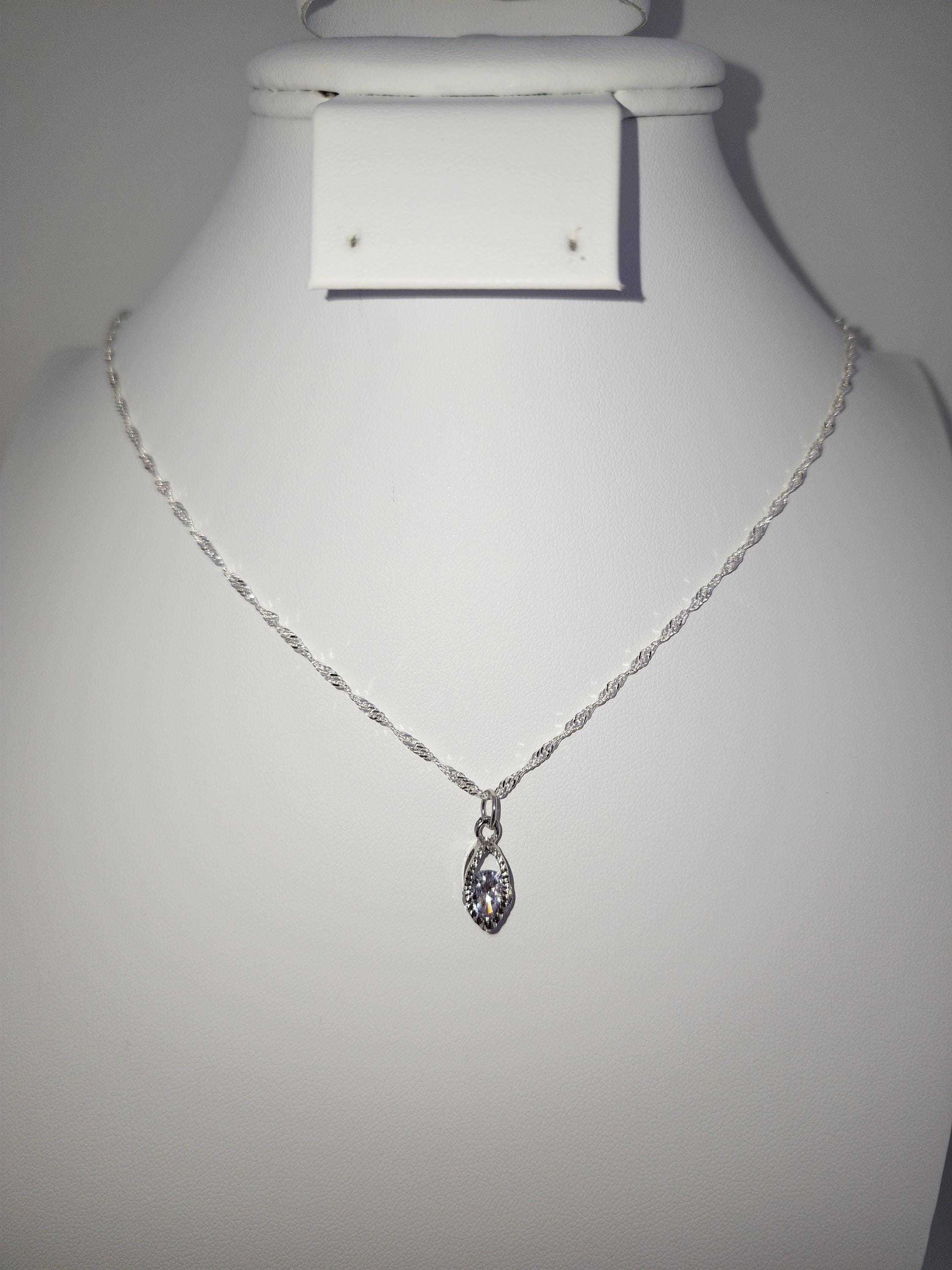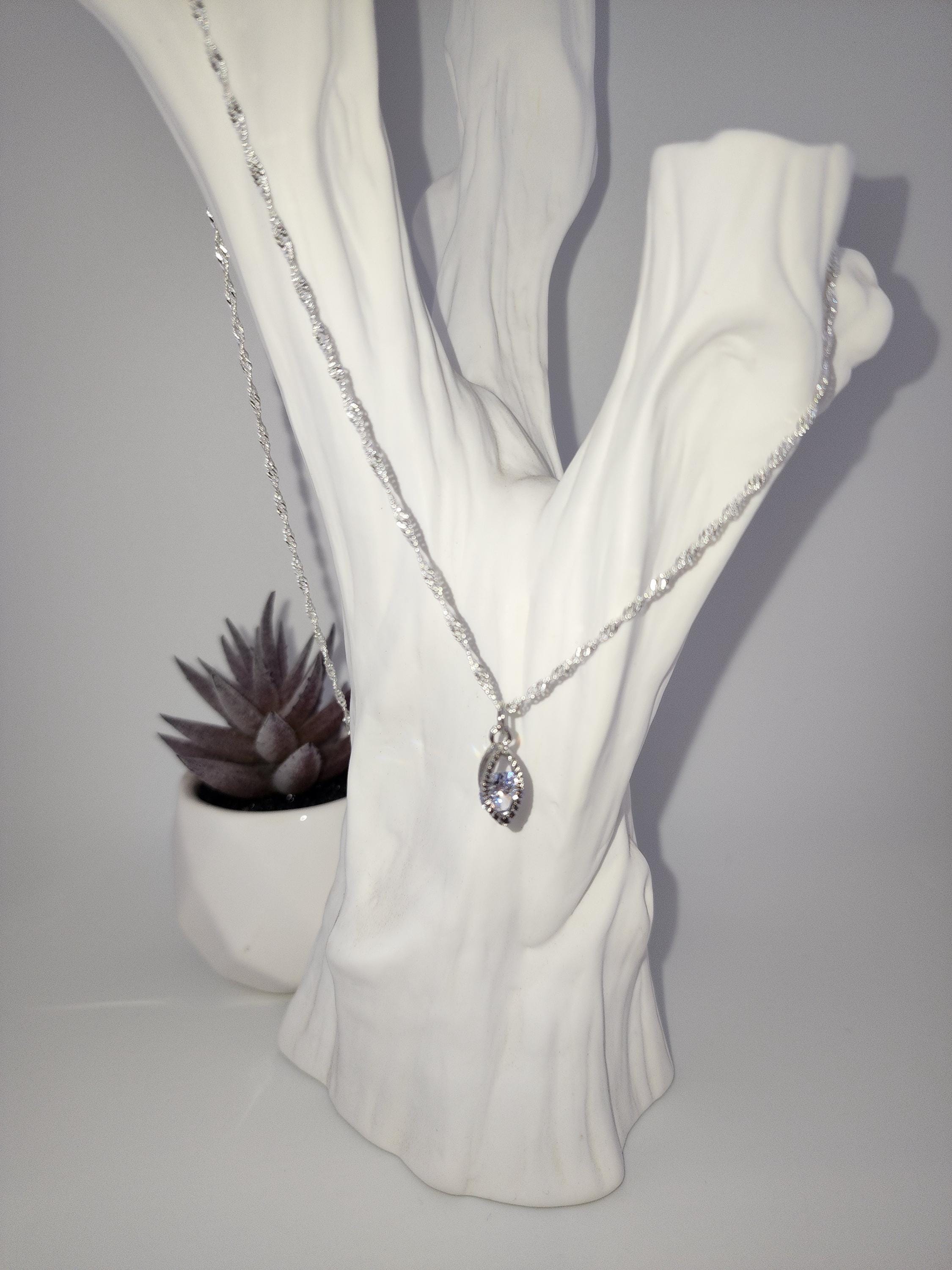 I made this extremely elegant necklace using dainty twisted sterling silver chain. I added a gorgeous silver plated marquise shape cage pendant that has a round cut faceted crystal in its center and hangs from a sterling silver ring. So Pretty! * Your purchase will arrive in pretty packaging * Shipping is included >>>>>>>>>>>>>>>>>>>>>>>>>>>>>>>>>>>>>>>>>>>>>>>>>>>>>>>>>>>>>>>>>>>>>>>>>>>>>>>>>>>>>> HEALTH AND WELLNESS BENEFITS: * Hypoallergenic: Sterling silver is less likely to cause allergic reactions, making it a safe choice for people with sensitive skin. * Antimicrobial properties: Silver has natural antibacterial and antifungal qualities that can help protect against harmful microorganisms. * Temperature regulation: Silver is highly thermally conductive, which may help balance body temperature and provide a cooling sensation in hot weather. * Immune support: Some sources suggest that wearing silver can help boost the immune system and circulation. * Stress reduction: Wearing silver is believed to have a calming effect, helping to reduce stress, anxiety, and improve mood. OR, SO THEY SAY... >>>>>>>>>>>>>>>>>>>>>>>>>>>>>>>>>>>>>>>>>>>>>>>>>>>>>>>>>>>>>>>>>>>>>>>>>>>>>>>>>>>>>> PRACTICAL AND AESTHETIC BENEFITS: * Durability: The addition of other metals like copper makes sterling silver more durable and resistant to scratching and wear than pure silver. * Affordability: It is a more affordable precious metal compared to gold or platinum, offering a luxurious feel at a lower price point. * Versatility: Sterling Silvers' timeless, striking color is flattering on most skin tones and complements a wide variety of styles and outfits. * Easy to maintain: It is relatively low-maintenance and can be cleaned and polished to restore its shine.
