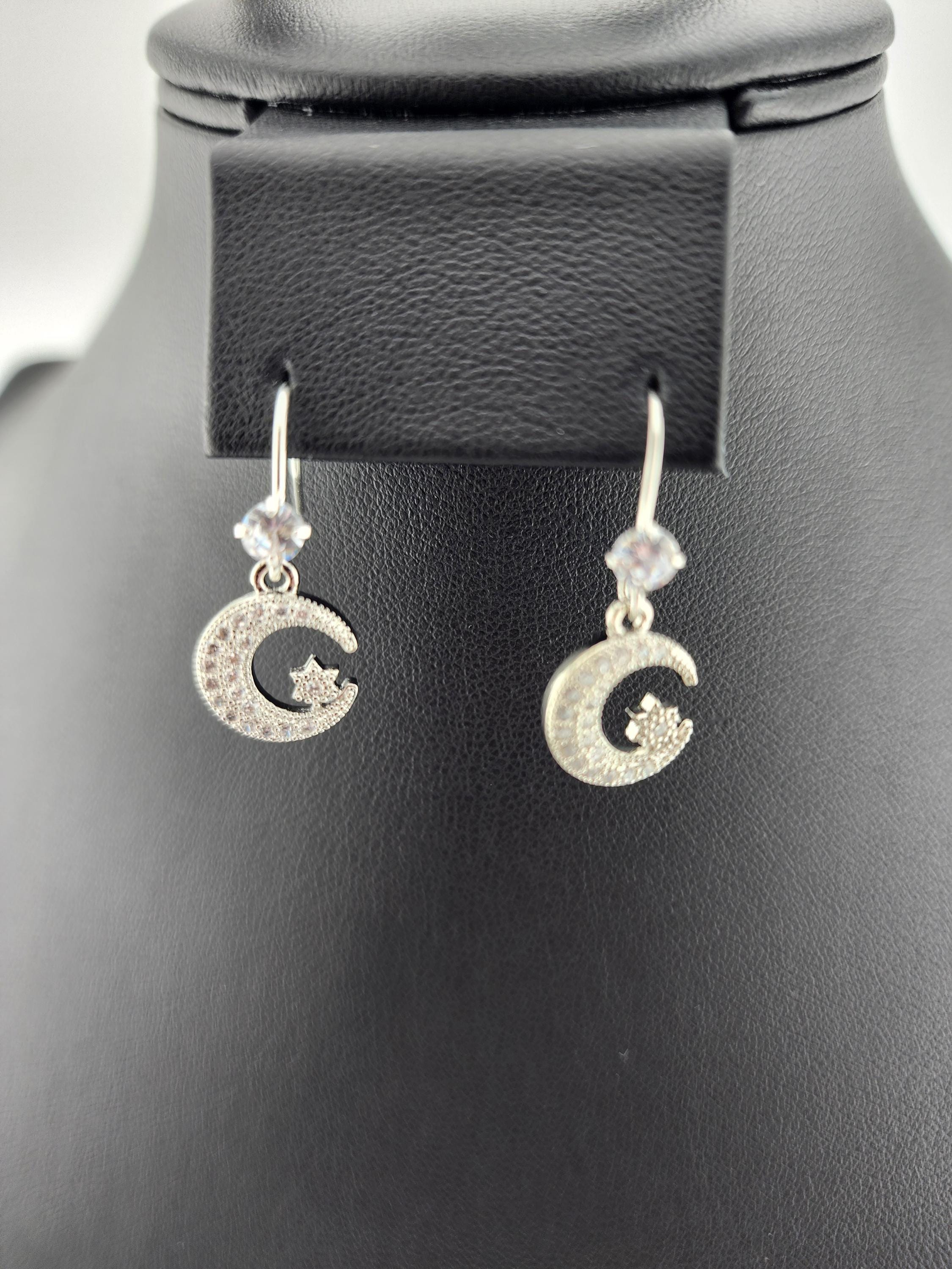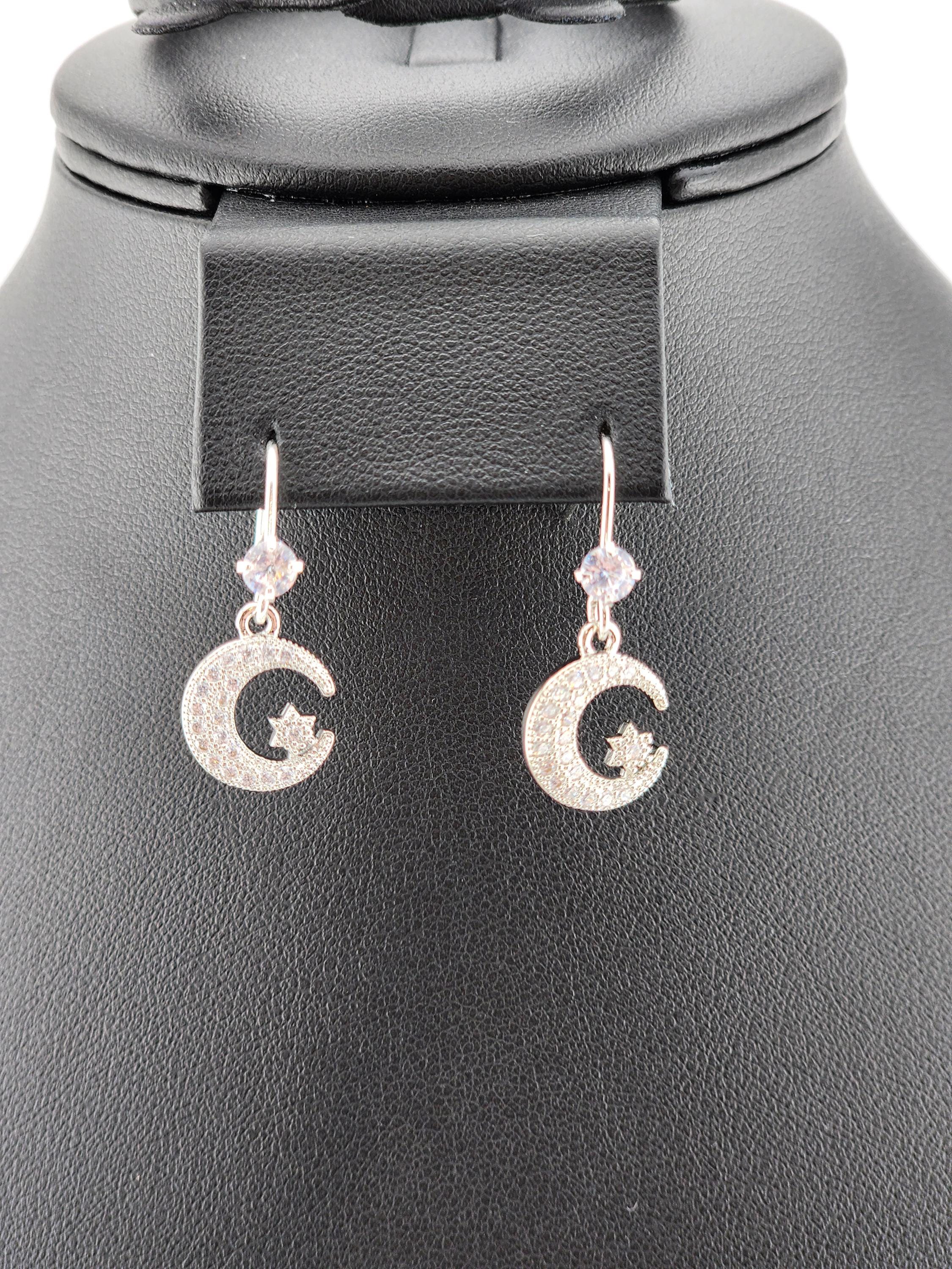 These are silver brass and cubic zirconia crystal dangle earrings with platinum brass Pave' crystal Crescent Moon and Star charms. * Your purchase will arrive in pretty packaging * Shipping is free within the U.S. * Priority shipping is available upon request