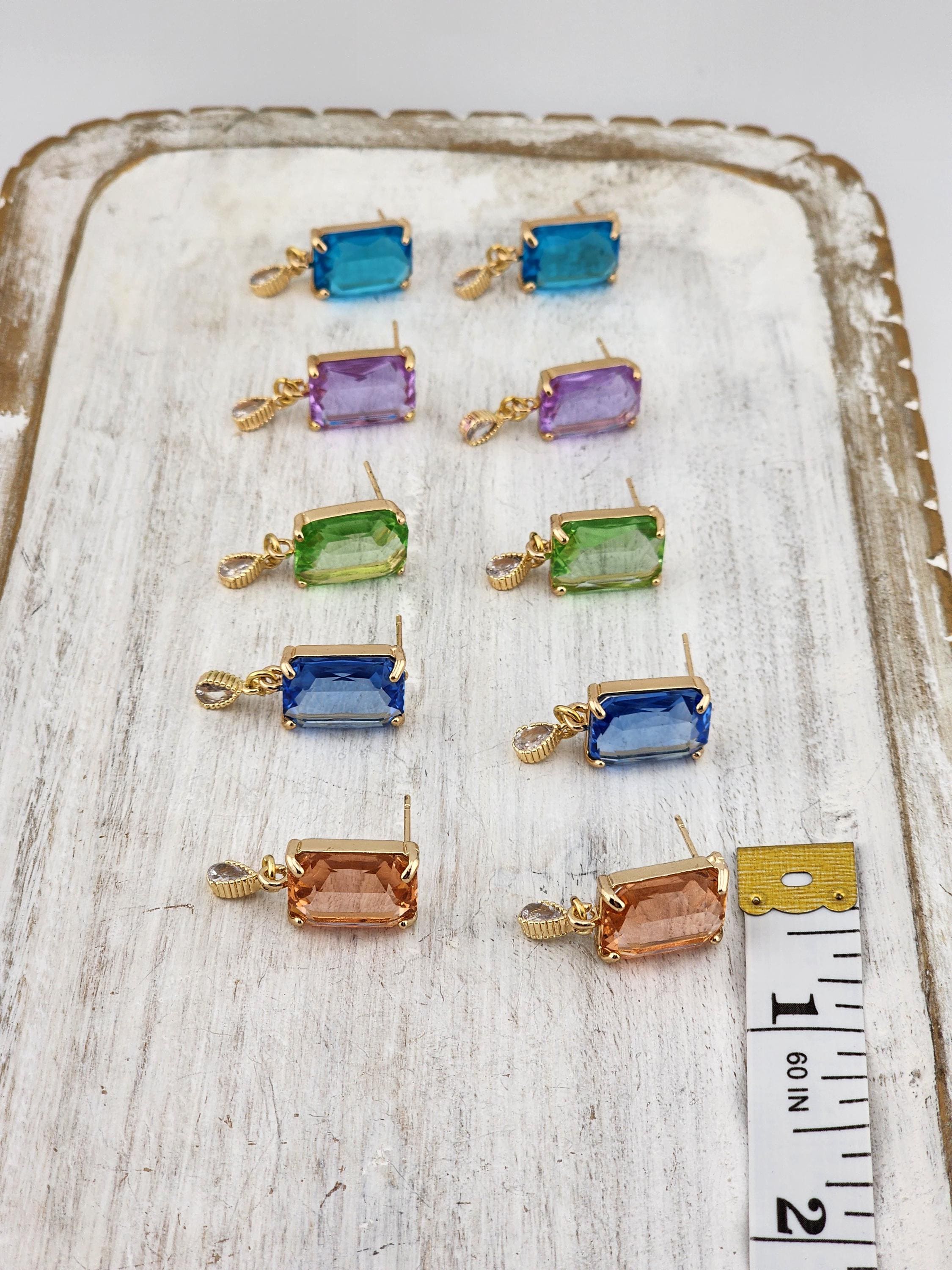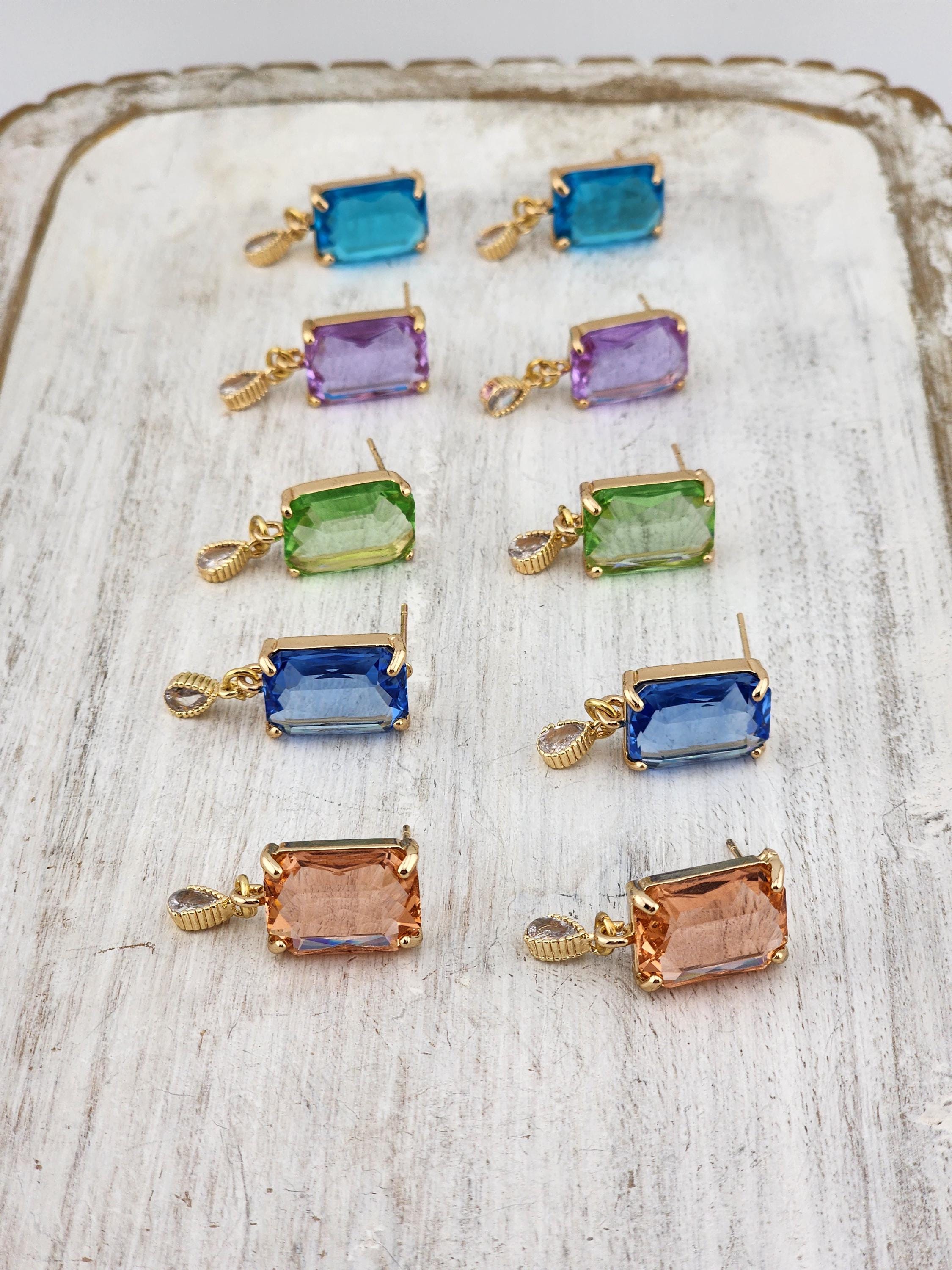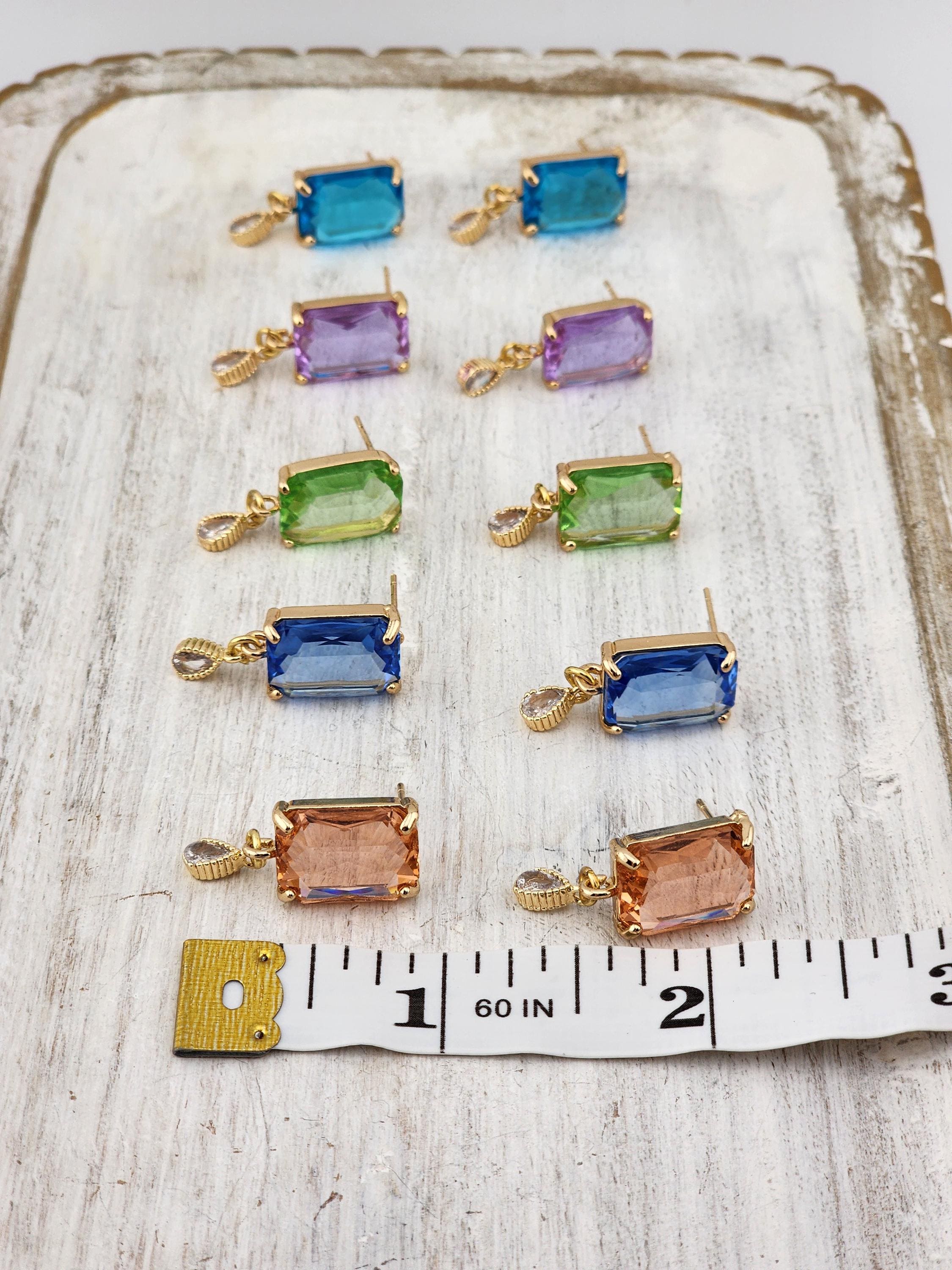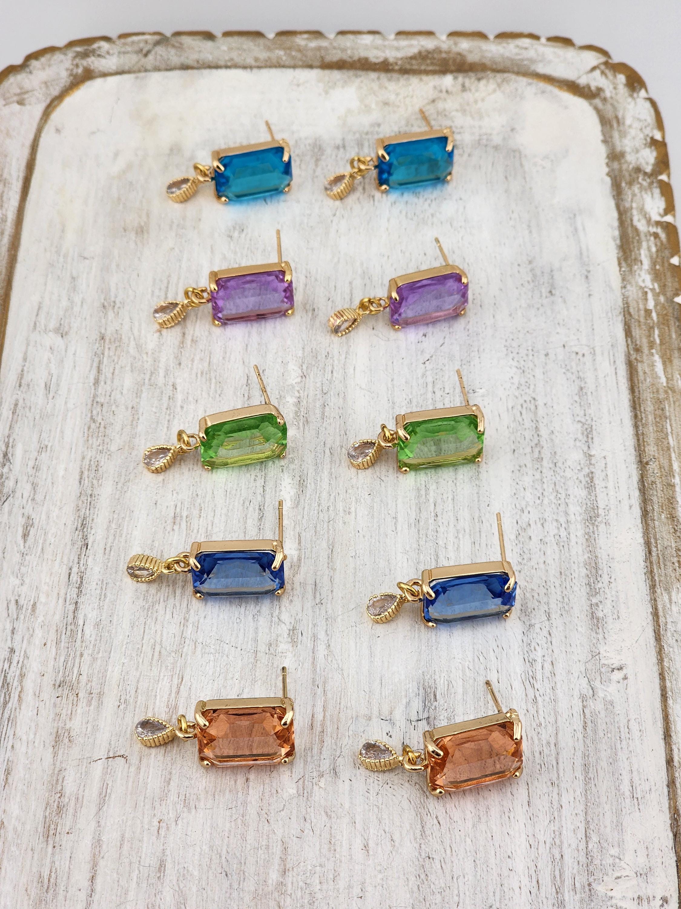 These are faceted rectangular shape 18k gold plated brass and colored crystal earrings that have tiny gold and cubic zirconia crystal teardrop shape charms. You have five options to choose from: #1- Peach #2- Blue #3- Green #4- Purple #5- Aqua * Your purchase will arrive in pretty packaging * Shipping is free within the U.S. * Priority shipping available upon request