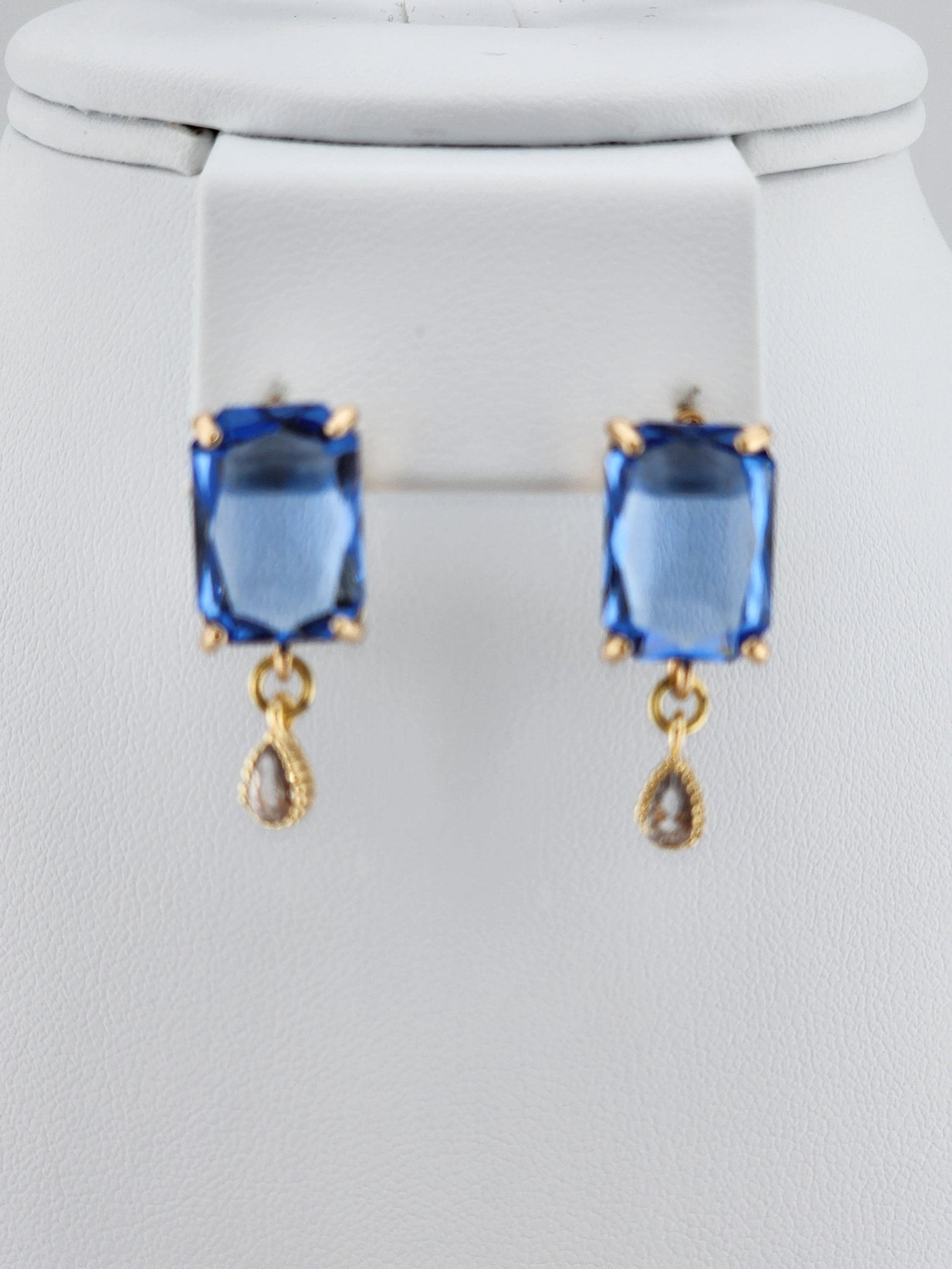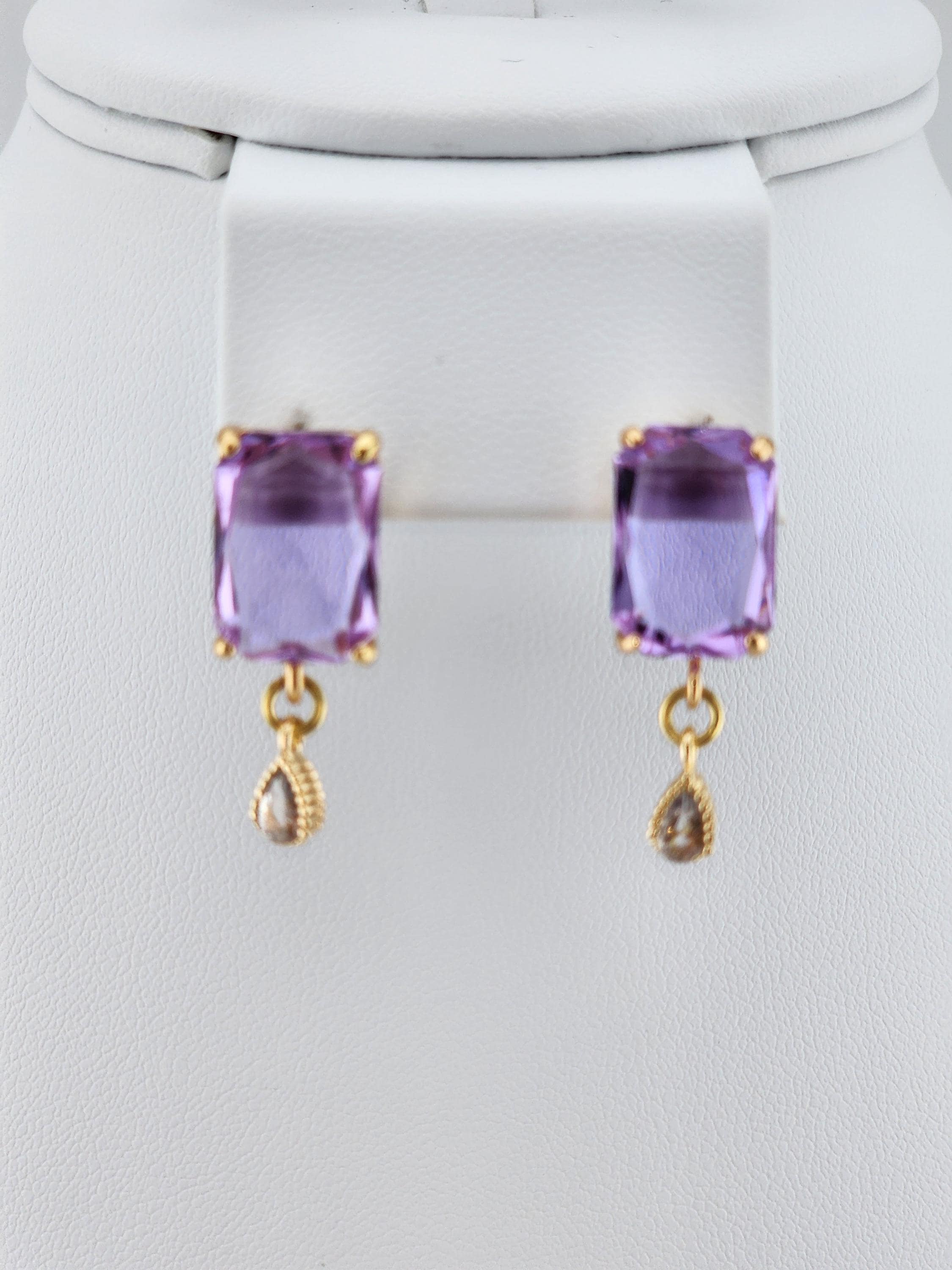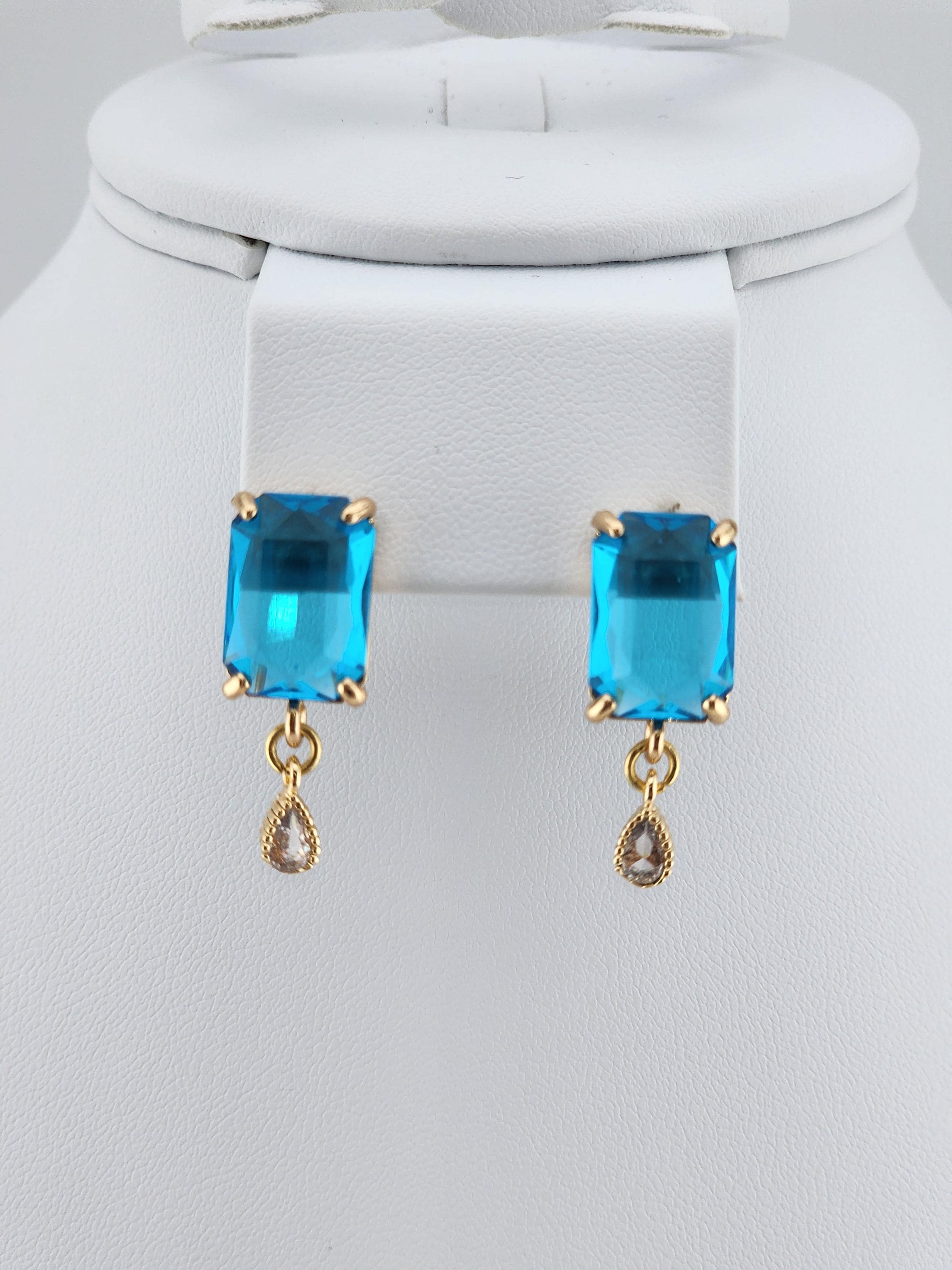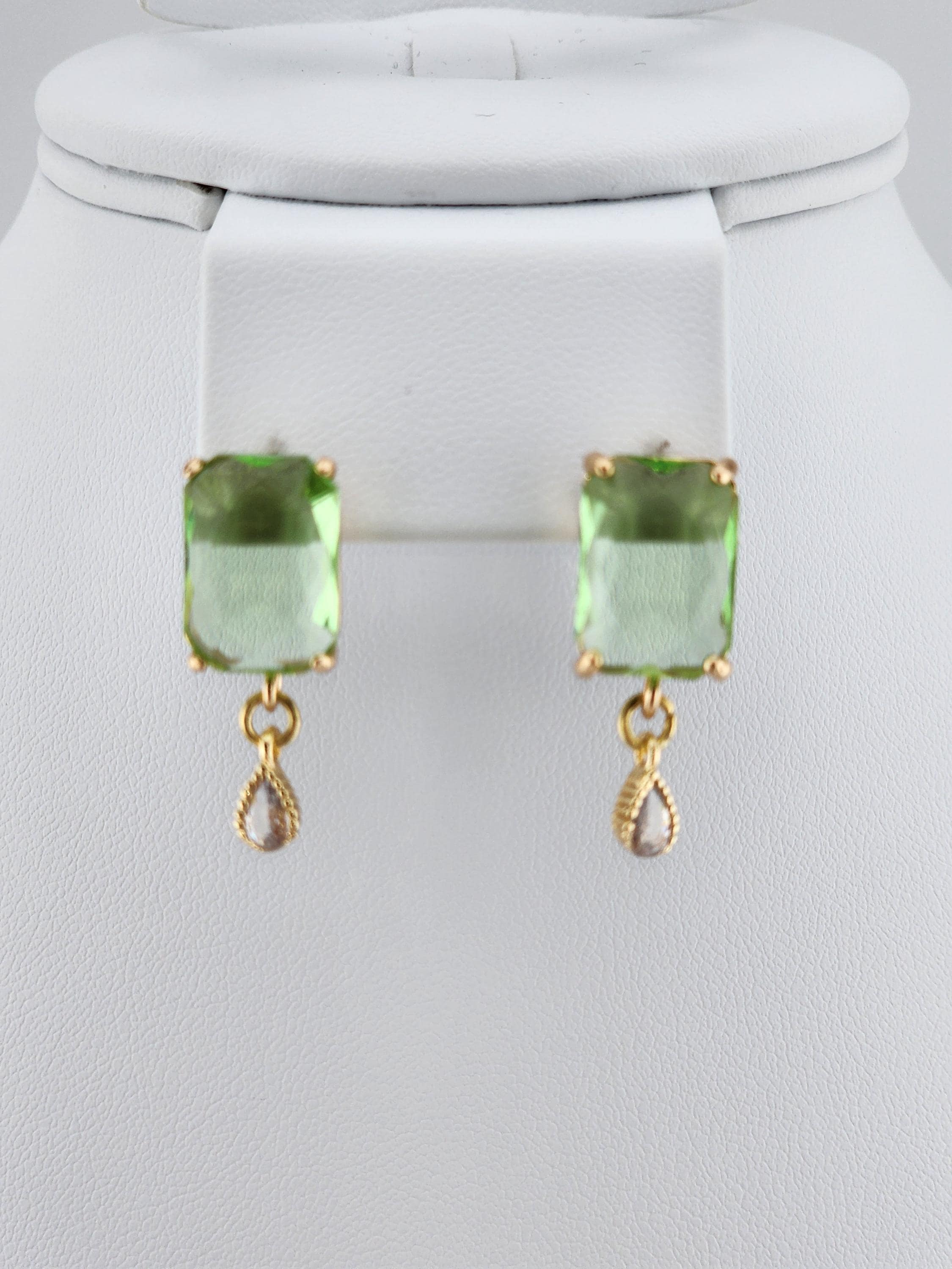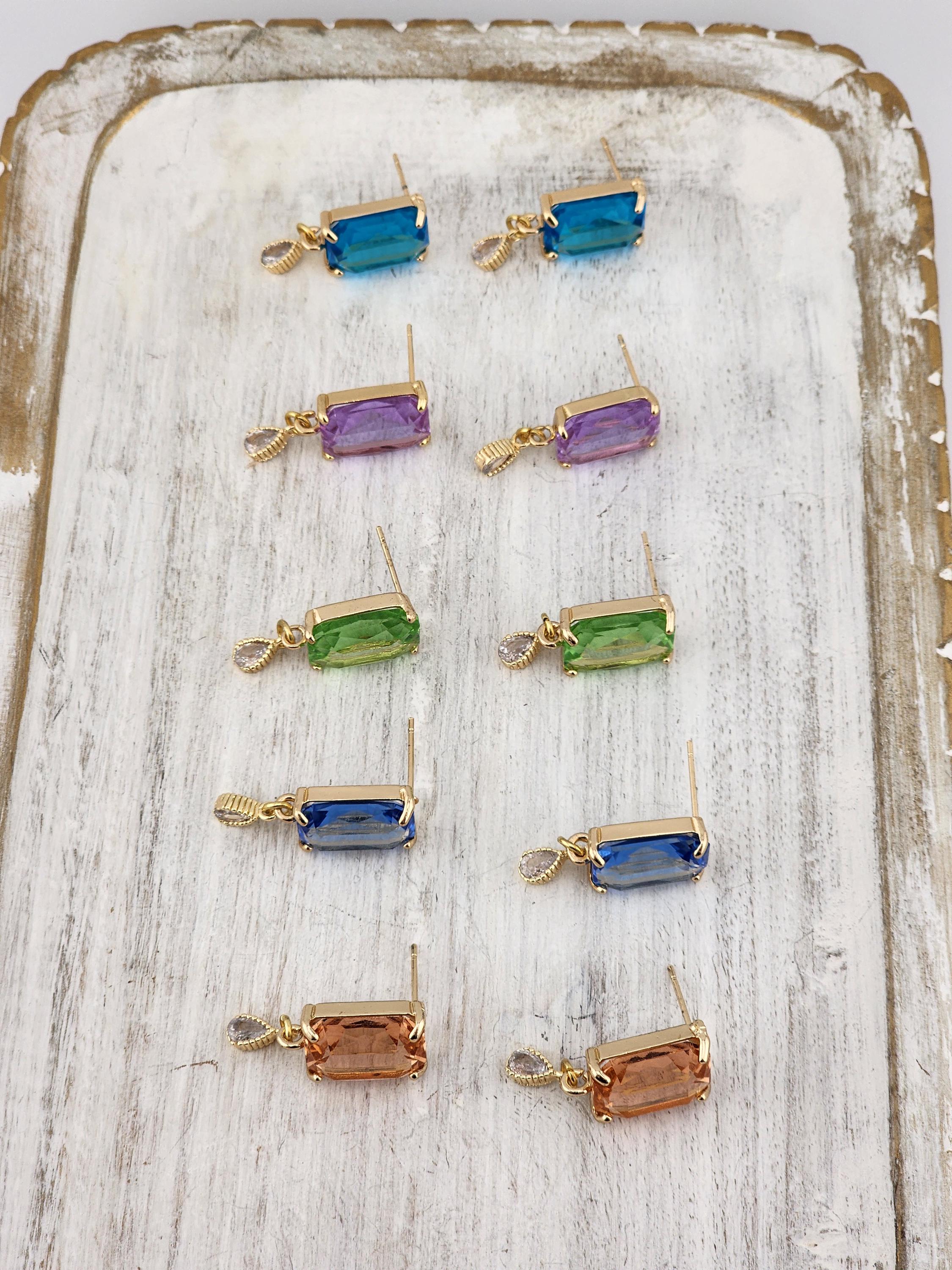 These are faceted rectangular shape 18k gold plated brass and colored crystal earrings that have tiny gold and cubic zirconia crystal teardrop shape charms. You have five options to choose from: #1- Peach #2- Blue #3- Green #4- Purple #5- Aqua * Your purchase will arrive in pretty packaging * Shipping is free within the U.S. * Priority shipping available upon request