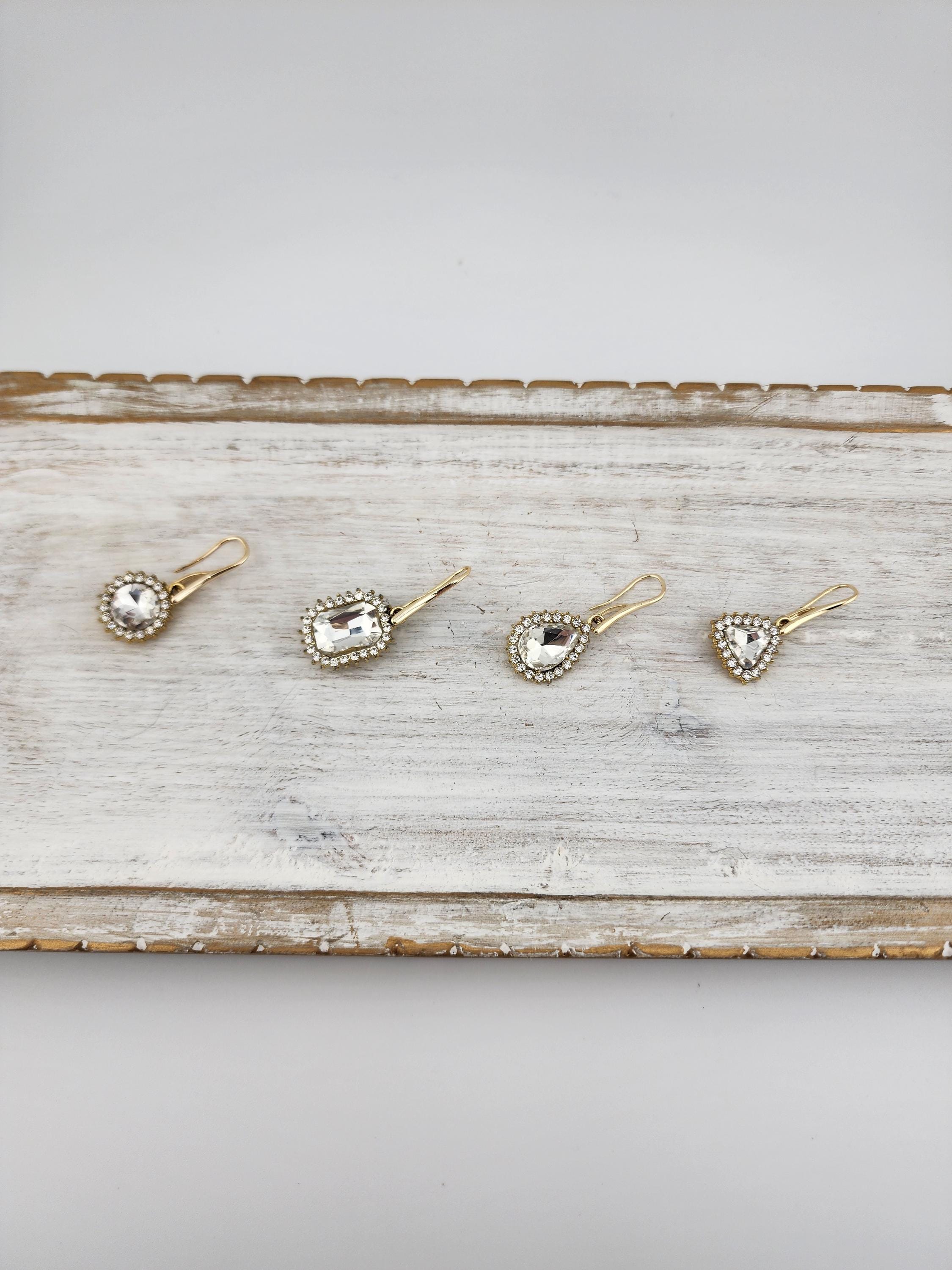 These are very fancy earrings! I made them using 18k gold plated leverback earrings and added clear sparkly cubic zirconia stones in gold and surrounded by more cubic zirconia stones. You have your choice of: #1- Round #2- Rectangle #3- Teardrop #4- Triangle * Your purchase will arrive in pretty packaging * Shipping is included