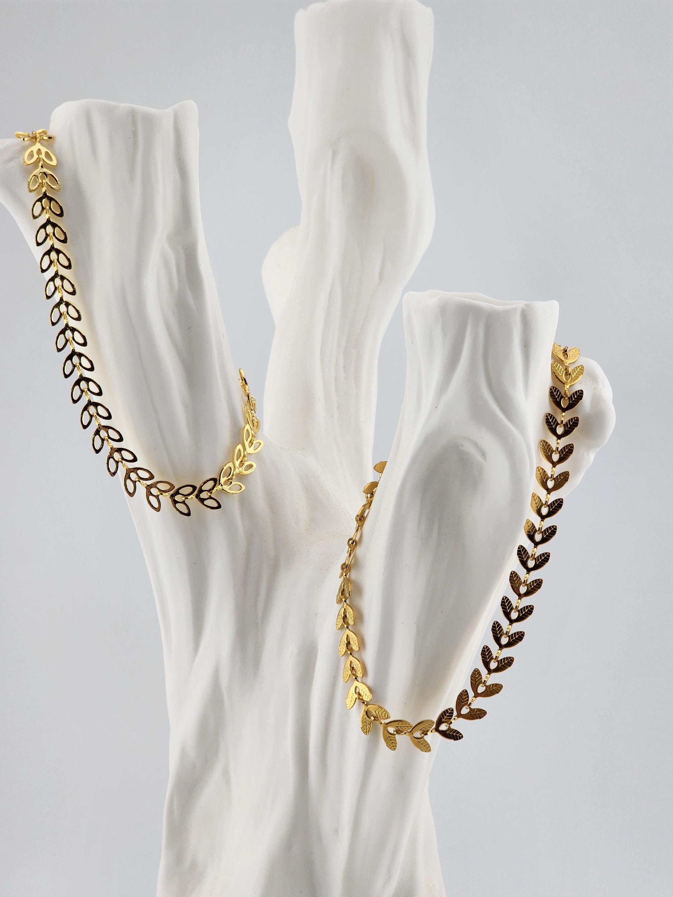 I made two different types of tarnish resistant 18k gold plated brass LEAF chain bracelets with 16k gold plated clasps and 24k gold plated connecting rings. Your choices of chain are: #1- Hollow Leaf #2- Solid Leaf * Your purchase will arrive in pretty packaging * Shipping is included