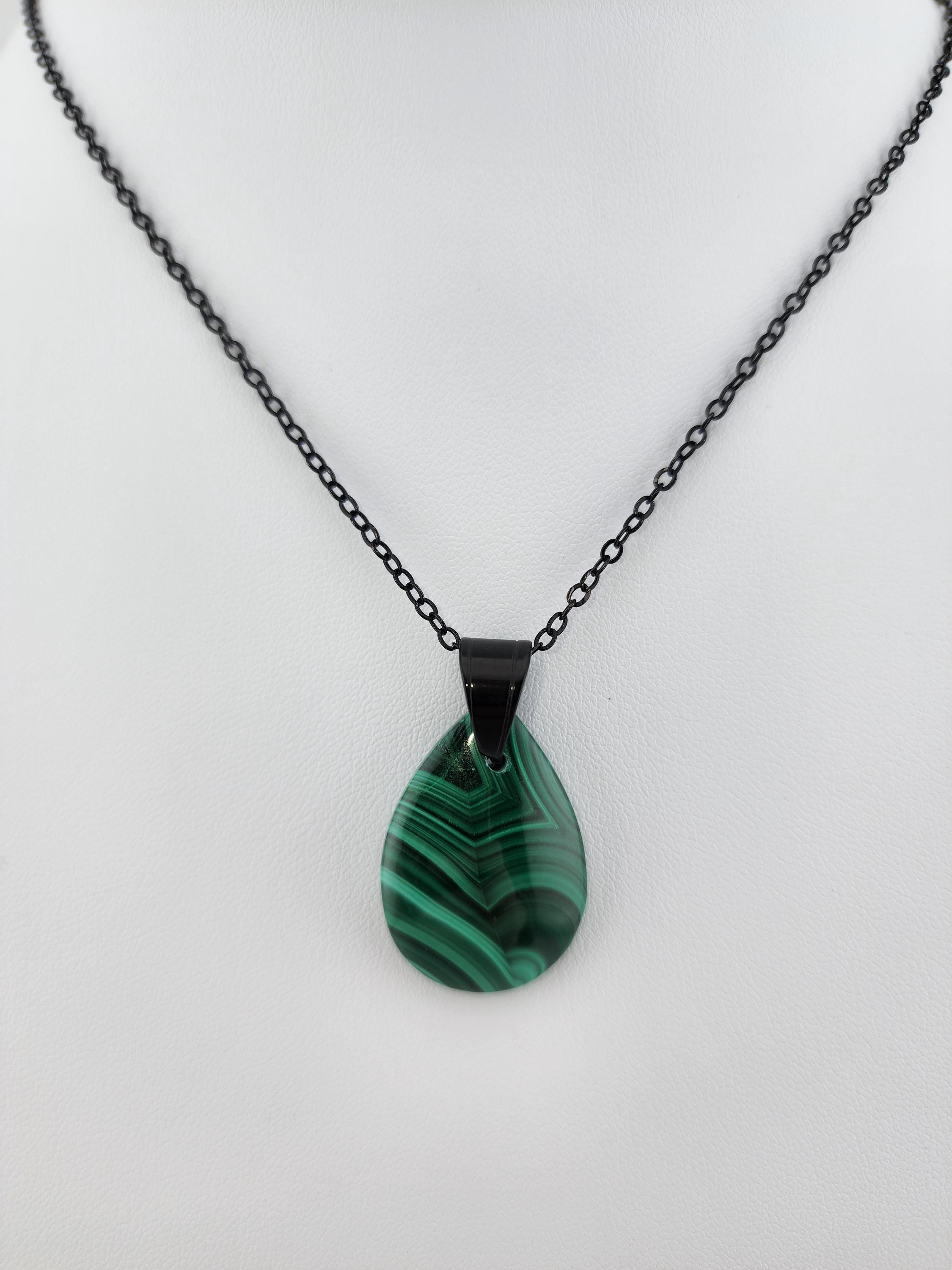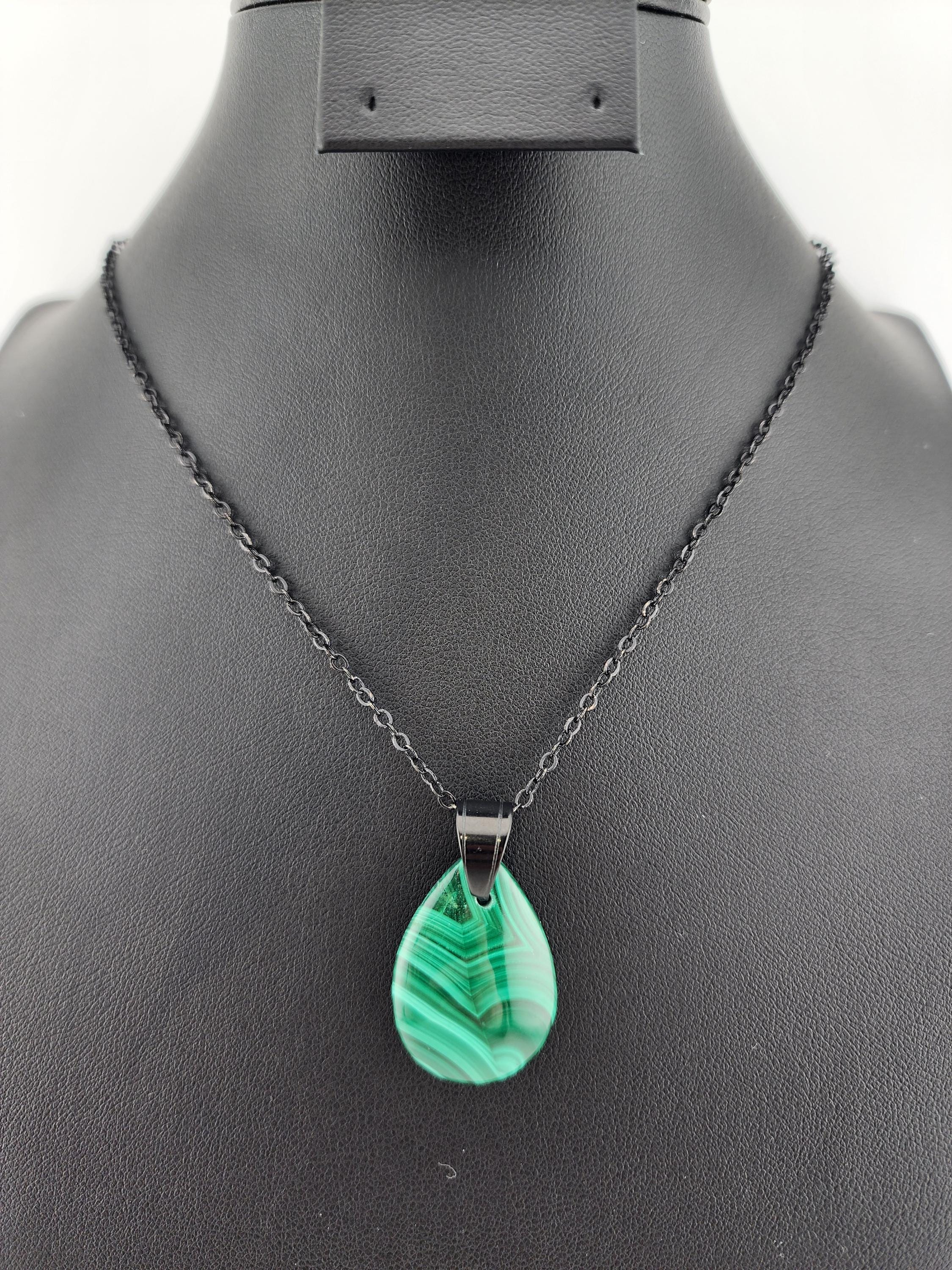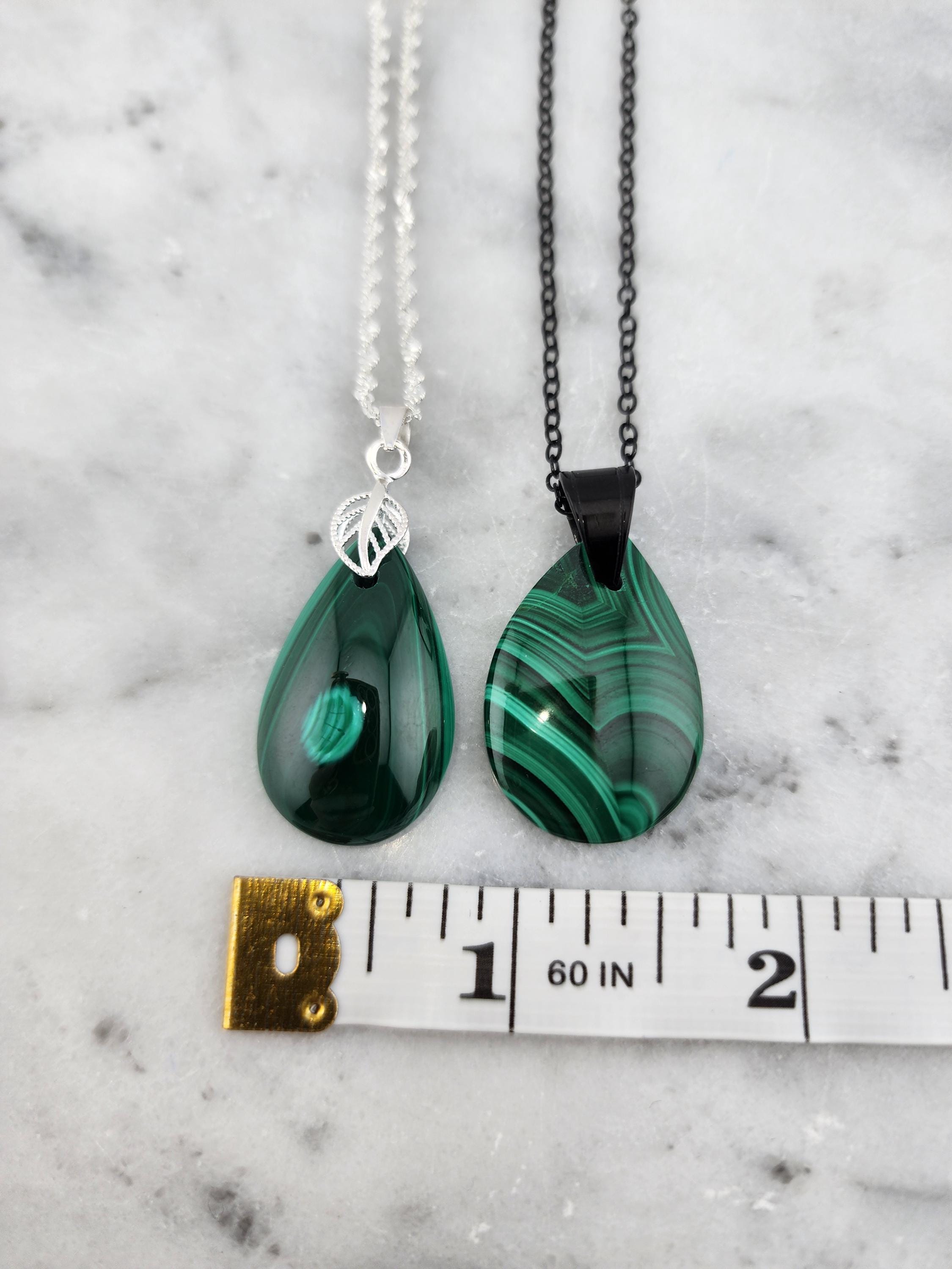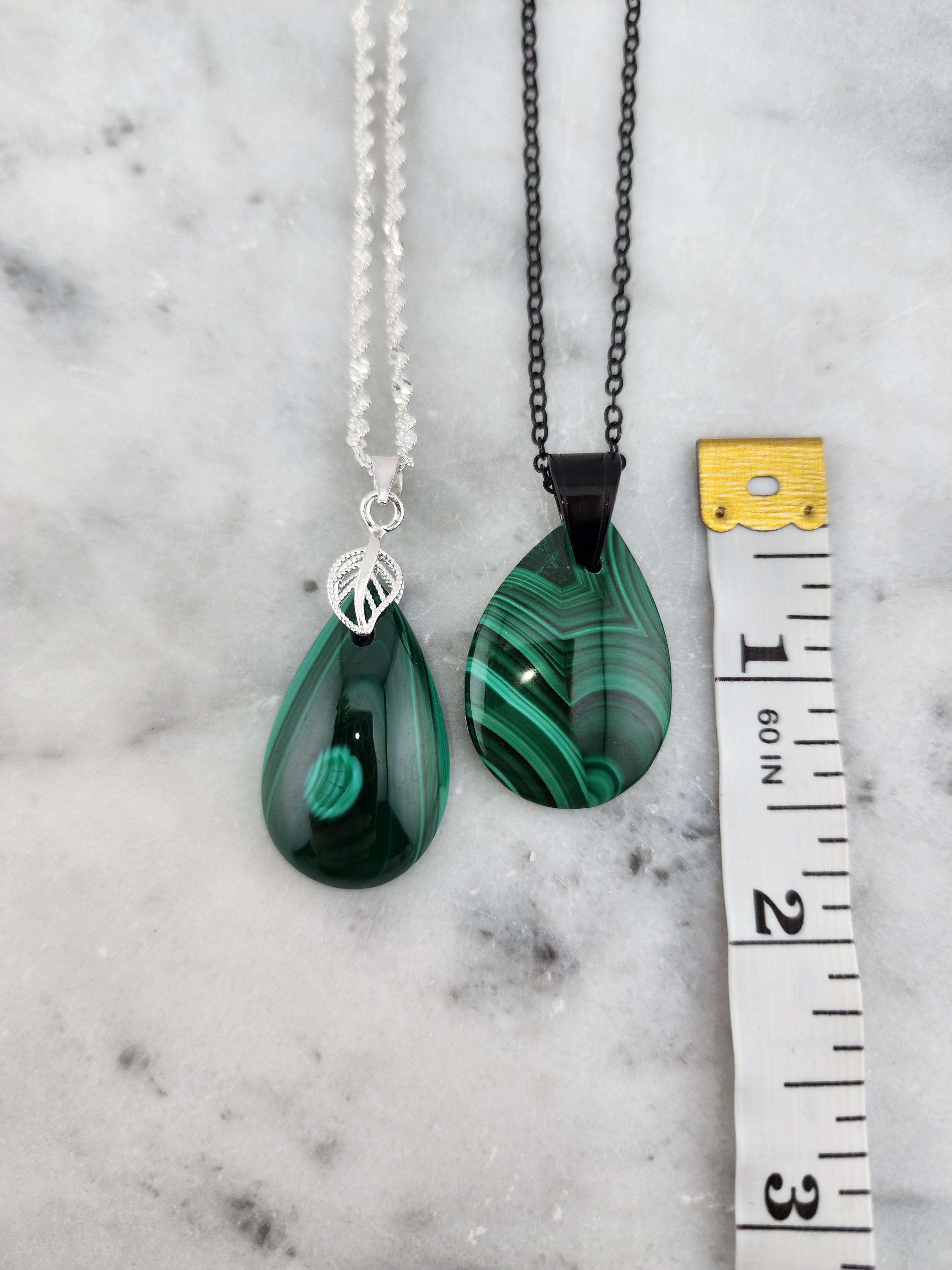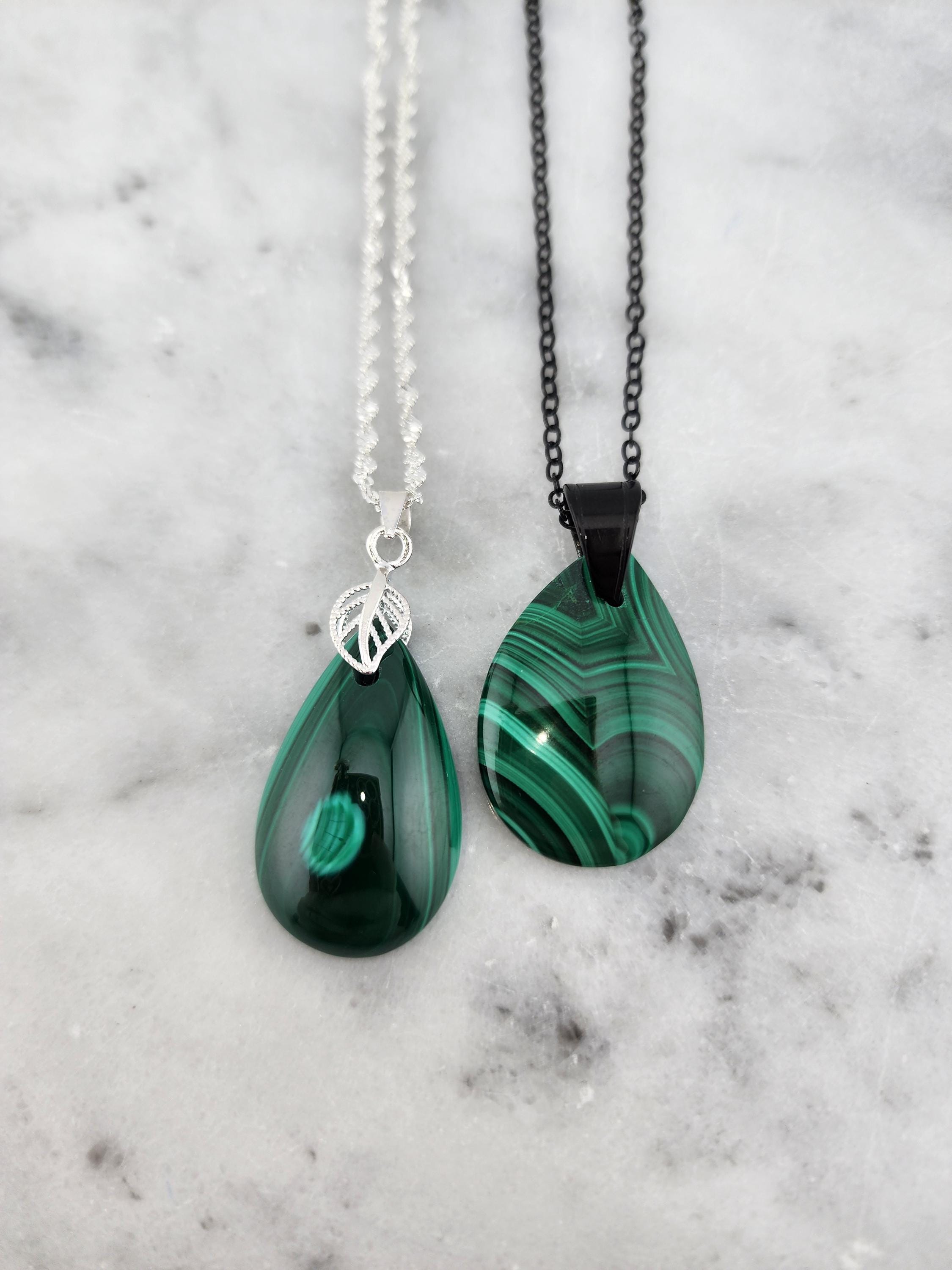 I made two different AMAZING necklaces for you to choose from: #1- is a beautiful Rare Natural Chrysocolla Malachite teardrop pendant from Congo, on a bright shiny elegant twisted sterling silver chain necklace that has a 2" extender and a sterling silver hollow leaf bail that the pendant hangs from. #2- is a AAA+ Natural Malachite Teardrop Pendant, on a pretty shiny thin black chain that has a 2" extender and a solid black bail that the pendant hangs from. * Your purchase will arrive in pretty packaging * Shipping is free within the U.S 1 - 100% natural chrysocolla malachite, not treated in any way... This hand cut rare natural hybrid stone is found in Congo...Not seen anywhere else! 2 - 100% natural Malachite not treated in any way... This AAA+ pendant is full of amazing swirls, stripes, and orbs!