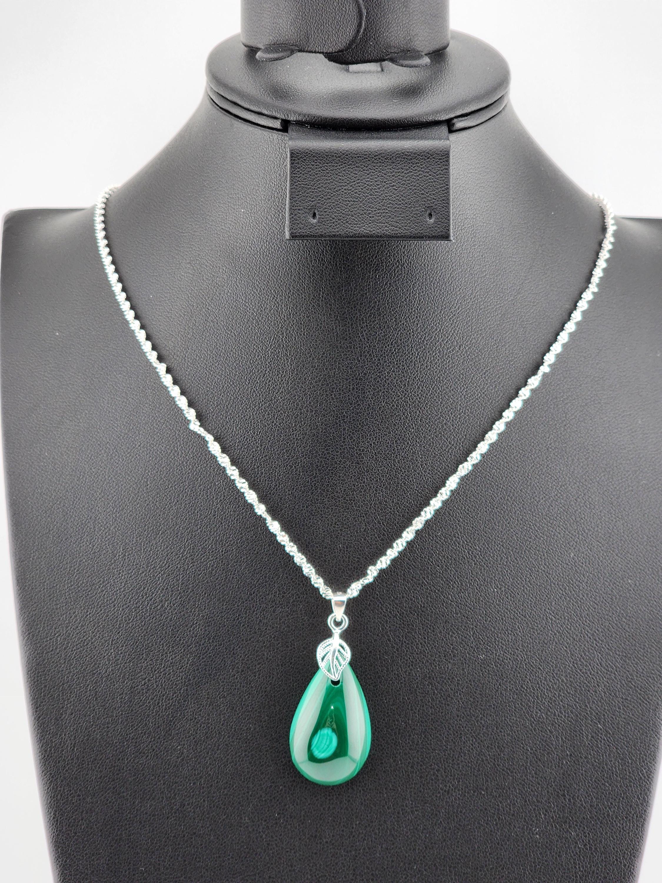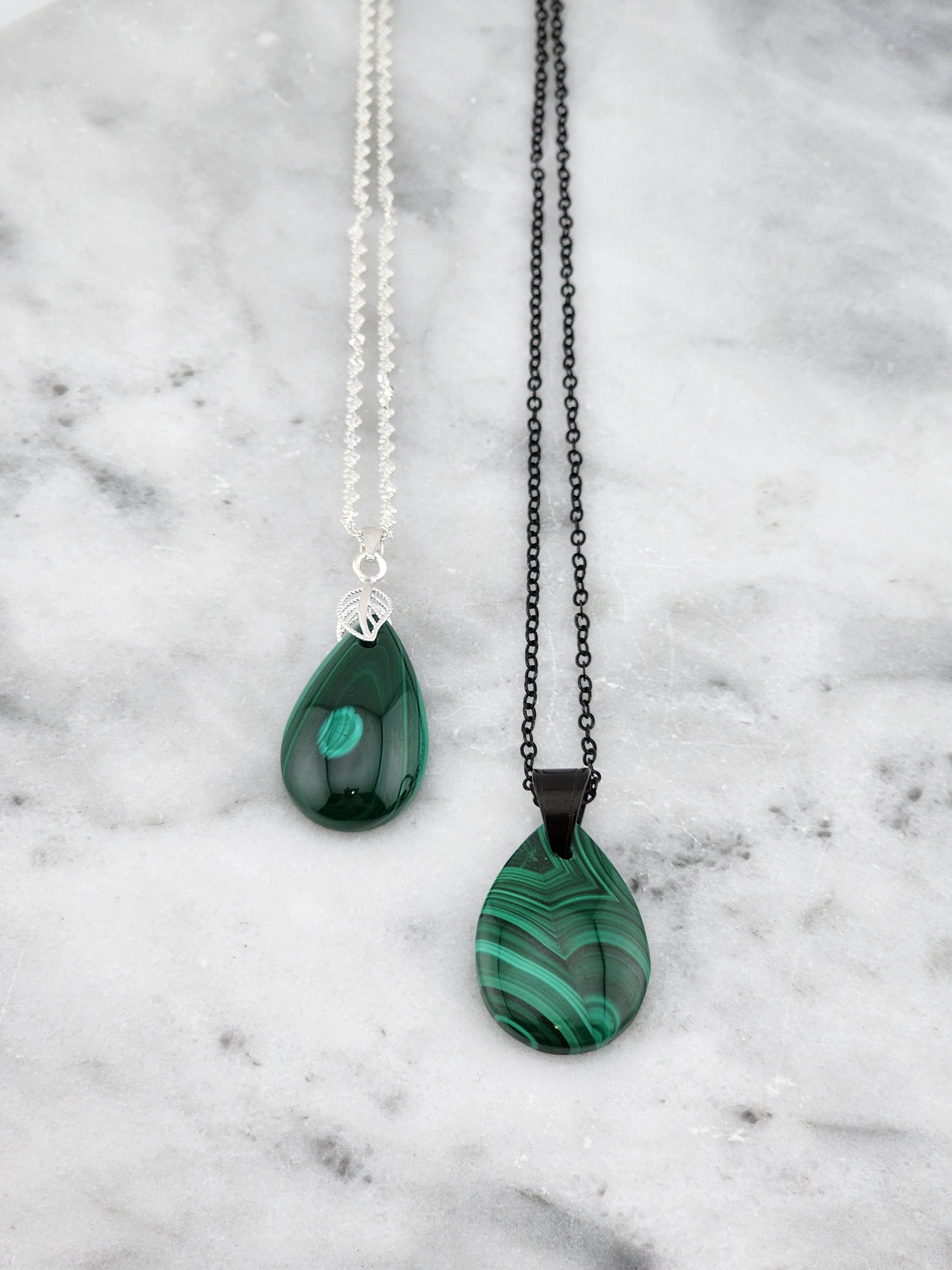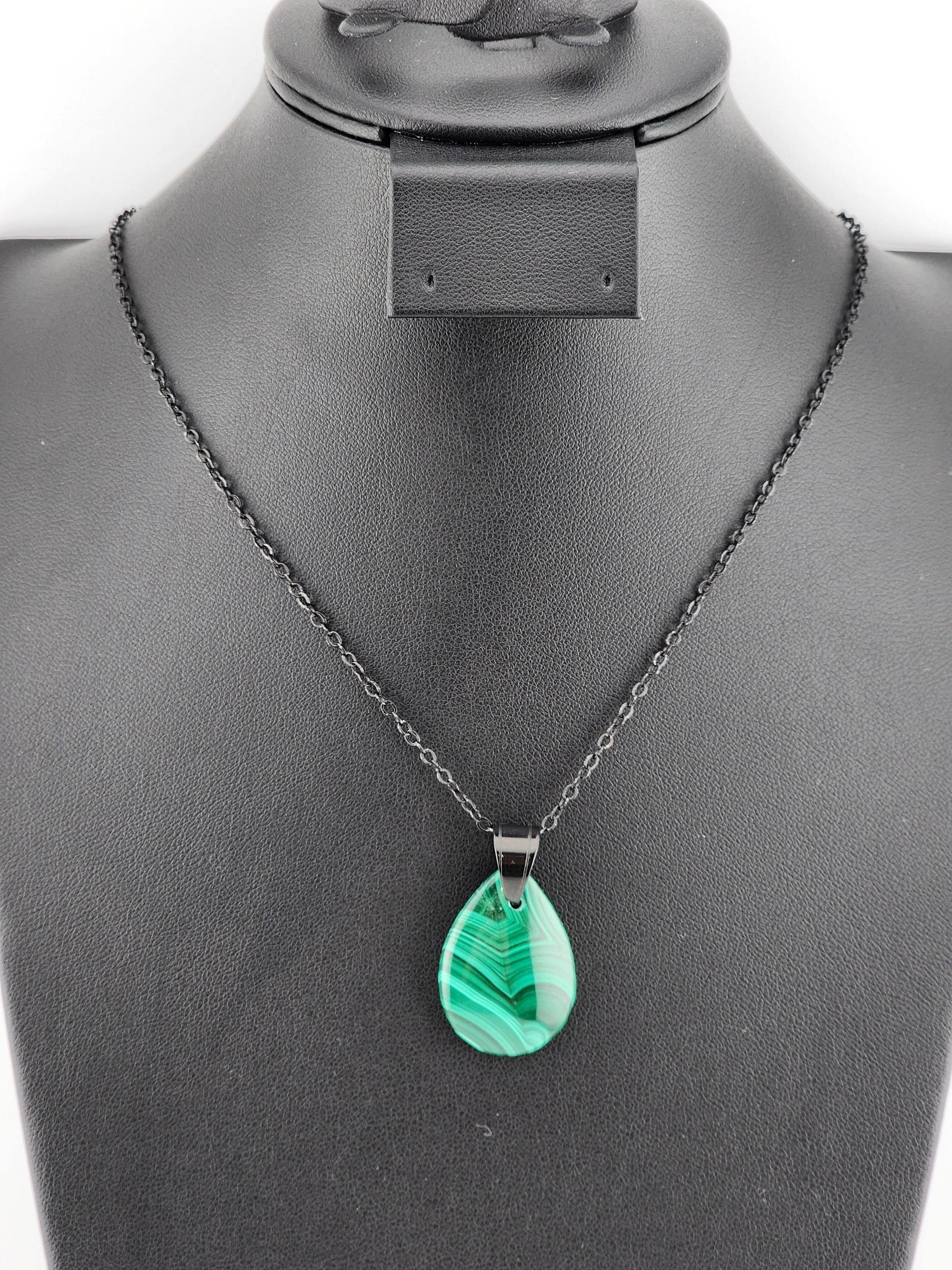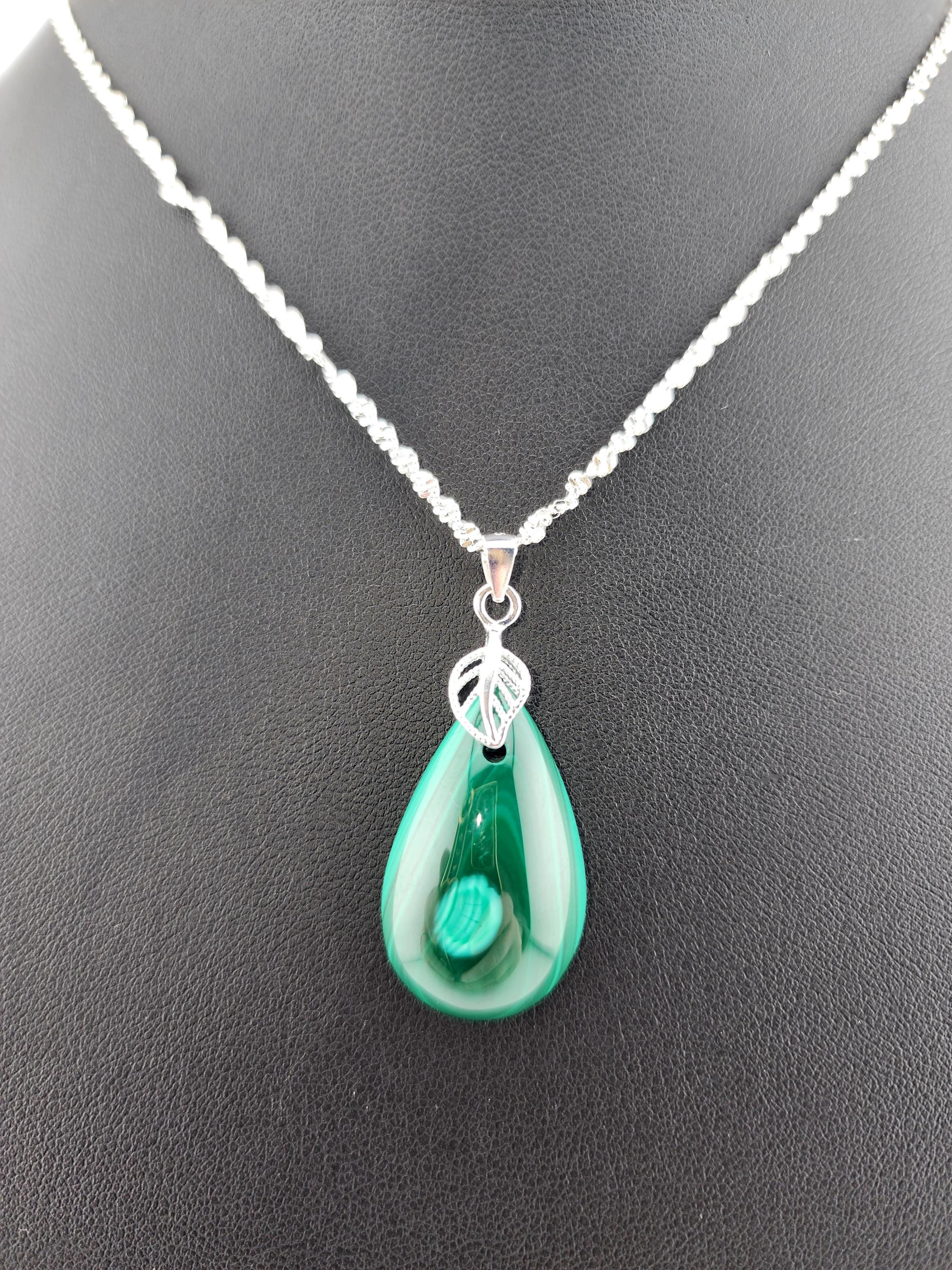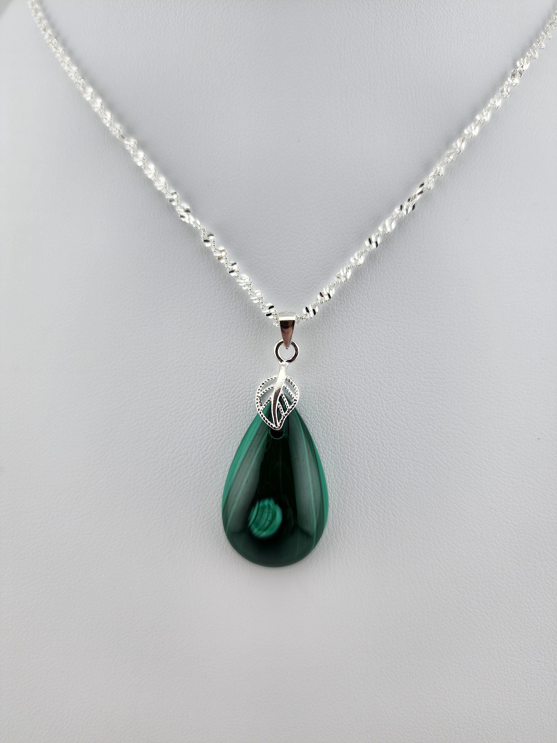 I made two different AMAZING necklaces for you to choose from: #1- is a beautiful Rare Natural Chrysocolla Malachite teardrop pendant from Congo, on a bright shiny elegant twisted sterling silver chain necklace that has a 2" extender and a sterling silver hollow leaf bail that the pendant hangs from. #2- is a AAA+ Natural Malachite Teardrop Pendant, on a pretty shiny thin black chain that has a 2" extender and a solid black bail that the pendant hangs from. * Your purchase will arrive in pretty packaging * Shipping is free within the U.S 1 - 100% natural chrysocolla malachite, not treated in any way... This hand cut rare natural hybrid stone is found in Congo...Not seen anywhere else! 2 - 100% natural Malachite not treated in any way... This AAA+ pendant is full of amazing swirls, stripes, and orbs!