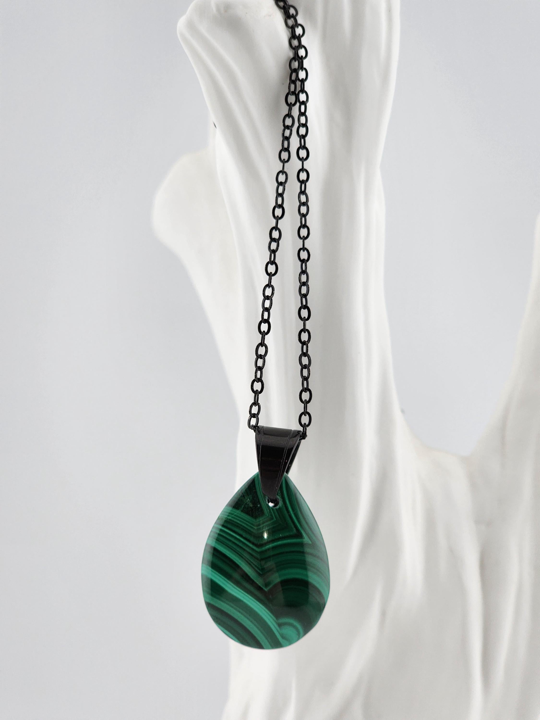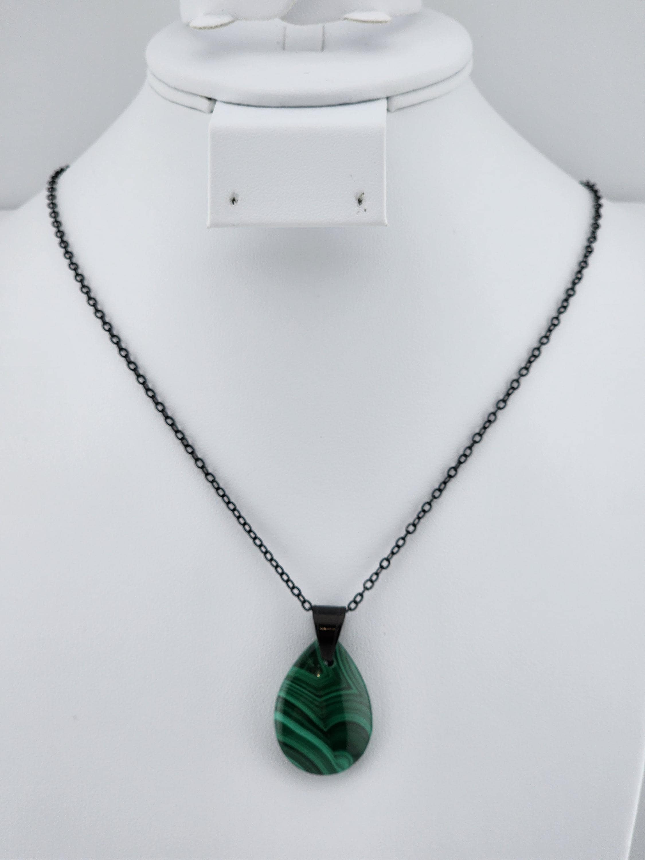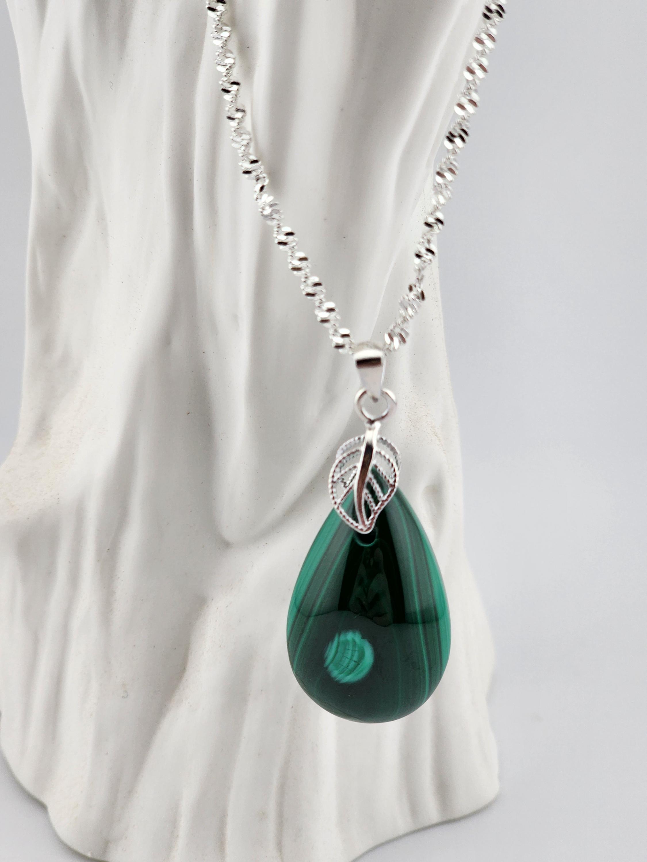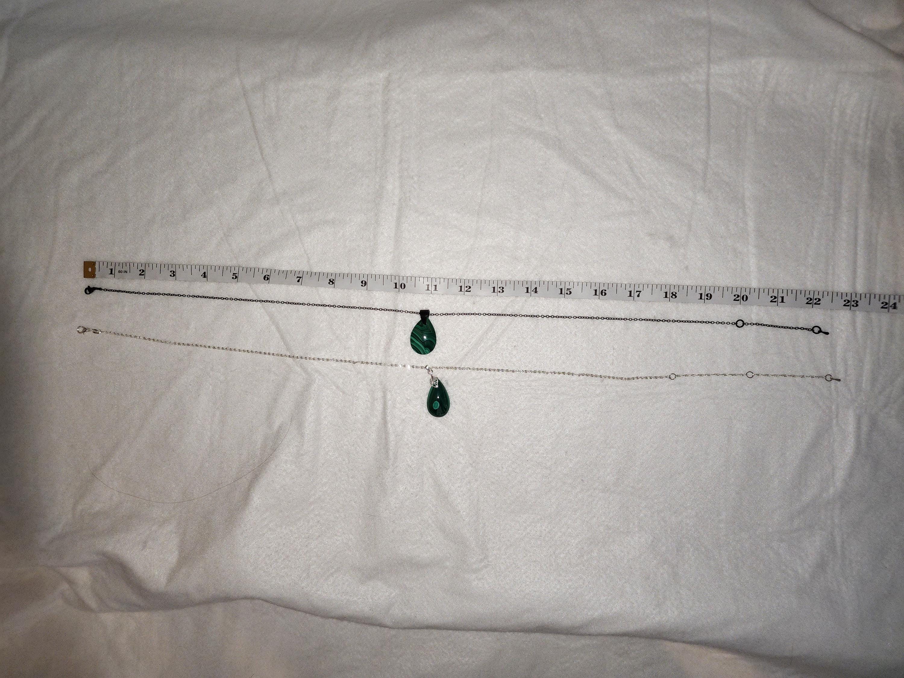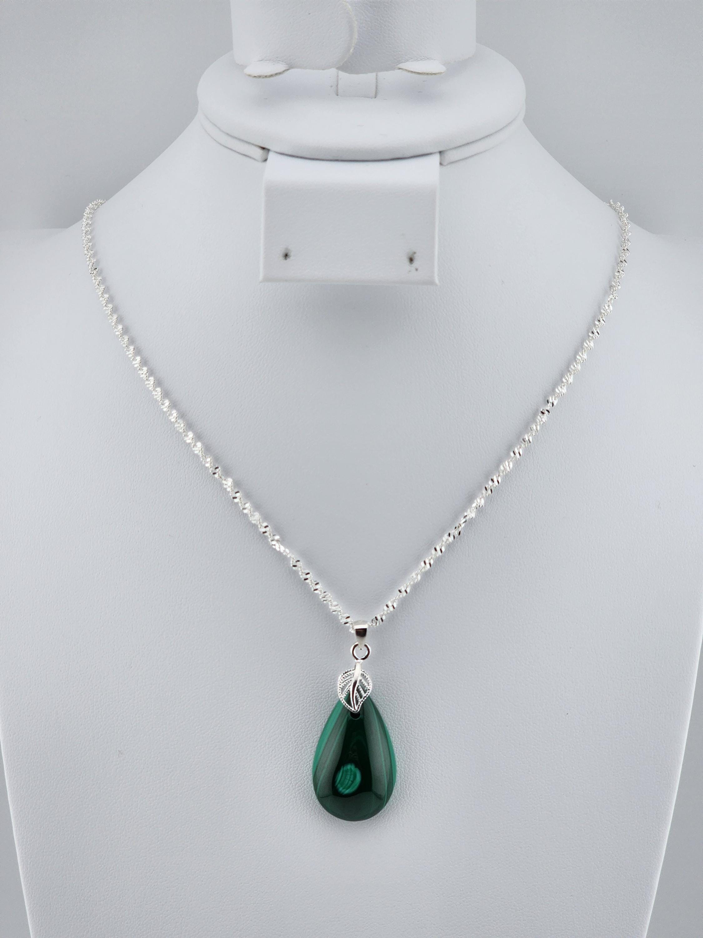 I made two different AMAZING necklaces for you to choose from: #1- is a beautiful Rare Natural Chrysocolla Malachite teardrop pendant from Congo, on a bright shiny elegant twisted sterling silver chain necklace that has a 2" extender and a sterling silver hollow leaf bail that the pendant hangs from. #2- is a AAA+ Natural Malachite Teardrop Pendant, on a pretty shiny thin black chain that has a 2" extender and a solid black bail that the pendant hangs from. * Your purchase will arrive in pretty packaging * Shipping is free within the U.S 1 - 100% natural chrysocolla malachite, not treated in any way... This hand cut rare natural hybrid stone is found in Congo...Not seen anywhere else! 2 - 100% natural Malachite not treated in any way... This AAA+ pendant is full of amazing swirls, stripes, and orbs!